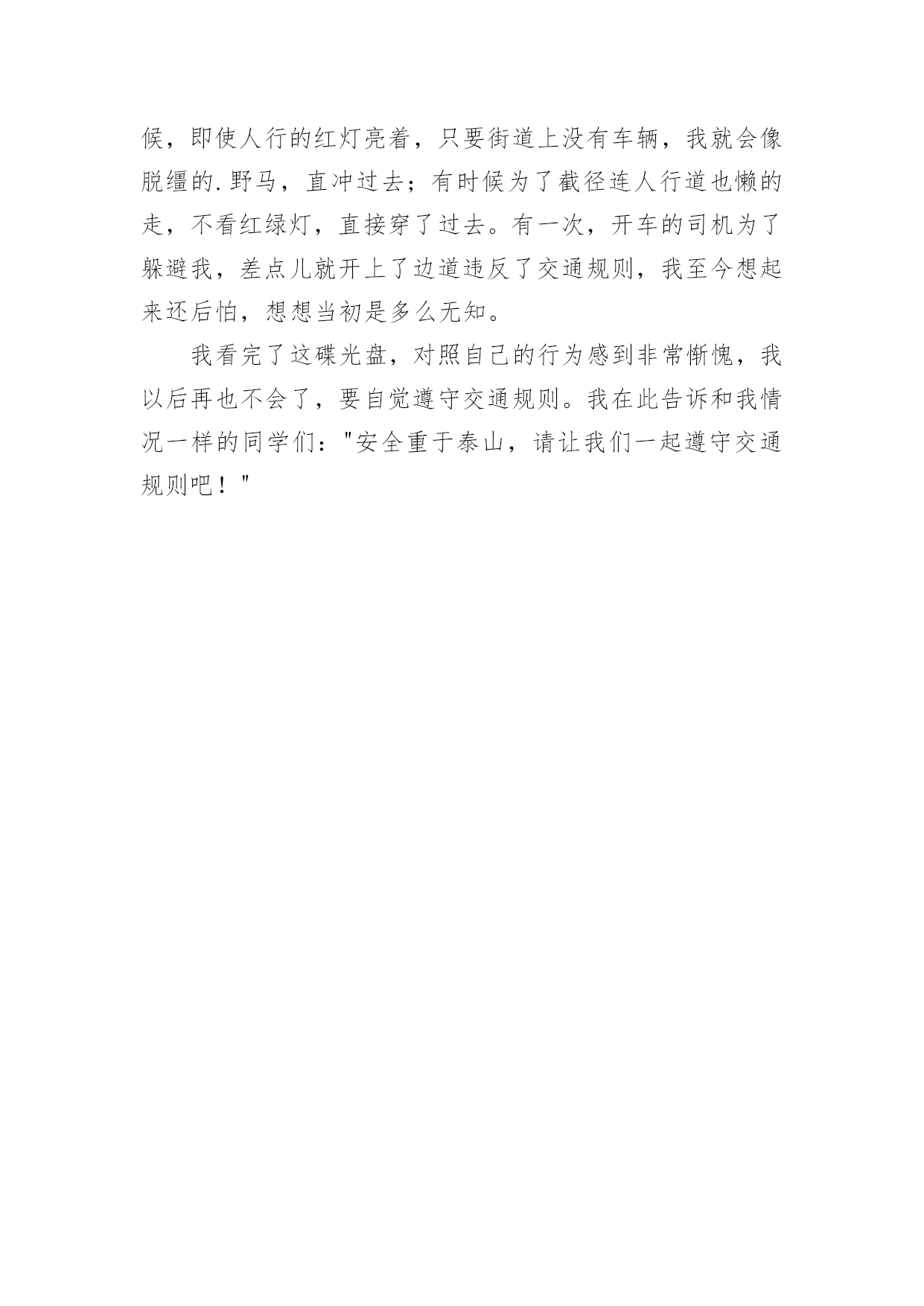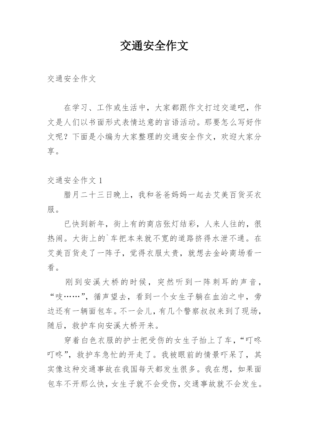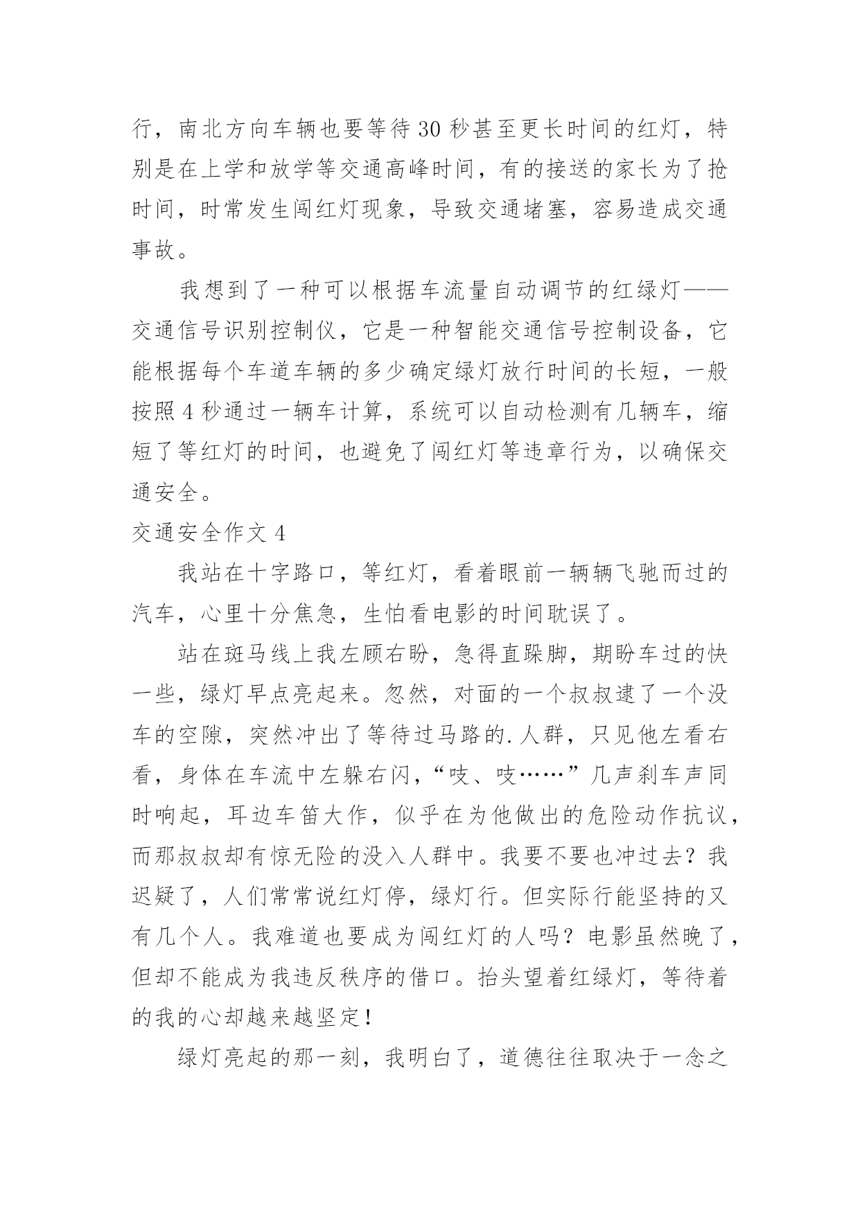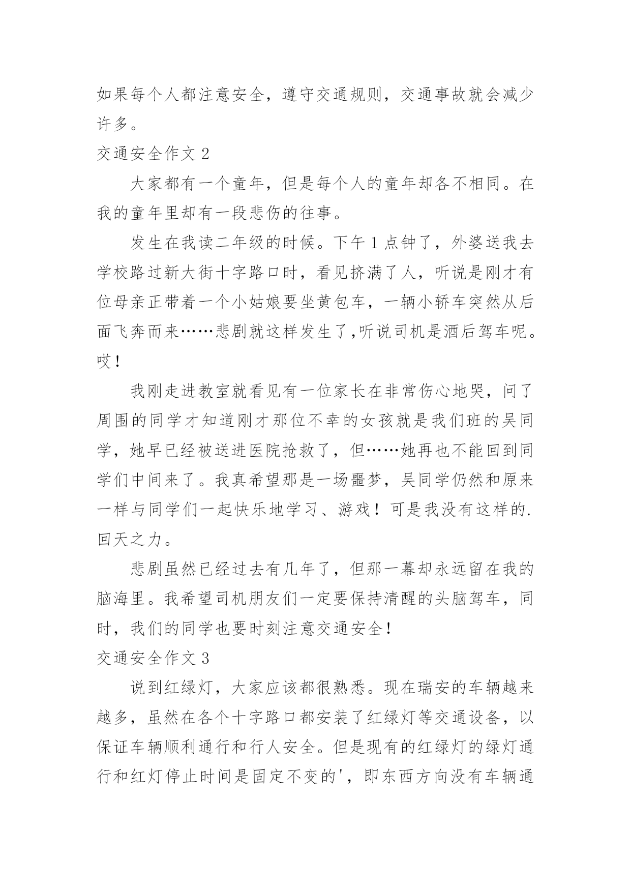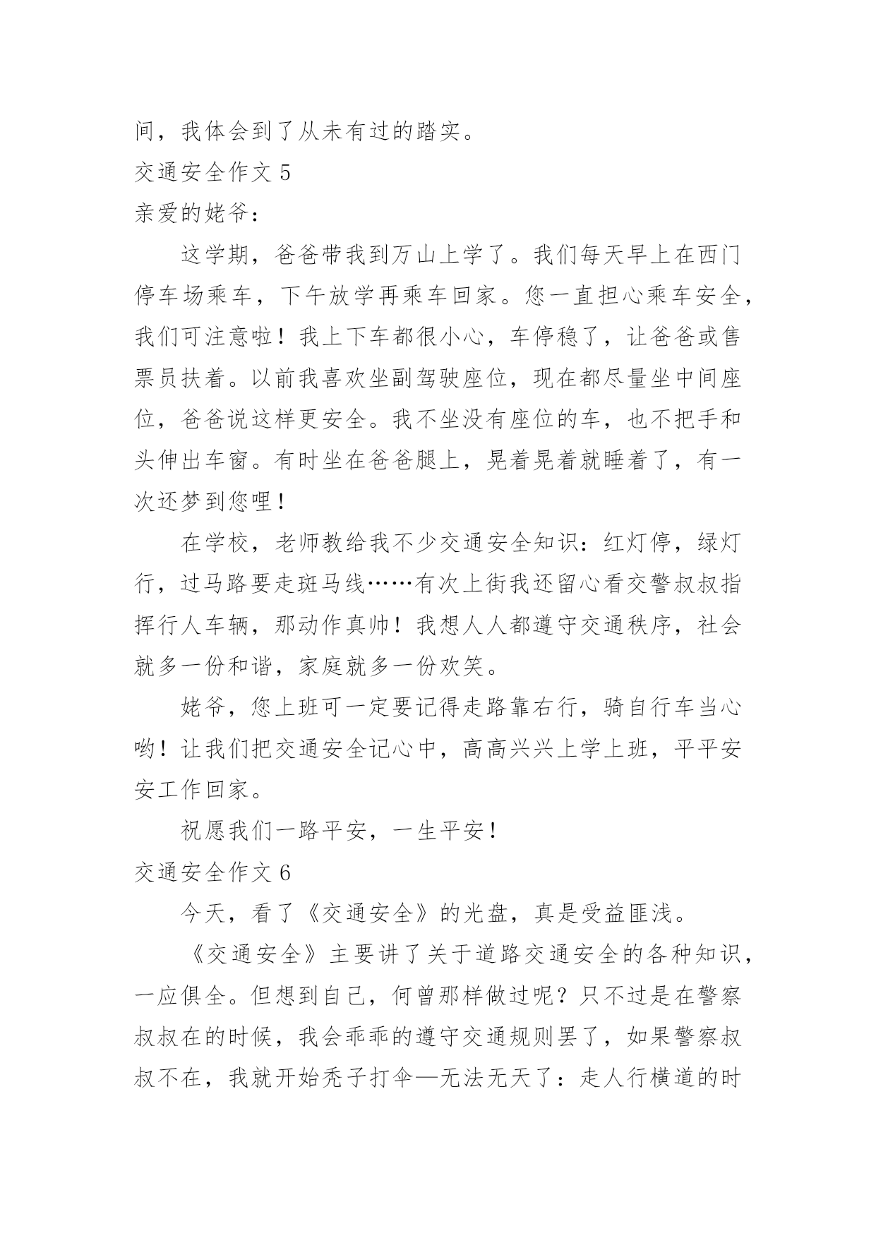 交通安全作文交通安全作文在学习、工作或生活中,大家都跟作文打过交道吧,作文是人们以书面形式表情达意的言语活动。那要怎么写好作文呢?下面是小编为大家整理的交通安全作文,欢迎大家分享。交通安全作文1腊月二十三日晚上,我和爸爸妈妈一起去艾美百货买衣服。已快到新年,街上有的商店张灯结彩,人来人往的,很热闹。大街上的`车把本来就不宽的道路挤得水泄不通。在艾美百货走了一阵子,觉得衣服太贵,就想去金岭商场看一看。刚到安溪大桥的时候,突然听到一阵刺耳的声音,“吱……”,循声望去,看到一个女生子躺在血泊之中,旁边还有一辆面包车。不一会儿,有几个警察叔叔来到了现场,随后,救护车向安溪大桥开来。穿着白色衣服的护士把受伤的女生子抬上了车,“叮咚叮咚”,救护车急忙的开走了。我被眼前的情景吓呆了,其实像这种交通事故在我国每天都发生很多。我在想,如果面包车不开那么快,女生子就不会受伤,交通事故就不会发生。如果每个人都注意安全,遵守交通规则,交通事故就会减少许多。交通安全作文2大家都有一个童年,但是每个人的童年却各不相同。在我的童年里却有一段悲伤的往事。发生在我读二年级的时候。下午1点钟了,外婆送我去学校路过新大街十字路口时,看见挤满了人,听说是刚才有位母亲正带着一个小姑娘要坐黄包车,一辆小轿车突然从后面飞奔而来……悲剧就这样发生了,听说司机是酒后驾车呢。哎!我刚走进教室就看见有一位家长在非常伤心地哭,问了周围的同学才知道刚才那位不幸的女孩就是我们班的吴同学,她早已经被送进医院抢救了,但……她再也不能回到同学们中间来了。我真希望那是一场噩梦,吴同学仍然和原来一样与同学们一起快乐地学习、游戏!可是我没有这样的.回天之力。悲剧虽然已经过去有几年了,但那一幕却永远留在我的脑海里。我希望司机朋友们一定要保持清醒的头脑驾车,同时,我们的同学也要时刻注意交通安全!交通安全作文3说到红绿灯,大家应该都很熟悉。现在瑞安的车辆越来越多,虽然在各个十字路口都安装了红绿灯等交通设备,以保证车辆顺利通行和行人安全。但是现有的红绿灯的绿灯通行和红灯停止时间是固定不变的',即东西方向没有车辆通行,南北方向车辆也要等待30秒甚至更长时间的红灯,特别是在上学和放学等交通高峰时间,有的接送的家长为了抢时间,时常发生闯红灯现象,导致交通堵塞,容易造成交通事故。我想到了一种可以根据车流量自动调节的红绿灯——交通信号识别控制仪,它是一种智能交通信号控制设备,它能根据每个车道车辆的多少确定绿灯放行时间的长短,一般按照4秒通过一辆车计算,系统可以自动检测有几辆车,缩短了等红灯的时间,也避免了闯红灯等违章行为,以确保交通安全。交通安全作文4我站在十字路口,等红灯,看着眼前一辆辆飞驰而过的汽车,心里十分焦急,生怕看电影的时间耽误了。站在斑马线上我左顾右盼,急得直跺脚,期盼车过的快一些,绿灯早点亮起来。忽然,对面的一个叔叔逮了一个没车的空隙,突然冲出了等待过马路的.人群,只见他左看右看,身体在车流中左躲右闪,“吱、吱……”几声刹车声同时响起,耳边车笛大作,似乎在为他做出的危险动作抗议,而那叔叔却有惊无险的没入人群中。我要不要也冲过去?我迟疑了,人们常常说红灯停,绿灯行。但实际行能坚持的又有几个人。我难道也要成为闯红灯的人吗?电影虽然晚了,但却不能成为我违反秩序的借口。抬头望着红绿灯,等待着的我的心却越来越坚定!绿灯亮起的那一刻,我明白了,道德往往取决于一念之间,我体会到了从未有过的踏实。交通安全作文5亲爱的姥爷:这学期,爸爸带我到万山上学了。我们每天早上在西门停车场乘车,下午放学再乘车回家。您一直担心乘车安全,我们可注意啦!我上下车都很小心,车停稳了,让爸爸或售票员扶着。以前我喜欢坐副驾驶座位,现在都尽量坐中间座位,爸爸说这样更安全。我不坐没有座位的车,也不把手和头伸出车窗。有时坐在爸爸腿上,晃着晃着就睡着了,有一次还梦到您哩!在学校,老师教给我不少交通安全知识:红灯停,绿灯行,过马路要走斑马线……有次上街我还留心看交警叔叔指挥行人车辆,那动作真帅!我想人人都遵守交通秩序,社会就多一份和谐,家庭就多一份欢笑。姥爷,您上班可一定要记得走路靠右行,骑自行车当心哟!让我们把交通安全记心中,高高兴兴上学上班,平平安安工作回家。祝愿我们一路平安,一生平安!交通安全作文6今天,看了《交通安全》的光盘,真是受益匪浅。《交通安全》主要讲了关于道路交通安全的各种知识,一应俱全。但想到自己,何曾那样做过呢?只不过是在警察叔叔在的时候,我会乖乖的遵守交通规则罢了,如果警察叔叔不在,我就开始秃子打伞—无法无天了:走人行横道的时候,即使人行的红灯亮着,只要街道上没有车辆,我就会像脱缰的.野马,直冲过去;有时候为了截径连人行道也懒的走,不看红绿灯,直接穿了过去。有一次,开车的司机为了躲避我,差点儿就开上了边道违反了交通规则,我至今
