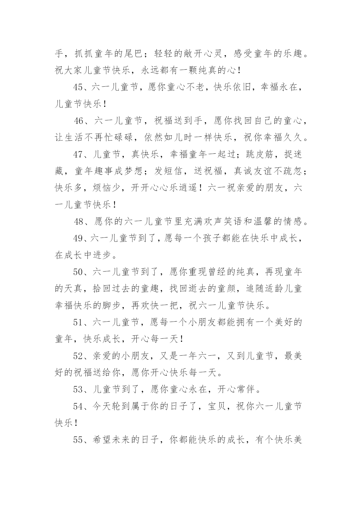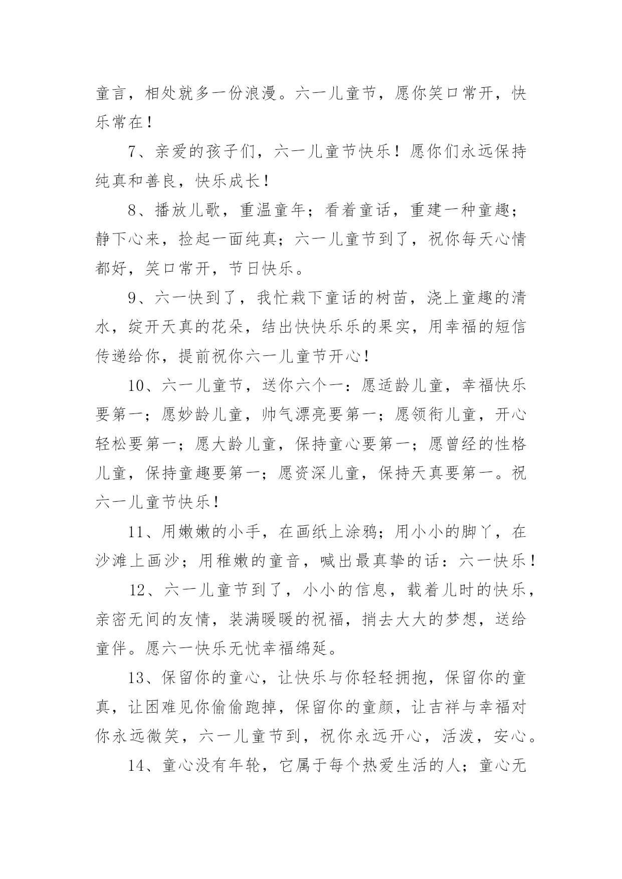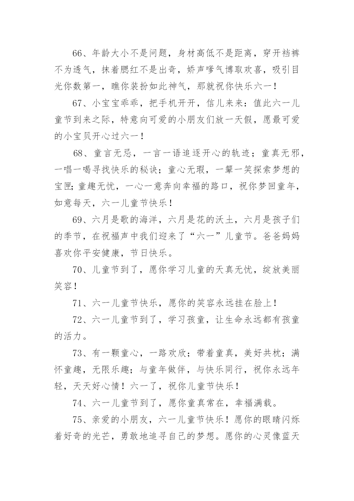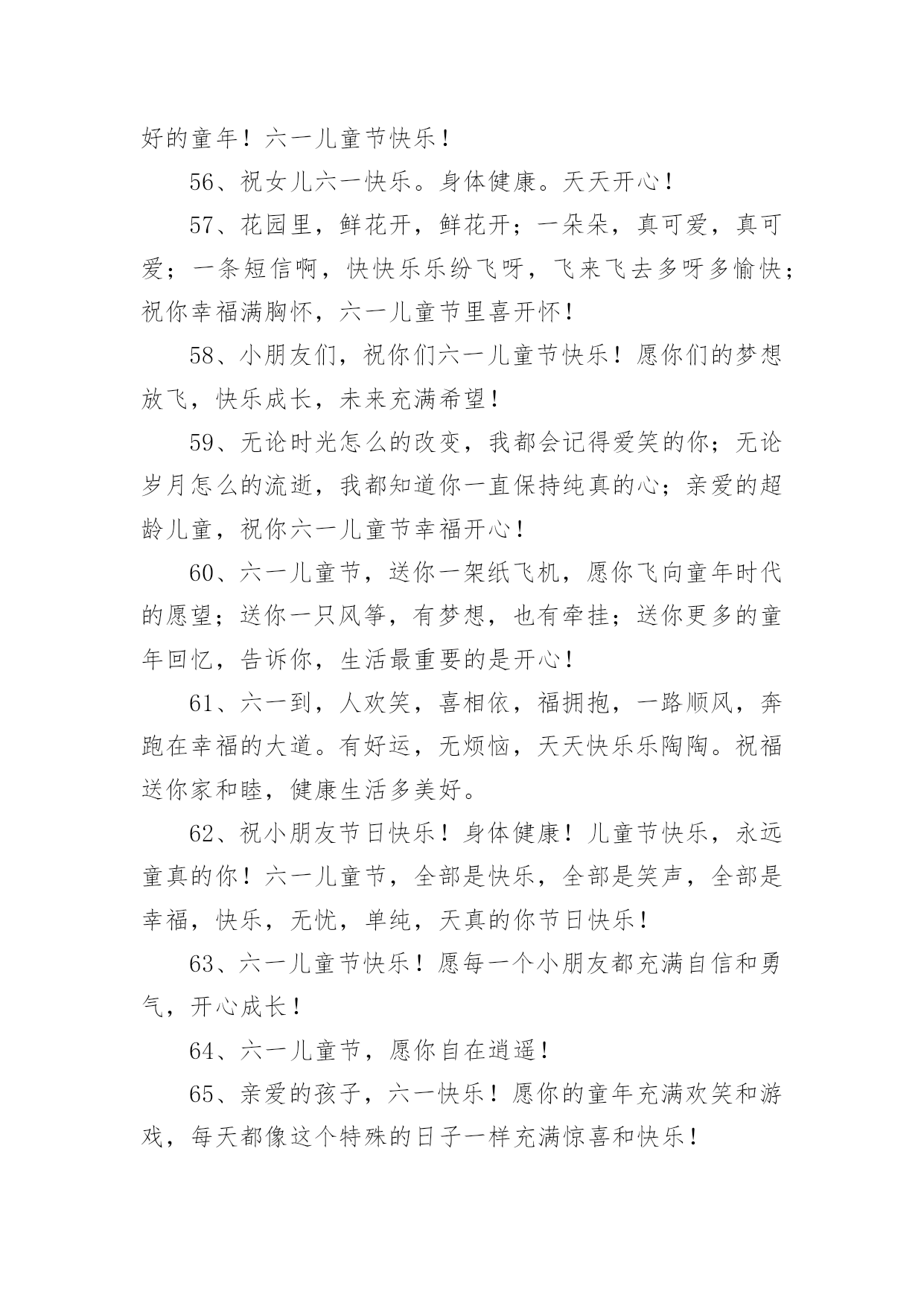 六一儿童节高级文案六一儿童节高级文案(精选660句)随着社交网络的普遍使用,许多人都接触过一些比较经典的文案吧,文案用于分享自己的生活状态。那么问题来了,到底什么样的文案才是低调奢华有内涵的呢?以下是小编收集整理的六一儿童节高级文案(精选660句),希望能够帮助到大家。1、亲爱的宝贝,六一儿童节快乐!愿你的笑容如阳光般灿烂,生活如童话般美好。每一天都能快乐无忧,健康成长!2、童年去远,童趣依然,快乐常伴;童心回归,童伴常会,幸福永随;童真常有,童颜常留,健康长久。愿你童心常在,笑口常开!六一快乐!3、六一陪你荡秋千:用呵护做秋千凳,用关心做秋千绳,用信任做秋千架,用爱的力量,让你在幸福中飞,看你绽放快乐笑颜!六一儿童节快乐!4、祝福可爱的多彩宝贝们六一儿童节快乐!希望你们在以后的成长中,释放天性、张扬个性、收获快乐、幸福成长!5、祝愿你的六一儿童节像糖果一样甜蜜。6、多一点童心,笑容就多一份灿烂;多一点童趣,人生就多一份开怀;多一点童真,生活就多一份轻松;多一点童言,相处就多一份浪漫。六一儿童节,愿你笑口常开,快乐常在!7、亲爱的孩子们,六一儿童节快乐!愿你们永远保持纯真和善良,快乐成长!8、播放儿歌,重温童年;看着童话,重建一种童趣;静下心来,捡起一面纯真;六一儿童节到了,祝你每天心情都好,笑口常开,节日快乐。9、六一快到了,我忙栽下童话的树苗,浇上童趣的清水,绽开天真的花朵,结出快快乐乐的果实,用幸福的短信传递给你,提前祝你六一儿童节开心!10、六一儿童节,送你六个一:愿适龄儿童,幸福快乐要第一;愿妙龄儿童,帅气漂亮要第一;愿领衔儿童,开心轻松要第一;愿大龄儿童,保持童心要第一;愿曾经的性格儿童,保持童趣要第一;愿资深儿童,保持天真要第一。祝六一儿童节快乐!11、用嫩嫩的小手,在画纸上涂鸦;用小小的脚丫,在沙滩上画沙;用稚嫩的童音,喊出最真挚的话:六一快乐!12、六一儿童节到了,小小的信息,载着儿时的快乐,亲密无间的友情,装满暖暖的祝福,捎去大大的梦想,送给童伴。愿六一快乐无忧幸福绵延。13、保留你的童心,让快乐与你轻轻拥抱,保留你的童真,让困难见你偷偷跑掉,保留你的童颜,让吉祥与幸福对你永远微笑,六一儿童节到,祝你永远开心,活泼,安心。14、童心没有年轮,它属于每个热爱生活的人;童心无须掩饰,它属于每个乐观开朗的人;童心让我们远离浮华,坦坦荡荡。儿童节将至,愿童心不泯、生活快乐!15、告诉人生六个一:一副好身体,一个好家庭,一份好事业,一世好心情,一圈好朋友,一生好运气!愿你一生拥有六个一!祝六一快乐!16、微笑,在花枝绽放,童趣,在蝴蝶的翅膀招摇,成长,伸进幸福的土壤,汲取着营养,梦想,像蒲公英蓝天飞翔,童年美好,六一愿你找回童趣,快乐徜徉。17、亲爱的小宝,儿童节快乐!18、亲爱的小朋友,儿童节快乐!愿你天天笑口常开,学习进步,健康快乐成长。19、亲爱的小朋友们,六一儿童节到了!愿你们的心中充满阳光,愿你们的每一天都过得充实快乐。祝你们节日快乐!20、六一儿童节来到,发条信息祝福你,愿你无忧无虑心境好,天真纯真开心笑,与世无争童心葆,童真永在乐逍遥,祝愿儿童节快乐。21、祝福你六一儿童节快乐,永远拥有幸福、快乐和健康!22、一天天走远,一夜夜演变,一年年走远一个回不去的童年。一次次想念,一封封信笺,一条条短信送回你一个快乐的儿童节!23、今天是一年一度的六一儿童节,每一位同学的脸上都挂着欣喜、快乐的笑容。24、六一到,真诚地道一声:儿童节快乐!愿你永远开心。25、童年是一座梦中的美丽城堡,童心是快乐快乐赢得幸福的法宝,童趣是一种坚强的信赖,喜悦是喜悦赢得童真,烦恼是战胜童真的钢炮。六一儿童节,祝你快乐无忧,快乐来报到。26、六一儿童节,让我们一起怀念童年,感知童真,活的开心!27、六一儿童节到了,祝你永远快乐!28、小小少年,没有烦恼,无忧无虑,快乐成长,童真的心,欢乐的笑,好好学习,天天向上,争做栋梁,茁壮成长,祝儿童节快乐开心。29、六一儿童节,祝愿朋友都向孩子一样,无忧无虑,快乐无忧!30、六一儿童节,愿你们的童年充满欢笑和快乐,健康、快乐、阳光的成长。31、六一节了,愿你乐逍遥!32、孩子是祖国的花朵,民族的希望,每一位家长都希望自己的孩子有一个五彩斑斓、幸福快乐的童年。33、祝福天下所有的孩子儿童节快乐的这一天,也让我们每一个成年人回到童年,用最纯真的情怀最纯洁的心灵过一个快乐的儿童节!节日快乐!34、六一儿童节,我的祝福要送到,愿你工作顺利,一帆风顺;生活美满,快快乐乐;烦恼抛掉,幸福一生;发条短信,祝你快乐。35、儿时的童谣还在耳边回荡,少年的童真依稀浮现心房,久违的童趣时常梦中流淌,童年的童话仍然飘散芬芳。童年的真情不忘,童年的情谊悠长。儿童节快乐!36、祝孩子们六一儿童节快乐,愿你们的笑容如阳光