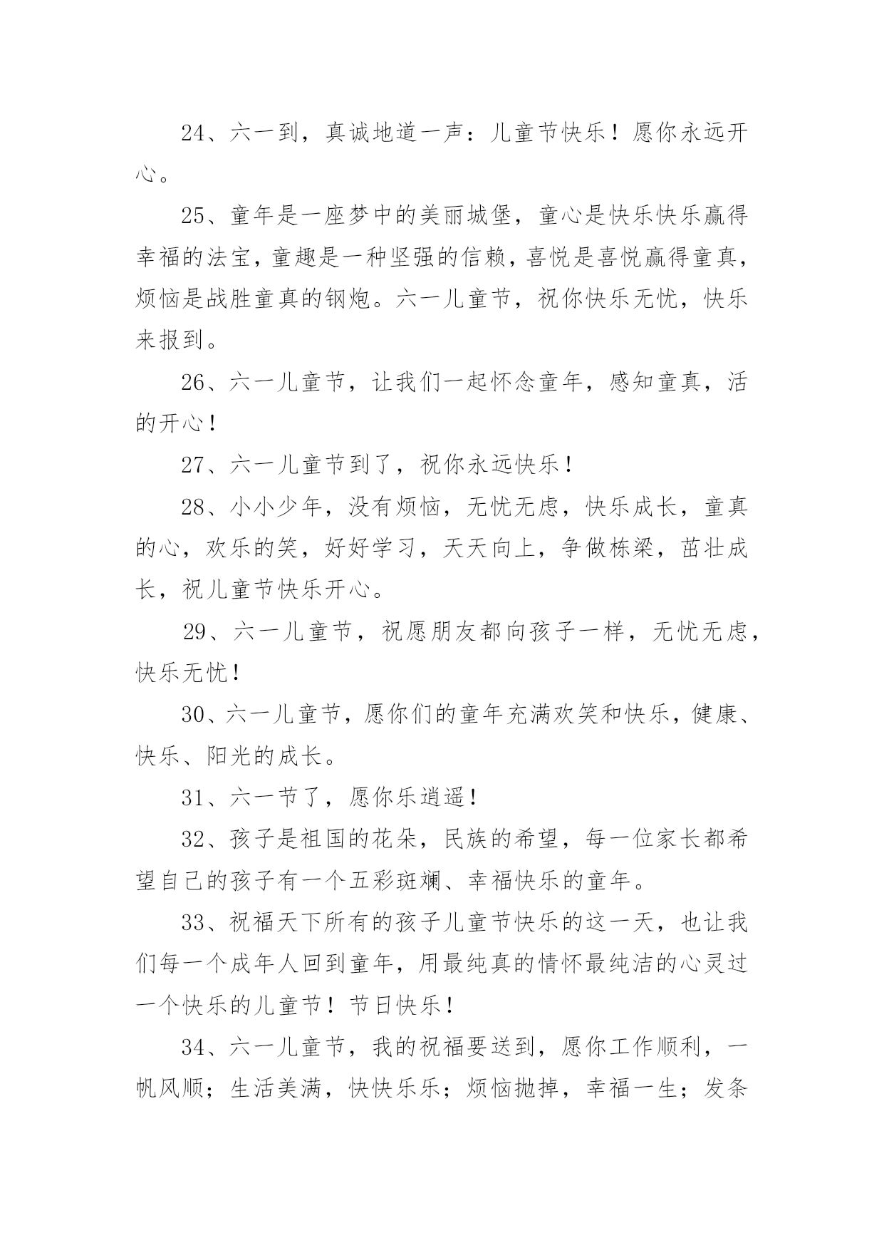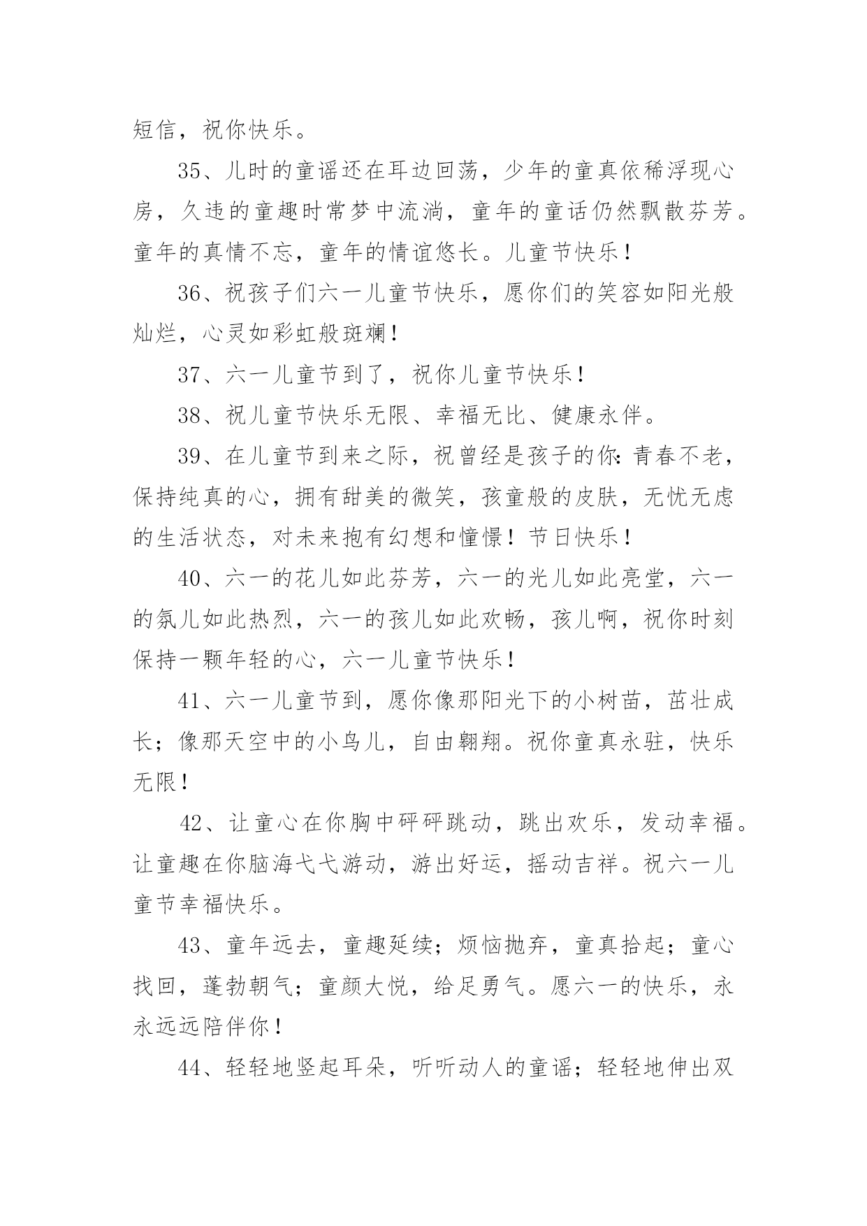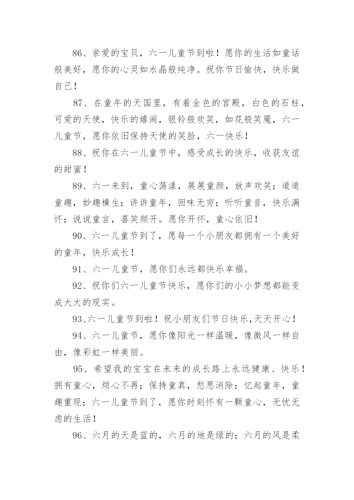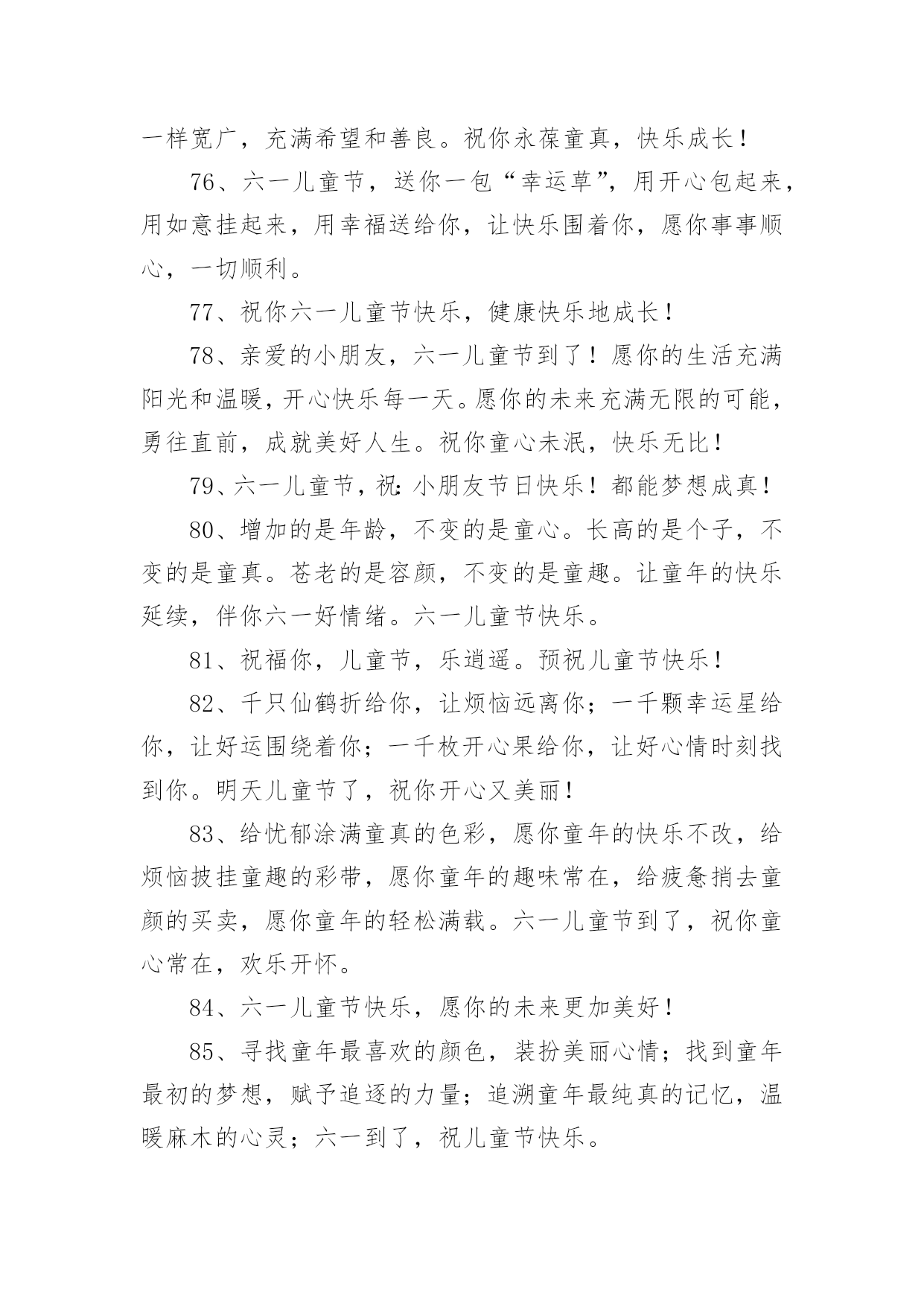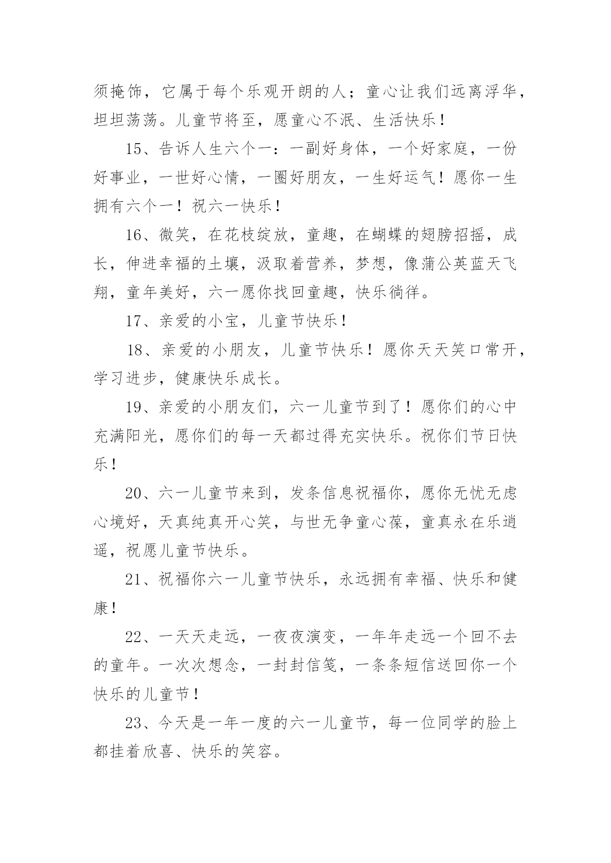 六一儿童节高级文案六一儿童节高级文案(精选660句)随着社交网络的普遍使用,许多人都接触过一些比较经典的文案吧,文案用于分享自己的生活状态。那么问题来了,到底什么样的文案才是低调奢华有内涵的呢?以下是小编收集整理的六一儿童节高级文案(精选660句),希望能够帮助到大家。1、亲爱的宝贝,六一儿童节快乐!愿你的笑容如阳光般灿烂,生活如童话般美好。每一天都能快乐无忧,健康成长!2、童年去远,童趣依然,快乐常伴;童心回归,童伴常会,幸福永随;童真常有,童颜常留,健康长久。愿你童心常在,笑口常开!六一快乐!3、六一陪你荡秋千:用呵护做秋千凳,用关心做秋千绳,用信任做秋千架,用爱的力量,让你在幸福中飞,看你绽放快乐笑颜!六一儿童节快乐!4、祝福可爱的多彩宝贝们六一儿童节快乐!希望你们在以后的成长中,释放天性、张扬个性、收获快乐、幸福成长!5、祝愿你的六一儿童节像糖果一样甜蜜。6、多一点童心,笑容就多一份灿烂;多一点童趣,人生就多一份开怀;多一点童真,生活就多一份轻松;多一点童言,相处就多一份浪漫。六一儿童节,愿你笑口常开,快乐常在!7、亲爱的孩子们,六一儿童节快乐!愿你们永远保持纯真和善良,快乐成长!8、播放儿歌,重温童年;看着童话,重建一种童趣;静下心来,捡起一面纯真;六一儿童节到了,祝你每天心情都好,笑口常开,节日快乐。9、六一快到了,我忙栽下童话的树苗,浇上童趣的清水,绽开天真的花朵,结出快快乐乐的果实,用幸福的短信传递给你,提前祝你六一儿童节开心!10、六一儿童节,送你六个一:愿适龄儿童,幸福快乐要第一;愿妙龄儿童,帅气漂亮要第一;愿领衔儿童,开心轻松要第一;愿大龄儿童,保持童心要第一;愿曾经的性格儿童,保持童趣要第一;愿资深儿童,保持天真要第一。祝六一儿童节快乐!11、用嫩嫩的小手,在画纸上涂鸦;用小小的脚丫,在沙滩上画沙;用稚嫩的童音,喊出最真挚的话:六一快乐!12、六一儿童节到了,小小的信息,载着儿时的快乐,亲密无间的友情,装满暖暖的祝福,捎去大大的梦想,送给童伴。愿六一快乐无忧幸福绵延。13、保留你的童心,让快乐与你轻轻拥抱,保留你的童真,让困难见你偷偷跑掉,保留你的童颜,让吉祥与幸福对你永远微笑,六一儿童节到,祝你永远开心,活泼,安心。14、童心没有年轮,它属于每个热爱生活的人;童心无须掩饰,它属于每个乐观开朗的人;童心让我们远离浮华,坦坦荡荡。儿童节将至,愿童心不泯、生活快乐!15、告诉人生六个一:一副好身体,一个好家庭,一份好事业,一世好心情,一圈好朋友,一生好运气!愿你一生拥有六个一!祝六一快乐!16、微笑,在花枝绽放,童趣,在蝴蝶的翅膀招摇,成长,伸进幸福的土壤,汲取着营养,梦想,像蒲公英蓝天飞翔,童年美好,六一愿你找回童趣,快乐徜徉。17、亲爱的小宝,儿童节快乐!18、亲爱的小朋友,儿童节快乐!愿你天天笑口常开,学习进步,健康快乐成长。19、亲爱的小朋友们,六一儿童节到了!愿你们的心中充满阳光,愿你们的每一天都过得充实快乐。祝你们节日快乐!20、六一儿童节来到,发条信息祝福你,愿你无忧无虑心境好,天真纯真开心笑,与世无争童心葆,童真永在乐逍遥,祝愿儿童节快乐。21、祝福你六一儿童节快乐,永远拥有幸福、快乐和健康!22、一天天走远,一夜夜演变,一年年走远一个回不去的童年。一次次想念,一封封信笺,一条条短信送回你一个快乐的儿童节!23、今天是一年一度的六一儿童节,每一位同学的脸上都挂着欣喜、快乐的笑容。24、六一到,真诚地道一声:儿童节快乐!愿你永远开心。25、童年是一座梦中的美丽城堡,童心是快乐快乐赢得幸福的法宝,童趣是一种坚强的信赖,喜悦是喜悦赢得童真,烦恼是战胜童真的钢炮。六一儿童节,祝你快乐无忧,快乐来报到。26、六一儿童节,让我们一起怀念童年,感知童真,活的开心!27、六一儿童节到了,祝你永远快乐!28、小小少年,没有烦恼,无忧无虑,快乐成长,童真的心,欢乐的笑,好好学习,天天向上,争做栋梁,茁壮成长,祝儿童节快乐开心。29、六一儿童节,祝愿朋友都向孩子一样,无忧无虑,快乐无忧!30、六一儿童节,愿你们的童年充满欢笑和快乐,健康、快乐、阳光的成长。31、六一节了,愿你乐逍遥!32、孩子是祖国的花朵,民族的希望,每一位家长都希望自己的孩子有一个五彩斑斓、幸福快乐的童年。33、祝福天下所有的孩子儿童节快乐的这一天,也让我们每一个成年人回到童年,用最纯真的情怀最纯洁的心灵过一个快乐的儿童节!节日快乐!34、六一儿童节,我的祝福要送到,愿你工作顺利,一帆风顺;生活美满,快快乐乐;烦恼抛掉,幸福一生;发条短信,祝你快乐。35、儿时的童谣还在耳边回荡,少年的童真依稀浮现心房,久违的童趣时常梦中流淌,童年的童话仍然飘散芬芳。童年的真情不忘,童年的情谊悠长。儿童节快乐!36、祝孩子们六一儿童节快乐,愿你们的笑容如阳光