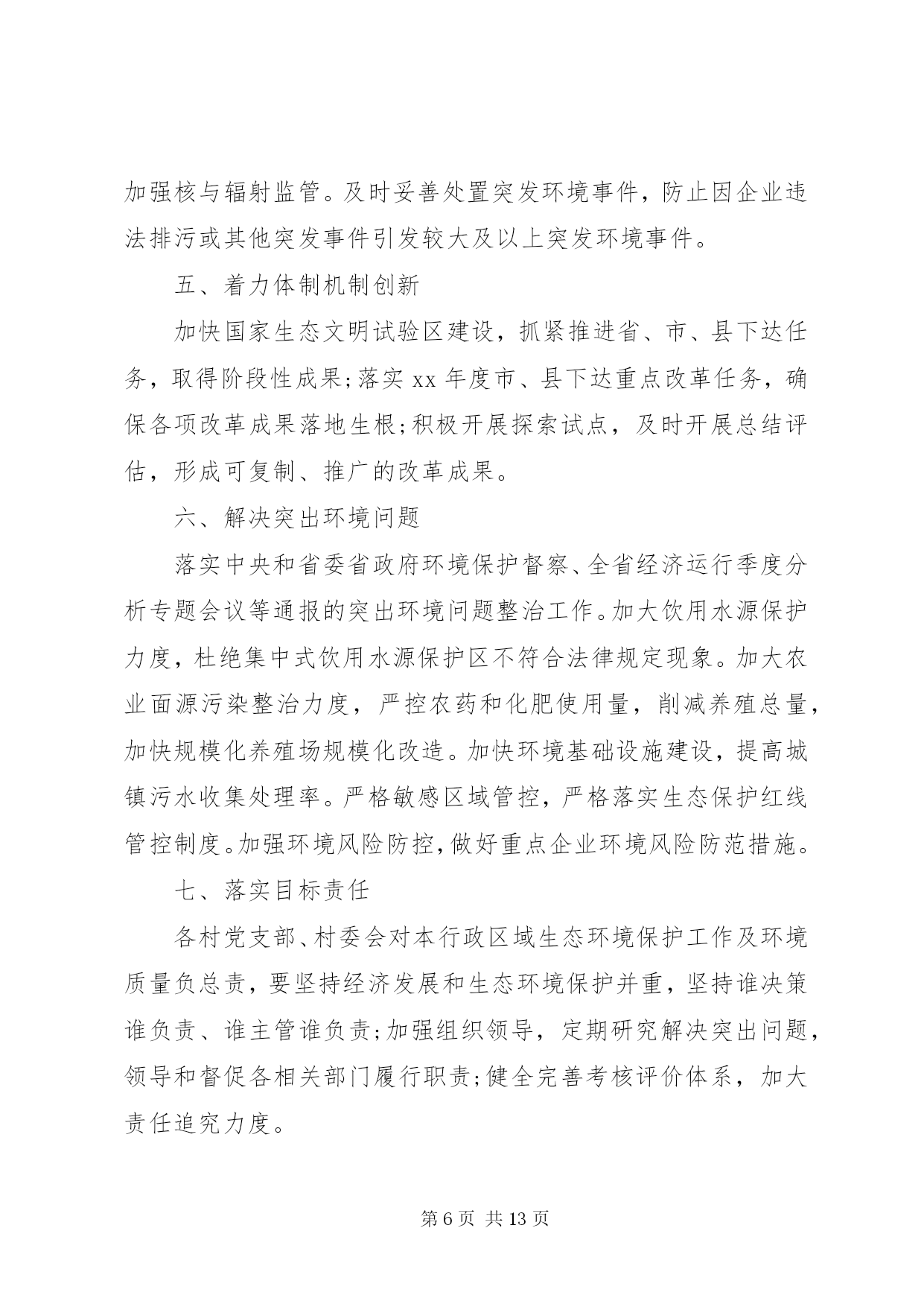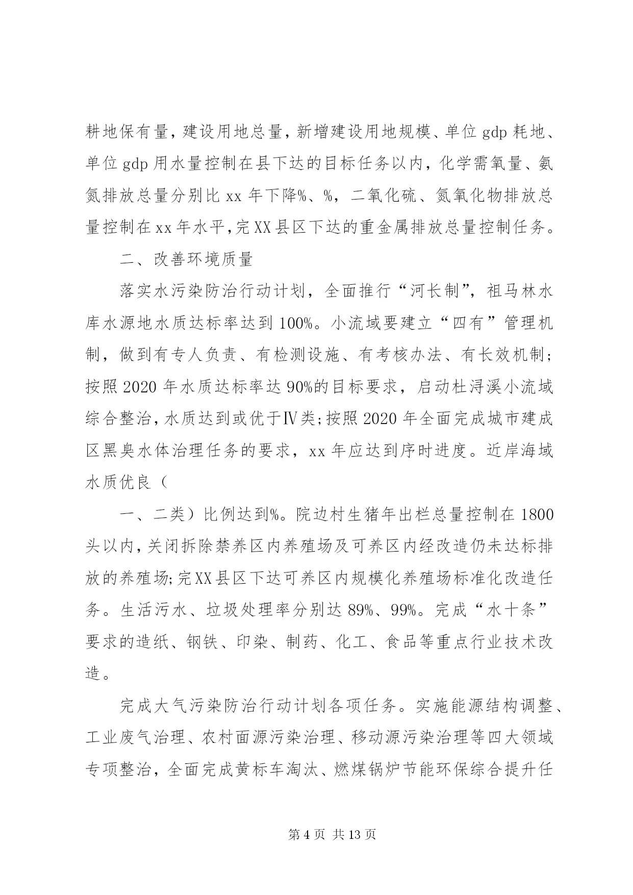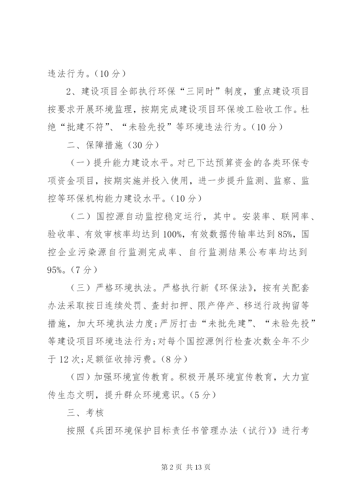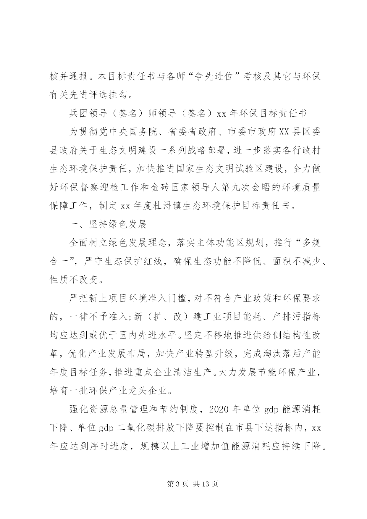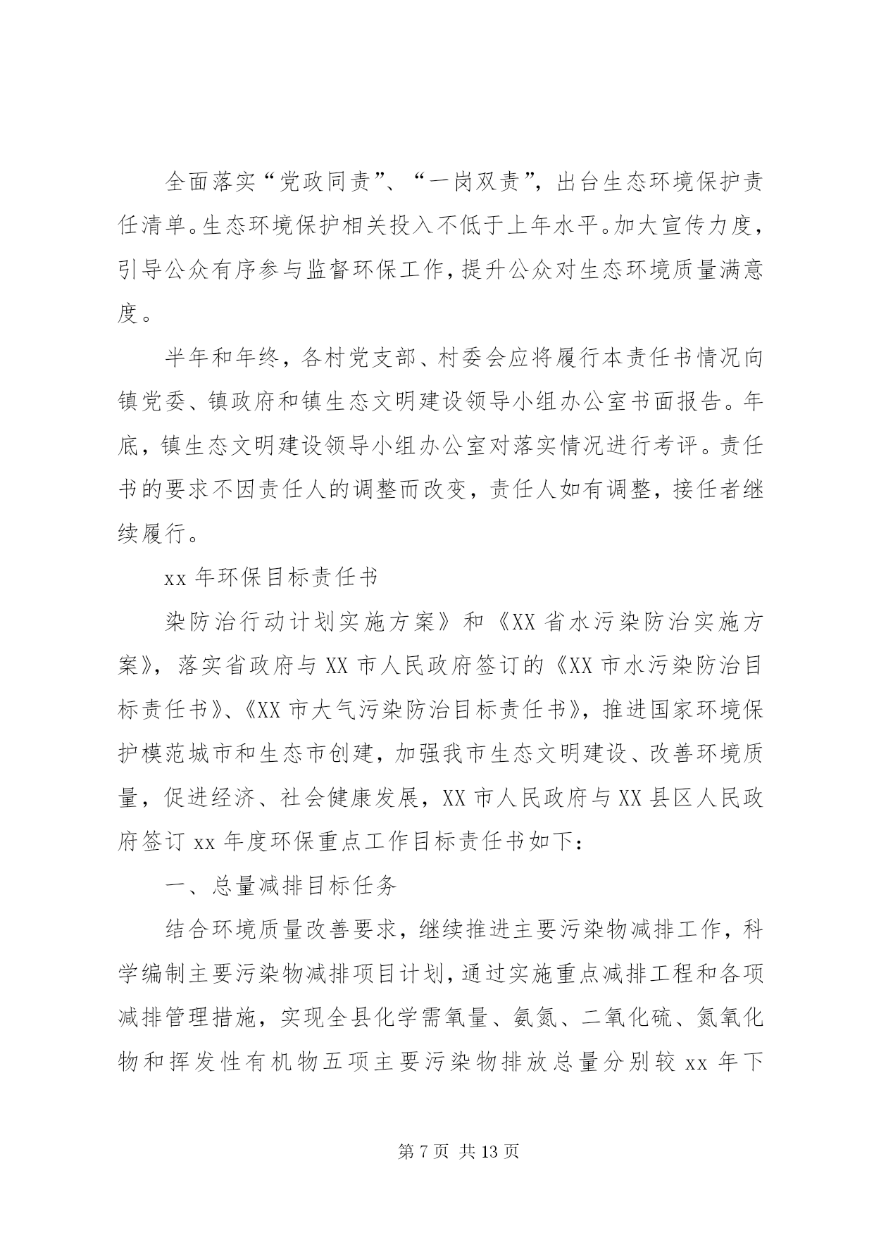 第PAGE\*Arabic\*MERGEFORMAT13页共NUMPAGES\*MERGEFORMAT13页煤矿环保目标责任书xx年环保目标责任书xx年环保目标责任书为贯彻落实兵团党委六届十四次全委(扩大)会议和20年兵团建设环保电视电话会议精神,全面完成“十二五”规划各项目标任务,严格执行新《环保法》,制订20年兵团环境保护工作目标责任书如下。一、目标和任务(70分)(一)污染减排及治理方面(50分)1、完成主要污染物总量削减任务。其中。化学需氧量削减400吨;氨氮削减18吨;二氧化硫削减2037吨;氮氧化物削减3643吨。(10分)2、完成年度重点减排项目。(见附表)(10分)3、提高减排效率,其中。火电机组综合脱硫脱硝率达到80%以上;水泥行业综合脱硝率达到60%以上。(10分)4、完成棉浆粕粘胶纤维等行业水污染治理提标改造限期治理项目(见附表)。按照锅炉污染物新排放标准(gb13271-xx)的要求,按时完成锅炉污染排放提标改造工作。(20分)(二)建设项目环境管理方面(20分)1、建设项目全部依法执行环评制度。按期完成清理违法违规建设项目工作,杜绝“未批先建”、擅自变更建设内容等环境违法行为。(10分)2、建设项目全部执行环保“三同时”制度,重点建设项目按要求开展环境监理,按期完成建设项目环保竣工验收工作。杜绝“批建不符”、“未验先投”等环境违法行为。(10分)二、保障措施(30分)(一)提升能力建设水平。对已下达预算资金的各类环保专项资金项目,按期实施并投入使用,进一步提升监测、监察、监控等环保机构能力建设水平。(10分)(二)国控源自动监控稳定运行,其中。安装率、联网率、验收率、有效审核率均达到100%,有效数据传输率达到85%,国控企业污染源自行监测完成率、自行监测结果公布率均达到95%。(7分)(三)严格环境执法。严格执行新《环保法》,按有关配套办法采取按日连续处罚、查封扣押、限产停产、移送行政拘留等措施,加大环境执法力度;严厉打击“未批先建”、“未验先投”等建设项目环境违法行为;对每个国控源例行检查次数全年不少于12次;足额征收排污费。(8分)(四)加强环境宣传教育。积极开展环境宣传教育,大力宣传生态文明,提升群众环境意识。(5分)三、考核按照《兵团环境保护目标责任书管理办法(试行)》进行考核并通报。本目标责任书与各师“争先进位”考核及其它与环保有关先进评选挂勾。兵团领导(签名)师领导(签名)xx年环保目标责任书为贯彻党中央国务院、省委省政府、市委市政府XX县区委县政府关于生态文明建设一系列战略部署,进一步落实各行政村生态环境保护责任,加快推进国家生态文明试验区建设,全力做好环保督察迎检工作和金砖国家领导人第九次会晤的环境质量保障工作,制定xx年度杜浔镇生态环境保护目标责任书。一、坚持绿色发展全面树立绿色发展理念,落实主体功能区规划,推行“多规合一”,严守生态保护红线,确保生态功能不降低、面积不减少、性质不改变。严把新上项目环境准入门槛,对不符合产业政策和环保要求的,一律不予准入;新(扩、改)建工业项目能耗、产排污指标均应达到或优于国内先进水平。坚定不移地推进供给侧结构性改革,优化产业发展布局,加快产业转型升级,完成淘汰落后产能年度目标任务,推进重点企业清洁生产。大力发展节能环保产业,培育一批环保产业龙头企业。强化资源总量管理和节约制度,2020年单位gdp能源消耗下降、单位gdp二氧化碳排放下降要控制在市县下达指标内,xx年应达到序时进度,规模以上工业增加值能源消耗应持续下降。耕地保有量,建设用地总量,新增建设用地规模、单位gdp耗地、单位gdp用水量控制在县下达的目标任务以内,化学需氧量、氨氮排放总量分别比xx年下降%、%,二氧化硫、氮氧化物排放总量控制在xx年水平,完XX县区下达的重金属排放总量控制任务。二、改善环境质量落实水污染防治行动计划,全面推行“河长制”,祖马林水库水源地水质达标率达到100%。小流域要建立“四有”管理机制,做到有专人负责、有检测设施、有考核办法、有长效机制;按照2020年水质达标率达90%的目标要求,启动杜浔溪小流域综合整治,水质达到或优于Ⅳ类;按照2020年全面完成城市建成区黑臭水体治理任务的要求,xx年应达到序时进度。近岸海域水质优良(一、二类)比例达到%。院边村生猪年出栏总量控制在1800头以内,关闭拆除禁养区内养殖场及可养区内经改造仍未达标排放的养殖场;完XX县区下达可养区内规模化养殖场标准化改造任务。生活污水、垃圾处理率分别达89%、99%。完成“水十条”要求的造纸、钢铁、印染、制药、化工、食品等重点行业技术改造。完成大气污染防治行动计划各项任务。实施能源结构调整、工业废气治理、农村面源污染治理、移动源污染治理等四大领域专项整治,全面完成黄