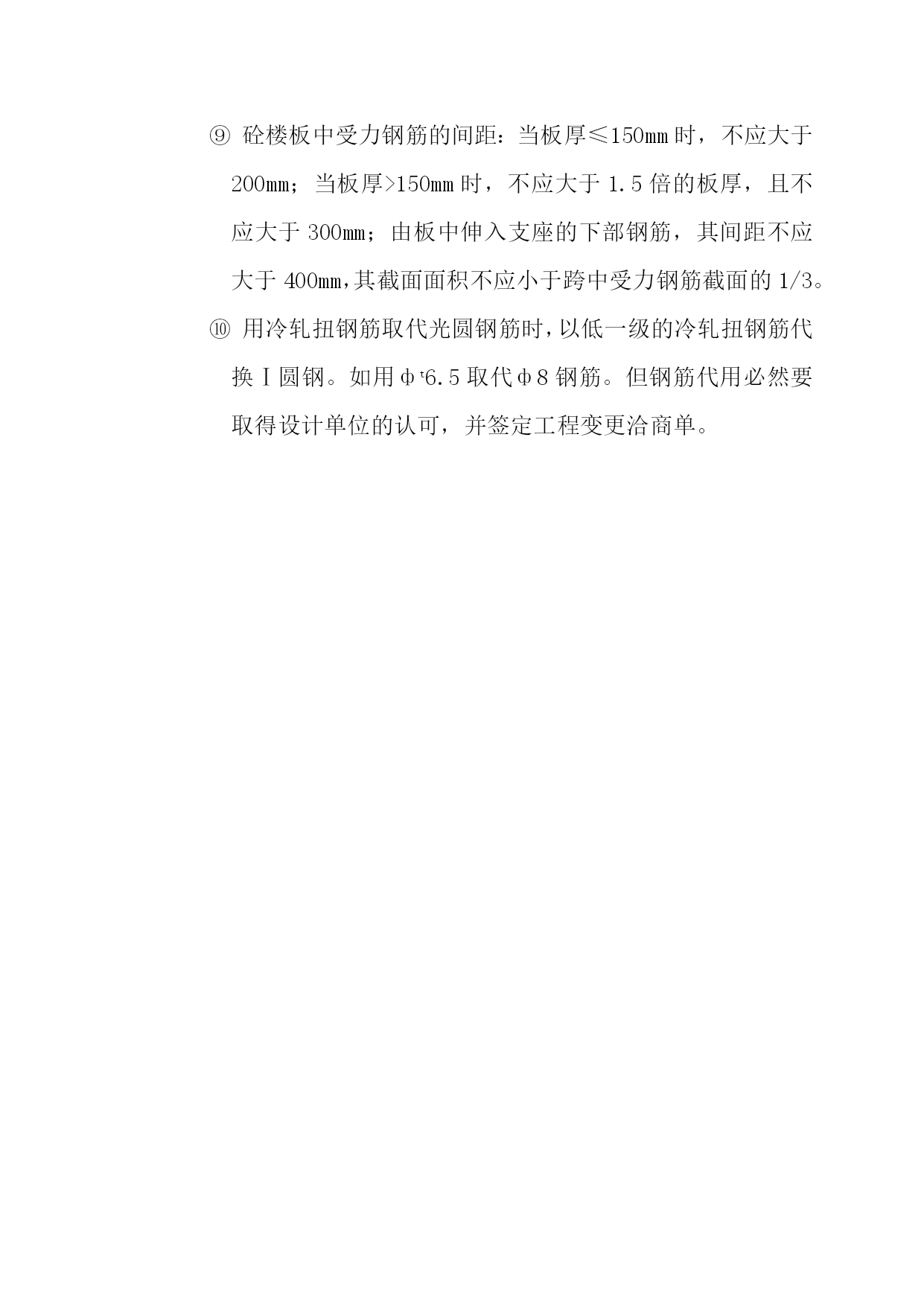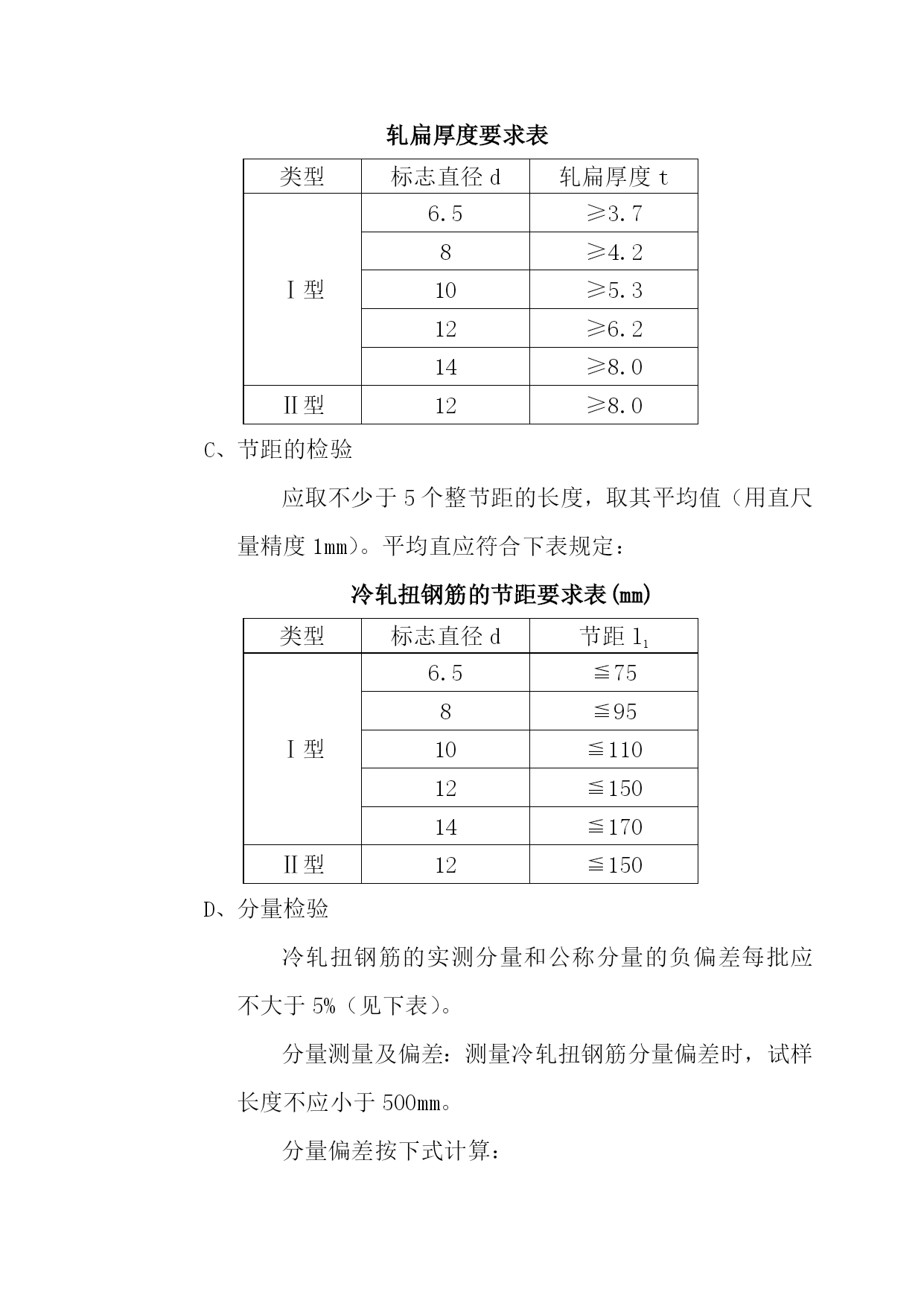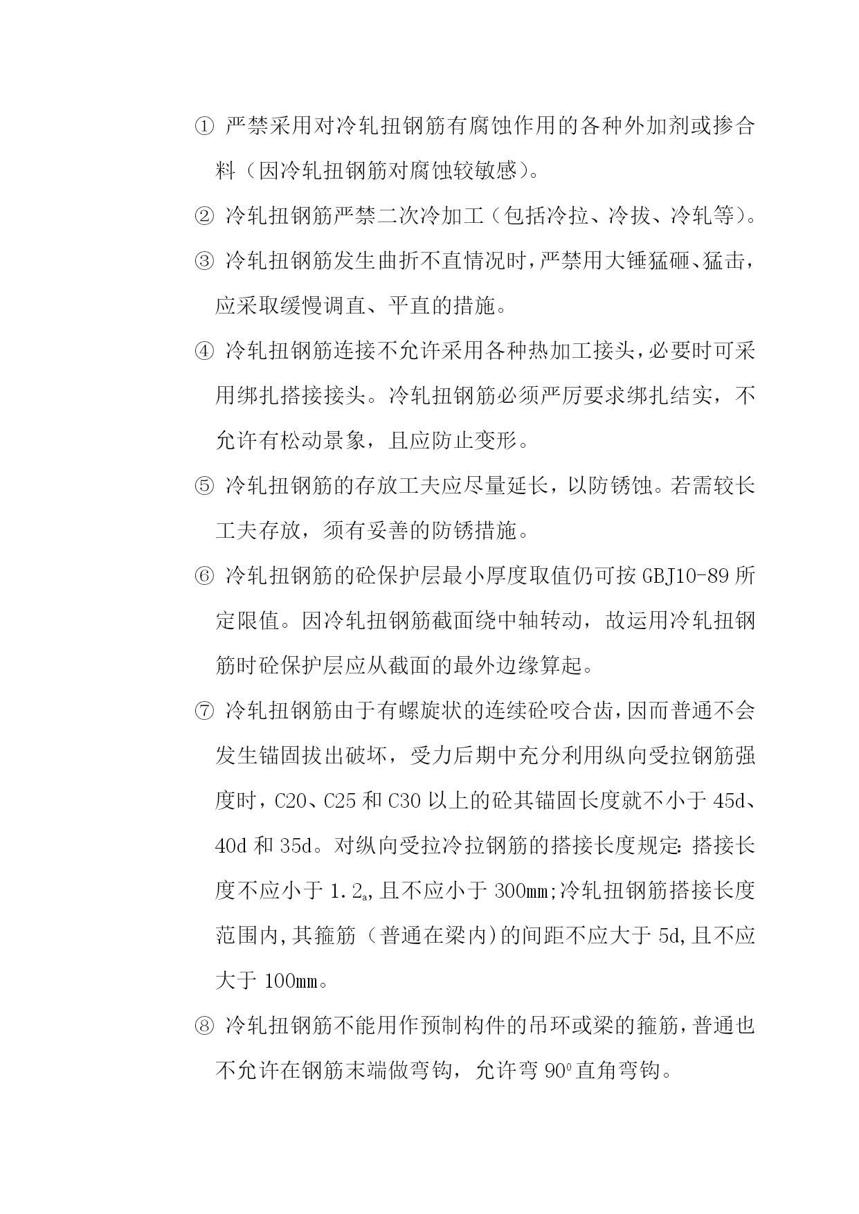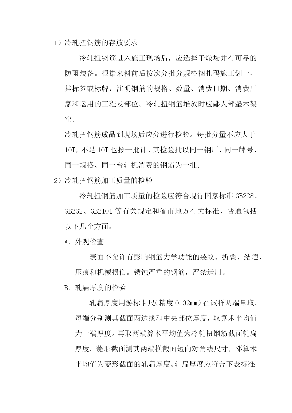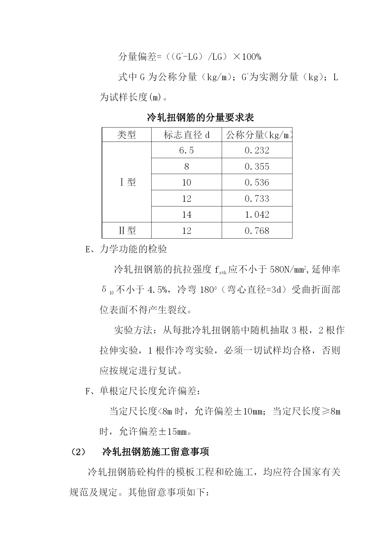 冷轧扭钢筋施工本工程一切的板筋均采用冷轧扭筋。(1)冷轧扭钢筋的特点冷轧扭钢筋是用Ⅰ级Q215、Q235热轧圆盘条(φ6.5-φ14)作母材,经冷轧扭机工而成的冷强化钢筋,即对其母材的经伟方向同时进行冷加工,在保留原截面中心区域晶体的绝对平衡和不变的前提下,在进步抗拉(压)强度的同时,仍保留足够的延性,使冷轧钢筋的几何参数(轧扁厚度、截面宽厚比、面缩率、节距)和4项材质目标(抗拉强度、条件屈服值、延伸率和冷弯)达到优化。其加工工艺流程如下:┌────┐┌───┐┌───┐┌────┐│调直拉伸│→│轧扁│→│扭转│→│定长切断│└────┘└───┘└───┘└────┘次要优点:①冷轧扭钢筋虽为无明显流辐的钢筋,但受弯构件破坏前仍有相当的延续工夫,属延性破坏;②在允许出现裂缝的现浇板类构件运用时,可考虑不超过15%的塑性内力重分布;③冷轧扭钢筋比普通热轧园钢(Ⅰ级)强度高,可节约钢材约40%,节约投资;④加工运用便,可按施工需求,由加工厂按计划加工定尺成形,也可在现场直接加工,冷轧扭钢筋有特殊的螺旋形,铺设安装绑扎方便,不易移位,钢筋骨架刚度增大、全体性好,不易因施工被踩踏而变形,与混凝土结握裹力强,可防止砼膨胀裂缝,保证砼的质量,加快施工速度。冷轧扭钢筋施工冷轧扭钢筋的存放要求冷轧扭钢筋进入施工现场后,应选择干燥场并有可靠的防雨装备。根据来料前后按次分批分规格捆扎码施工划一,挂标签或标牌,注明钢筋的规格、数量、消费日期、消费厂家和运用的工程及部位。冷轧扭钢筋堆放时应鄙人部垫木架空。冷轧扭钢筋成品到现场后应分进行检验。每批分量不应大于10T,不足10T也按一批计。其检验批以同一钢厂、同一牌号、同一规格、同一台轧机消费的钢筋为一批。冷轧扭钢筋加工质量的检验冷轧扭钢筋加工质量的检验应符合现行国家标准GB228、GB232、GB2101等有关规定和省市地方有关标准,普通包括以下几个方面。外观检查表面不允许有影响钢筋力学功能的裂纹、折叠、结疤、压痕和机械损伤。锈蚀严重的钢筋,严禁运用。轧扁厚度的检验轧扁厚度用游标卡尺(精度0.02mm)在试样两端量取。每端分别测其截面两边缘和中央部位厚度,取算术平均值为一端厚度。再取两端算术平均值为冷轧扭钢筋截面轧扁厚度。菱形截面测其两端横截面短向对角线尺寸,邓算术平均值为菱形截面的轧扁厚度。轧扁厚度应符合下表标准:轧扁厚度要求表类型标志直径d轧扁厚度tⅠ型6.5≥3.78≥4.210≥5.312≥6.214≥8.0Ⅱ型12≥8.0节距的检验应取不少于5个整节距的长度,取其平均值(用直尺量精度1mm)。平均直应符合下表规定:冷轧扭钢筋的节距要求表(mm)类型标志直径d节距l1Ⅰ型6.5≦758≦9510≦11012≦15014≦170Ⅱ型12≦150分量检验冷轧扭钢筋的实测分量和公称分量的负偏差每批应不大于5%(见下表)。分量测量及偏差:测量冷轧扭钢筋分量偏差时,试样长度不应小于500mm。分量偏差按下式计算:分量偏差=((G’-LG)/LG)×100%式中G为公称分量(kg/m);G’为实测分量(kg);L为试样长度(m)。冷轧扭钢筋的分量要求表类型标志直径d公称分量(kg/m)Ⅰ型6.50.23280.355100.536120.733141.042Ⅱ型120.768力学功能的检验冷轧扭钢筋的抗拉强度fstk应不小于580N/mm2,延伸率δ10不小于4.5%,冷弯1800(弯心直径=3d)受曲折面部位表面不得产生裂纹。实验方法:从每批冷轧扭钢筋中随机抽取3根,2根作拉伸实验,1根作冷弯实验,必须一切试样均合格,否则应按规定进行复试。单根定尺长度允许偏差:当定尺长度<8m时,允许偏差±10mm;当定尺长度≥8m时,允许偏差±15mm。冷轧扭钢筋施工留意事项冷轧扭钢筋砼构件的模板工程和砼施工,均应符合国家有关规范及规定。其他留意事项如下:严禁采用对冷轧扭钢筋有腐蚀作用的各种外加剂或掺合料(因冷轧扭钢筋对腐蚀较敏感)。冷轧扭钢筋严禁二次冷加工(包括冷拉、冷拔、冷轧等)。冷轧扭钢筋发生曲折不直情况时,严禁用大锤猛砸、猛击,应采取缓慢调直、平直的措施。冷轧扭钢筋连接不允许采用各种热加工接头,必要时可采用绑扎搭接接头。冷轧扭钢筋必须严厉要求绑扎结实,不允许有松动景象,且应防止变形。冷轧扭钢筋的存放工夫应尽量延长,以防锈蚀。若需较长工夫存放,须有妥善的防锈措施。冷轧扭钢筋的砼保护层最小厚度取值仍可按GBJ10-89所定限值。因冷轧扭钢筋截面绕中轴转动,故运用冷轧扭钢筋时砼保护层应从截面的最外边缘算起。冷轧扭钢筋由于有螺旋状的连续砼咬合齿,因而普通不会发生锚固拔出破坏,受力后期中充分利用纵向受拉钢筋强度时,C20、C25和C3