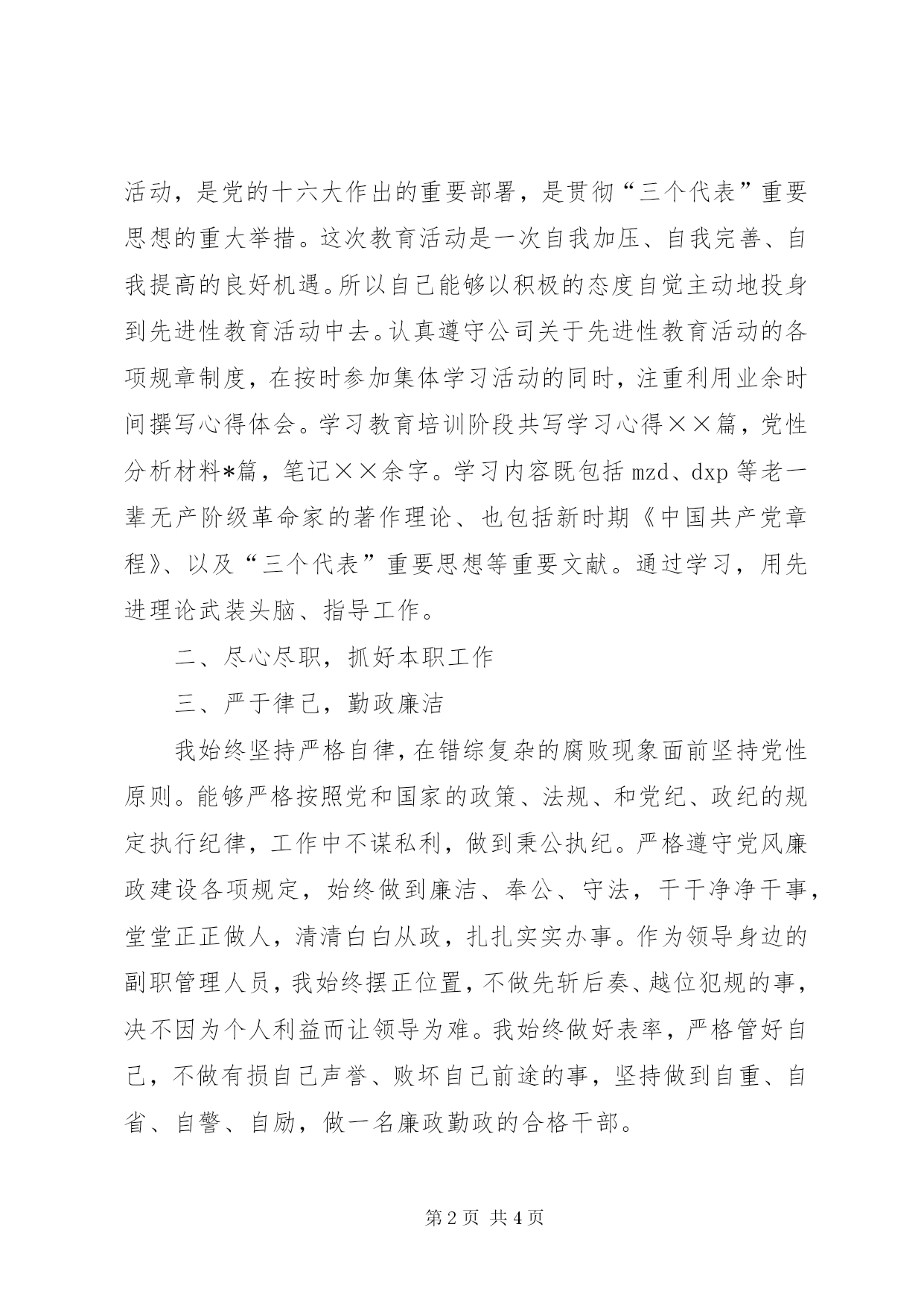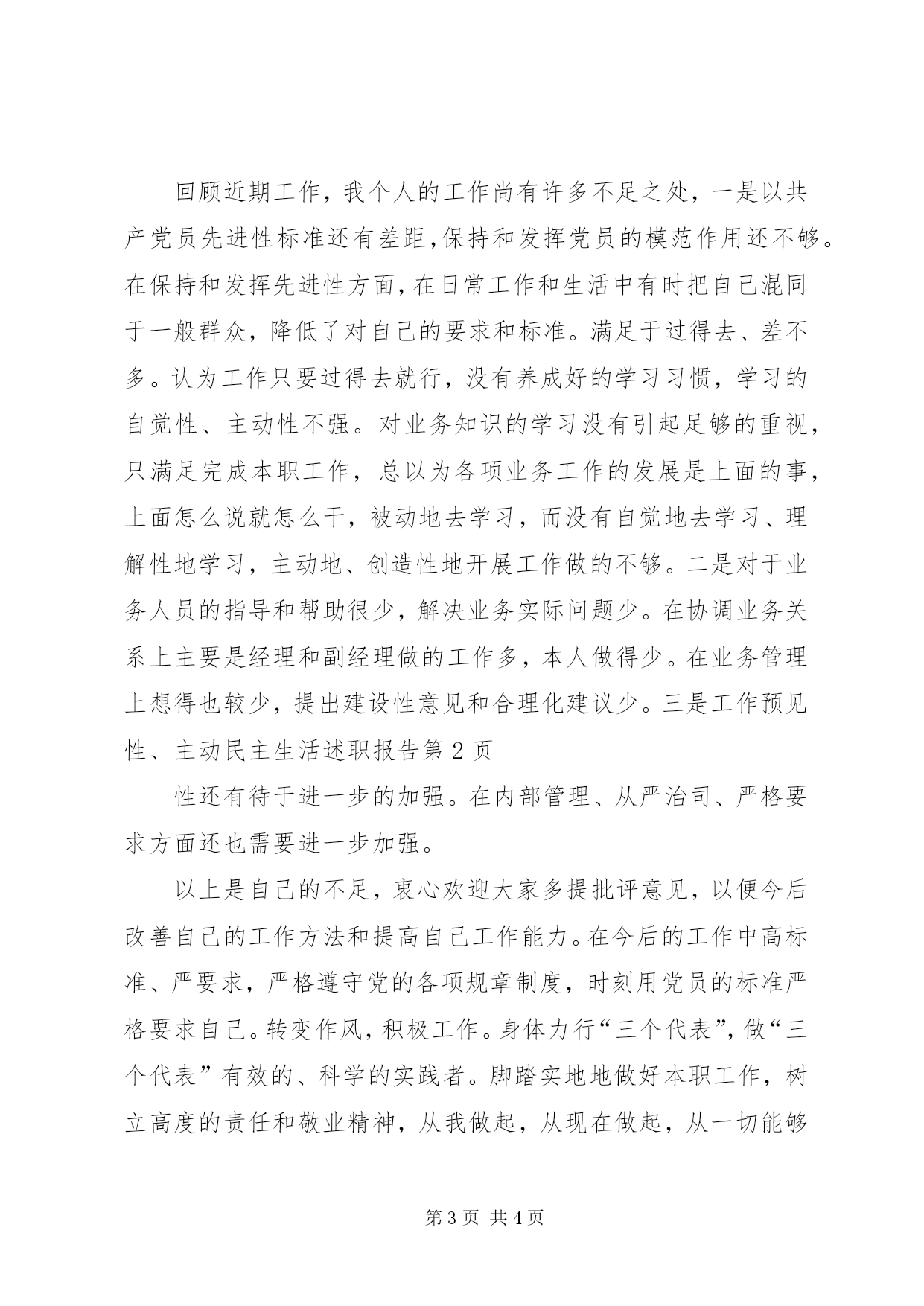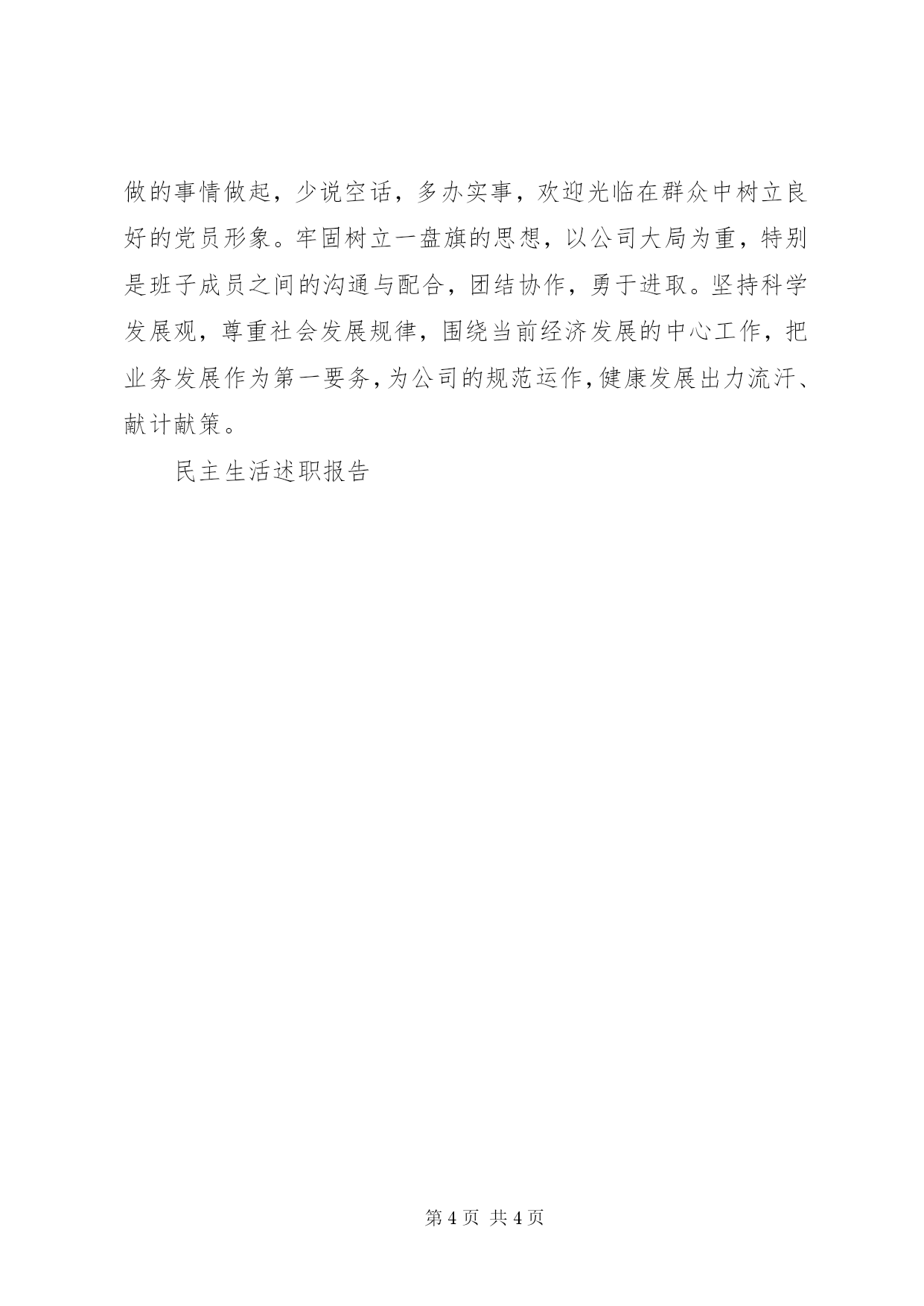第PAGE\*Arabic\*MERGEFORMAT4页共NUMPAGES\*MERGEFORMAT4页民主生活述职报告民主生活会个人述职报告各位领导、同事们:紧张、忙碌的20xx年已进入金秋十月。回顾这段时间以来,我们在上级公司党委的领导下,全体员工克服各种不利因素,同舟共济,不断拓宽服务领域,各项工作取得了一定的进展和提高。在保持共产党员先进性教育活动中,全体党员领导干部认真学习,认真撰写学习笔记,通过学习,用科学的理论武装头脑,更新了观念,振奋了精神,对如何永葆共产党员先进性及今后的保险工作中如何发挥共产党员的先进性有了明确的目标,尤其加深了对“三个代表”重要思想的理解。按照把整改贯穿始终的要求,在学习教育活动中注重有针对性地查摆自己在人生观、世界观、价值观等方面存在的突出问题,边学习、边查摆、边整改、边提高。下面,我就将我的思想工作等情况向领导、同志们汇报如下:一、认真加强政治理论学习作为公司的一名管理人员,思想政治素质的高低,是能否做好管理工作的思想基础,要想提高公司的管理水平,提高自己的政治素质,这就要求自己平时不断地加强政治理论的学习。多年来,本人除了积极参加公司组织的政治学习,还能够利用业余时间认真学习政治思想工作等理论书籍,特别是在保持共产党员先进性教育活动中,自己能够充分认识到先进性教育活动的重大历史意义和现实意义。开展保先进性教育活动,是党的十六大作出的重要部署,是贯彻“三个代表”重要思想的重大举措。这次教育活动是一次自我加压、自我完善、自我提高的良好机遇。所以自己能够以积极的态度自觉主动地投身到先进性教育活动中去。认真遵守公司关于先进性教育活动的各项规章制度,在按时参加集体学习活动的同时,注重利用业余时间撰写心得体会。学习教育培训阶段共写学习心得××篇,党性分析材料*篇,笔记××余字。学习内容既包括mzd、dxp等老一辈无产阶级革命家的著作理论、也包括新时期《中国共产党章程》、以及“三个代表”重要思想等重要文献。通过学习,用先进理论武装头脑、指导工作。二、尽心尽职,抓好本职工作三、严于律己,勤政廉洁我始终坚持严格自律,在错综复杂的腐败现象面前坚持党性原则。能够严格按照党和国家的政策、法规、和党纪、政纪的规定执行纪律,工作中不谋私利,做到秉公执纪。严格遵守党风廉政建设各项规定,始终做到廉洁、奉公、守法,干干净净干事,堂堂正正做人,清清白白从政,扎扎实实办事。作为领导身边的副职管理人员,我始终摆正位置,不做先斩后奏、越位犯规的事,决不因为个人利益而让领导为难。我始终做好表率,严格管好自己,不做有损自己声誉、败坏自己前途的事,坚持做到自重、自省、自警、自励,做一名廉政勤政的合格干部。回顾近期工作,我个人的工作尚有许多不足之处,一是以共产党员先进性标准还有差距,保持和发挥党员的模范作用还不够。在保持和发挥先进性方面,在日常工作和生活中有时把自己混同于一般群众,降低了对自己的要求和标准。满足于过得去、差不多。认为工作只要过得去就行,没有养成好的学习习惯,学习的自觉性、主动性不强。对业务知识的学习没有引起足够的重视,只满足完成本职工作,总以为各项业务工作的发展是上面的事,上面怎么说就怎么干,被动地去学习,而没有自觉地去学习、理解性地学习,主动地、创造性地开展工作做的不够。二是对于业务人员的指导和帮助很少,解决业务实际问题少。在协调业务关系上主要是经理和副经理做的工作多,本人做得少。在业务管理上想得也较少,提出建设性意见和合理化建议少。三是工作预见性、主动民主生活述职报告性还有待于进一步的加强。在内部管理、从严治司、严格要求方面还也需要进一步加强。以上是自己的不足,衷心欢迎大家多提批评意见,以便今后改善自己的工作方法和提高自己工作能力。在今后的工作中高标准、严要求,严格遵守党的各项规章制度,时刻用党员的标准严格要求自己。转变作风,积极工作。身体力行“三个代表”,做“三个代表”有效的、科学的实践者。脚踏实地地做好本职工作,树立高度的责任和敬业精神,从我做起,从现在做起,从一切能够做的事情做起,少说空话,多办实事,欢迎光临在群众中树立良好的党员形象。牢固树立一盘旗的思想,以公司大局为重,特别是班子成员之间的沟通与配合,团结协作,勇于进取。坚持科学发展观,尊重社会发展规律,围绕当前经济发展的中心工作,把业务发展作为第一要务,为公司的规范运作,健康发展出力流汗、献计献策。民主生活述职报告