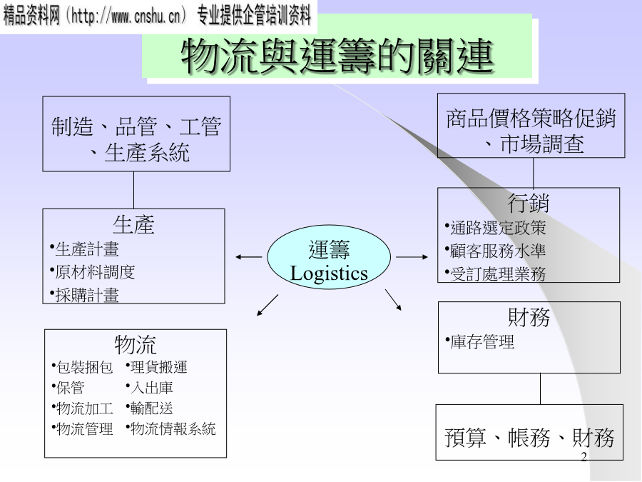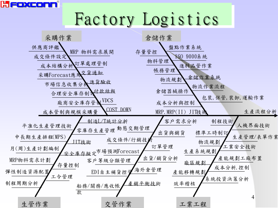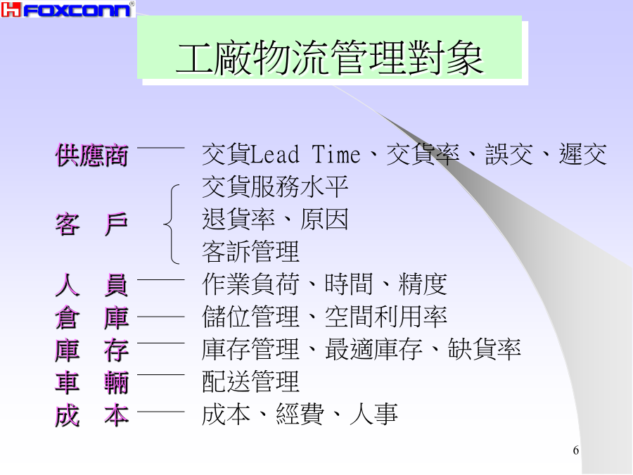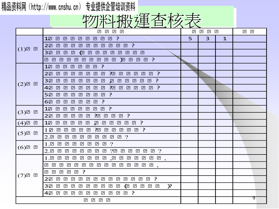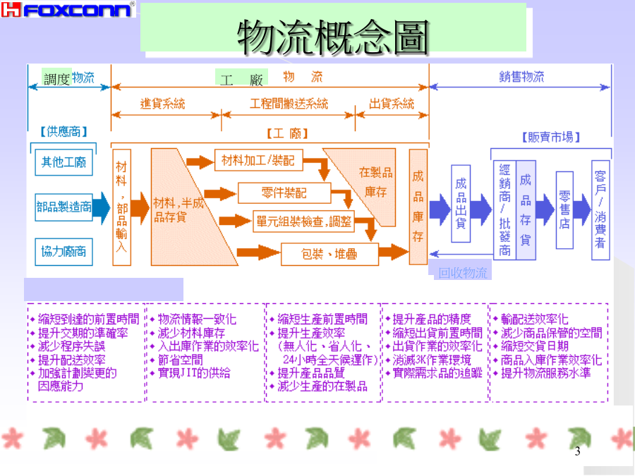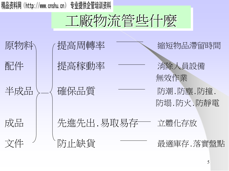工廠物流簡介運籌Logistics調度采購作業原物料提高周轉率縮短物品滯留時間配件提高稼動率消除人員設備無效作業半成品確保品質防潮.防塵.防撞.防塌.防火.防靜電成品先進先出.易取易存立體化存放文件防止缺貨最適庫存.落實盤點供應商交貨LeadTime、交貨率、誤交、遲交交貨服務水平退貨率、原因客訴管理人員作業負荷、時間、精度倉庫儲位管理、空間利用率庫存庫存管理、最適庫存、缺貨率車輛配送管理成本成本、經費、人事常見的缺失物料保管查核表物料搬運查核表物料滯留管理縮短生產LEADTIME貫徹儲位管理消除尋找的動作消除步行的動作倉碼、儲位PICKLIST清晰PICKLIST安排單方向進行ABC分析放在該放的地方易取易存集中品目所需面積禁止外人入內處於使用狀態流動品、緩衝品強化盤點改良貨品補充方式避免二次物流供應商無人搬運車堆高機手推車起重機輸送帶工廠物流管理的要點整理方式三定原則:定ITEM、定位置、定數量.明確區域:倉庫、走道、禁置區.LAYOUT合理:立體化---利用有效空間機能化---品質、易取易存、先進先出安全化---隔離、措施、下重上輕顏色管理儲位管理:廠區→建物→區域→貨架→隔位→層別標示牌:倉號→品名→包裝方式、數量→移動周期→責任人→前后制程PHYSICALCOUNT定期盤點算出正確損益停止生產、轉出入作業年中、年末每年二次CYCLECOUNT循環盤點提高庫存精確生產作業不停度---A類.每月一次B類.每3月一次C類.半年一次盤點計劃----ABC分析、決定周期、訂時程表盤點會議----ITEM、責任人、工具、方法盤點----個別計數法、重量、容量法稽核----帳物不符、抽樣稽核統計結果----依ITEM別、分析差異原因修正帳本檢討----改善、評估ABC分析提高指數的步驟1.調查現況2.比較后決定改善方向3.提出改善創意1.第10的庫存時間3天2.9月8日的庫存5個出入庫曲線平行:生產安定出入庫曲線開張(壓縮):制程不協調平行線縮小:制程縮短.曲線交叉:報表失誤.Eliminate消除輕作業人員負荷輕Combination結合薄物量薄Rearrange重組時間短Simplify簡化小空間小SYSTEMGCANCEPAGESETORIGINALONECOLORSIZELINEACTIONACTIONFILELOCATIONTT型員工