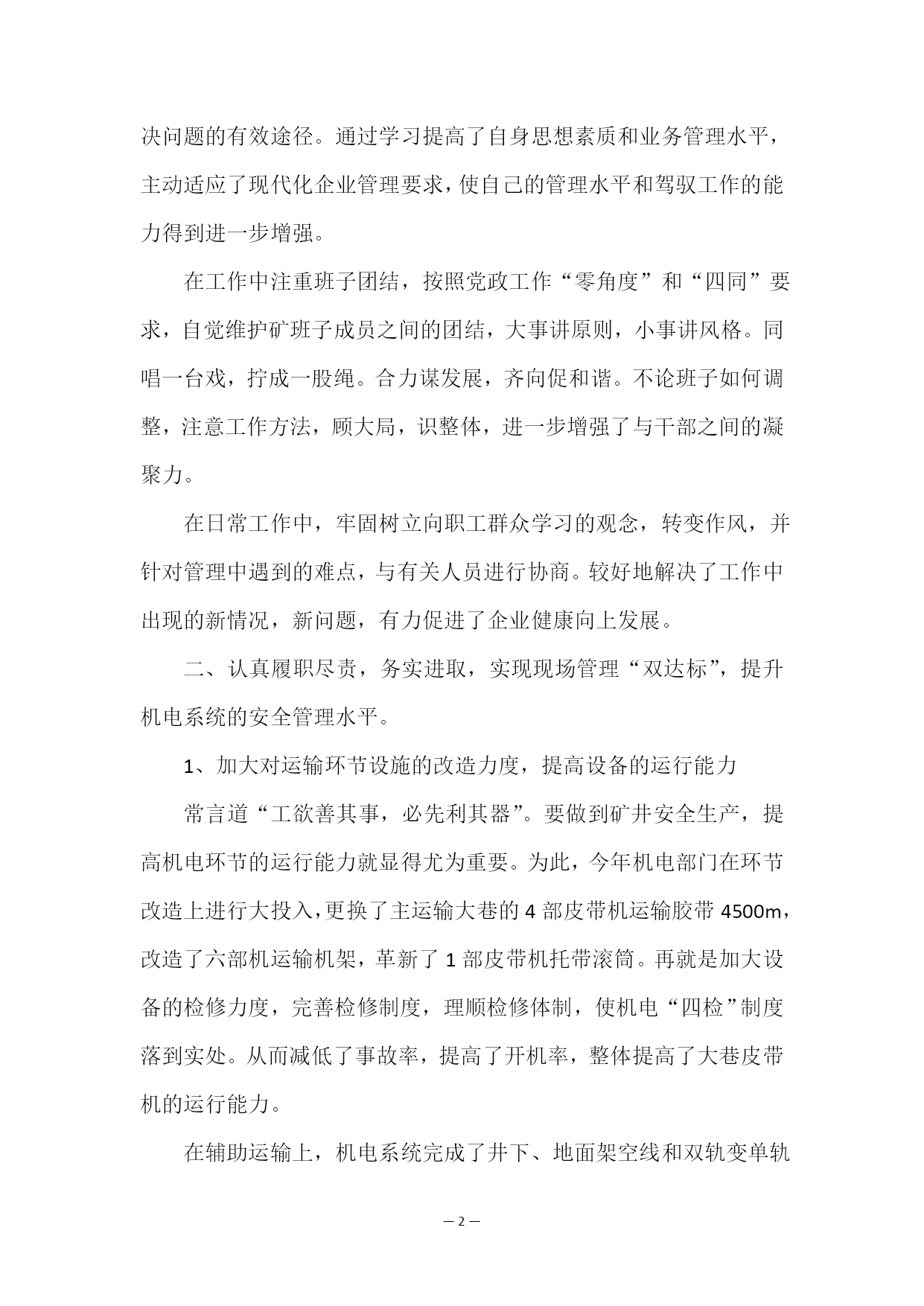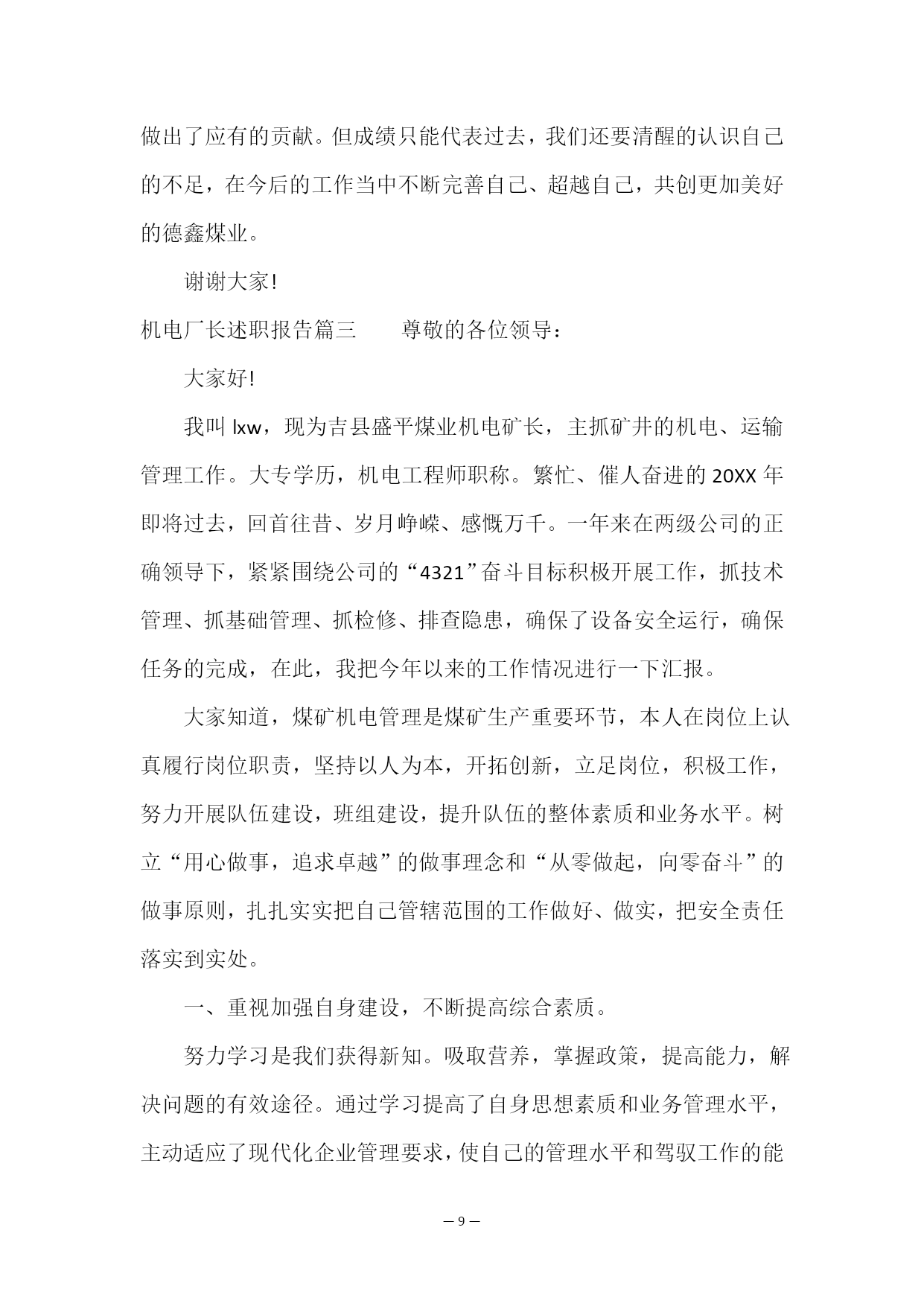 —PAGE\*MERGEFORMAT13—2022年机电厂长述职报告(3篇)“报告”使用范围很广,按照上级部署或工作计划,每完成一项任务,一般都要向上级写报告,反映工作中的基本情况、工作中取得的经验教训、存在的问题以及今后工作设想等,以取得上级领导部门的指导。怎样写报告才更能起到其作用呢?报告应该怎么制定呢?下面我就给大家讲一讲优秀的报告文章怎么写,我们一起来了解一下吧。机电厂长述职报告篇一我叫王槐山,现为吉县盛平煤业机电矿长,主抓矿井的机电、运输管理工作。大专学历,机电工程师职称。繁忙、催人奋进的20xx年即将过去,回首往昔、岁月峥嵘、感慨万千。一年来在两级公司的正确领导下,紧紧围绕公司的“4321”奋斗目标积极开展工作,抓技术管理、抓基础管理、抓检修、排查隐患,确保了设备安全运行,确保任务的完成,在此,我把今年以来的工作情况进行一下汇报。大家知道,煤矿机电管理是煤矿生产重要环节,本人在岗位上认真履行岗位职责,坚持以人为本,开拓创新,立足岗位,积极工作,努力开展队伍建设,班组建设,提升队伍的整体素质和业务水平。树立“用心做事,追求卓越”的做事理念和“从零做起,向零奋斗”的做事原则,扎扎实实把自己管辖范围的工作做好、做实,把安全责任落实到实处。一、重视加强自身建设,不断提高综合素质。努力学习是我们获得新知。吸取营养,掌握政策,提高能力,解决问题的有效途径。通过学习提高了自身思想素质和业务管理水平,主动适应了现代化企业管理要求,使自己的管理水平和驾驭工作的能力得到进一步增强。在工作中注重班子团结,按照党政工作“零角度”和“四同”要求,自觉维护矿班子成员之间的团结,大事讲原则,小事讲风格。同唱一台戏,拧成一股绳。合力谋发展,齐向促和谐。不论班子如何调整,注意工作方法,顾大局,识整体,进一步增强了与干部之间的凝聚力。在日常工作中,牢固树立向职工群众学习的观念,转变作风,并针对管理中遇到的难点,与有关人员进行协商。较好地解决了工作中出现的新情况,新问题,有力促进了企业健康向上发展。二、认真履职尽责,务实进取,实现现场管理“双达标”,提升机电系统的安全管理水平。1、加大对运输环节设施的改造力度,提高设备的运行能力常言道“工欲善其事,必先利其器”。要做到矿井安全生产,提高机电环节的运行能力就显得尤为重要。为此,今年机电部门在环节改造上进行大投入,更换了主运输大巷的4部皮带机运输胶带4500m,改造了六部机运输机架,革新了1部皮带机托带滚筒。再就是加大设备的检修力度,完善检修制度,理顺检修体制,使机电“四检”制度落到实处。从而减低了事故率,提高了开机率,整体提高了大巷皮带机的运行能力。在辅助运输上,机电系统完成了井下、地面架空线和双轨变单轨的改造,硬化了平峒大巷。对西大巷中运输线拿出了治理方案及实施办法。在矿井安全供电上,完成井下6kv线路的改造,理顺了供电关系,合理了高压供电布局,扩建了1#、3#变电所。对地面10kv变电所高压供电系统进行了扩容改造,解决了6kv单母线不分段的问题,合理了变电所的供电布局,在采掘用电分开和“三专两闭锁”方面,投入移动变电站5台,彻底解决了掘进工作面单独供电及“三专”的供电问题。使全矿供电系统趋向合理、规范。在压风系统上,对地面2台主压风机进行了检修安装、改造。淘汰了原使用的多台移动压风机,实现了集中供风,优化了压风设计,稳定了压风系统。2、加大了机电隐患的排查力度,筑牢安全生产基础在安全管理上,今年努力完善各种制度,落实有关措施。强化隐患的排查和整改,并做到责任、时间、人员、监督的“四落实”,严格按照“定时间、定人员、定责任、定整改措施、定时间效果”的“五定”原则进行闭合管理。以开展“机电隐患治理年”活动为动力,狠抓“四个到位”管理,按照“排查要认真,整理要坚决,成果要巩固,杜绝新隐患”的原则狠抓责任落实。在一些重点机电工程施工时,做到关口前移,重心下移,指挥在现场,解决问题在现场,把隐患消灭在萌芽状态,提高矿井抗风险的能力。筑牢安全防线的基础,为全矿安全和谐发展营造良好的氛围。3、加大机运专项治理,积极推进“六大阶段目标”建设在机电专项治理方面,下发了《关于开展供电运输专项整治方案》的通知,根据要求机电部门成立“三项”专项整治领导组,逐月拿出了整治内容及实施要求,把机电运输整治落到实处,从专项整治开展以来,机电运输现场管理,基础管理有了明显的提升。在辅助运输整治过程中,下发了《关于规范矿井调度绞车运行管理的规定》和《关于规范西大巷绞车运输管理的规定》的管理文件,更换矿车防脱销150套,制做了车尾巴20付,更换了原有的平板人车15辆,对“四超”车辆入井做了规定,对材料入井明确捆绑要求,加装了道岔10付,制作了各类牌版20多块,治理轨道1500m,加装轨距拉杆50