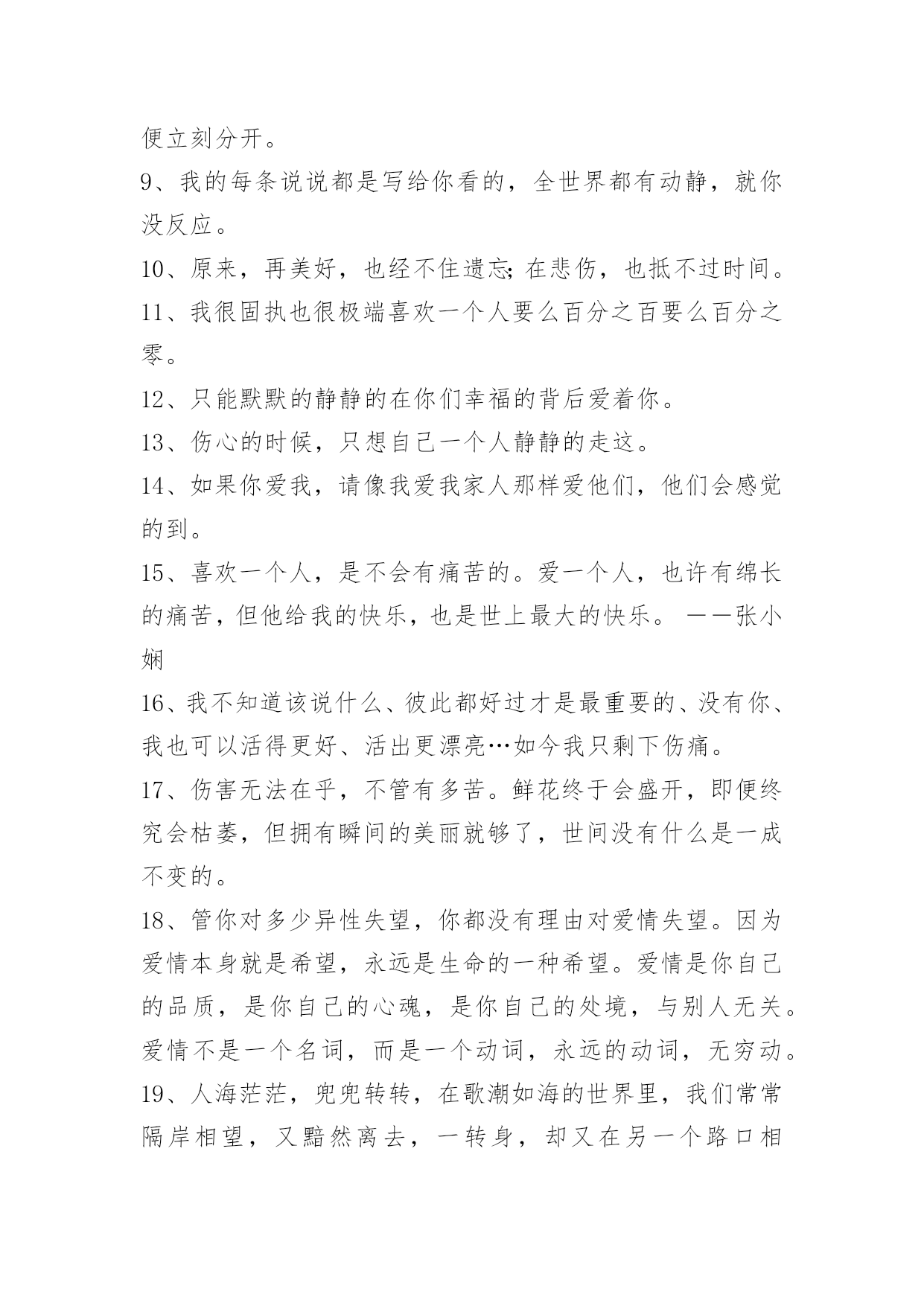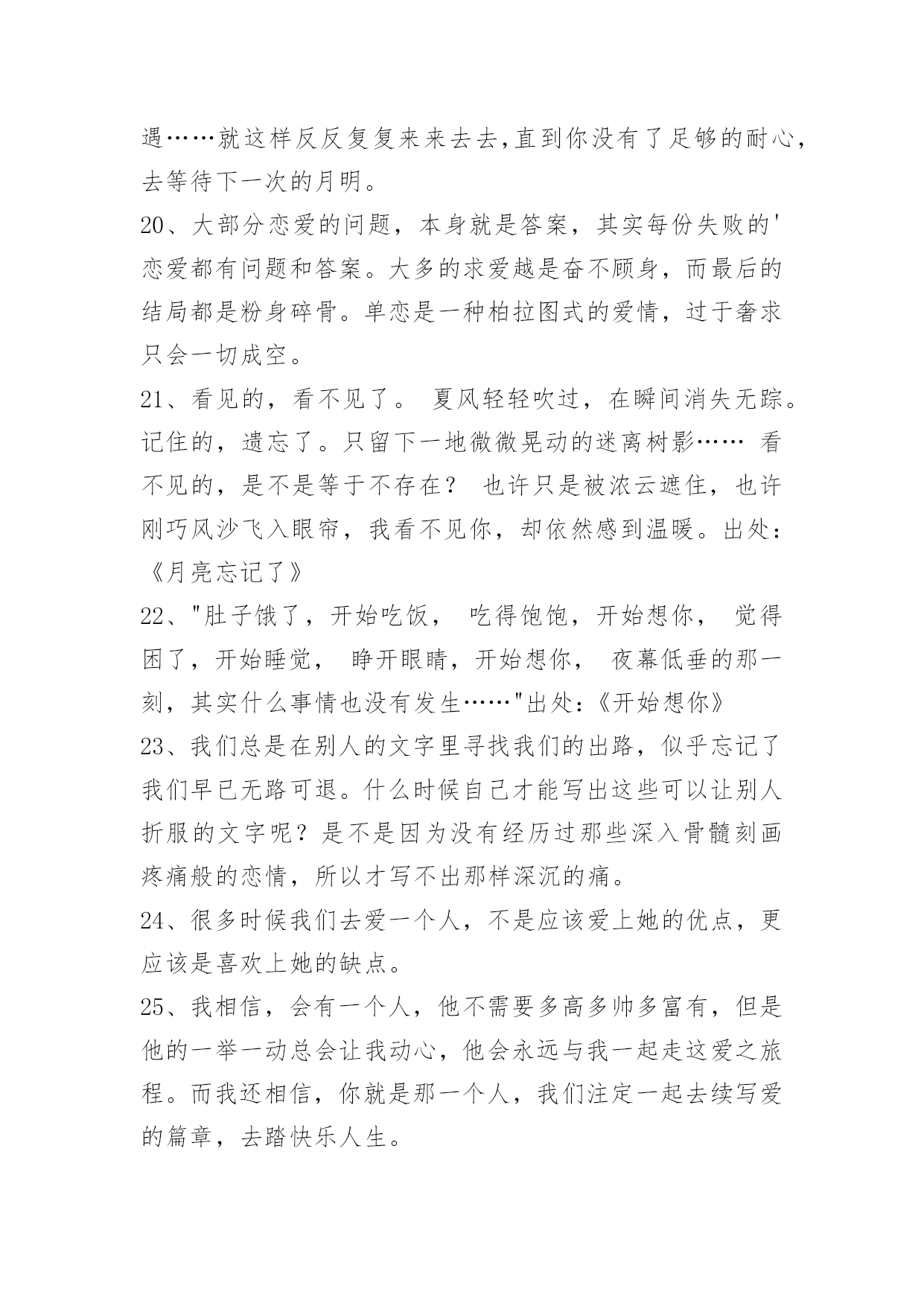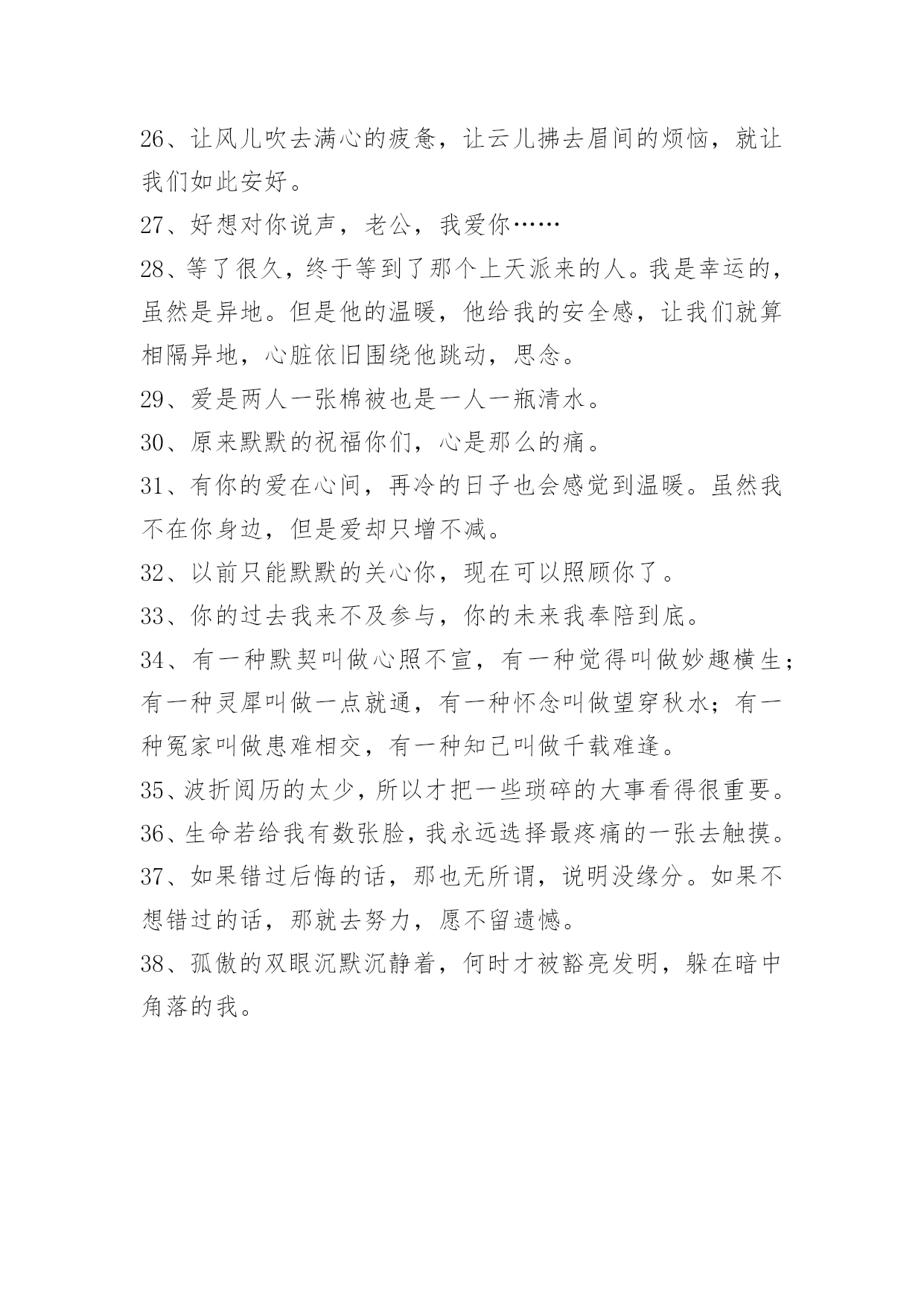 感人爱情语录38条实用的感人爱情语录集合38条你的回忆有多少页我要怎么才能翻阅我一个人的音阶。以下是小编给各位读者分享的感人爱情语录38条,欢迎大家分享。1、那一段时光,是我一生中最珍贵,最美好的时光。2、曾经欠的太多、如今努力的偿还。3、一个人有钱没钱不一定,但如果这个人没有了梦想,这个人也就是穷定了。4、在每天的早晨,捧上一杯你最爱喝的牛奶,祝你一天像奶牛一样温厚无怒;你出门的时候,递上一份报纸,在等车的时候用来消磨时间,我做的只是让你快乐!5、亲爱的老婆我爱你,嘴巴想吻你,眼睛想看你,两手想抱你,心里总是想着你,梦中拥着你,今生全依你,绝不委屈你。6、如果有想见的人,那么就一定不再是一个人。《夏目友人帐》7、十七岁,你可以错过和一个男生的约会,但是你不可以错过左耳。8、爱情原是锦上添花的事,男女互相为对方倾倒,糊里糊涂那么一刻两刻时分,便视为爱情,等到看清楚之后,不外是那么一回事,双方可以容忍的,便相处下来,不能够的,便立刻分开。9、我的每条说说都是写给你看的,全世界都有动静,就你没反应。10、原来,再美好,也经不住遗忘;在悲伤,也抵不过时间。11、我很固执也很极端喜欢一个人要么百分之百要么百分之零。12、只能默默的静静的在你们幸福的背后爱着你。13、伤心的时候,只想自己一个人静静的走这。14、如果你爱我,请像我爱我家人那样爱他们,他们会感觉的到。15、喜欢一个人,是不会有痛苦的。爱一个人,也许有绵长的痛苦,但他给我的快乐,也是世上最大的快乐。――张小娴16、我不知道该说什么、彼此都好过才是最重要的、没有你、我也可以活得更好、活出更漂亮…如今我只剩下伤痛。17、伤害无法在乎,不管有多苦。鲜花终于会盛开,即便终究会枯萎,但拥有瞬间的美丽就够了,世间没有什么是一成不变的。18、管你对多少异性失望,你都没有理由对爱情失望。因为爱情本身就是希望,永远是生命的一种希望。爱情是你自己的品质,是你自己的心魂,是你自己的处境,与别人无关。爱情不是一个名词,而是一个动词,永远的动词,无穷动。19、人海茫茫,兜兜转转,在歌潮如海的世界里,我们常常隔岸相望,又黯然离去,一转身,却又在另一个路口相遇……就这样反反复复来来去去,直到你没有了足够的耐心,去等待下一次的月明。20、大部分恋爱的问题,本身就是答案,其实每份失败的'恋爱都有问题和答案。大多的求爱越是奋不顾身,而最后的结局都是粉身碎骨。单恋是一种柏拉图式的爱情,过于奢求只会一切成空。21、看见的,看不见了。夏风轻轻吹过,在瞬间消失无踪。记住的,遗忘了。只留下一地微微晃动的迷离树影……看不见的,是不是等于不存在?也许只是被浓云遮住,也许刚巧风沙飞入眼帘,我看不见你,却依然感到温暖。出处:《月亮忘记了》22、"肚子饿了,开始吃饭,吃得饱饱,开始想你,觉得困了,开始睡觉,睁开眼睛,开始想你,夜幕低垂的那一刻,其实什么事情也没有发生……"出处:《开始想你》23、我们总是在别人的文字里寻找我们的出路,似乎忘记了我们早已无路可退。什么时候自己才能写出这些可以让别人折服的文字呢?是不是因为没有经历过那些深入骨髓刻画疼痛般的恋情,所以才写不出那样深沉的痛。24、很多时候我们去爱一个人,不是应该爱上她的优点,更应该是喜欢上她的缺点。25、我相信,会有一个人,他不需要多高多帅多富有,但是他的一举一动总会让我动心,他会永远与我一起走这爱之旅程。而我还相信,你就是那一个人,我们注定一起去续写爱的篇章,去踏快乐人生。26、让风儿吹去满心的疲惫,让云儿拂去眉间的烦恼,就让我们如此安好。27、好想对你说声,老公,我爱你……28、等了很久,终于等到了那个上天派来的人。我是幸运的,虽然是异地。但是他的温暖,他给我的安全感,让我们就算相隔异地,心脏依旧围绕他跳动,思念。29、爱是两人一张棉被也是一人一瓶清水。30、原来默默的祝福你们,心是那么的痛。31、有你的爱在心间,再冷的日子也会感觉到温暖。虽然我不在你身边,但是爱却只增不减。32、以前只能默默的关心你,现在可以照顾你了。33、你的过去我来不及参与,你的未来我奉陪到底。34、有一种默契叫做心照不宣,有一种觉得叫做妙趣横生;有一种灵犀叫做一点就通,有一种怀念叫做望穿秋水;有一种冤家叫做患难相交,有一种知己叫做千载难逢。35、波折阅历的太少,所以才把一些琐碎的大事看得很重要。36、生命若给我有数张脸,我永远选择最疼痛的一张去触摸。37、如果错过后悔的话,那也无所谓,说明没缘分。如果不想错过的话,那就去努力,愿不留遗憾。38、孤傲的双眼沉默沉静着,何时才被豁亮发明,躲在暗中角落的我。