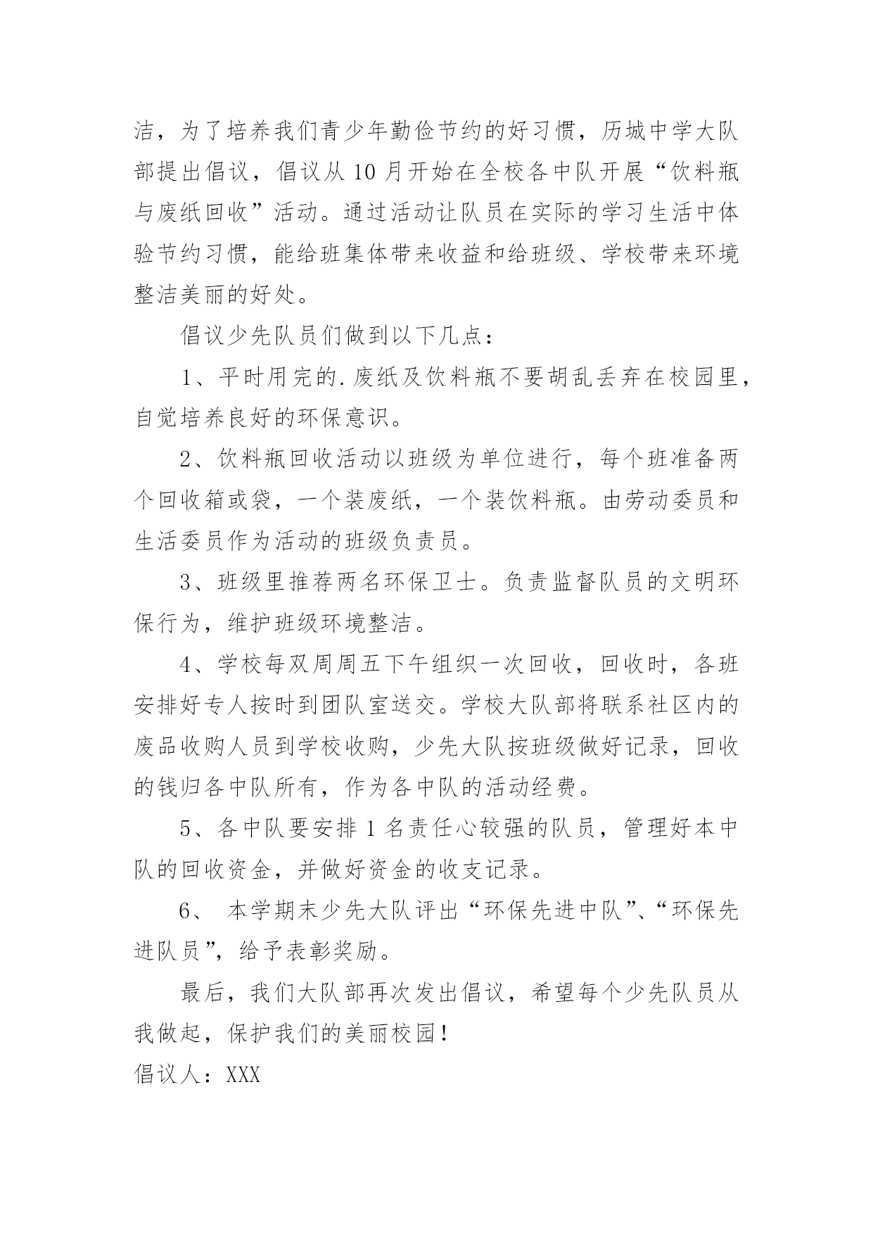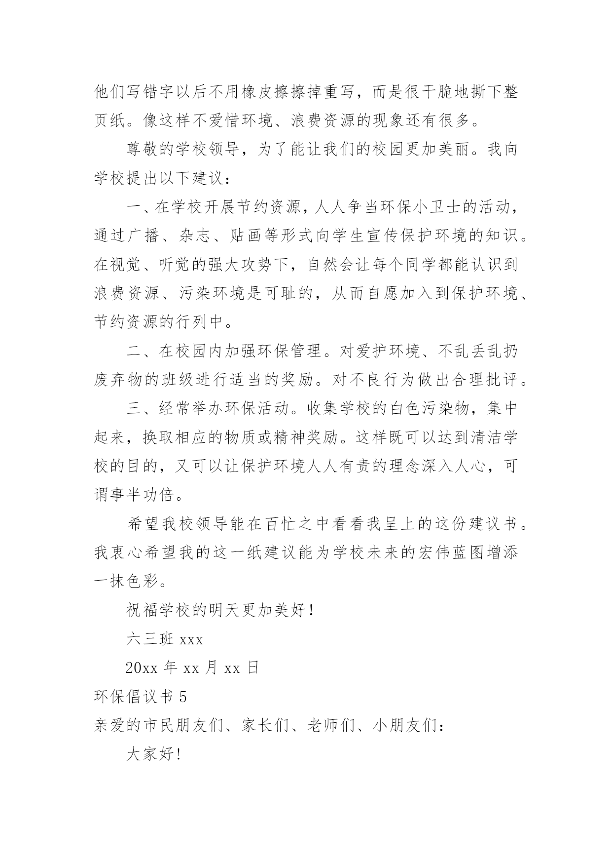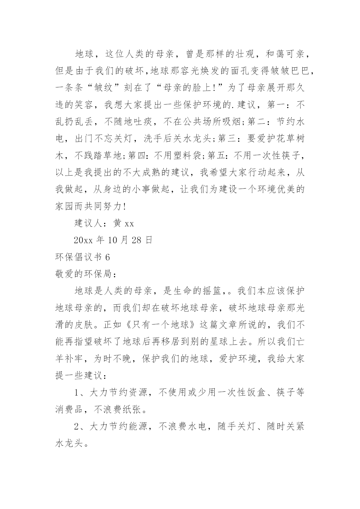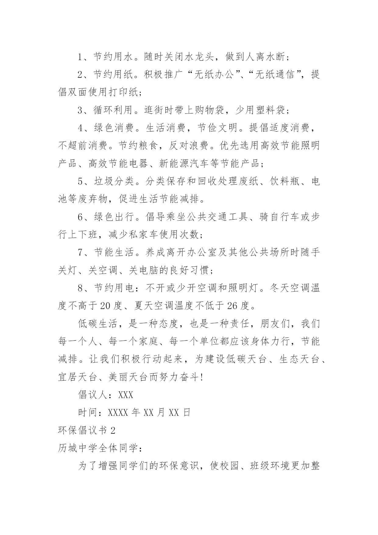 环保倡议书环保倡议书[经典]在日常生活和工作中,我们都跟倡议书有着直接或间接的联系,倡议书是日常应用写作中的一种常用文体。写起倡议书来就毫无头绪?下面是小编为大家收集的环保倡议书,希望能够帮助到大家。环保倡议书1亲爱的市民朋友们、家长们、老师们、小朋友们:今年6月13日至19日是全国节能宣传周,其中6月15日为全国第低碳日。这次活动的主题是“节能有道节俭有德”。为此,我们倡议:一、提高节约意识能源资源是人类生存和发展的重要物质基础,自然环境是人类生存和发展质量的重要保障。我们应该认识在先、行动在前,从我做起,从现在做起,从身边点滴事做起。“节能有道节俭有德”——做好节能减排,提倡低碳生活,建设美丽天台,是我们每一个公民应尽的责任和义务。二、践行节能减排方式提倡简约的`生活和工作习惯,减少资源消耗,从节约每一度电、每一滴水、每一张纸、每一粒米的小事做起,做自觉践行节能减排的楷模。1、节约用水。随时关闭水龙头,做到人离水断;2、节约用纸。积极推广“无纸办公”、“无纸通信”,提倡双面使用打印纸;3、循环利用。逛街时带上购物袋,少用塑料袋;4、绿色消费。生活消费,节俭文明。提倡适度消费,不超前消费。节约粮食,反对浪费。优先选用高效节能照明产品、高效节能电器、新能源汽车等节能产品;5、垃圾分类。分类保存和回收处理废纸、饮料瓶、电池等废弃物,促进生活节能减排。6、绿色出行。倡导乘坐公共交通工具、骑自行车或步行上下班,减少私家车使用次数;7、节能生活。养成离开办公室及其他公共场所时随手关灯、关空调、关电脑的良好习惯;8、节约用电:不开或少开空调和照明灯。冬天空调温度不高于20度、夏天空调温度不低于26度。低碳生活,是一种态度,也是一种责任,朋友们,我们每一个人、每一个家庭、每一个单位都应该身体力行,节能减排。让我们积极行动起来,为建设低碳天台、生态天台、宜居天台、美丽天台而努力奋斗!倡议人:XXX时间:XXXX年XX月XX日环保倡议书2历城中学全体同学:为了增强同学们的环保意识,使校园、班级环境更加整洁,为了培养我们青少年勤俭节约的好习惯,历城中学大队部提出倡议,倡议从10月开始在全校各中队开展“饮料瓶与废纸回收”活动。通过活动让队员在实际的学习生活中体验节约习惯,能给班集体带来收益和给班级、学校带来环境整洁美丽的好处。倡议少先队员们做到以下几点:1、平时用完的.废纸及饮料瓶不要胡乱丢弃在校园里,自觉培养良好的环保意识。2、饮料瓶回收活动以班级为单位进行,每个班准备两个回收箱或袋,一个装废纸,一个装饮料瓶。由劳动委员和生活委员作为活动的班级负责员。3、班级里推荐两名环保卫士。负责监督队员的文明环保行为,维护班级环境整洁。4、学校每双周周五下午组织一次回收,回收时,各班安排好专人按时到团队室送交。学校大队部将联系社区内的废品收购人员到学校收购,少先大队按班级做好记录,回收的钱归各中队所有,作为各中队的活动经费。5、各中队要安排1名责任心较强的队员,管理好本中队的回收资金,并做好资金的收支记录。6、本学期末少先大队评出“环保先进中队”、“环保先进队员”,给予表彰奖励。最后,我们大队部再次发出倡议,希望每个少先队员从我做起,保护我们的美丽校园!倡议人:XXX时间:XXXX年XX月XX日环保倡议书3亲爱的老师、同学们,校园商家:曾几何时,塑料购物袋已成为我们日常生活中的必需品,市场、超市、商场到处可见塑料购物袋的踪影。塑料购物袋在为商家、消费者提供便利的同时,亦造成了严重的能源资源浪费和环境污染。那些散落在校园街道、教学区、生活区中的废弃塑料购物袋破坏了校园的美丽景观,形成校园中的“视觉污染”。日前,国务院下发了《关于限制生产销售使用塑料购物袋的通知》。通知明确要求从今年6月1日起,在全国范围内禁止生产、销售、使用厚度小于0.025毫米的超薄塑料购物袋,同时在所有超市、商场、集贸市场等商品零售场所实行塑料购物袋有偿使用制度,一律不得免费提供塑料购物袋。为积极响应国家号召,营造绿色环保的和谐校园,倡议我校广大师生、校园商家,消费经营不忘社会责任,自觉提高节约与环保意识。新时代的大学生是勇于作为、敢为担当的新一代,校园商家是我校环保校园理念的`传播者,在这里我们倡议如下:一、校园商家实行塑料购物袋有偿使用制度,不免费提供塑料购物袋;二、广大师生自觉提高节约和环保意识,购物时自备环保购物袋,拒绝使用塑料购物袋;三、做好垃圾分类,妥善处理使用过的塑料购物袋,将其投入标有“不可降解垃圾”的分类垃圾筒中;四、积极向身边的亲友宣传减少“白色污染”的重要意义,拒绝白色污染,共建绿色校园。让我们一起行动起来吧,保护校园环境,从每天减少使用塑料购物袋开始!倡议人:XXX时间:XXXX年XX月XX日环保倡议书4尊敬的校领导:你们好!我们的校园好似一座美丽的大校园,那