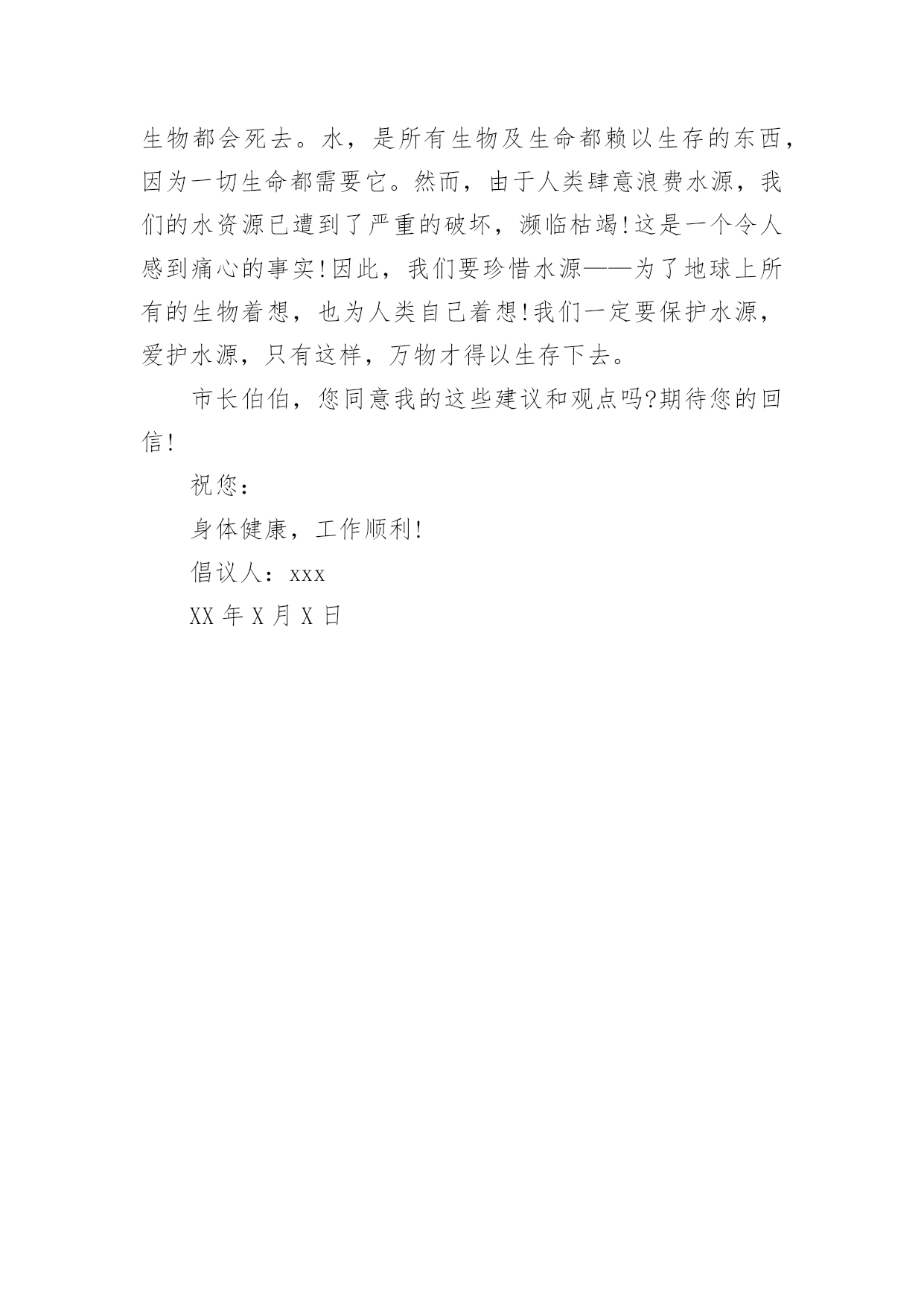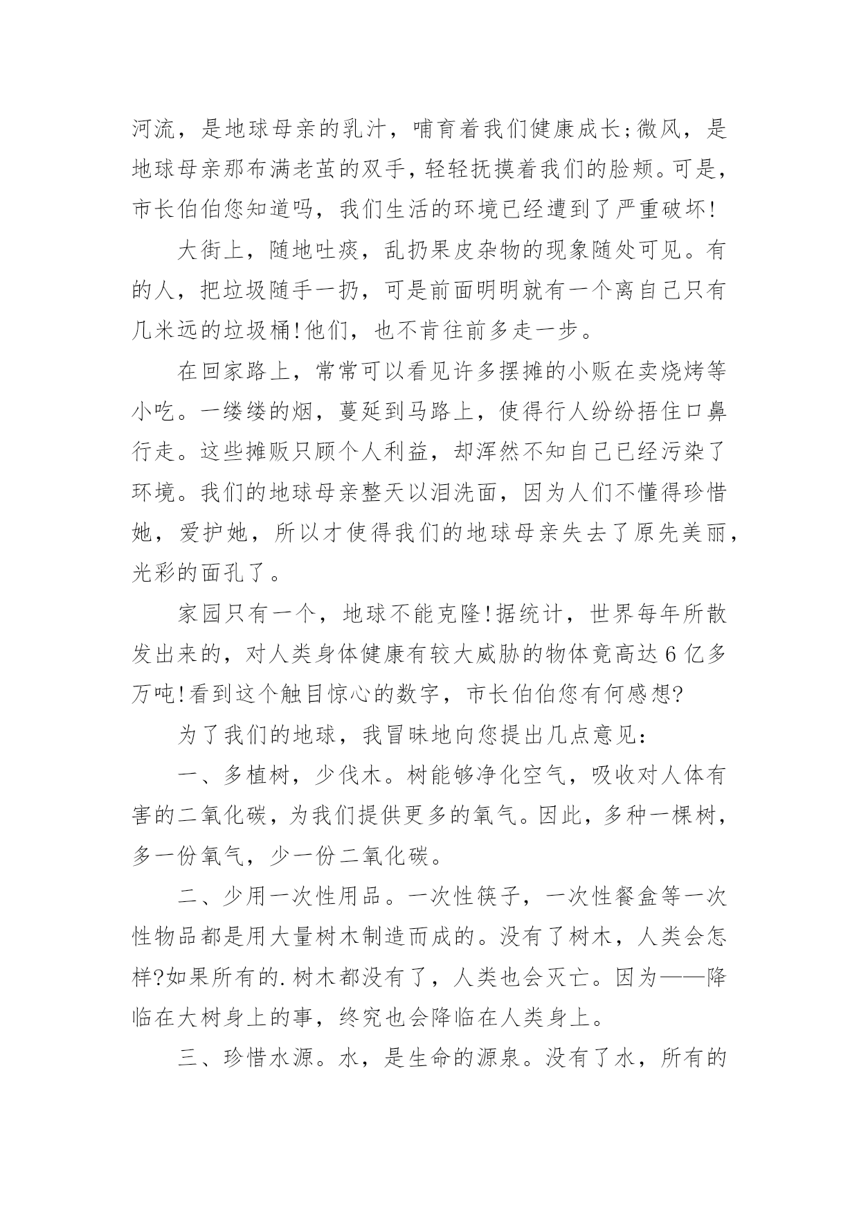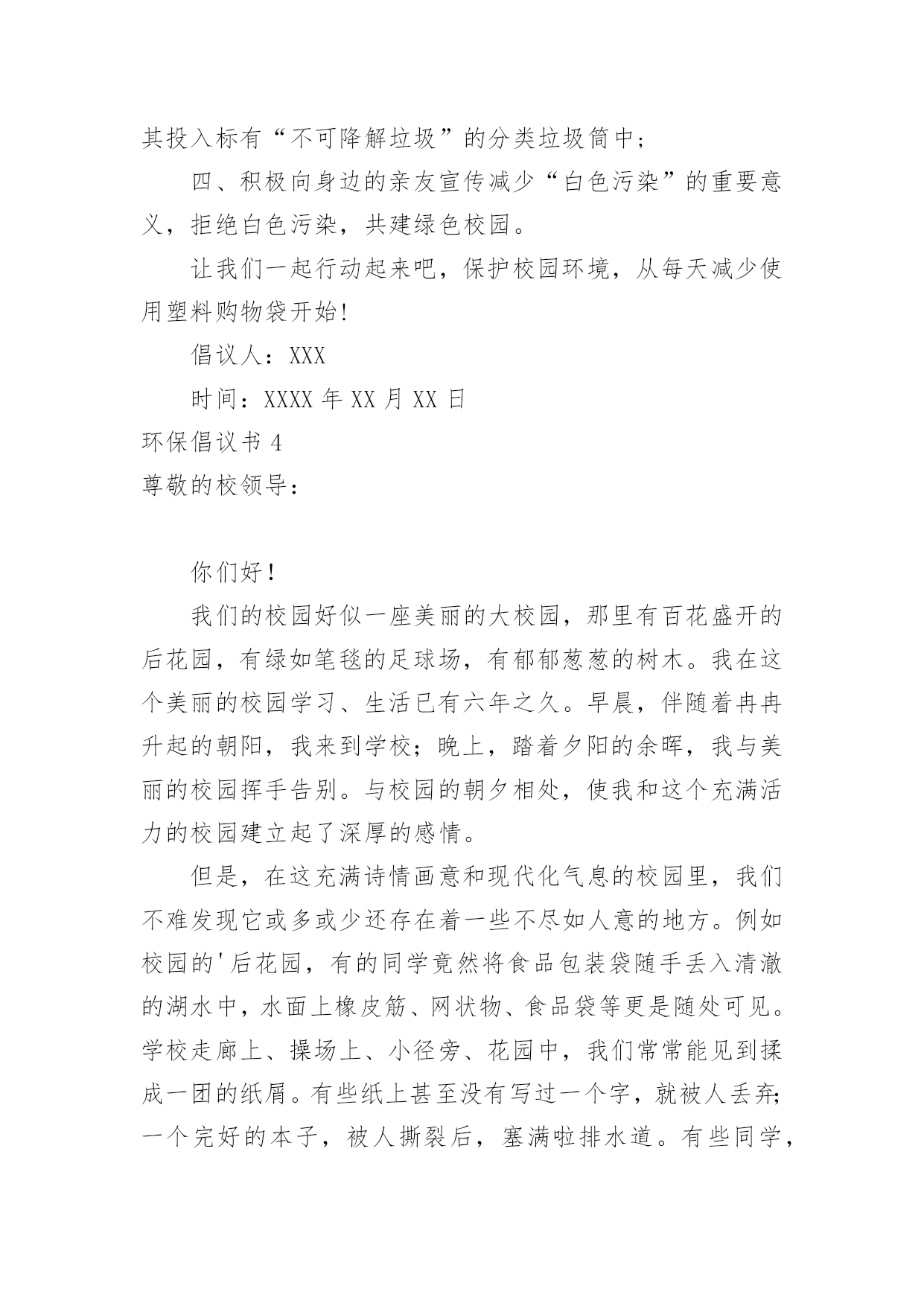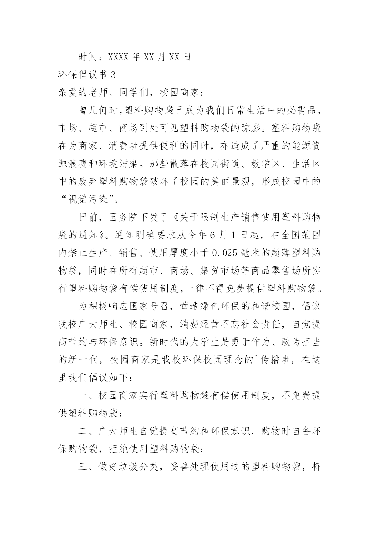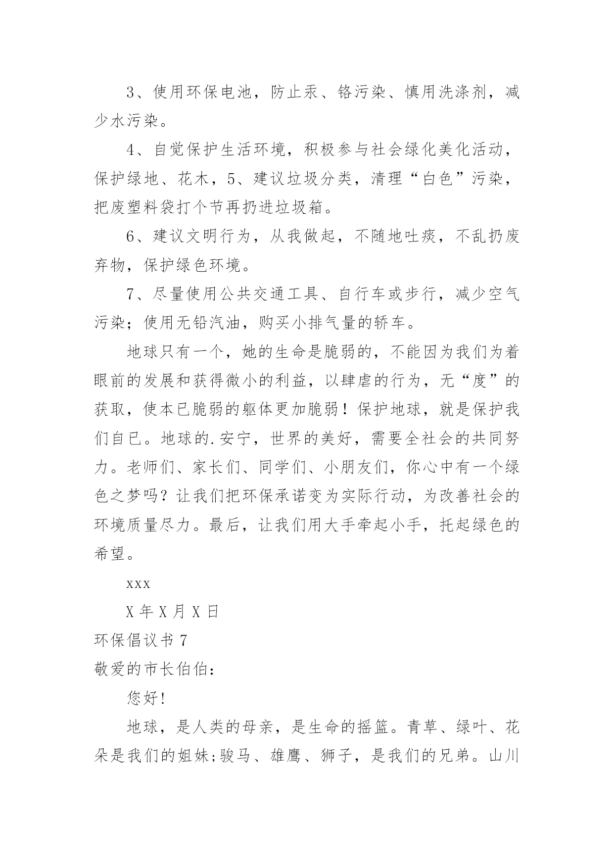 环保倡议书环保倡议书[经典]在日常生活和工作中,我们都跟倡议书有着直接或间接的联系,倡议书是日常应用写作中的一种常用文体。写起倡议书来就毫无头绪?下面是小编为大家收集的环保倡议书,希望能够帮助到大家。环保倡议书1亲爱的市民朋友们、家长们、老师们、小朋友们:今年6月13日至19日是全国节能宣传周,其中6月15日为全国第低碳日。这次活动的主题是“节能有道节俭有德”。为此,我们倡议:一、提高节约意识能源资源是人类生存和发展的重要物质基础,自然环境是人类生存和发展质量的重要保障。我们应该认识在先、行动在前,从我做起,从现在做起,从身边点滴事做起。“节能有道节俭有德”——做好节能减排,提倡低碳生活,建设美丽天台,是我们每一个公民应尽的责任和义务。二、践行节能减排方式提倡简约的`生活和工作习惯,减少资源消耗,从节约每一度电、每一滴水、每一张纸、每一粒米的小事做起,做自觉践行节能减排的楷模。1、节约用水。随时关闭水龙头,做到人离水断;2、节约用纸。积极推广“无纸办公”、“无纸通信”,提倡双面使用打印纸;3、循环利用。逛街时带上购物袋,少用塑料袋;4、绿色消费。生活消费,节俭文明。提倡适度消费,不超前消费。节约粮食,反对浪费。优先选用高效节能照明产品、高效节能电器、新能源汽车等节能产品;5、垃圾分类。分类保存和回收处理废纸、饮料瓶、电池等废弃物,促进生活节能减排。6、绿色出行。倡导乘坐公共交通工具、骑自行车或步行上下班,减少私家车使用次数;7、节能生活。养成离开办公室及其他公共场所时随手关灯、关空调、关电脑的良好习惯;8、节约用电:不开或少开空调和照明灯。冬天空调温度不高于20度、夏天空调温度不低于26度。低碳生活,是一种态度,也是一种责任,朋友们,我们每一个人、每一个家庭、每一个单位都应该身体力行,节能减排。让我们积极行动起来,为建设低碳天台、生态天台、宜居天台、美丽天台而努力奋斗!倡议人:XXX时间:XXXX年XX月XX日环保倡议书2历城中学全体同学:为了增强同学们的环保意识,使校园、班级环境更加整洁,为了培养我们青少年勤俭节约的好习惯,历城中学大队部提出倡议,倡议从10月开始在全校各中队开展“饮料瓶与废纸回收”活动。通过活动让队员在实际的学习生活中体验节约习惯,能给班集体带来收益和给班级、学校带来环境整洁美丽的好处。倡议少先队员们做到以下几点:1、平时用完的.废纸及饮料瓶不要胡乱丢弃在校园里,自觉培养良好的环保意识。2、饮料瓶回收活动以班级为单位进行,每个班准备两个回收箱或袋,一个装废纸,一个装饮料瓶。由劳动委员和生活委员作为活动的班级负责员。3、班级里推荐两名环保卫士。负责监督队员的文明环保行为,维护班级环境整洁。4、学校每双周周五下午组织一次回收,回收时,各班安排好专人按时到团队室送交。学校大队部将联系社区内的废品收购人员到学校收购,少先大队按班级做好记录,回收的钱归各中队所有,作为各中队的活动经费。5、各中队要安排1名责任心较强的队员,管理好本中队的回收资金,并做好资金的收支记录。6、本学期末少先大队评出“环保先进中队”、“环保先进队员”,给予表彰奖励。最后,我们大队部再次发出倡议,希望每个少先队员从我做起,保护我们的美丽校园!倡议人:XXX时间:XXXX年XX月XX日环保倡议书3亲爱的老师、同学们,校园商家:曾几何时,塑料购物袋已成为我们日常生活中的必需品,市场、超市、商场到处可见塑料购物袋的踪影。塑料购物袋在为商家、消费者提供便利的同时,亦造成了严重的能源资源浪费和环境污染。那些散落在校园街道、教学区、生活区中的废弃塑料购物袋破坏了校园的美丽景观,形成校园中的“视觉污染”。日前,国务院下发了《关于限制生产销售使用塑料购物袋的通知》。通知明确要求从今年6月1日起,在全国范围内禁止生产、销售、使用厚度小于0.025毫米的超薄塑料购物袋,同时在所有超市、商场、集贸市场等商品零售场所实行塑料购物袋有偿使用制度,一律不得免费提供塑料购物袋。为积极响应国家号召,营造绿色环保的和谐校园,倡议我校广大师生、校园商家,消费经营不忘社会责任,自觉提高节约与环保意识。新时代的大学生是勇于作为、敢为担当的新一代,校园商家是我校环保校园理念的`传播者,在这里我们倡议如下:一、校园商家实行塑料购物袋有偿使用制度,不免费提供塑料购物袋;二、广大师生自觉提高节约和环保意识,购物时自备环保购物袋,拒绝使用塑料购物袋;三、做好垃圾分类,妥善处理使用过的塑料购物袋,将其投入标有“不可降解垃圾”的分类垃圾筒中;四、积极向身边的亲友宣传减少“白色污染”的重要意义,拒绝白色污染,共建绿色校园。让我们一起行动起来吧,保护校园环境,从每天减少使用塑料购物袋开始!倡议人:XXX时间:XXXX年XX月XX日环保倡议书4尊敬的校领导:你们好!我们的校园好似一座美丽的大校园,那