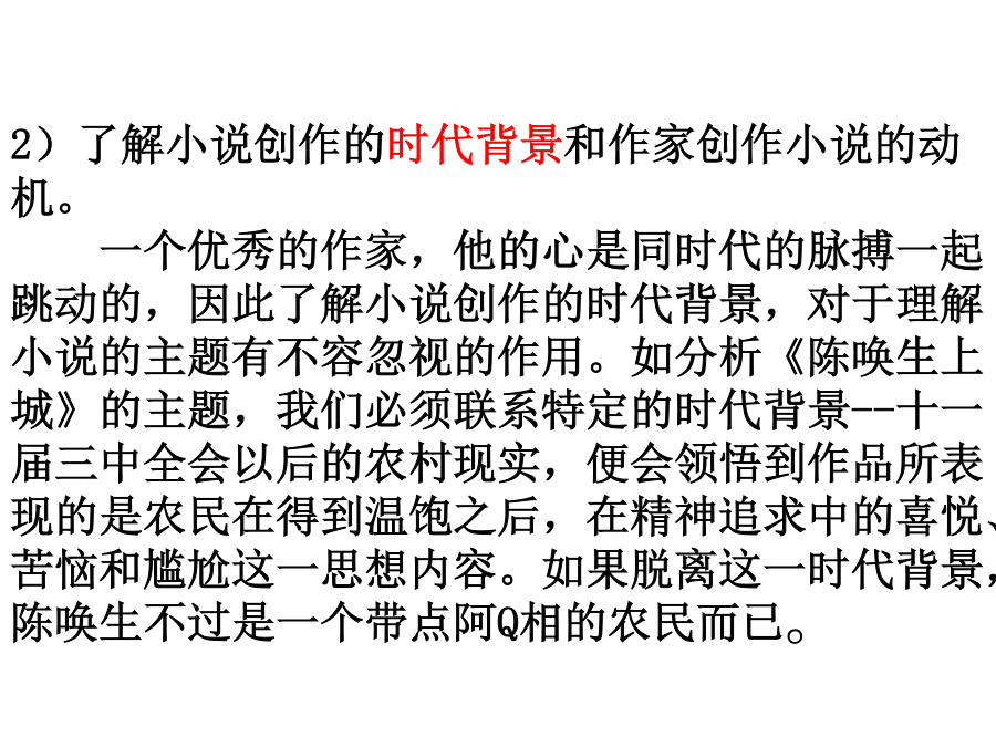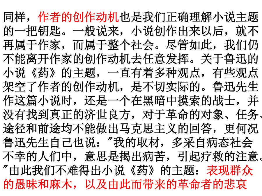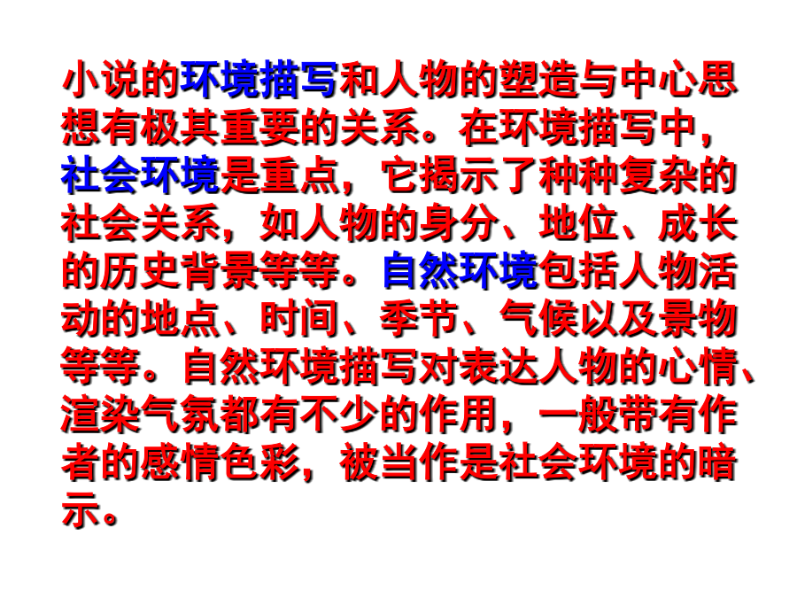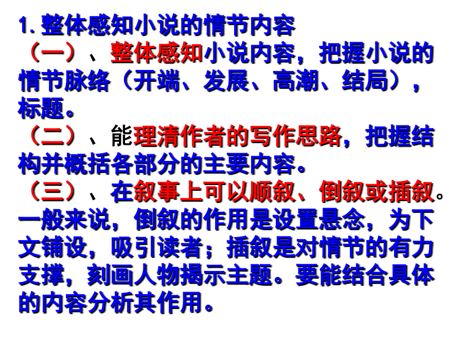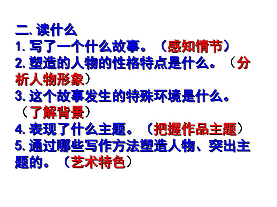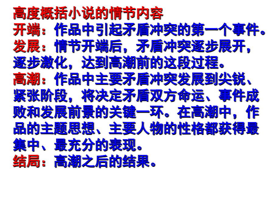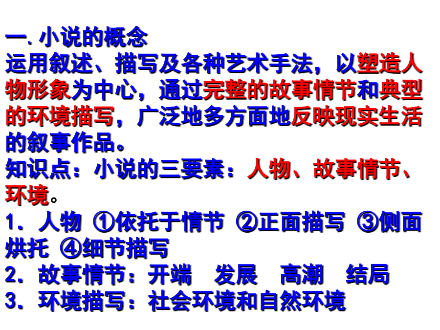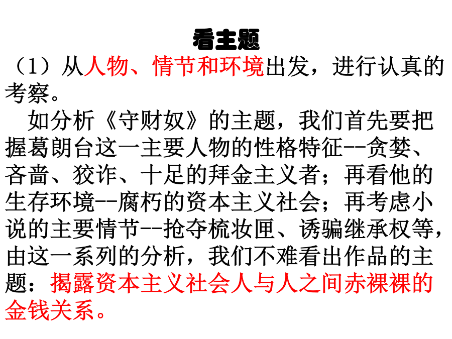 高考小说阅读指导看主题(1)从人物、情节和环境出发,进行认真的考察。如分析《守财奴》的主题,我们首先要把握葛朗台这一主要人物的性格特征--贪婪、吝啬、狡诈、十足的拜金主义者;再看他的生存环境--腐朽的资本主义社会;再考虑小说的主要情节--抢夺梳妆匣、诱骗继承权等,由这一系列的分析,我们不难看出作品的主题:揭露资本主义社会人与人之间赤裸裸的金钱关系。2)了解小说创作的时代背景和作家创作小说的动机。一个优秀的作家,他的心是同时代的脉搏一起跳动的,因此了解小说创作的时代背景,对于理解小说的主题有不容忽视的作用。如分析《陈唤生上城》的主题,我们必须联系特定的时代背景--十一届三中全会以后的农村现实,便会领悟到作品所表现的是农民在得到温饱之后,在精神追求中的喜悦、苦恼和尴尬这一思想内容。如果脱离这一时代背景,陈唤生不过是一个带点阿Q相的农民而已。同样,作者的创作动机也是我们正确理解小说主题的一把钥匙。一般说来,小说创作出来以后,就不再属于作家,而属于整个社会。尽管如此,我们仍不能离开作家的创作动机去任意发挥。关于鲁迅的小说《药》的主题,一直有着多种观点,有些观点架空了作者的创作动机,是不切实际的。鲁迅先生作这篇小说时,还是一个在黑暗中摸索的战士,并没有找到真正的济世良方,对于革命的对象、任务、途径和前途均不能做出马克思主义的回答,更何况鲁迅先生自己也说:"我的取材,多采自病态社会不幸的人们中,意思是揭出病苦,引起疗救的注意。"由此我们不难得出小说《药》的主题:表现群众的愚昧和麻木,以及由此而带来的革命者的悲哀一.小说的概念运用叙述、描写及各种艺术手法,以塑造人物形象为中心,通过完整的故事情节和典型的环境描写,广泛地多方面地反映现实生活的叙事作品。知识点:小说的三要素:人物、故事情节、环境。1.人物①依托于情节②正面描写③侧面烘托④细节描写2.故事情节:开端发展高潮结局3.环境描写:社会环境和自然环境小说的环境描写和人物的塑造与中心思想有极其重要的关系。在环境描写中,社会环境是重点,它揭示了种种复杂的社会关系,如人物的身分、地位、成长的历史背景等等。自然环境包括人物活动的地点、时间、季节、气候以及景物等等。自然环境描写对表达人物的心情、渲染气氛都有不少的作用,一般带有作者的感情色彩,被当作是社会环境的暗示。二.读什么1.写了一个什么故事。(感知情节)2.塑造的人物的性格特点是什么。(分析人物形象)3.这个故事发生的特殊环境是什么。(了解背景)4.表现了什么主题。(把握作品主题)5.通过哪些写作方法塑造人物、突出主题的。(艺术特色)1.整体感知小说的情节内容(一)、整体感知小说内容,把握小说的情节脉络(开端、发展、高潮、结局),标题。(二)、能理清作者的写作思路,把握结构并概括各部分的主要内容。(三)、在叙事上可以顺叙、倒叙或插叙。一般来说,倒叙的作用是设置悬念,为下文铺设,吸引读者;插叙是对情节的有力支撑,刻画人物揭示主题。要能结合具体的内容分析其作用。一般概括的规律(一句话)什么人(主要人物)在什么地方(时间、情况)干了什么事结果怎样高度概括小说的情节内容开端:作品中引起矛盾冲突的第一个事件。发展:情节开端后,矛盾冲突逐步展开,逐步激化,达到高潮前的这段过程。高潮:作品中主要矛盾冲突发展到尖锐、紧张阶段,将决定矛盾双方命运、事件成败和发展前景的关键一环。在高潮中,作品的主题思想、主要人物的性格都获得最集中、最充分的表现。结局:高潮之后的结果。2.小说人物分析(1)分析人物形象的几个层面在情节发展中分析在描写人物中分析在特定环境中分析鉴赏、评价层面(2)分析人物形象要注意的几个问题在情节发展中把握人物性格特点:可以把握人物性格特点的完整性,避免片面的、局部的分析人物形象的现象。掌握塑造人物的不同方法及作用,把握人物形象的丰富性要比较准确地把握人物的性格特点、精神风貌,必须了解人物所处的时代特点,也就是分析人物要先了解作品提供给我们的社会环境。肖像描写及作用肖像描写(容貌、神情、衣饰、姿态、音调)表现出时代的特点,表现出人物的特征,表现人物在特定情境中的内心情感。肖像果戈里也说:"外形是理解人物的钥匙。"请看鲁迅小说《药》中对刽子手康大叔的一段描写;突然闯进了一个满脸横肉的人,披一件玄色布衫,散着纽扣,用很宽的玄色带,胡乱捆在腰间。刚进门,便对老栓嚷道:"吃了么?好了么?"……"满脸横肉"表现的是他的凶恶,"披布衫、散纽扣、腰带胡乱捆在腰间"是为了表现他的野蛮、粗俗,通过这样的描写便把康大叔这样一个统治阶级镇压群众的刽子手的形象鲜明的表现出来了。曹禺在剧本《日出》中对顾八奶奶的描写:穿一件花旗袍,镶着金边,颜色鲜艳夺目,紧紧的箍在她的身上。走起路来小鲸鱼似的。