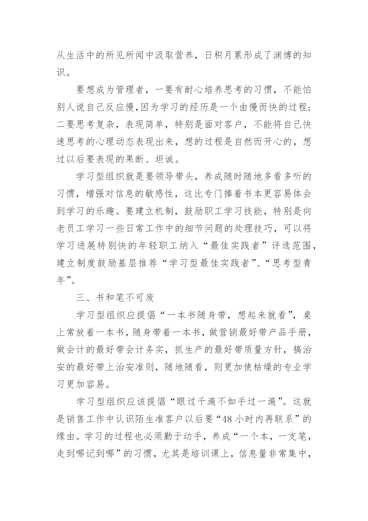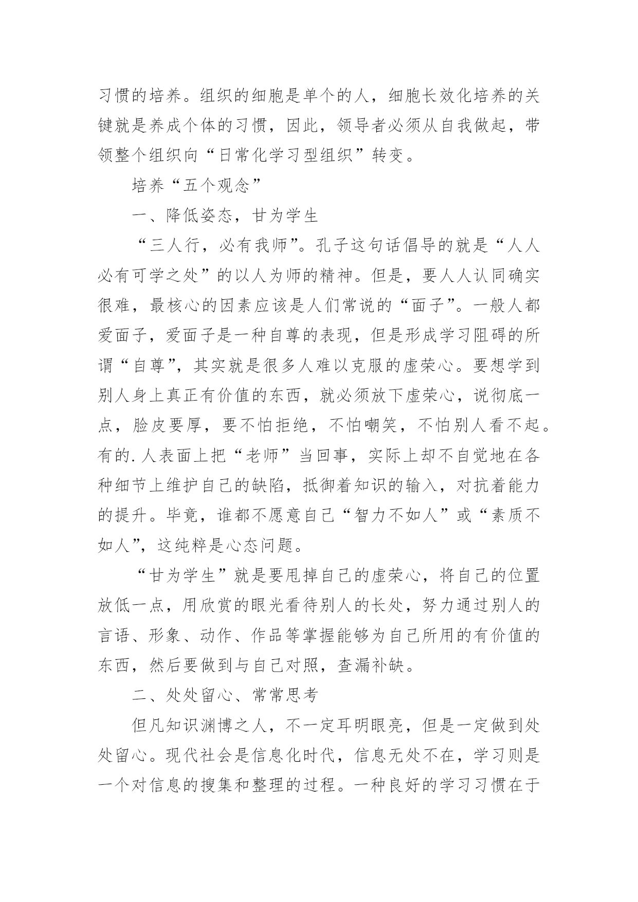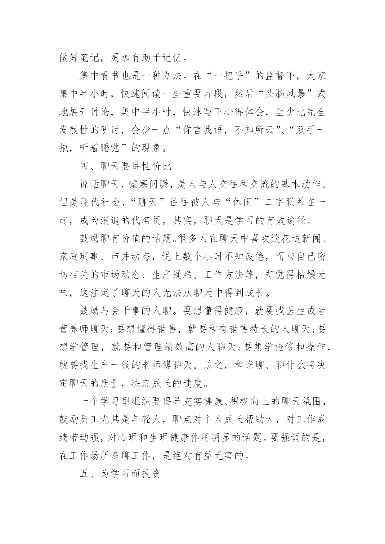 浅谈职场生活充电法则浅谈职场生活充电法则很多企业领导者,都希望下属爱学习,会学习,动辄大谈而特谈学习的重要性,动不动要建立“学习型企业”、“学习型组织”,打造“学习型员工”。但凭心而论,很多领导者自己也无法掩饰其浮躁心态,没有潜心学习的态度。认真一想,现今的职场中,人心浮躁,要真正静下心来学习充电不是一件容易的事情。本文跟读者朋友们一起探讨一下如何让“充电”成为你职场生活的新常态。建立“两个观点”11.学什么和怎么学比为什么学更重要很多领导者都过多地强调学习的重要性,但忽略了而更应该做的是强调“务实”,强调“从我做起”和“现在就了解或掌握点什么”。明确一点,让我学习,告诉我应该知道什么或者是“听报告”还是“看看书”吧,不要老是说“学习很重要”,越觉的重要越把学习当成了一种负担,成为“永远完不成的任务”,人也就一直麻木着。22.真正的学习是一种习以为常的常态这个学习不是一个任务,而是一种生活状态,一种良性循环并且自然而然的乐趣。如何着手呢?主要应该注重个体习惯的培养。组织的细胞是单个的人,细胞长效化培养的关键就是养成个体的习惯,因此,领导者必须从自我做起,带领整个组织向“日常化学习型组织”转变。培养“五个观念”一、降低姿态,甘为学生“三人行,必有我师”。孔子这句话倡导的就是“人人必有可学之处”的以人为师的精神。但是,要人人认同确实很难,最核心的因素应该是人们常说的“面子”。一般人都爱面子,爱面子是一种自尊的表现,但是形成学习阻碍的所谓“自尊”,其实就是很多人难以克服的虚荣心。要想学到别人身上真正有价值的东西,就必须放下虚荣心,说彻底一点,脸皮要厚,要不怕拒绝,不怕嘲笑,不怕别人看不起。有的.人表面上把“老师”当回事,实际上却不自觉地在各种细节上维护自己的缺陷,抵御着知识的输入,对抗着能力的提升。毕竟,谁都不愿意自己“智力不如人”或“素质不如人”,这纯粹是心态问题。“甘为学生”就是要甩掉自己的虚荣心,将自己的位置放低一点,用欣赏的眼光看待别人的长处,努力通过别人的言语、形象、动作、作品等掌握能够为自己所用的有价值的东西,然后要做到与自己对照,查漏补缺。二、处处留心、常常思考但凡知识渊博之人,不一定耳明眼亮,但是一定做到处处留心。现代社会是信息化时代,信息无处不在,学习则是一个对信息的搜集和整理的过程。一种良好的学习习惯在于从生活中的所见所闻中汲取营养,日积月累形成了渊博的知识。要想成为管理者,一要有耐心培养思考的习惯,不能怕别人说自己反应慢,因为学习的经历是一个由慢而快的过程;二要思考复杂,表现简单,特别是面对客户,不能将自己快速思考的心理动态表现出来,想的过程是自然而开心的,想过以后要表现的果断、坦诚。学习型组织就是要领导带头,养成随时随地多看多听的习惯,增强对信息的敏感性,这比专门捧着书本更容易体会到学习的乐趣。要建立机制,鼓励职工学习技能,特别是向老员工学习一些日常工作中的细节问题的处理技巧,可以将学习进展特别快的年轻职工纳入“最佳实践者”评选范围,建立制度鼓励基层推荐“学习型最佳实践者”、“思考型青年”。三、书和笔不可废学习型组织应提倡“一本书随身带,想起来就看”,桌上常放着一本书,随身带着一本书,做营销最好带产品手册,做会计的最好带会计务实,抓生产的最好带质量方针,搞治安的最好带上治安准则,随地随看,则更加使枯燥的专业学习更加容易。学习型组织应该提倡“眼过千遍不如手过一遍”。这就是销售工作中认识陌生准客户以后要“48小时内再联系”的缘由。学习的过程也必须勤于动手,养成“一个本,一支笔,走到哪记到哪”的习惯,尤其是培训课上,信息量非常集中,做好笔记,更加有助于记忆。集中看书也是一种办法。在“一把手”的监督下,大家集中半小时,快速阅读一些重要片段,然后“头脑风暴”式地展开讨论,集中半小时,快速写下心得体会,至少比完全发散性的研讨,会少一点“你言我语,不知所云”、“双手一抱,听着睡觉”的现象。四、聊天要讲性价比说话聊天,嘘寒问暖,是人与人交往和交流的基本动作。但是现代社会,“聊天”往往被人与“休闲”二字联系在一起,成为消遣的代名词,其实,聊天是学习的有效途径。鼓励聊有价值的话题。很多人在聊天中喜欢谈花边新闻、家庭琐事、市井动态,说上数个小时不知疲倦,而与自己密切相关的市场动态、生产疑难、工作方法等,却觉得枯燥无味,这注定了聊天的人无法从聊天中得到成长。鼓励与会干事的人聊。要想懂得健康,就要找医生或者营养师聊天;要想懂得销售,就要和有销售特长的人聊天;要想学管理,就要和管理绩效高的人聊天;要想学检修和操作,就要找生产一线的老师傅聊天。总之,和谁聊、聊什么将决定聊天的质量,决定成长的速度。一个学习型组织要倡导充实健康、积极向上的聊天氛围,鼓励员工尤其是年轻人,聊点对个人成长帮助大,对工作成绩带动强,对心理和生理健康作用明显的话