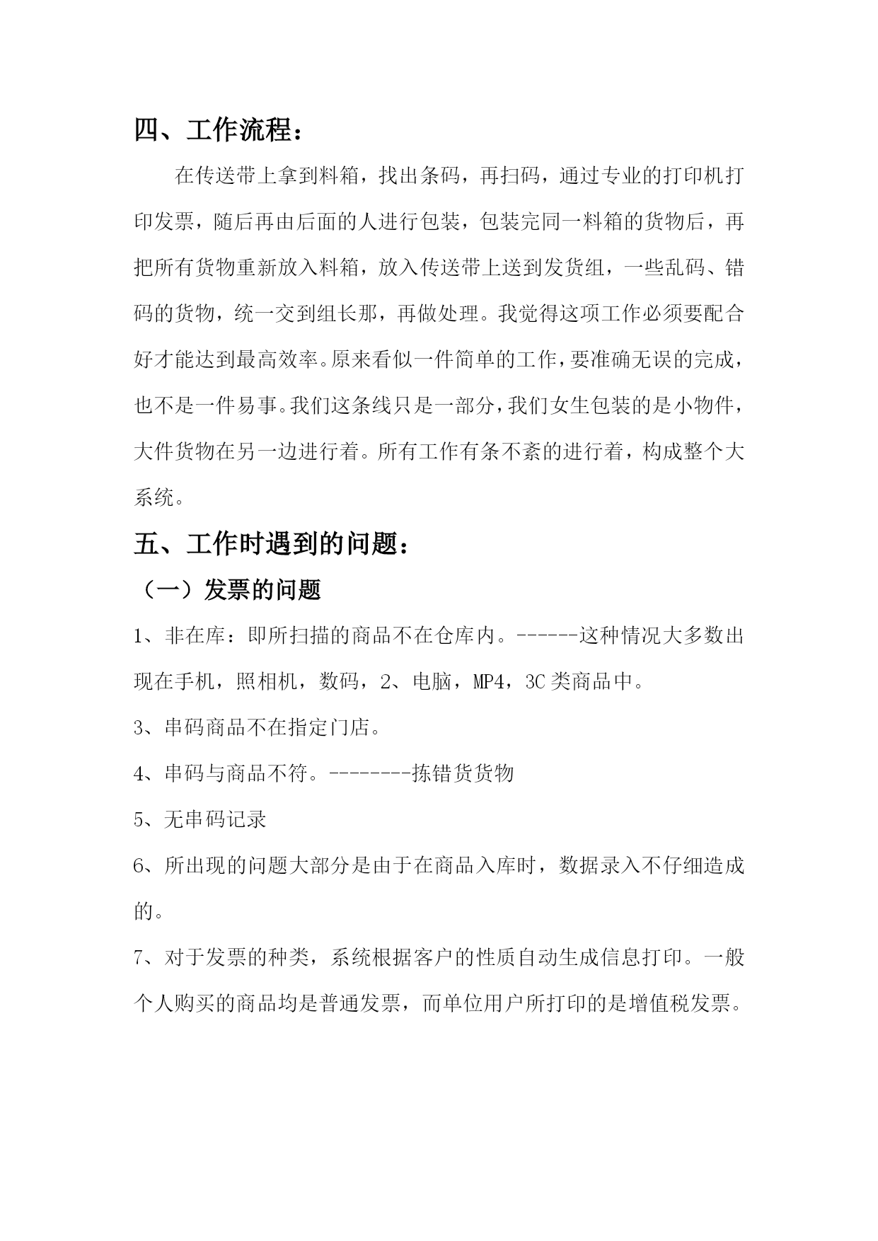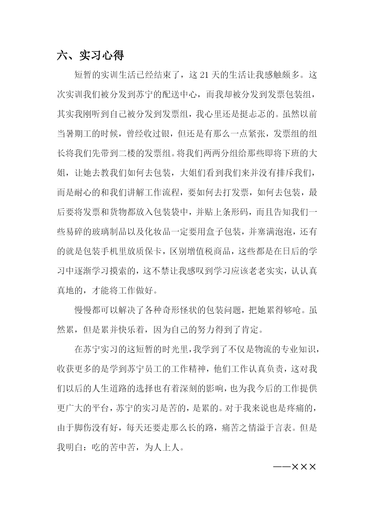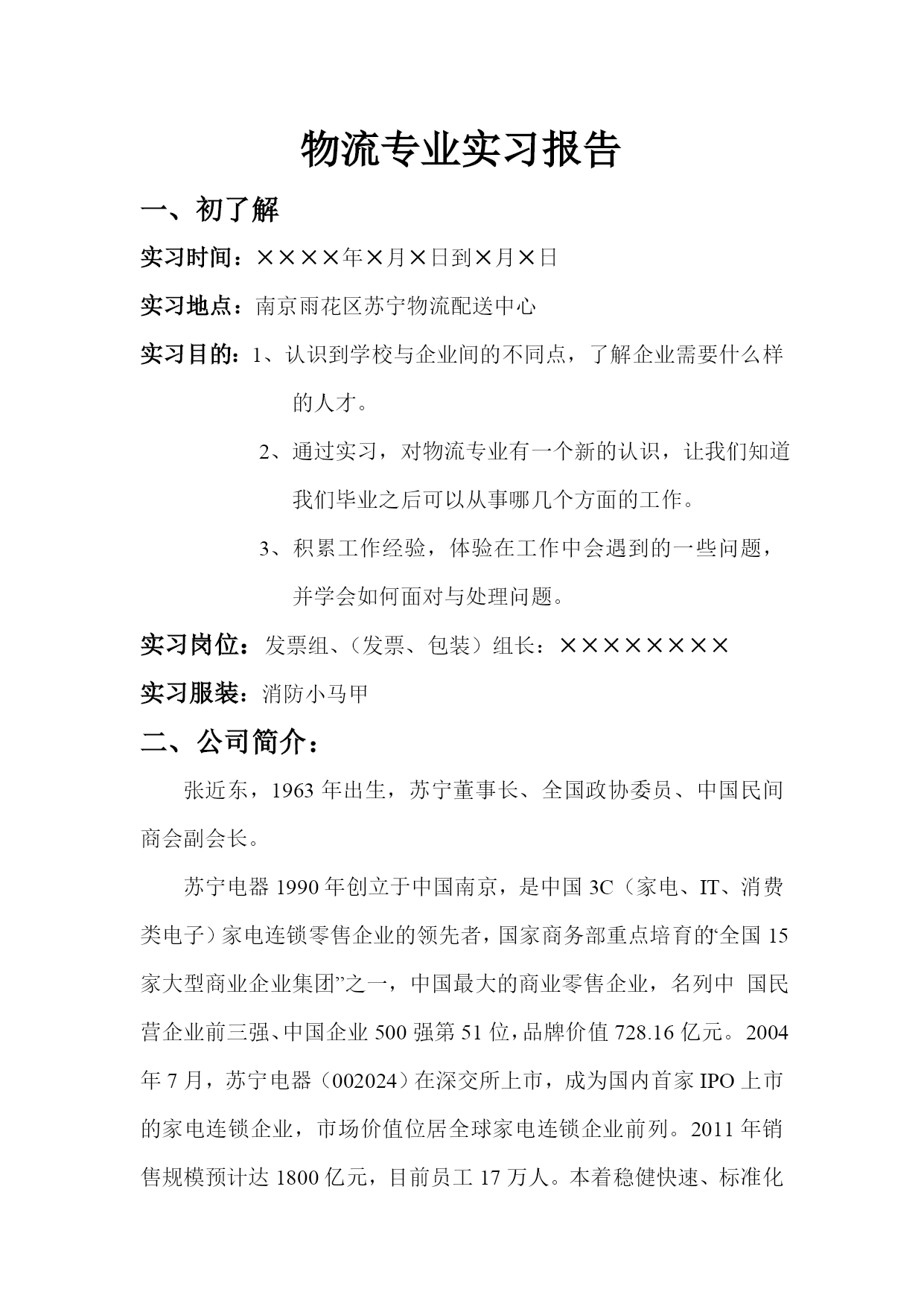 物流实习总结报告——××××××××××××学院实习小组:实习人员:班级:专业老师:班主任:物流专业实习报告一、初了解实习时间:××××年×月×日到×月×日实习地点:南京雨花区苏宁物流配送中心实习目的:1、认识到学校与企业间的不同点,了解企业需要什么样的人才。2、通过实习,对物流专业有一个新的认识,让我们知道我们毕业之后可以从事哪几个方面的工作。3、积累工作经验,体验在工作中会遇到的一些问题,并学会如何面对与处理问题。实习岗位:发票组、(发票、包装)组长:××××××××实习服装:消防小马甲二、公司简介:张近东,1963年出生,苏宁董事长、全国政协委员、中国民间商会副会长。苏宁电器1990年创立于中国南京,是中国3C(家电、IT、消费类电子)家电连锁零售企业的领先者,国家商务部重点培育的“全国15家大型商业企业集团”之一,中国最大的商业零售企业,名列中国民营企业前三强、中国企业500强第51位,品牌价值728.16亿元。2004年7月,苏宁电器(002024)在深交所上市,成为国内首家IPO上市的家电连锁企业,市场价值位居全球家电连锁企业前列。2011年销售规模预计达1800亿元,目前员工17万人。本着稳健快速、标准化复制的开发方针,苏宁电器采取“租、建、购、并”立体开发模式,2009年,通过海外并购,苏宁顺势进入中国香港和日本市场,拓展国际化发展道路。截至2011年底,苏宁在中国大陆300多个城市开设了近1700家连锁店。与此同时,苏宁电器坚持线上线下同步开发,自2010年旗下电子商务平台“苏宁易购”升级上线以来,产品线由家电拓展至百货、图书、虚拟产品等,迅速跻身中国B2C前三,目标到2020年销售规模3000亿元,成为中国领先的B2C品牌。实习内容:这次实训我们被分发到苏宁的配送中心,配送中心是苏宁易购网上平台的发货以及销售包装的源地。我被分到了发票包装组,同寝室的其他人有分到拣货组和发货组等等。谈谈我自己的工作吧。发票组,其实我刚听到自己被分到发票组,我有点忐忑不安,在考虑发票没打过啊,学不会怎么办呢。但其实工作的难度并没我想象的那么复杂。工作分配后,发票组的组长将我们带到发票组。因为当时正处于交班时间。他便将我们两两分组,并指定给那些即将下班的大姐,让她们教我们怎样去包装。大姐告诉我们,要把发票和货物都放入包装袋中,并贴上条码,一些易碎玻璃制品以及化妆品一定要用盒子装,并塞满泡泡,等等……经过一天的学习,我了解了如何去打发票,由于不熟练,所以打得比较慢,在货物比较多的时候,便将打发票的工作交给老员工。在工作岗位上必须足够细心,不得马虎,学习是永无止尽的,作为实习生,要我们去领悟和掌握的还有很多很多。四、工作流程:在传送带上拿到料箱,找出条码,再扫码,通过专业的打印机打印发票,随后再由后面的人进行包装,包装完同一料箱的货物后,再把所有货物重新放入料箱,放入传送带上送到发货组,一些乱码、错码的货物,统一交到组长那,再做处理。我觉得这项工作必须要配合好才能达到最高效率。原来看似一件简单的工作,要准确无误的完成,也不是一件易事。我们这条线只是一部分,我们女生包装的是小物件,大件货物在另一边进行着。所有工作有条不紊的进行着,构成整个大系统。工作时遇到的问题:发票的问题1、非在库:即所扫描的商品不在仓库内。------这种情况大多数出现在手机,照相机,数码,2、电脑,MP4,3C类商品中。3、串码商品不在指定门店。4、串码与商品不符。--------拣错货货物5、无串码记录6、所出现的问题大部分是由于在商品入库时,数据录入不仔细造成的。7、对于发票的种类,系统根据客户的性质自动生成信息打印。一般个人购买的商品均是普通发票,而单位用户所打印的是增值税发票。包装的问题1、检查是否有发票2、胶带注意标签3、封口严紧,标签向上4、之后检查易购袋是否有破损,封好,放入传送带5、最后在结束工作的时候检查工作区域周围是否有残余货物。六、实习心得短暂的实训生活已经结束了,这21天的生活让我感触颇多。这次实训我们被分发到苏宁的配送中心,而我却被分发到发票包装组,其实我刚听到自己被分发到发票组,我心里还是挺忐忑的。虽然以前当暑期工的时候,曾经收过银,但还是有那么一点紧张,发票组的组长将我们先带到二楼的发票组。将我们两两分组给那些即将下班的大姐,让她去教我们如何去包装,大姐们看到我们来并没有排斥我们,而是耐心的和我们讲解工作流程,要如何去打发票,如何去包装,最后要将发票和货物都放入包装袋中,并贴上条形码,而且告知我们一些易碎的玻璃制品以及化妆品一定要用盒子包装,并塞满泡泡,还有的就是包装手机里放质保卡