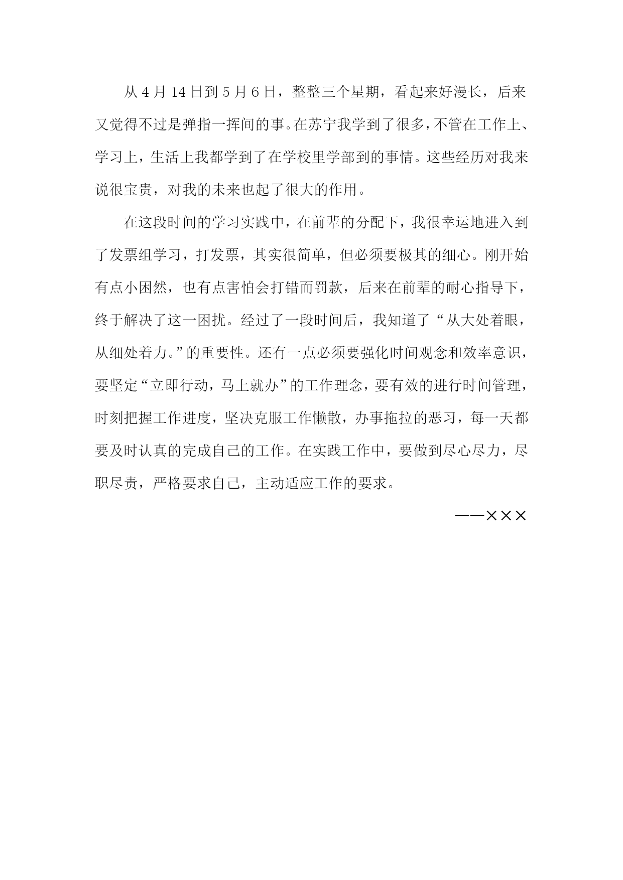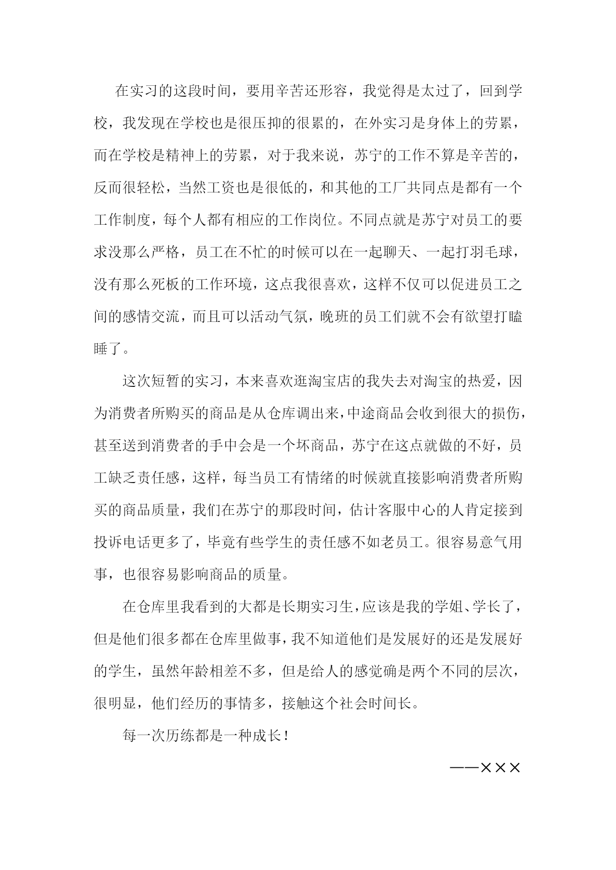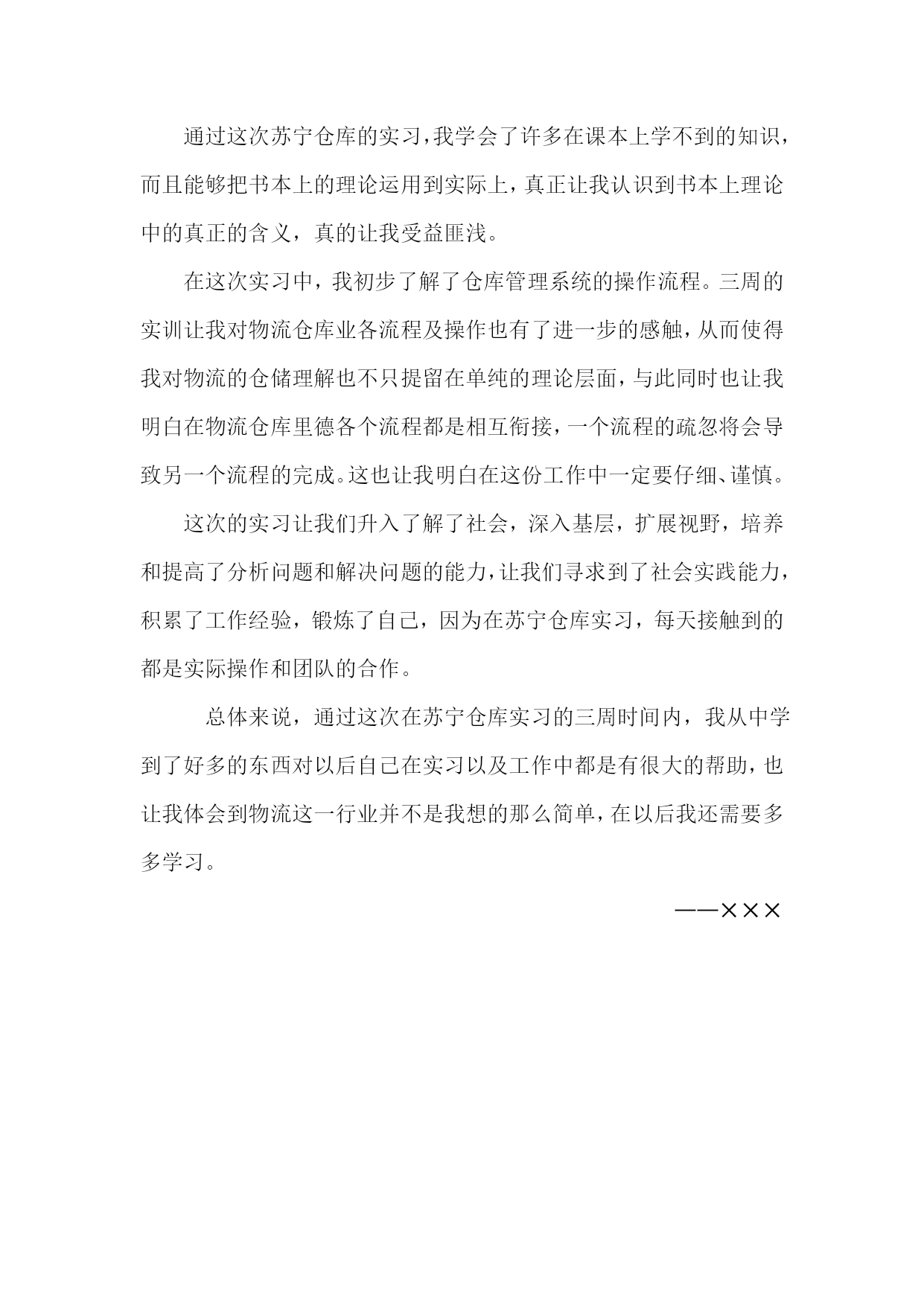 物流实习总结报告——××××××××××××学院实习小组:实习人员:班级:专业老师:班主任:物流专业实习报告一、初了解实习时间:××××年×月×日到×月×日实习地点:南京雨花区苏宁物流配送中心实习目的:1、认识到学校与企业间的不同点,了解企业需要什么样的人才。2、通过实习,对物流专业有一个新的认识,让我们知道我们毕业之后可以从事哪几个方面的工作。3、积累工作经验,体验在工作中会遇到的一些问题,并学会如何面对与处理问题。实习岗位:发票组、(发票、包装)组长:××××××××实习服装:消防小马甲二、公司简介:张近东,1963年出生,苏宁董事长、全国政协委员、中国民间商会副会长。苏宁电器1990年创立于中国南京,是中国3C(家电、IT、消费类电子)家电连锁零售企业的领先者,国家商务部重点培育的“全国15家大型商业企业集团”之一,中国最大的商业零售企业,名列中国民营企业前三强、中国企业500强第51位,品牌价值728.16亿元。2004年7月,苏宁电器(002024)在深交所上市,成为国内首家IPO上市的家电连锁企业,市场价值位居全球家电连锁企业前列。2011年销售规模预计达1800亿元,目前员工17万人。本着稳健快速、标准化复制的开发方针,苏宁电器采取“租、建、购、并”立体开发模式,2009年,通过海外并购,苏宁顺势进入中国香港和日本市场,拓展国际化发展道路。截至2011年底,苏宁在中国大陆300多个城市开设了近1700家连锁店。与此同时,苏宁电器坚持线上线下同步开发,自2010年旗下电子商务平台“苏宁易购”升级上线以来,产品线由家电拓展至百货、图书、虚拟产品等,迅速跻身中国B2C前三,目标到2020年销售规模3000亿元,成为中国领先的B2C品牌。实习内容:这次实训我们被分发到苏宁的配送中心,配送中心是苏宁易购网上平台的发货以及销售包装的源地。我被分到了发票包装组,同寝室的其他人有分到拣货组和发货组等等。谈谈我自己的工作吧。发票组,其实我刚听到自己被分到发票组,我有点忐忑不安,在考虑发票没打过啊,学不会怎么办呢。但其实工作的难度并没我想象的那么复杂。工作分配后,发票组的组长将我们带到发票组。因为当时正处于交班时间。他便将我们两两分组,并指定给那些即将下班的大姐,让她们教我们怎样去包装。大姐告诉我们,要把发票和货物都放入包装袋中,并贴上条码,一些易碎玻璃制品以及化妆品一定要用盒子装,并塞满泡泡,等等……经过一天的学习,我了解了如何去打发票,由于不熟练,所以打得比较慢,在货物比较多的时候,便将打发票的工作交给老员工。在工作岗位上必须足够细心,不得马虎,学习是永无止尽的,作为实习生,要我们去领悟和掌握的还有很多很多。四、工作流程:在传送带上拿到料箱,找出条码,再扫码,通过专业的打印机打印发票,随后再由后面的人进行包装,包装完同一料箱的货物后,再把所有货物重新放入料箱,放入传送带上送到发货组,一些乱码、错码的货物,统一交到组长那,再做处理。我觉得这项工作必须要配合好才能达到最高效率。原来看似一件简单的工作,要准确无误的完成,也不是一件易事。我们这条线只是一部分,我们女生包装的是小物件,大件货物在另一边进行着。所有工作有条不紊的进行着,构成整个大系统。工作时遇到的问题:发票的问题1、非在库:即所扫描的商品不在仓库内。------这种情况大多数出现在手机,照相机,数码,2、电脑,MP4,3C类商品中。3、串码商品不在指定门店。4、串码与商品不符。--------拣错货货物5、无串码记录6、所出现的问题大部分是由于在商品入库时,数据录入不仔细造成的。7、对于发票的种类,系统根据客户的性质自动生成信息打印。一般个人购买的商品均是普通发票,而单位用户所打印的是增值税发票。包装的问题1、检查是否有发票2、胶带注意标签3、封口严紧,标签向上4、之后检查易购袋是否有破损,封好,放入传送带5、最后在结束工作的时候检查工作区域周围是否有残余货物。六、实习心得短暂的实训生活已经结束了,这21天的生活让我感触颇多。这次实训我们被分发到苏宁的配送中心,而我却被分发到发票包装组,其实我刚听到自己被分发到发票组,我心里还是挺忐忑的。虽然以前当暑期工的时候,曾经收过银,但还是有那么一点紧张,发票组的组长将我们先带到二楼的发票组。将我们两两分组给那些即将下班的大姐,让她去教我们如何去包装,大姐们看到我们来并没有排斥我们,而是耐心的和我们讲解工作流程,要如何去打发票,如何去包装,最后要将发票和货物都放入包装袋中,并贴上条形码,而且告知我们一些易碎的玻璃制品以及化妆品一定要用盒子包装,并塞满泡泡,还有的就是包装手机里放质保卡
