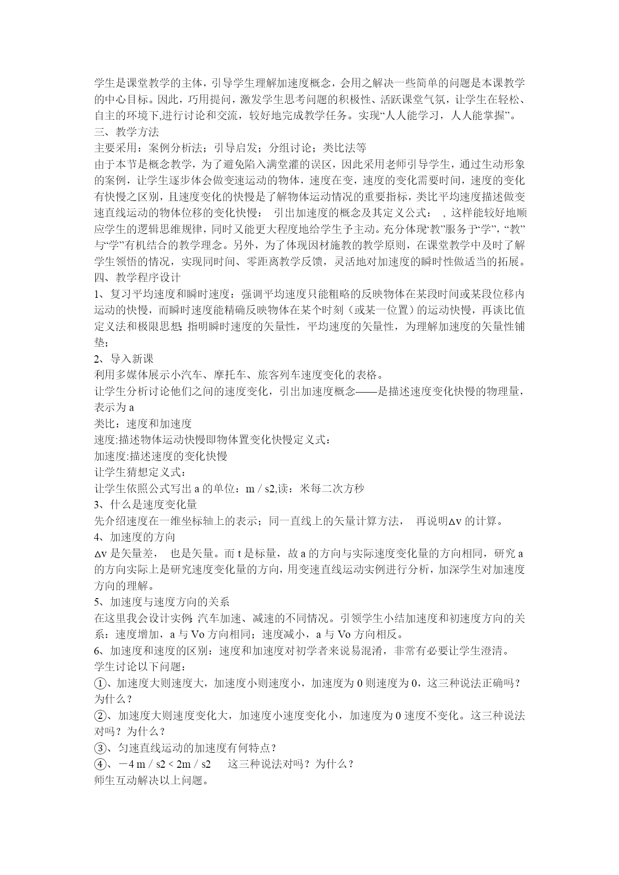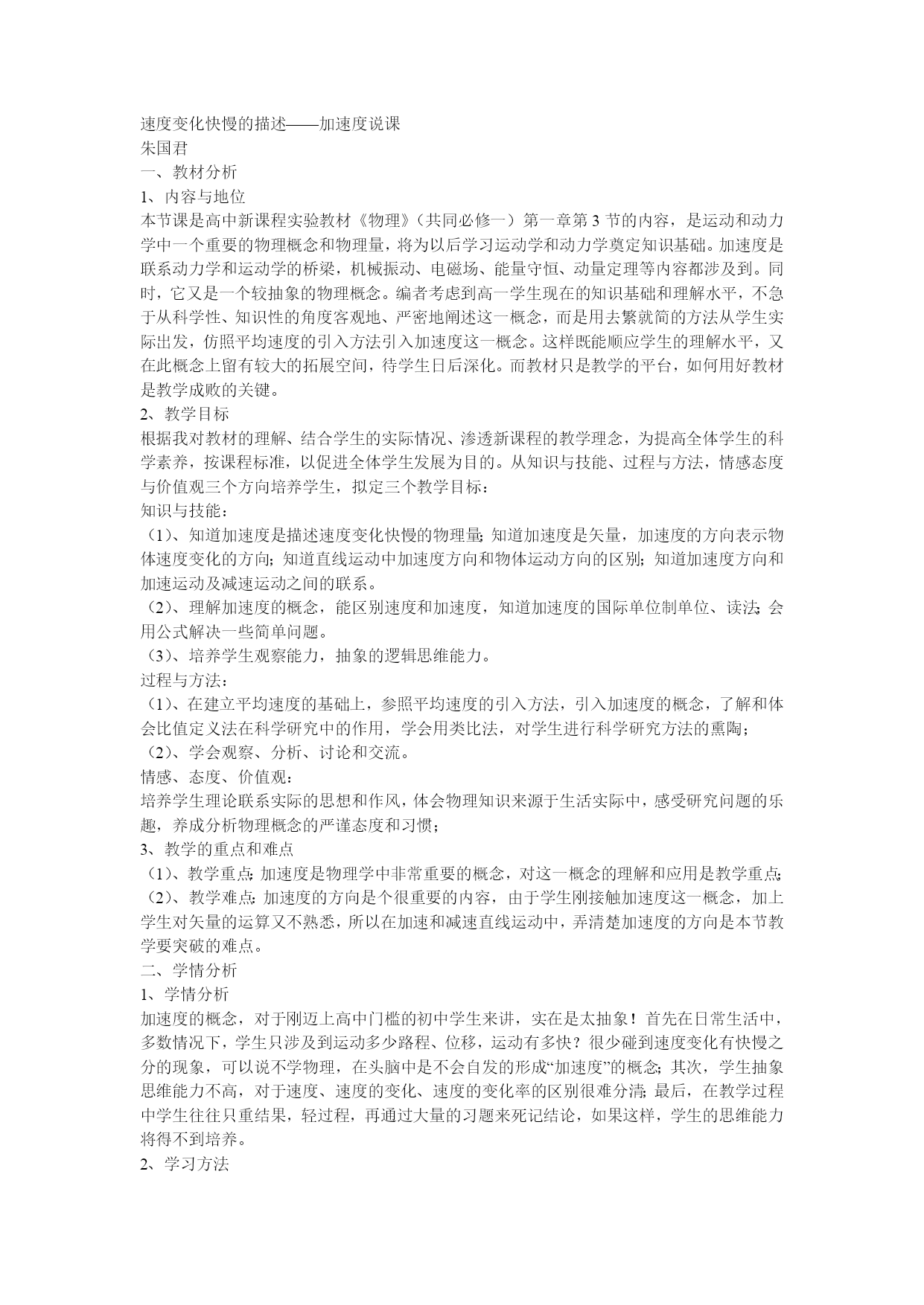 速度变化快慢的描述——加速度说课朱国君一、教材分析1、内容与地位本节课是高中新课程实验教材《物理》(共同必修一)第一章第3节的内容,是运动和动力学中一个重要的物理概念和物理量,将为以后学习运动学和动力学奠定知识基础。加速度是联系动力学和运动学的桥梁,机械振动、电磁场、能量守恒、动量定理等内容都涉及到。同时,它又是一个较抽象的物理概念。编者考虑到高一学生现在的知识基础和理解水平,不急于从科学性、知识性的角度客观地、严密地阐述这一概念,而是用去繁就简的方法从学生实际出发,仿照平均速度的引入方法引入加速度这一概念。这样既能顺应学生的理解水平,又在此概念上留有较大的拓展空间,待学生日后深化。而教材只是教学的平台,如何用好教材是教学成败的关键。2、教学目标根据我对教材的理解、结合学生的实际情况、渗透新课程的教学理念,为提高全体学生的科学素养,按课程标准,以促进全体学生发展为目的。从知识与技能、过程与方法,情感态度与价值观三个方向培养学生,拟定三个教学目标:知识与技能:(1)、知道加速度是描述速度变化快慢的物理量;知道加速度是矢量,加速度的方向表示物体速度变化的方向;知道直线运动中加速度方向和物体运动方向的区别;知道加速度方向和加速运动及减速运动之间的联系。(2)、理解加速度的概念,能区别速度和加速度,知道加速度的国际单位制单位、读法;会用公式解决一些简单问题。(3)、培养学生观察能力,抽象的逻辑思维能力。过程与方法:(1)、在建立平均速度的基础上,参照平均速度的引入方法,引入加速度的概念,了解和体会比值定义法在科学研究中的作用,学会用类比法,对学生进行科学研究方法的熏陶;(2)、学会观察、分析、讨论和交流。情感、态度、价值观:培养学生理论联系实际的思想和作风,体会物理知识来源于生活实际中,感受研究问题的乐趣,养成分析物理概念的严谨态度和习惯;3、教学的重点和难点(1)、教学重点:加速度是物理学中非常重要的概念,对这一概念的理解和应用是教学重点;(2)、教学难点:加速度的方向是个很重要的内容,由于学生刚接触加速度这一概念,加上学生对矢量的运算又不熟悉,所以在加速和减速直线运动中,弄清楚加速度的方向是本节教学要突破的难点。二、学情分析1、学情分析加速度的概念,对于刚迈上高中门槛的初中学生来讲,实在是太抽象!首先在日常生活中,多数情况下,学生只涉及到运动多少路程、位移,运动有多快?很少碰到速度变化有快慢之分的现象,可以说不学物理,在头脑中是不会自发的形成“加速度”的概念;其次,学生抽象思维能力不高,对于速度、速度的变化、速度的变化率的区别很难分清;最后,在教学过程中学生往往只重结果,轻过程,再通过大量的习题来死记结论,如果这样,学生的思维能力将得不到培养。2、学习方法学生是课堂教学的主体,引导学生理解加速度概念,会用之解决一些简单的问题是本课教学的中心目标。因此,巧用提问,激发学生思考问题的积极性、活跃课堂气氛,让学生在轻松、自主的环境下,进行讨论和交流,较好地完成教学任务。实现“人人能学习,人人能掌握”。三、教学方法主要采用:案例分析法;引导启发;分组讨论;类比法等由于本节是概念教学,为了避免陷入满堂灌的误区,因此采用老师引导学生,通过生动形象的案例,让学生逐步体会做变速运动的物体,速度在变,速度的变化需要时间,速度的变化有快慢之区别,且速度变化的快慢是了解物体运动情况的重要指标,类比平均速度描述做变速直线运动的物体位移的变化快慢:引出加速度的概念及其定义公式:,这样能较好地顺应学生的逻辑思维规律,同时又能更大程度地给学生予主动。充分体现“教”服务于“学”,“教”与“学”有机结合的教学理念。另外,为了体现因材施教的教学原则,在课堂教学中及时了解学生领悟的情况,实现同时间、零距离教学反馈,灵活地对加速度的瞬时性做适当的拓展。四、教学程序设计1、复习平均速度和瞬时速度:强调平均速度只能粗略的反映物体在某段时间或某段位移内运动的快慢,而瞬时速度能精确反映物体在某个时刻(或某一位置)的运动快慢,再谈比值定义法和极限思想;指明瞬时速度的矢量性,平均速度的矢量性,为理解加速度的矢量性铺垫;2、导入新课利用多媒体展示小汽车、摩托车、旅客列车速度变化的表格。让学生分析讨论他们之间的速度变化,引出加速度概念——是描述速度变化快慢的物理量,表示为a类比:速度和加速度速度:描述物体运动快慢即物体置变化快慢定义式:加速度:描述速度的变化快慢让学生猜想定义式:让学生依照公式写出a的单位:m/s2,读:米每二次方秒3、什么是速度变化量先介绍速度在一维坐标轴上的表示;同一直线上的矢量计算方法,再说明△v的计算。4、加速度的方向△v是矢量差,也是矢量。而t是标量,故a的方向与实际速度变化量的方