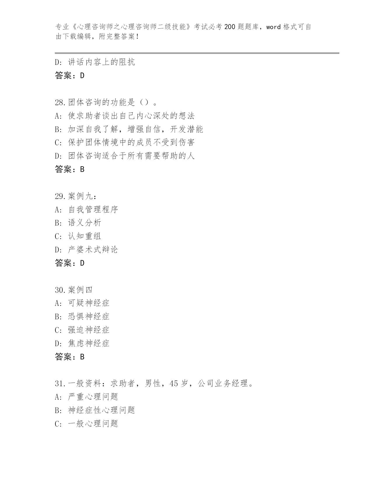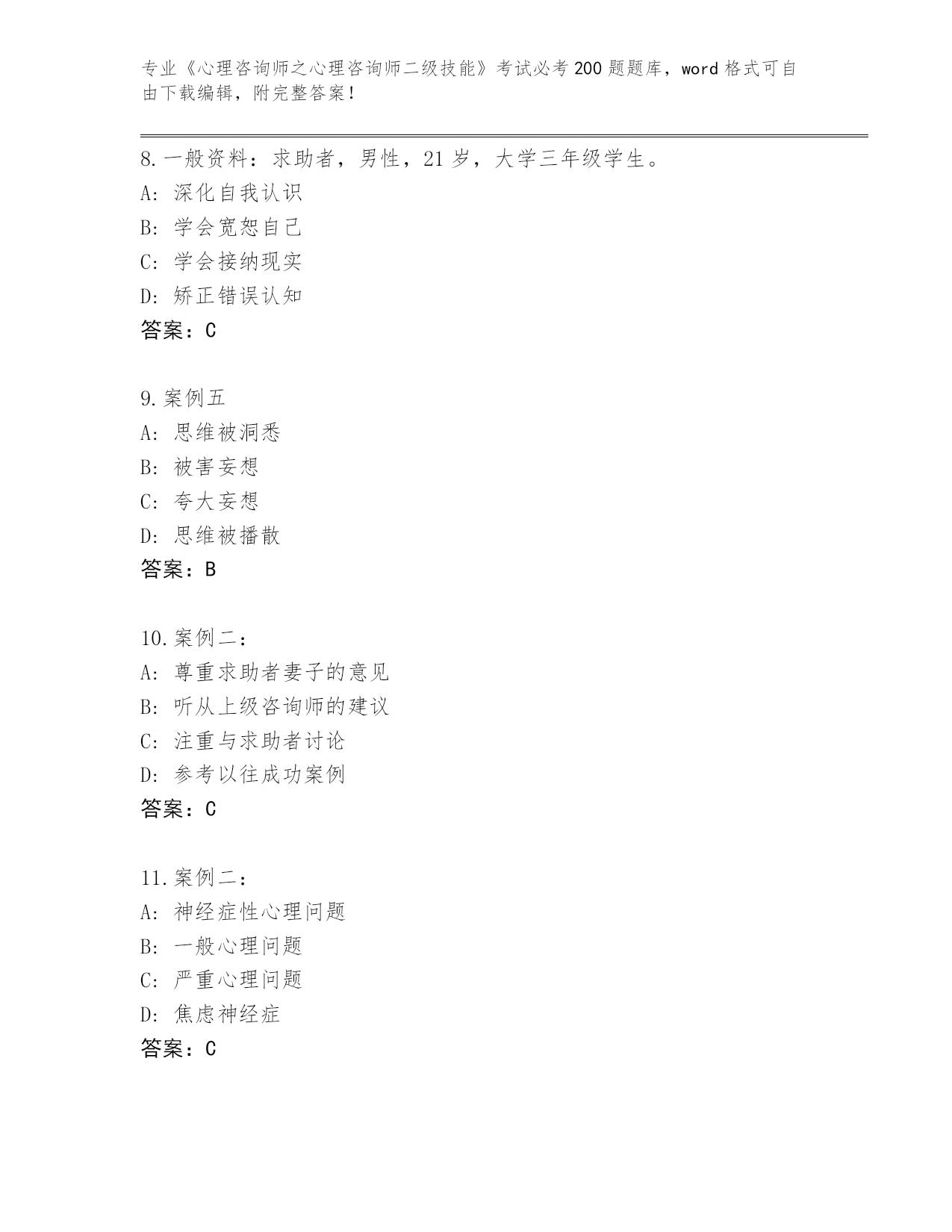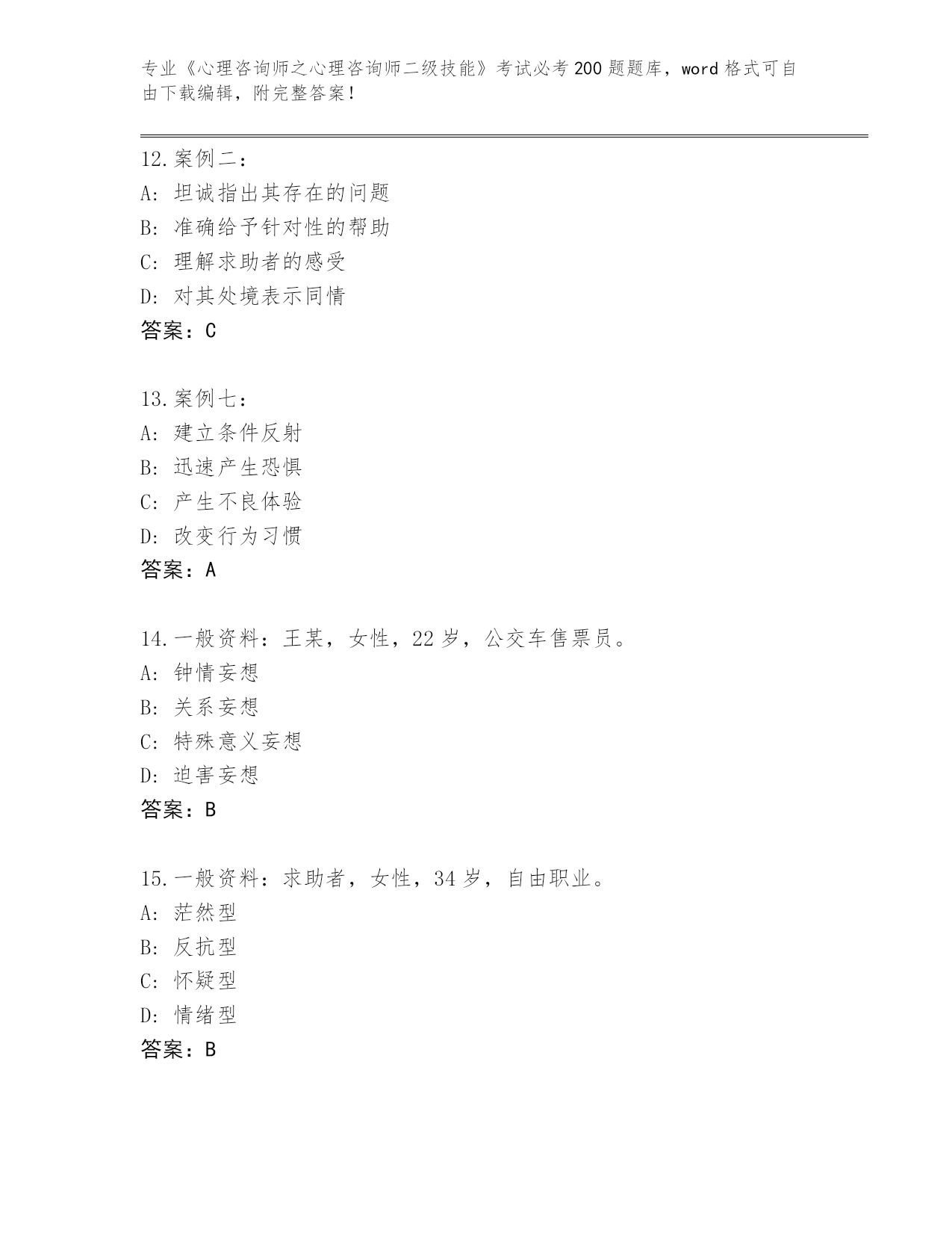 山西省2024《心理咨询师之心理咨询师二级技能》考试必考200题内部题库【精选题】