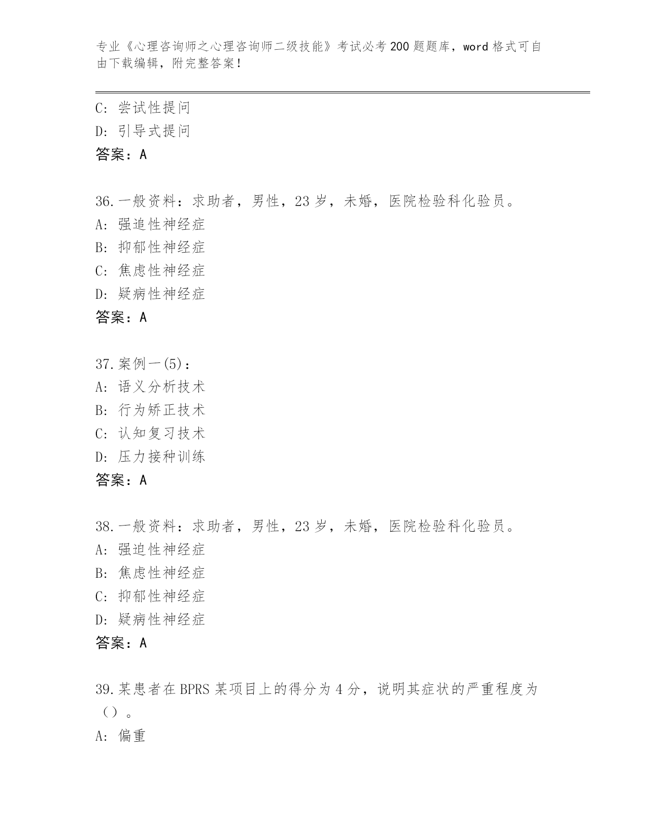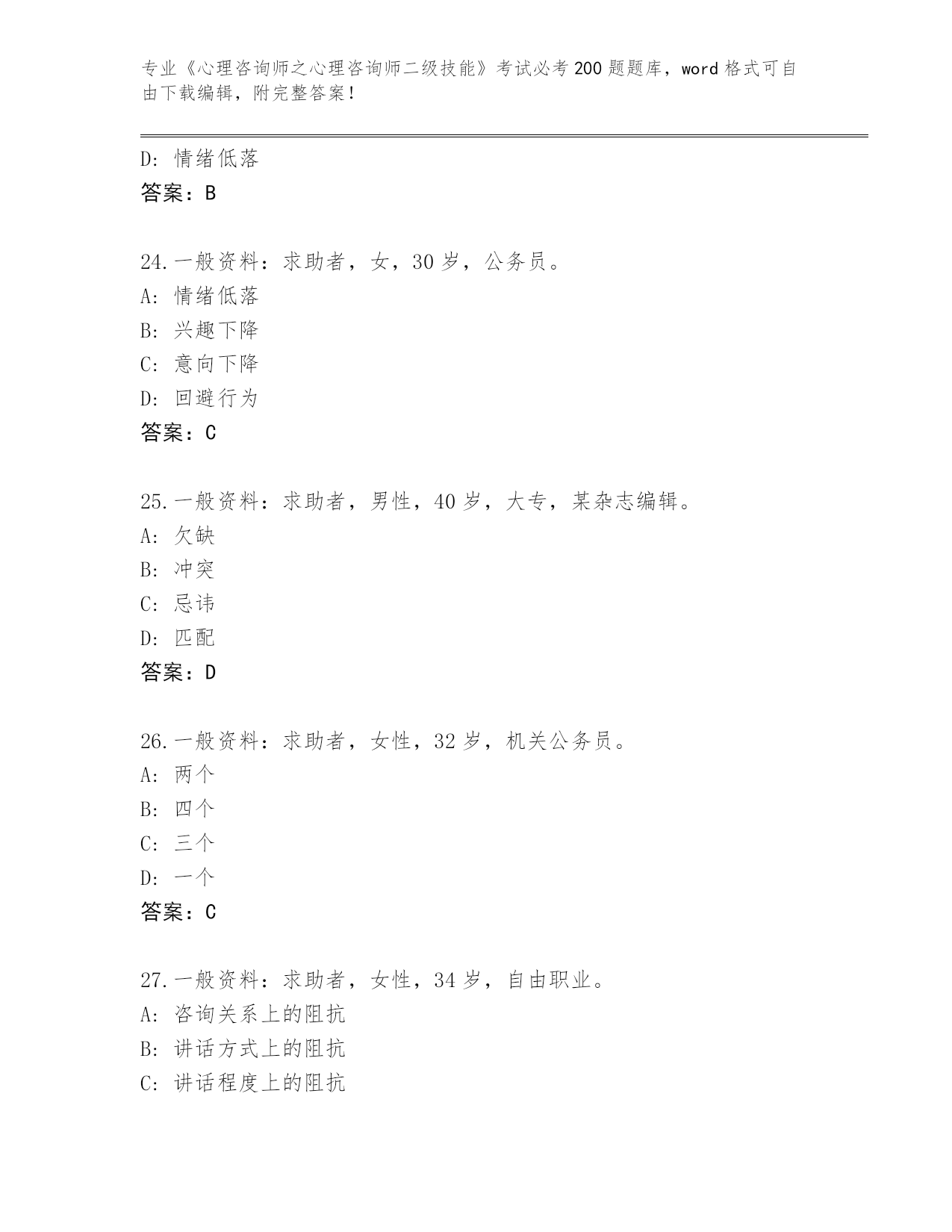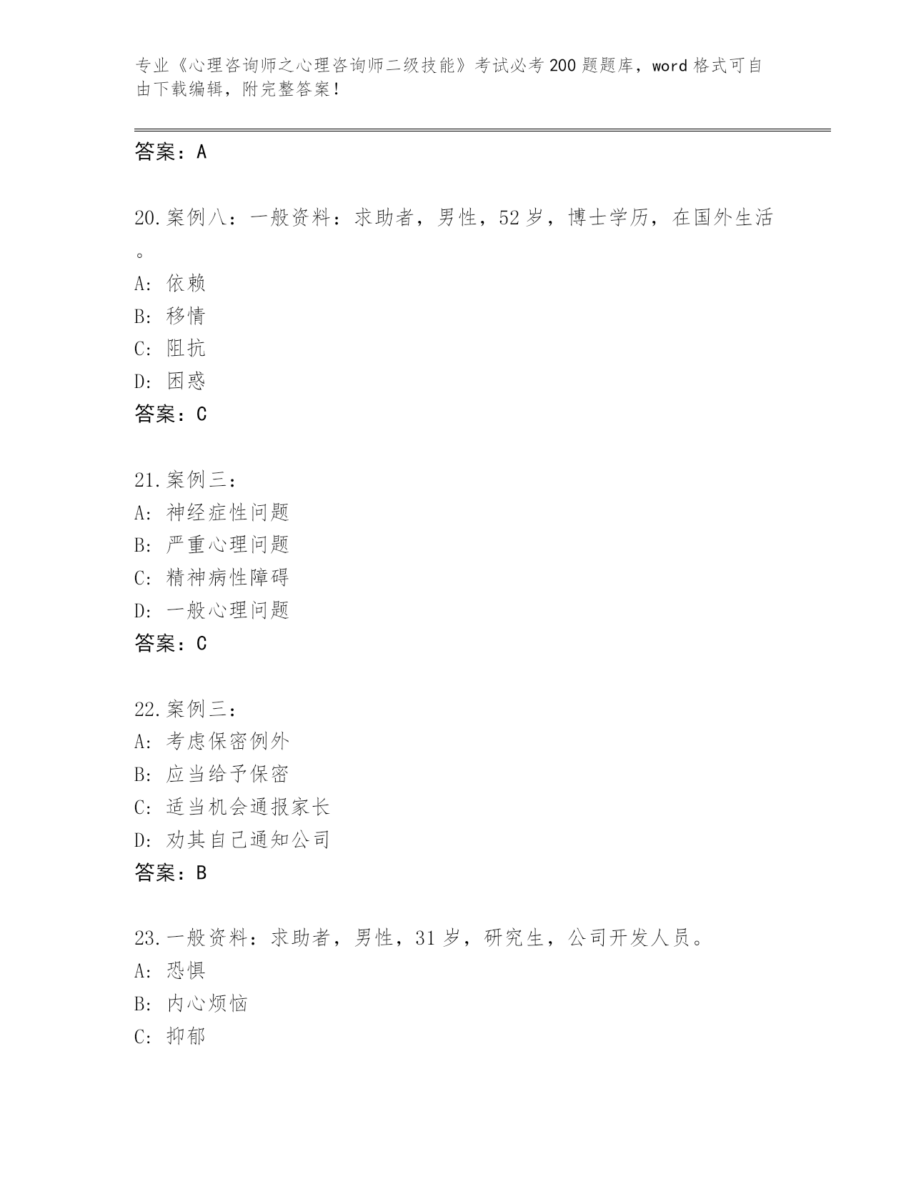 山西省夏县2024年《心理咨询师之心理咨询师二级技能》考试必考200题题库(模拟题)