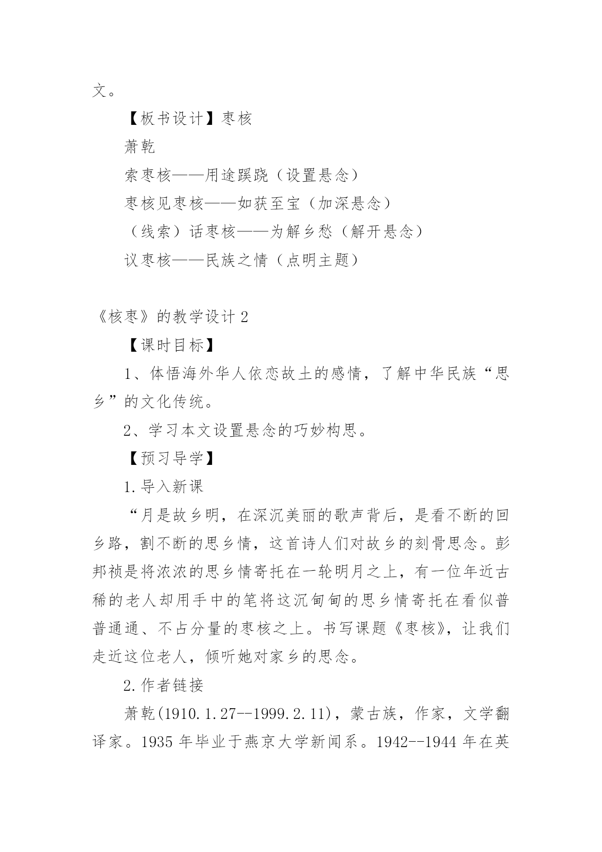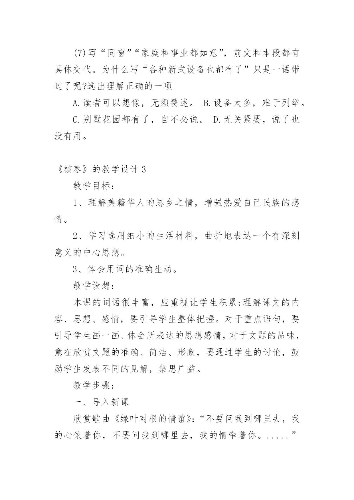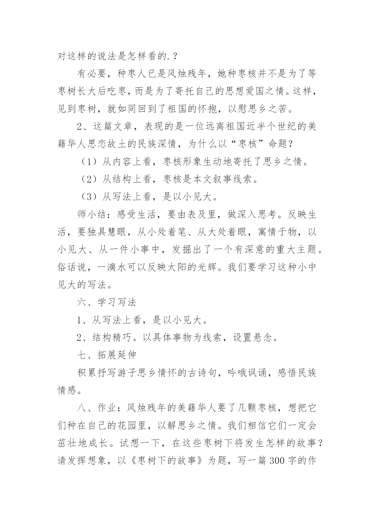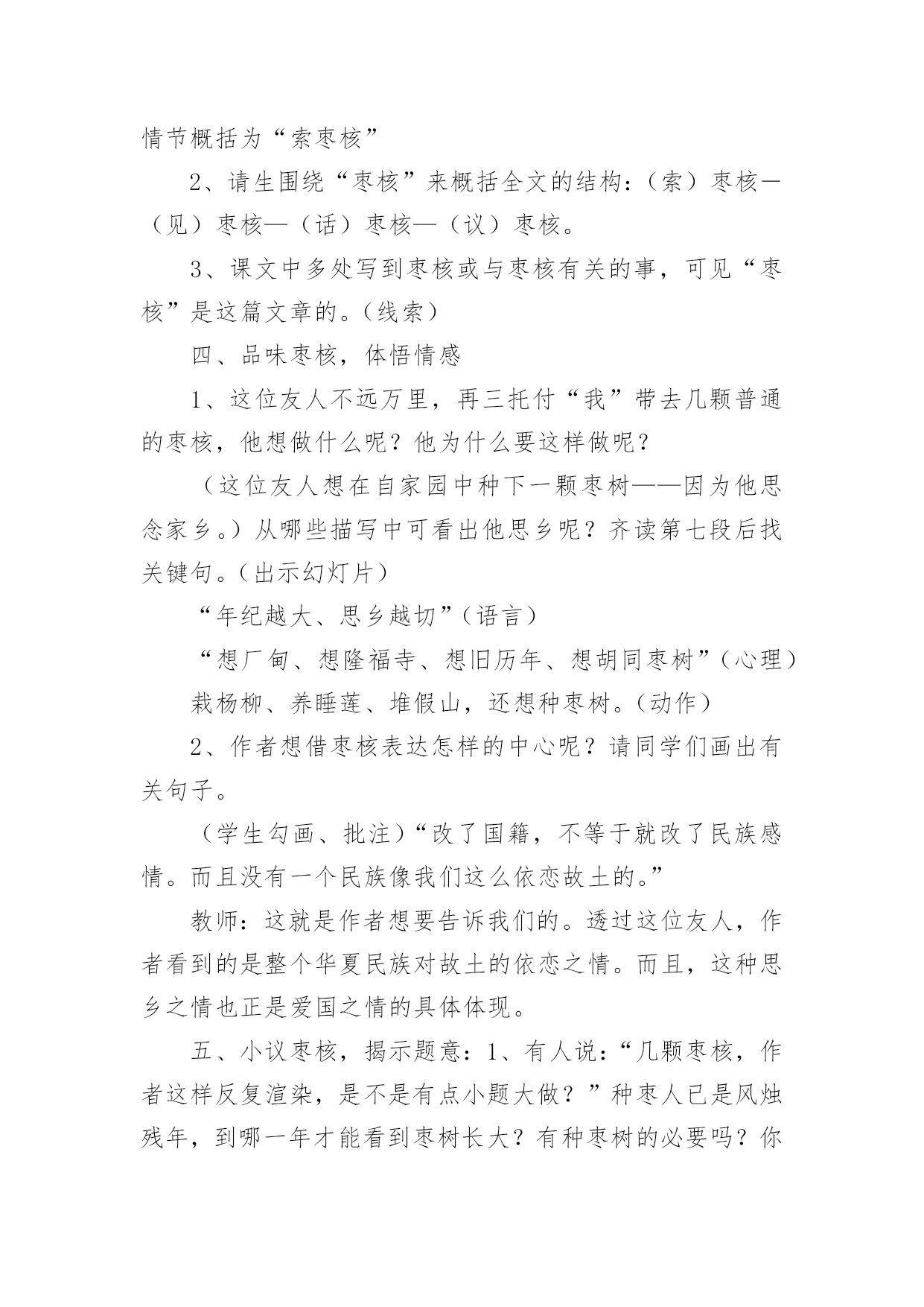 《核枣》的教学设计作为一名默默奉献的教育工作者,编写教学设计是必不可少的,教学设计要遵循教学过程的基本规律,选择教学目标,以解决教什么的问题。优秀的教学设计都具备一些什么特点呢?下面是小编为大家收集的《核枣》的教学设计,希望能够帮助到大家。《核枣》的教学设计1【学习目标】【知识与能力】1、理解枣核在文中的线索作用。2、学习本文选材具体,小中见大的写作手法。3、学习本文围绕枣核设置悬念,使文章起伏跌宕的结构方法。【过程与方法】1、抓住线索梳理内容,简要概括故事情节。2、学习使用圈点批注的方法咬文嚼字,揣摩人物内心世界,品味简洁质朴却饱含深情的语言。【情感态度价值观】体会海外华人对故土的依恋之情,激发学生的爱国情怀。【教学重点】体会文章饱含深情地语言,理解海外华人对故土的依恋之情,激发学生的爱国情怀。【教学难点】学习本文以具体事物为线索设置悬念的巧妙构思。【课时划分】一课时。【教学过程】一、激情导入中华民族是有着优秀传统的民族,每一个炎黄子孙都以自己为中国人而感到骄傲。即使身在异国他乡,也时时刻刻惦记着祖国,想念着故土。今天我们来学习作家萧乾写的《枣核》一文,看看客居美国的游子是怎样思念祖国,怀念家乡的。二、初读枣核朗读课文(生齐读同窗的话,其余师读,配乐)。要求:1、划出文中你认为应该积累的词语。2、请用一句话概括文章的主要内容。(友人托我带几颗生枣核,用以在花园里试种一下的事。)3、请找出文中最能体现文章中心的句子。(改了国籍,不等于就改了民族感情。而且没有一个民族像我们这么依恋故土的。)三、读懂枣核,理清思路请用横线画出文中含有“枣核”或“枣树”的句子,说说作者是怎样围绕“枣核”展开故事情节的。1、(学法指导)如在第一自然段中“一位旧时同窗寄来封航空信,再三托付我为他带去几颗生枣核”下划线,将此情节概括为“索枣核”2、请生围绕“枣核”来概括全文的结构:(索)枣核-(见)枣核—(话)枣核—(议)枣核。3、课文中多处写到枣核或与枣核有关的事,可见“枣核”是这篇文章的。(线索)四、品味枣核,体悟情感1、这位友人不远万里,再三托付“我”带去几颗普通的枣核,他想做什么呢?他为什么要这样做呢?(这位友人想在自家园中种下一颗枣树——因为他思念家乡。)从哪些描写中可看出他思乡呢?齐读第七段后找关键句。(出示幻灯片)“年纪越大、思乡越切”(语言)“想厂甸、想隆福寺、想旧历年、想胡同枣树”(心理)栽杨柳、养睡莲、堆假山,还想种枣树。(动作)2、作者想借枣核表达怎样的中心呢?请同学们画出有关句子。(学生勾画、批注)“改了国籍,不等于就改了民族感情。而且没有一个民族像我们这么依恋故土的。”教师:这就是作者想要告诉我们的。透过这位友人,作者看到的是整个华夏民族对故土的依恋之情。而且,这种思乡之情也正是爱国之情的具体体现。五、小议枣核,揭示题意:1、有人说:“几颗枣核,作者这样反复渲染,是不是有点小题大做?”种枣人已是风烛残年,到哪一年才能看到枣树长大?有种枣树的必要吗?你对这样的说法是怎样看的.?有必要,种枣人已是风烛残年,她种枣核并不是为了等枣树长大后吃枣,而是为了寄托自己的思想爱国之情。这样,见到枣树,就如同回到了祖国的怀抱,以慰思乡之苦。2、这篇文章,表现的是一位远离祖国近半个世纪的美籍华人思恋故土的民族深情,为什么以“枣核”命题?(1)从内容上看,枣核形象生动地寄托了思乡之情。(2)从结构上看,枣核是本文叙事线索。(3)从写法上看,是以小见大。师小结:感受生活,要由表及里,做深入思考。反映生活,要独具慧眼,从小处着笔、从大处着眼,寓情于物,以小见大、从一件小事中,发掘出了一个有深意的重大主题。俗话说,一滴水可以反映太阳的光辉。我们要学习这种小中见大的写法。六、学习写法1、从写法上看,是以小见大。2、结构精巧。以具体事物为线索,设置悬念。七、拓展延伸积累抒写游子思乡情怀的古诗句,吟哦讽诵,感悟民族情感。八、作业:风烛残年的美籍华人要了几颗枣核,想把它们种在自己的花园里,以解思乡之情。我们相信它们一定会茁壮地成长。试想一下,在这些枣树下将发生怎样的故事?请发挥想象,以《枣树下的故事》为题,写一篇300字的作文。【板书设计】枣核萧乾索枣核——用途蹊跷(设置悬念)枣核见枣核——如获至宝(加深悬念)(线索)话枣核——为解乡愁(解开悬念)议枣核——民族之情(点明主题)《核枣》的教学设计2【课时目标】1、体悟海外华人依恋故土的感情,了解中华民族“思乡”的文化传统。2、学习本文设置悬念的巧妙构思。【预习导学】1.导入新课“月是故乡明,在深沉美丽的歌声背后,是看不断的回乡路,割不断的思乡情,这首诗人们对故乡的刻骨思念。彭邦祯是将浓浓的思乡情寄托在一轮明月之上,有一位年近古稀的老人却用手中的笔将这沉甸甸的思乡情寄托在看似普普通通、不占分量的枣核之上。书写课题