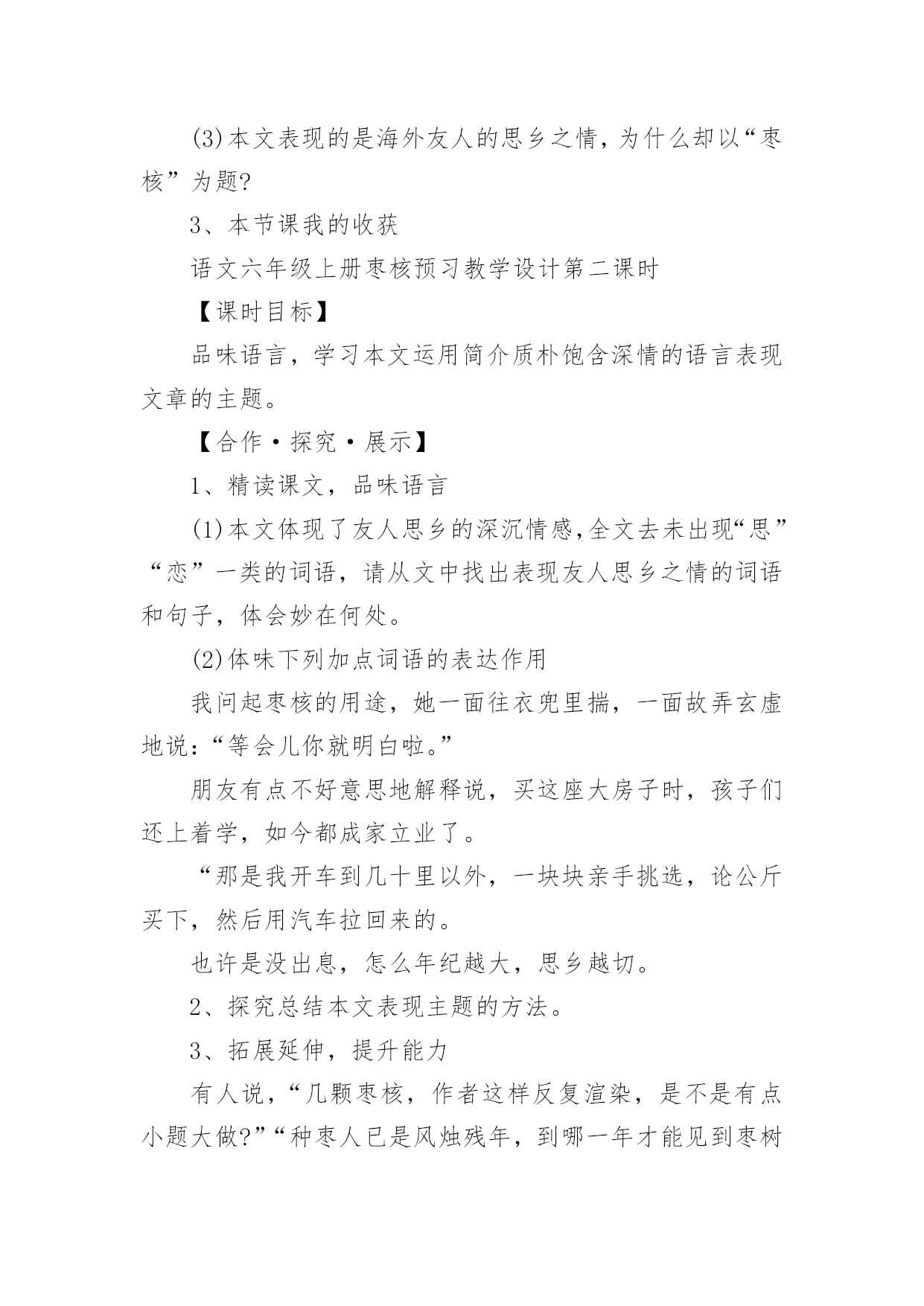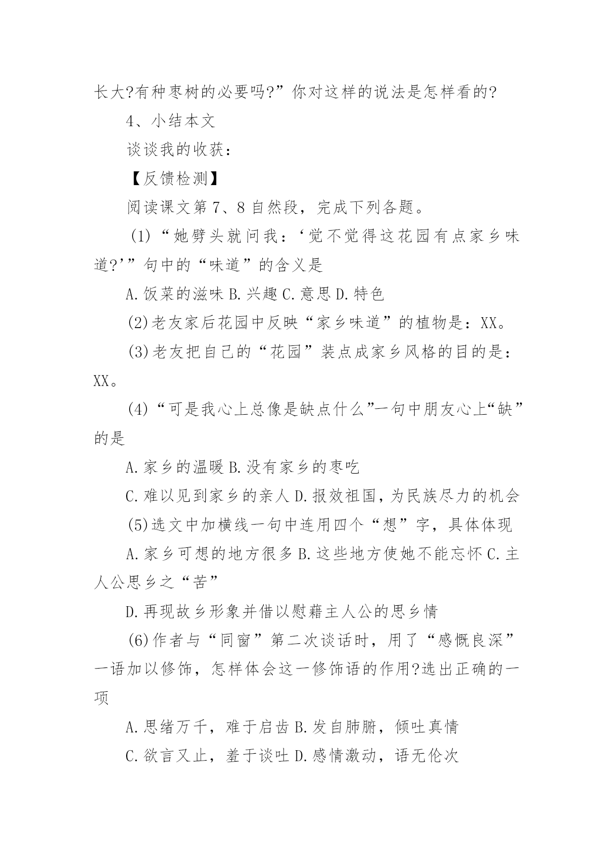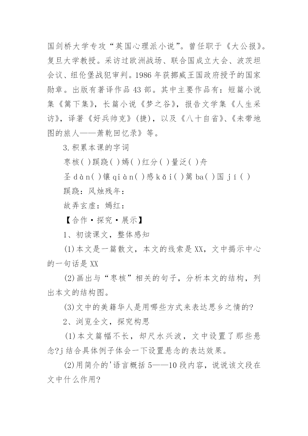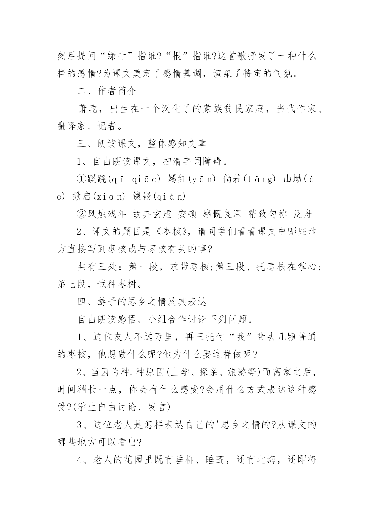 《核枣》的教学设计作为一名默默奉献的教育工作者,编写教学设计是必不可少的,教学设计要遵循教学过程的基本规律,选择教学目标,以解决教什么的问题。优秀的教学设计都具备一些什么特点呢?下面是小编为大家收集的《核枣》的教学设计,希望能够帮助到大家。《核枣》的教学设计1【学习目标】【知识与能力】1、理解枣核在文中的线索作用。2、学习本文选材具体,小中见大的写作手法。3、学习本文围绕枣核设置悬念,使文章起伏跌宕的结构方法。【过程与方法】1、抓住线索梳理内容,简要概括故事情节。2、学习使用圈点批注的方法咬文嚼字,揣摩人物内心世界,品味简洁质朴却饱含深情的语言。【情感态度价值观】体会海外华人对故土的依恋之情,激发学生的爱国情怀。【教学重点】体会文章饱含深情地语言,理解海外华人对故土的依恋之情,激发学生的爱国情怀。【教学难点】学习本文以具体事物为线索设置悬念的巧妙构思。【课时划分】一课时。【教学过程】一、激情导入中华民族是有着优秀传统的民族,每一个炎黄子孙都以自己为中国人而感到骄傲。即使身在异国他乡,也时时刻刻惦记着祖国,想念着故土。今天我们来学习作家萧乾写的《枣核》一文,看看客居美国的游子是怎样思念祖国,怀念家乡的。二、初读枣核朗读课文(生齐读同窗的话,其余师读,配乐)。要求:1、划出文中你认为应该积累的词语。2、请用一句话概括文章的主要内容。(友人托我带几颗生枣核,用以在花园里试种一下的事。)3、请找出文中最能体现文章中心的句子。(改了国籍,不等于就改了民族感情。而且没有一个民族像我们这么依恋故土的。)三、读懂枣核,理清思路请用横线画出文中含有“枣核”或“枣树”的句子,说说作者是怎样围绕“枣核”展开故事情节的。1、(学法指导)如在第一自然段中“一位旧时同窗寄来封航空信,再三托付我为他带去几颗生枣核”下划线,将此情节概括为“索枣核”2、请生围绕“枣核”来概括全文的结构:(索)枣核-(见)枣核—(话)枣核—(议)枣核。3、课文中多处写到枣核或与枣核有关的事,可见“枣核”是这篇文章的。(线索)四、品味枣核,体悟情感1、这位友人不远万里,再三托付“我”带去几颗普通的枣核,他想做什么呢?他为什么要这样做呢?(这位友人想在自家园中种下一颗枣树——因为他思念家乡。)从哪些描写中可看出他思乡呢?齐读第七段后找关键句。(出示幻灯片)“年纪越大、思乡越切”(语言)“想厂甸、想隆福寺、想旧历年、想胡同枣树”(心理)栽杨柳、养睡莲、堆假山,还想种枣树。(动作)2、作者想借枣核表达怎样的中心呢?请同学们画出有关句子。(学生勾画、批注)“改了国籍,不等于就改了民族感情。而且没有一个民族像我们这么依恋故土的。”教师:这就是作者想要告诉我们的。透过这位友人,作者看到的是整个华夏民族对故土的依恋之情。而且,这种思乡之情也正是爱国之情的具体体现。五、小议枣核,揭示题意:1、有人说:“几颗枣核,作者这样反复渲染,是不是有点小题大做?”种枣人已是风烛残年,到哪一年才能看到枣树长大?有种枣树的必要吗?你对这样的说法是怎样看的.?有必要,种枣人已是风烛残年,她种枣核并不是为了等枣树长大后吃枣,而是为了寄托自己的思想爱国之情。这样,见到枣树,就如同回到了祖国的怀抱,以慰思乡之苦。2、这篇文章,表现的是一位远离祖国近半个世纪的美籍华人思恋故土的民族深情,为什么以“枣核”命题?(1)从内容上看,枣核形象生动地寄托了思乡之情。(2)从结构上看,枣核是本文叙事线索。(3)从写法上看,是以小见大。师小结:感受生活,要由表及里,做深入思考。反映生活,要独具慧眼,从小处着笔、从大处着眼,寓情于物,以小见大、从一件小事中,发掘出了一个有深意的重大主题。俗话说,一滴水可以反映太阳的光辉。我们要学习这种小中见大的写法。六、学习写法1、从写法上看,是以小见大。2、结构精巧。以具体事物为线索,设置悬念。七、拓展延伸积累抒写游子思乡情怀的古诗句,吟哦讽诵,感悟民族情感。八、作业:风烛残年的美籍华人要了几颗枣核,想把它们种在自己的花园里,以解思乡之情。我们相信它们一定会茁壮地成长。试想一下,在这些枣树下将发生怎样的故事?请发挥想象,以《枣树下的故事》为题,写一篇300字的作文。【板书设计】枣核萧乾索枣核——用途蹊跷(设置悬念)枣核见枣核——如获至宝(加深悬念)(线索)话枣核——为解乡愁(解开悬念)议枣核——民族之情(点明主题)《核枣》的教学设计2【课时目标】1、体悟海外华人依恋故土的感情,了解中华民族“思乡”的文化传统。2、学习本文设置悬念的巧妙构思。【预习导学】1.导入新课“月是故乡明,在深沉美丽的歌声背后,是看不断的回乡路,割不断的思乡情,这首诗人们对故乡的刻骨思念。彭邦祯是将浓浓的思乡情寄托在一轮明月之上,有一位年近古稀的老人却用手中的笔将这沉甸甸的思乡情寄托在看似普普通通、不占分量的枣核之上。书写课题