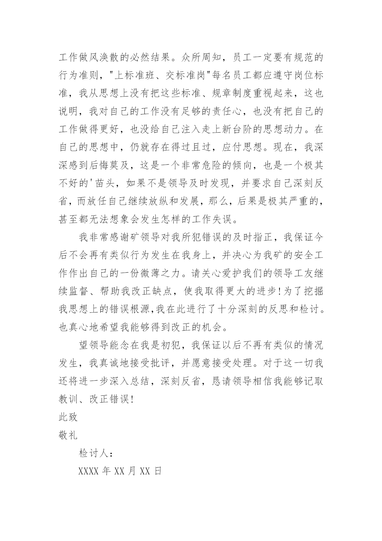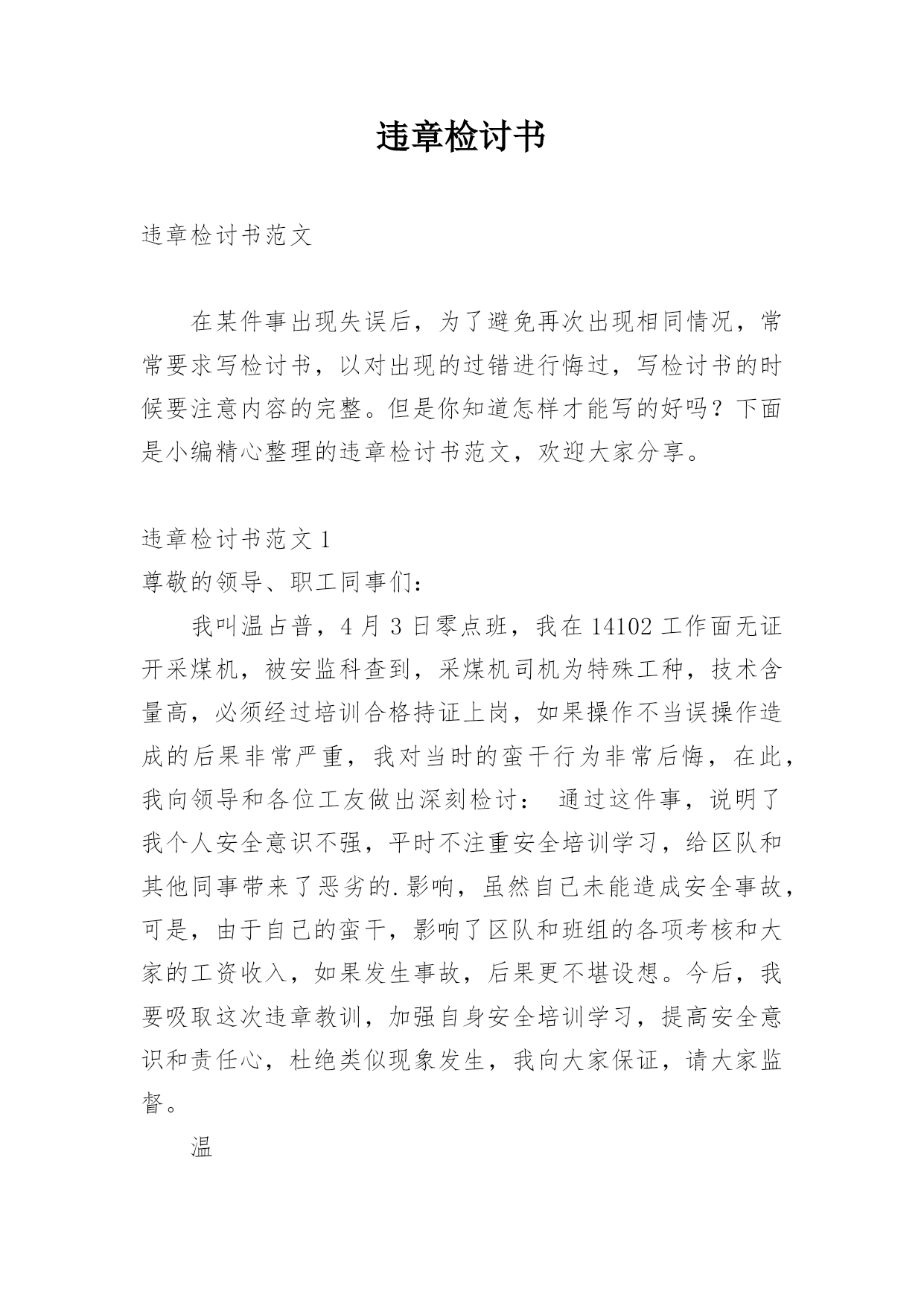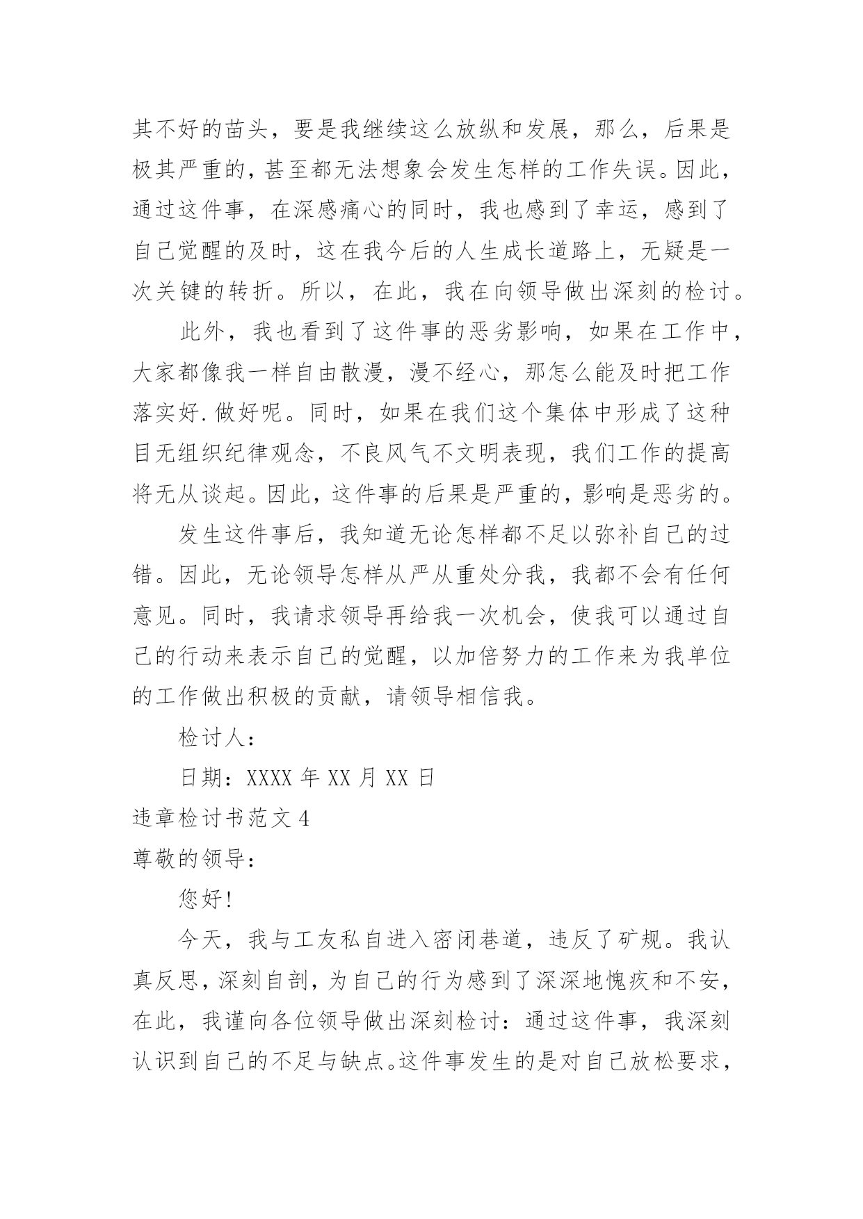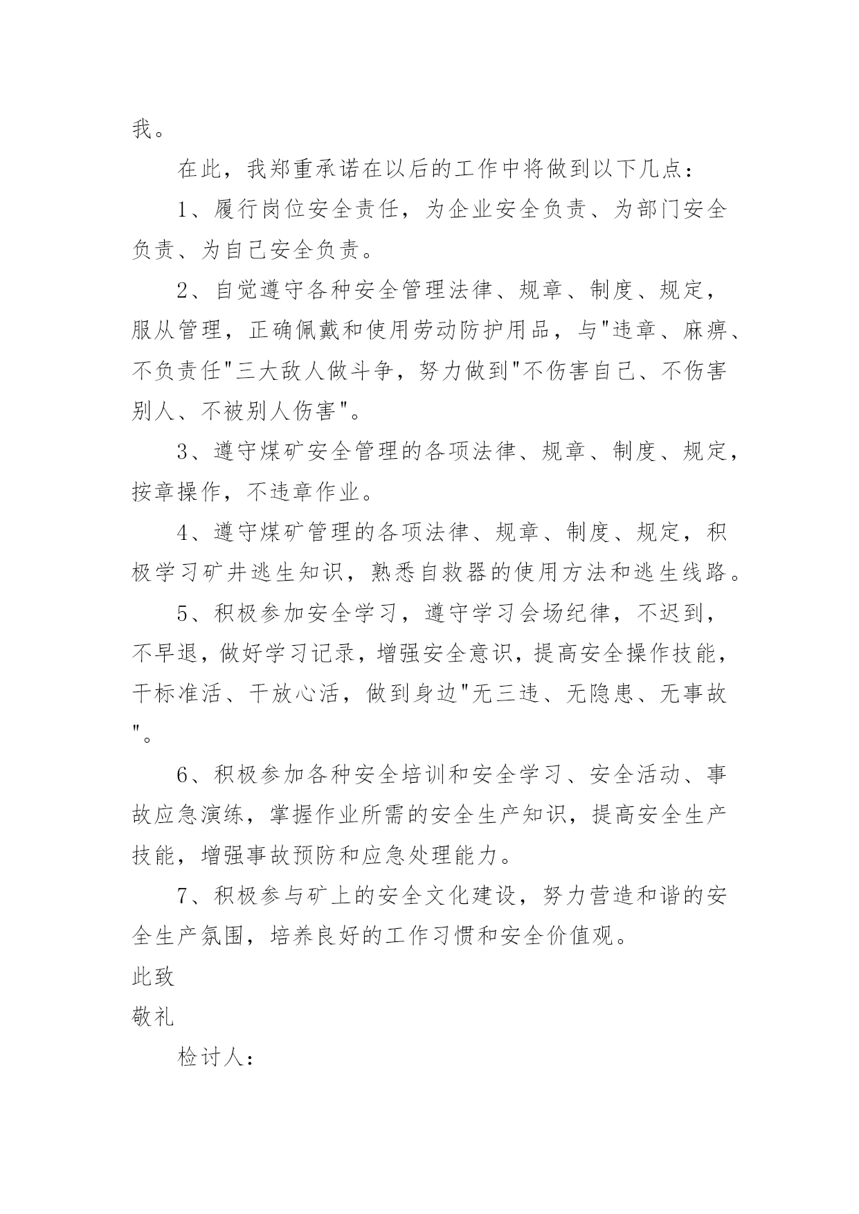违章检讨书违章检讨书范文在某件事出现失误后,为了避免再次出现相同情况,常常要求写检讨书,以对出现的过错进行悔过,写检讨书的时候要注意内容的完整。但是你知道怎样才能写的好吗?下面是小编精心整理的违章检讨书范文,欢迎大家分享。违章检讨书范文1尊敬的领导、职工同事们:我叫温占普,4月3日零点班,我在14102工作面无证开采煤机,被安监科查到,采煤机司机为特殊工种,技术含量高,必须经过培训合格持证上岗,如果操作不当误操作造成的后果非常严重,我对当时的蛮干行为非常后悔,在此,我向领导和各位工友做出深刻检讨:通过这件事,说明了我个人安全意识不强,平时不注重安全培训学习,给区队和其他同事带来了恶劣的.影响,虽然自己未能造成安全事故,可是,由于自己的蛮干,影响了区队和班组的各项考核和大家的工资收入,如果发生事故,后果更不堪设想。今后,我要吸取这次违章教训,加强自身安全培训学习,提高安全意识和责任心,杜绝类似现象发生,我向大家保证,请大家监督。温20xx年4月违章检讨书范文2尊敬的公司领导:您好!今天,我怀着愧疚和懊悔给您写下这份检讨书,以向您表示我提前出口的不良行为,深刻认识改正错误的决心。在没有确保安全的情况下,擅自进入密闭巷道,我认真反思,深刻自剖,为自己的行为感到了深深地愧疚和不安在此,我向领导做出如下深刻检讨:通过这件事,我感到这虽然是一件偶然发生的事情,但同时感觉到对自己放松要求,没有考虑到这种行为的负面影响性和错误的严重性。经过反思,这次发生的事使我感到是自己的'内疚,愧对领导的关心。同时,在这件事中,我还感到,自己在工作责任心上仍有欠缺。此外,我也看到了这件事的恶劣影响,如果在各自的岗位上,大家都像我一样自由散漫,不守纪律,怎么能及时把工作精神贯彻好、落实好,并且把工作做好呢。同时,如果在我们这个集体中形成了这种目无组织纪律观念,为所欲为的不良风气,我们的安全工作将无从谈起。因此,这件事的后果是严重的,影响是恶劣的。发生这件事后,我知道无论怎样都不足以弥补自己的过错。因此,我不请求领导对我宽恕,无论领导怎样从严从重处分我,我都不会有任何意见。同时,我请求领导给我一次机会,使我可以通过自己的行动来表示自己的觉醒,以加倍努力的工作来为我单位的工作做出积极的贡献,请领导相信我。在此,我郑重承诺在以后的工作中将做到以下几点:1、履行岗位安全责任,为企业安全负责、为部门安全负责、为自己安全负责。2、自觉遵守各种安全管理法律、规章、制度、规定,服从管理,正确佩戴和使用劳动防护用品,与"违章、麻痹、不负责任"三大敌人做斗争,努力做到"不伤害自己、不伤害别人、不被别人伤害"。3、遵守煤矿安全管理的各项法律、规章、制度、规定,按章操作,不违章作业。4、遵守煤矿管理的各项法律、规章、制度、规定,积极学习矿井逃生知识,熟悉自救器的使用方法和逃生线路。5、积极参加安全学习,遵守学习会场纪律,不迟到,不早退,做好学习记录,增强安全意识,提高安全操作技能,干标准活、干放心活,做到身边"无三违、无隐患、无事故"。6、积极参加各种安全培训和安全学习、安全活动、事故应急演练,掌握作业所需的安全生产知识,提高安全生产技能,增强事故预防和应急处理能力。7、积极参与矿上的安全文化建设,努力营造和谐的安全生产氛围,培养良好的工作习惯和安全价值观。此致敬礼检讨人:XXXX年XX月XX日违章检讨书范文3尊敬的领导:7月19日,在工作中,由于我的工作态度不认真,导致发生一起交通事故。几天来,我认真反思,深刻自剖,为自己的行为感到了深深地愧疚和不安,在此,我谨向各位领导做出深刻检讨,并将我几天来的思想反思结果向领导汇报如下:通过这件事,我感到这虽然是一件偶然发生的事情,但同时也是长期以来对自己放松要求,工作作风涣散的必然结果。经过几天的反思,我对自己这几个月的工作经历进行了详细回忆和分析。记得刚上班的时候,我对自己的要求还是比较高的,时时处处也都能遵守相关规章制度,从而努力完成工作。但近几个星期来,由于工作逐渐走上了轨道,尤其是领导对我的关怀和帮助使我感到温暖的同时,也慢慢开始放松了对自己的要求,反而认为自己已经做得很好了。因此,这次发生的事使我不仅感到是自己的耻辱,更为重要的`是我感到对不起领导对我的信任,愧对领导的关心。同时,在这件事中,我还感到,自己在工作责任心上仍就非常欠缺。这充分说明,我从思想上没有把工作重视起来,这也说明,我对自己的工作没有足够的责任心,也没有把自己的工作做得更好,也没给自己注入走上新台阶的思想动力。在自己的思想中,仍就存在得过且过,混日子的应付思想。现在,我深深感到,这是一个非常危险的倾向,也是一个极其不好的苗头,要是我继续这么放纵和发展,那么,后果是极其严重的,甚至都无法想象会发生怎样的工作失误。因此,通过这件事,在深感痛心的同时,我也感到了