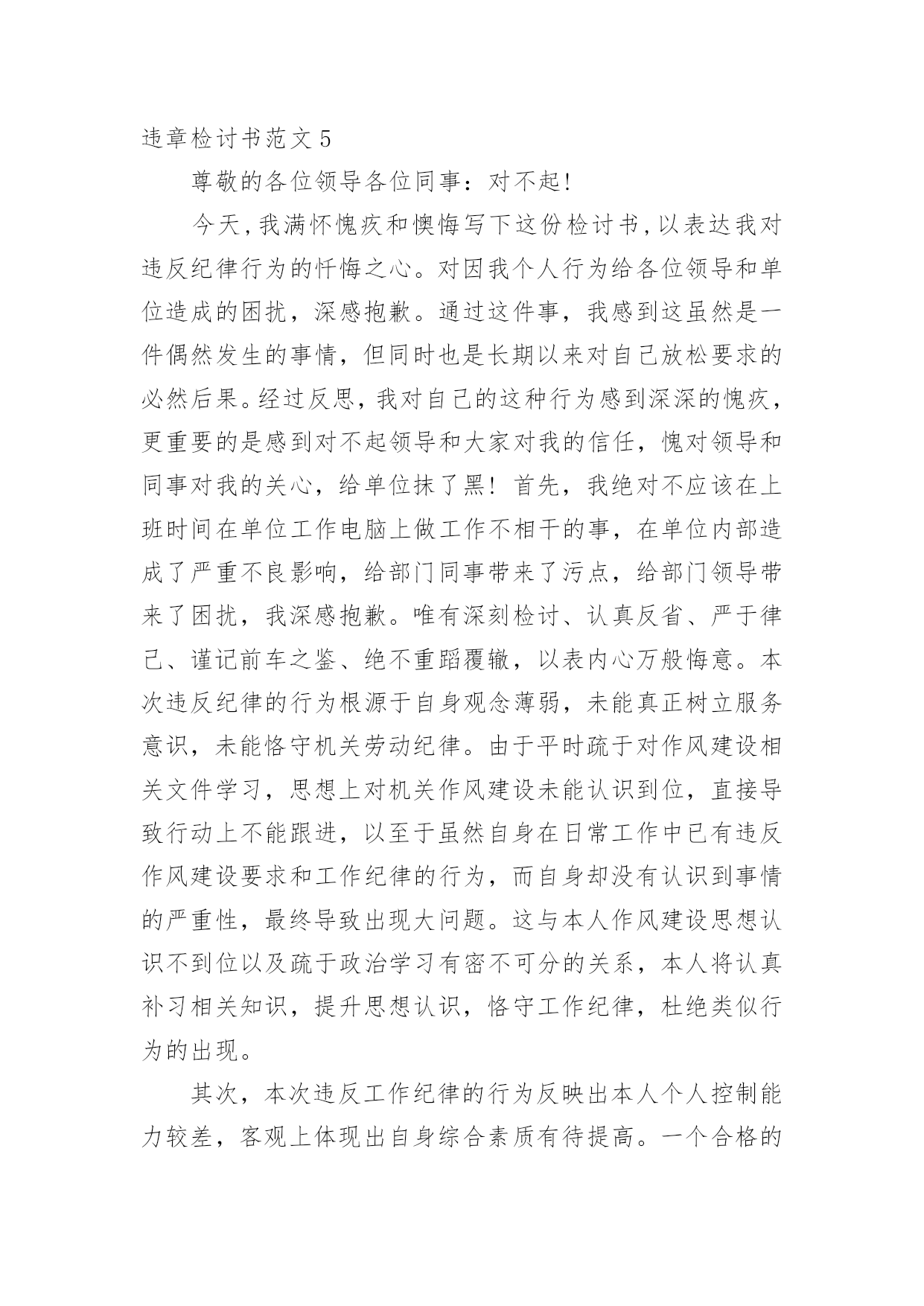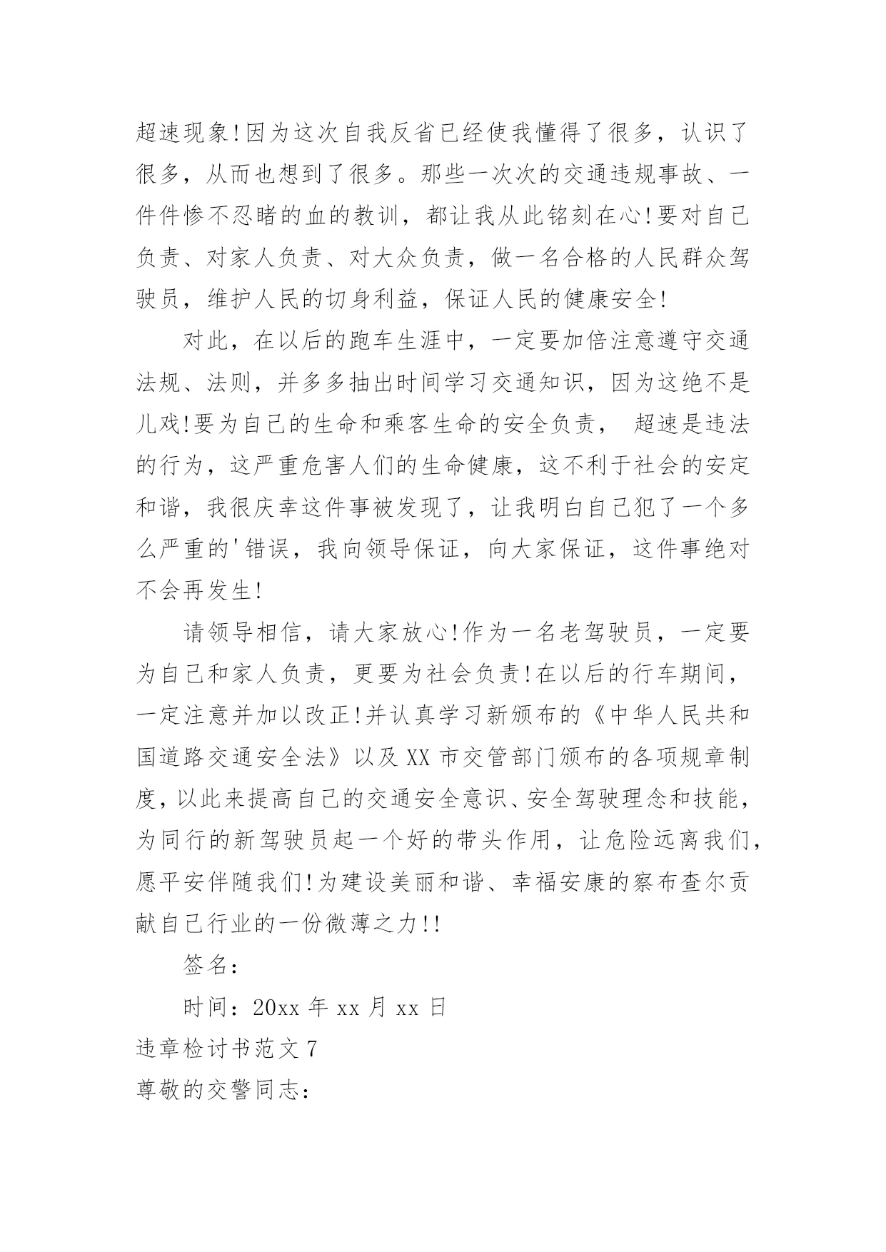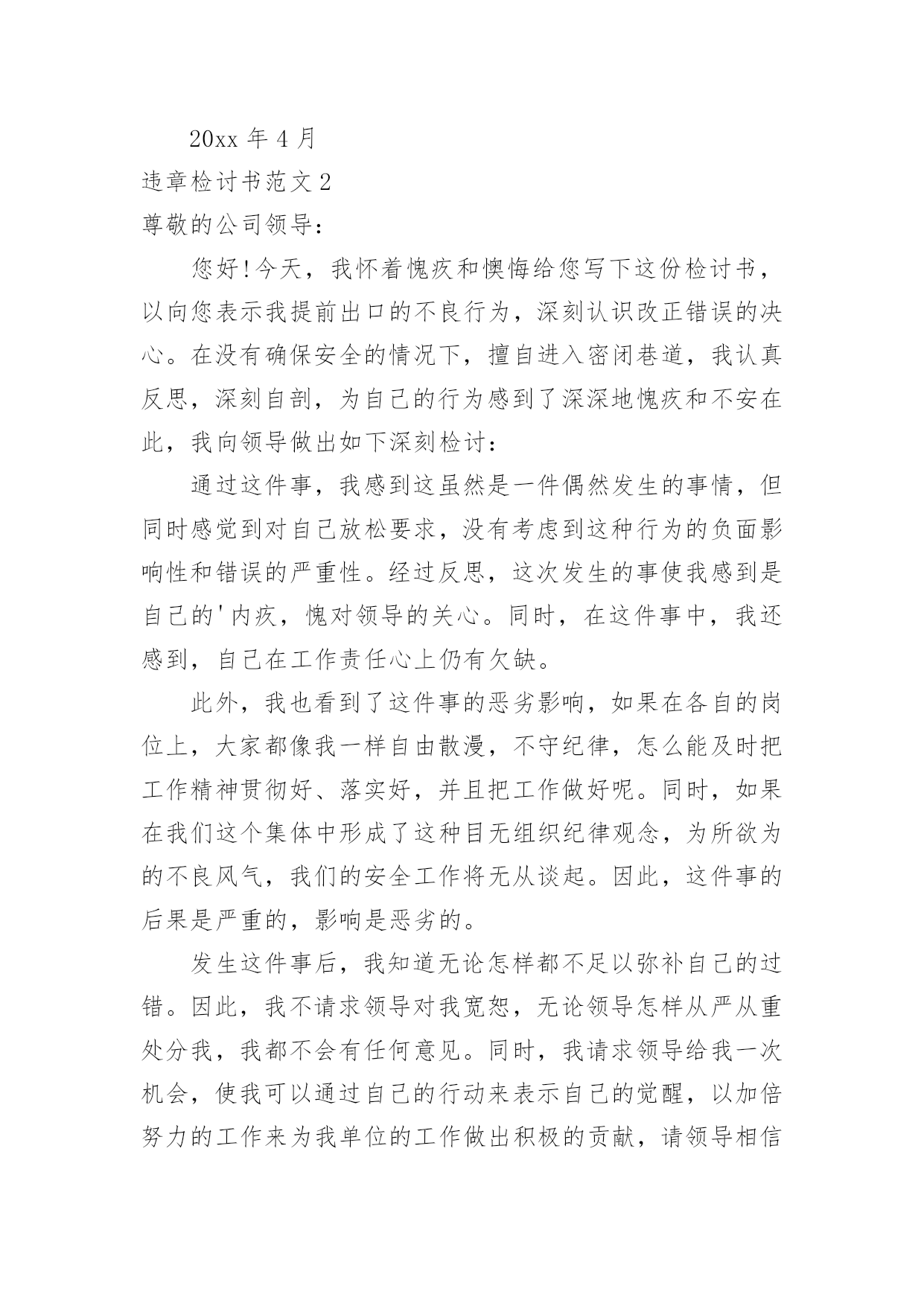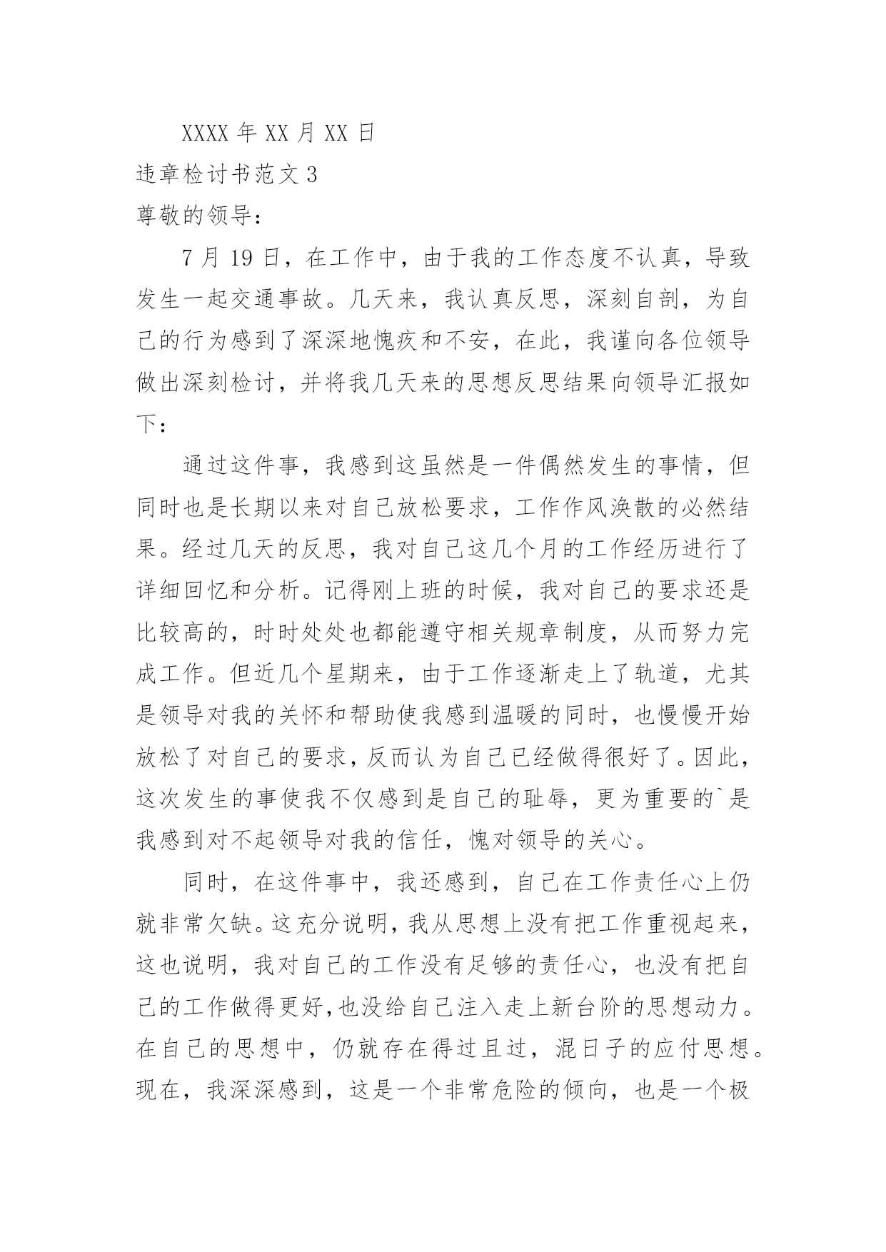 违章检讨书违章检讨书范文在某件事出现失误后,为了避免再次出现相同情况,常常要求写检讨书,以对出现的过错进行悔过,写检讨书的时候要注意内容的完整。但是你知道怎样才能写的好吗?下面是小编精心整理的违章检讨书范文,欢迎大家分享。违章检讨书范文1尊敬的领导、职工同事们:我叫温占普,4月3日零点班,我在14102工作面无证开采煤机,被安监科查到,采煤机司机为特殊工种,技术含量高,必须经过培训合格持证上岗,如果操作不当误操作造成的后果非常严重,我对当时的蛮干行为非常后悔,在此,我向领导和各位工友做出深刻检讨:通过这件事,说明了我个人安全意识不强,平时不注重安全培训学习,给区队和其他同事带来了恶劣的.影响,虽然自己未能造成安全事故,可是,由于自己的蛮干,影响了区队和班组的各项考核和大家的工资收入,如果发生事故,后果更不堪设想。今后,我要吸取这次违章教训,加强自身安全培训学习,提高安全意识和责任心,杜绝类似现象发生,我向大家保证,请大家监督。温20xx年4月违章检讨书范文2尊敬的公司领导:您好!今天,我怀着愧疚和懊悔给您写下这份检讨书,以向您表示我提前出口的不良行为,深刻认识改正错误的决心。在没有确保安全的情况下,擅自进入密闭巷道,我认真反思,深刻自剖,为自己的行为感到了深深地愧疚和不安在此,我向领导做出如下深刻检讨:通过这件事,我感到这虽然是一件偶然发生的事情,但同时感觉到对自己放松要求,没有考虑到这种行为的负面影响性和错误的严重性。经过反思,这次发生的事使我感到是自己的'内疚,愧对领导的关心。同时,在这件事中,我还感到,自己在工作责任心上仍有欠缺。此外,我也看到了这件事的恶劣影响,如果在各自的岗位上,大家都像我一样自由散漫,不守纪律,怎么能及时把工作精神贯彻好、落实好,并且把工作做好呢。同时,如果在我们这个集体中形成了这种目无组织纪律观念,为所欲为的不良风气,我们的安全工作将无从谈起。因此,这件事的后果是严重的,影响是恶劣的。发生这件事后,我知道无论怎样都不足以弥补自己的过错。因此,我不请求领导对我宽恕,无论领导怎样从严从重处分我,我都不会有任何意见。同时,我请求领导给我一次机会,使我可以通过自己的行动来表示自己的觉醒,以加倍努力的工作来为我单位的工作做出积极的贡献,请领导相信我。在此,我郑重承诺在以后的工作中将做到以下几点:1、履行岗位安全责任,为企业安全负责、为部门安全负责、为自己安全负责。2、自觉遵守各种安全管理法律、规章、制度、规定,服从管理,正确佩戴和使用劳动防护用品,与"违章、麻痹、不负责任"三大敌人做斗争,努力做到"不伤害自己、不伤害别人、不被别人伤害"。3、遵守煤矿安全管理的各项法律、规章、制度、规定,按章操作,不违章作业。4、遵守煤矿管理的各项法律、规章、制度、规定,积极学习矿井逃生知识,熟悉自救器的使用方法和逃生线路。5、积极参加安全学习,遵守学习会场纪律,不迟到,不早退,做好学习记录,增强安全意识,提高安全操作技能,干标准活、干放心活,做到身边"无三违、无隐患、无事故"。6、积极参加各种安全培训和安全学习、安全活动、事故应急演练,掌握作业所需的安全生产知识,提高安全生产技能,增强事故预防和应急处理能力。7、积极参与矿上的安全文化建设,努力营造和谐的安全生产氛围,培养良好的工作习惯和安全价值观。此致敬礼检讨人:XXXX年XX月XX日违章检讨书范文3尊敬的领导:7月19日,在工作中,由于我的工作态度不认真,导致发生一起交通事故。几天来,我认真反思,深刻自剖,为自己的行为感到了深深地愧疚和不安,在此,我谨向各位领导做出深刻检讨,并将我几天来的思想反思结果向领导汇报如下:通过这件事,我感到这虽然是一件偶然发生的事情,但同时也是长期以来对自己放松要求,工作作风涣散的必然结果。经过几天的反思,我对自己这几个月的工作经历进行了详细回忆和分析。记得刚上班的时候,我对自己的要求还是比较高的,时时处处也都能遵守相关规章制度,从而努力完成工作。但近几个星期来,由于工作逐渐走上了轨道,尤其是领导对我的关怀和帮助使我感到温暖的同时,也慢慢开始放松了对自己的要求,反而认为自己已经做得很好了。因此,这次发生的事使我不仅感到是自己的耻辱,更为重要的`是我感到对不起领导对我的信任,愧对领导的关心。同时,在这件事中,我还感到,自己在工作责任心上仍就非常欠缺。这充分说明,我从思想上没有把工作重视起来,这也说明,我对自己的工作没有足够的责任心,也没有把自己的工作做得更好,也没给自己注入走上新台阶的思想动力。在自己的思想中,仍就存在得过且过,混日子的应付思想。现在,我深深感到,这是一个非常危险的倾向,也是一个极其不好的苗头,要是我继续这么放纵和发展,那么,后果是极其严重的,甚至都无法想象会发生怎样的工作失误。因此,通过这件事,在深感痛心的同时,我也感到了