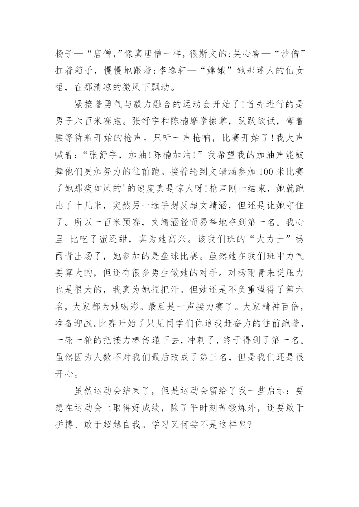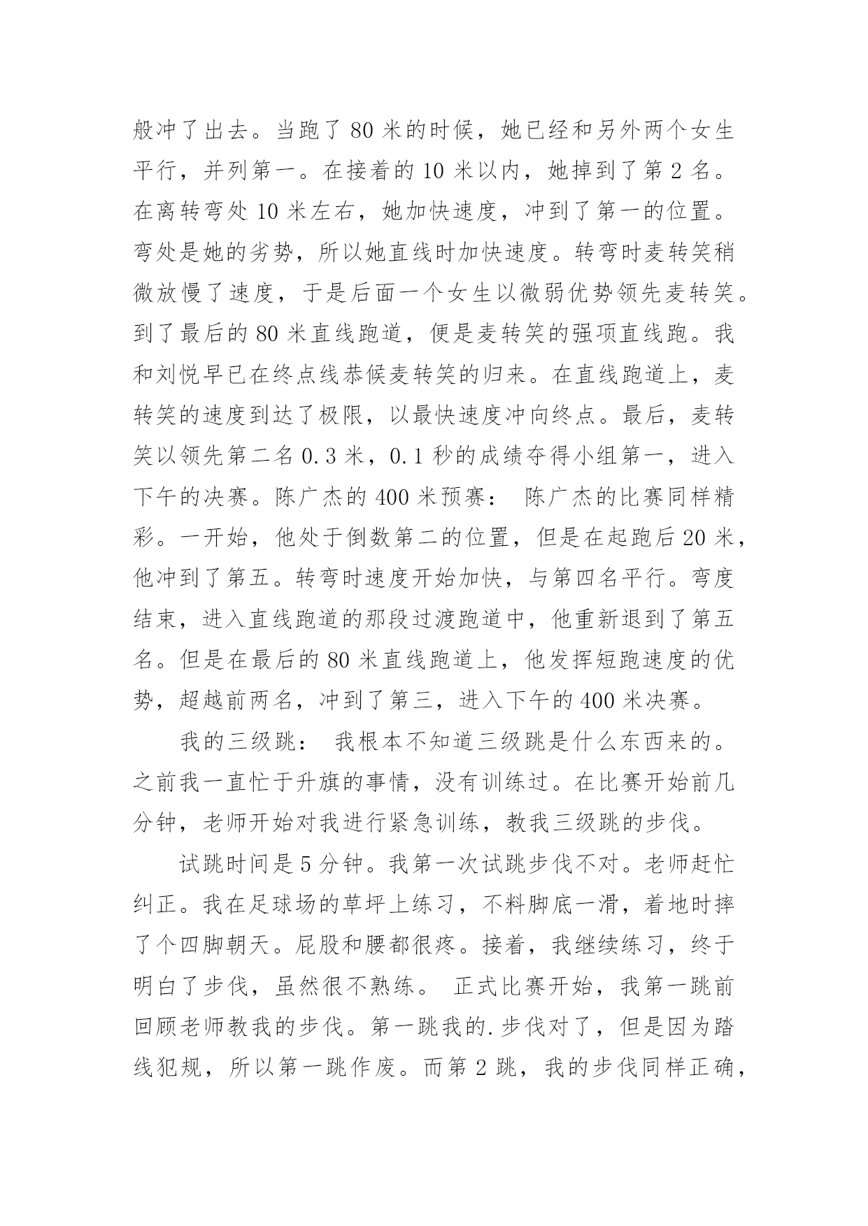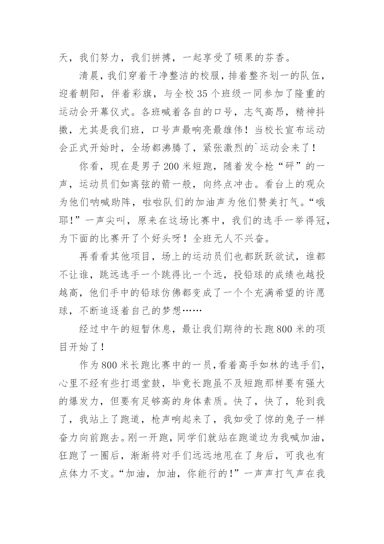 初一运动会作文在生活、工作和学习中,许多人都有过写作文的经历,对作文都不陌生吧,写作文是培养人们的观察力、联想力、想象力、思考力和记忆力的重要手段。还是对作文一筹莫展吗?以下是小编整理的初一运动会作文10篇,希望能够帮助到大家。初一运动会作文篇1今天开运动会,大家都很激动,我们都希望我们班能得到第一名。运动会开始了,铃声一响,老师就叫我们出去站队,我们都是穿着校服戴着红领巾。先是一、二年级比赛,然后才是三、四年级。等到广播说三四班请走到操场上时,我们按着队形走向操场,广播体操音乐响起,大家开始做操,有些动作很难,我以前学好了,所以这些动作变得很简单。操做完了,大家从激动变成平静,我们走向教室的时候,心里在想:希望我们班能得到第一名。这次运动会,我永远也忘不掉,后来学校说我们班得了第三名,以后我会更努力。初一运动会作文篇2“加油!加油!”呐喊声一浪高过一浪,在这丹桂飘香的金秋十月,我们迎来了欢快精彩的趣味田径运动会。在这天,我们努力,我们拼搏,一起享受了硕果的芬香。清晨,我们穿着干净整洁的校服,排着整齐划一的队伍,迎着朝阳,伴着彩旗,与全校35个班级一同参加了隆重的运动会开幕仪式。各班喊着各自的口号,志气高昂,精神抖擞,尤其是我们班,口号声最响亮最雄伟!当校长宣布运动会正式开始时,全场都沸腾了,紧张激烈的`运动会来了!你看,现在是男子200米短跑,随着发令枪“砰”的一声,运动员们如离弦的箭一般,向终点冲击。看台上的观众为他们呐喊助阵,啦啦队们的加油声为他们赞美打气。“哦耶!”一声尖叫,原来在这场比赛中,我们的选手一举得冠,为下面的比赛开了个好头呀!全班无人不兴奋。再看看其他项目,场上的运动员们也都跃跃欲试,谁都不让谁,跳远选手一个跳得比一个远,投铅球的成绩也越投越高,他们手中的铅球仿佛都变成了一个个充满希望的许愿球,不断追逐着自己的梦想……经过中午的短暂休息,最让我们期待的长跑800米的项目开始了!作为800米长跑比赛中的一员,看着高手如林的选手们,心里不经有些打退堂鼓,毕竟长跑虽不及短跑那样要有强大的爆发力,但要有足够高的身体素质。快了,快了,轮到我了,我站上了跑道,枪声响起来了,我如受了惊的兔子一样奋力向前跑去。刚一开跑,同学们就站在跑道边为我喊加油,狂跑了一圈后,渐渐将对手们远远地甩在了身后,可我也有点体力不支。“加油,加油,你能行的!”一声声打气声在我耳边响起,我转头一看,哦,是他们,我的同学和老师。其实,我这时才发现他们一直在赛道内陪着我一起跑。或许是看出我的不适了吧,他们为我加油,鼓励,我顿时觉得轻松了许多,因为,有他们。两圈了,同学们依然跟在我后面跑,我知道,他们比我更累,可却一直不停的喊加油,我越跑越带劲儿,因为有他们的陪伴。“耶!又有了一个第一!”一声清脆的兴奋声响起,我以第一名的好成绩冲过了终点,不,应该是我们。因为是他们的慰问与陪伴换来的第一啊!所以,再累也值得。最后,我们以总分50多分赢得了这次运动会年级第一!这里有我们团结的精神,有我们拼搏的汗水,有我们青春的活力!因为有我们,比赛才更加辉煌。初一运动会作文篇3今天,一年一度的运动会终于来到了。那天,晴空万里,我们个个都很兴奋!到了那里,就要开幕式了,因为服装已经穿好了,接下来就只要换鞋子了,我手忙脚乱地换好了鞋子,准备去表演。我们班代表的国家是蒙古国,二(2)班表演好了之后,就是我们了,我们整齐地走上台,做了最精彩的表演。开幕式过后,就是广播操比赛了。这天太阳高照,太热了!热得我们直喝水。虽然很热,可我还是认真地做了每一个动作。最后,紧张而又激烈的接力跑就要开始了。要跑的同学屏住呼吸,全神贯注地在起跑线上做好了起跑前的'一切准备。“预备—跑!”地一声,顿时打破了此时的宁静。那四位同学都像一匹匹奔跑的小骏马,飞快地跃出了起跑线。当快要轮到我跑的时候,我的心几乎都要跳到嗓子眼儿里去了,终于轮到我了,我屏住呼吸,一下子冲了过去。可是最后我们还是得了最后一名。但是,没关系,因为我们大家努力了呀!反正明年还会有接力跑的。通过这次运动会,我知道了团结的力量有多大。初一运动会作文篇426日,就只剩下麦转笑和陈广杰的400米预决赛,我的三级跳远,薛群英的80米跨栏和女子全能铅球,叶晓聪,胡婉华,林敏雯的60米短跑。早上是麦转笑和陈广杰的400米预赛,我的三级跳,80米跨栏,全能铅球,60米短跑。陈广杰以第2组第3名进入下午的决赛。薛群英的80米跨栏第4,胡婉华以第2组第3进入决赛,林敏雯在60米短跑中,输了给舍长,第二组第四名,又一次与决赛权擦肩而过。叶晓聪60米战败。麦转笑以第二组第一名顺利进入决赛,我的三级跳远夺得冠军。麦转笑的400米预赛:本来麦转笑是报了200米和100米短跑的,但是我自作主张替她多报了一项400米和跳远,没想到她在我主张的两项上都取得了好