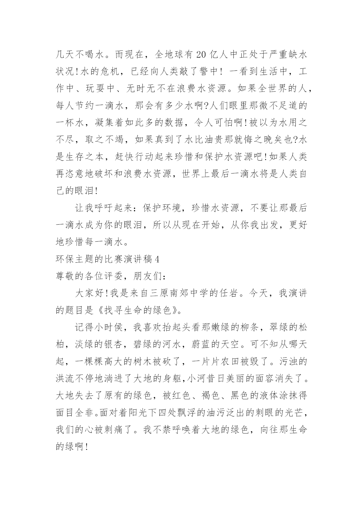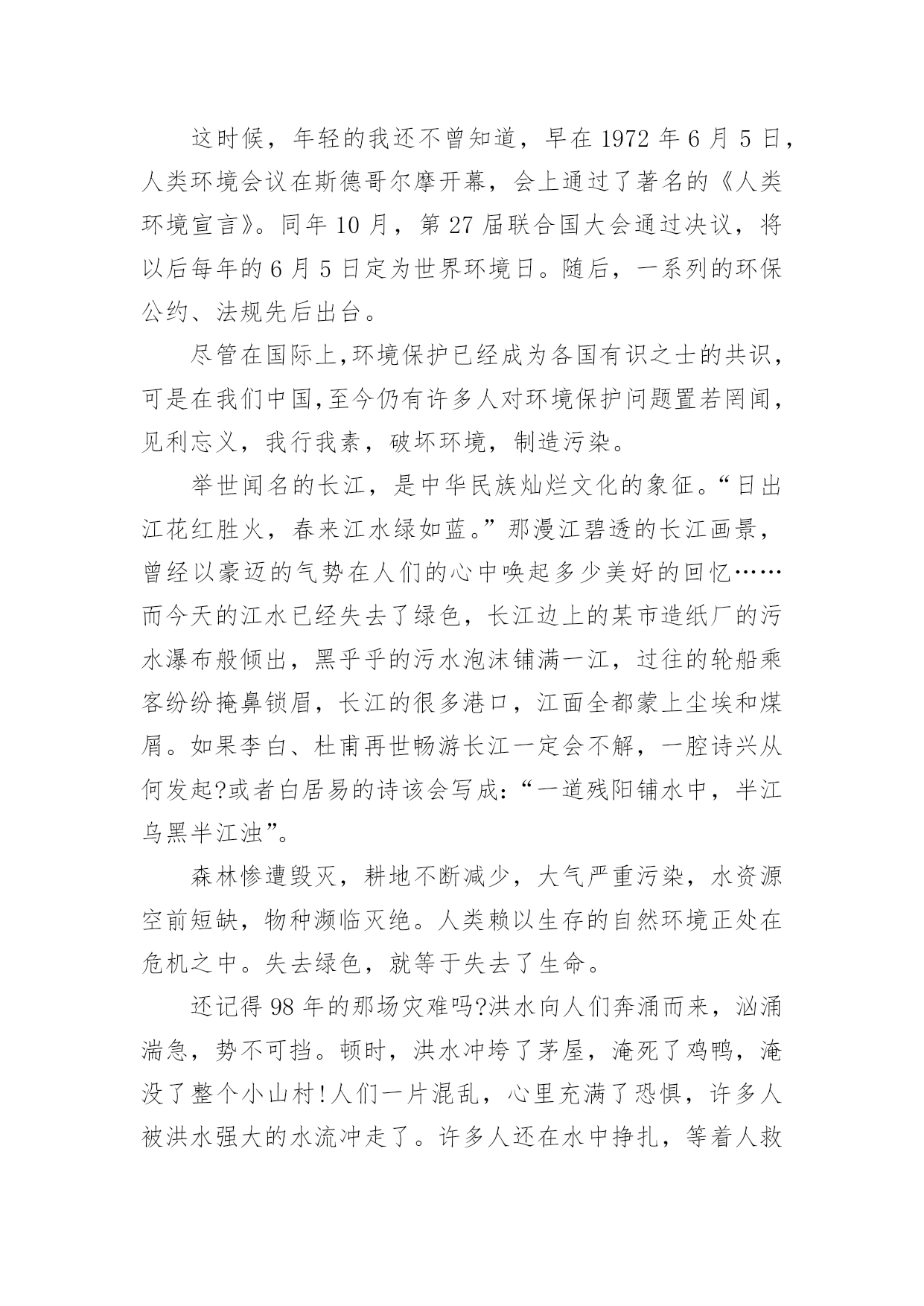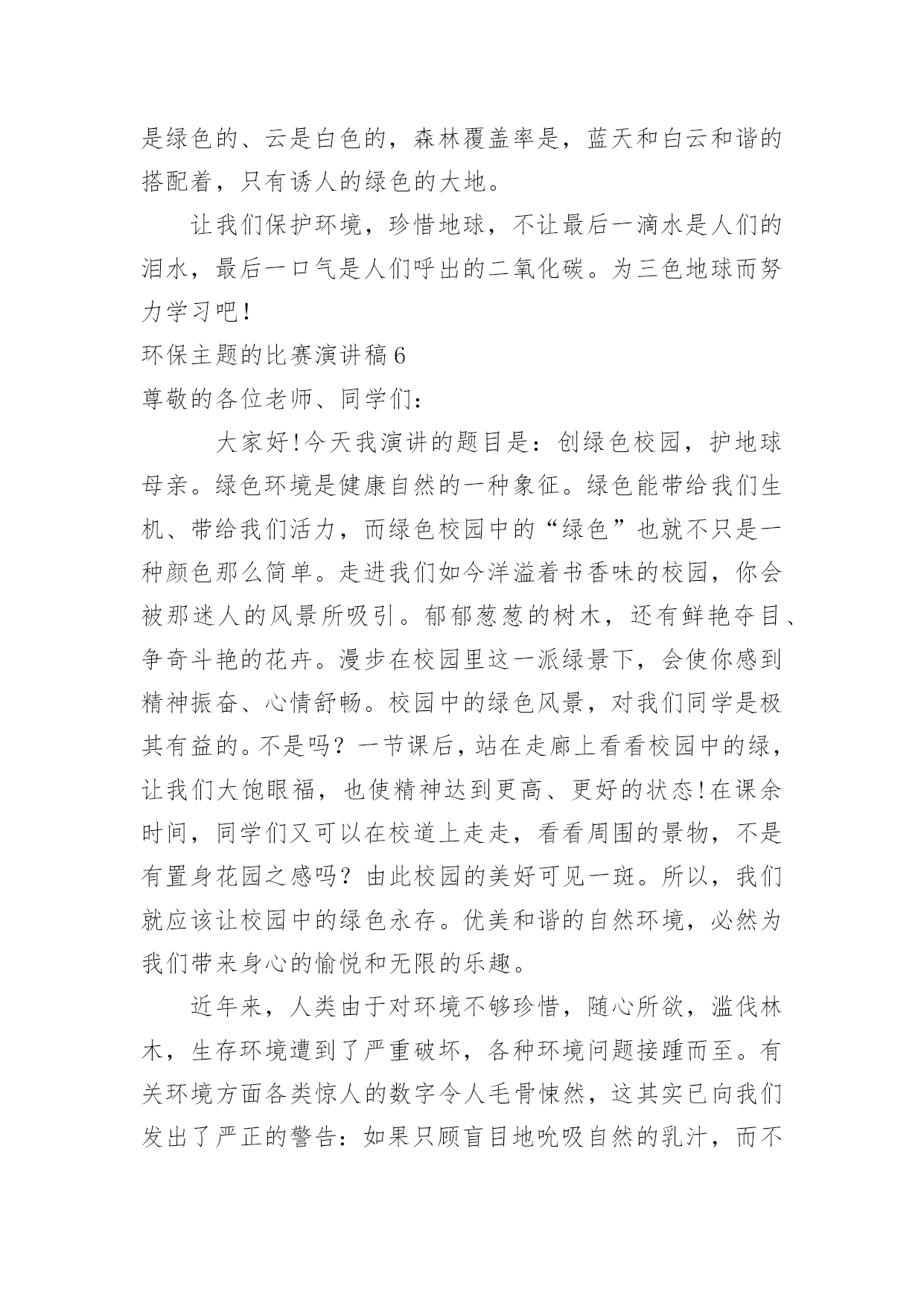 环保主题的比赛演讲稿环保主题的比赛演讲稿7篇好的演讲稿可以引导听众,使听众能更好地理解演讲的内容。在充满活力,日益开放的今天,越来越多地方需要用到演讲稿,写起演讲稿来就毫无头绪?以下是小编帮大家整理的环保主题的比赛演讲稿,仅供参考,大家一起来看看吧。环保主题的比赛演讲稿1尊敬的老师、亲爱的同学们:大家上午好!今天,我演讲的题目是:《保护环境,从我做起》。亲爱的同学们,当你踏着晨光走进我们花园般的校园时,当你坐在干净整洁的教室里学习时,你是否想到老师、同学们为此的辛勤付出?我们都渴望校园中能有郁郁葱葱的草地,都期盼在整洁干净的环境中学习、玩耍,都希望在舒适温馨的宿舍里进入梦乡。可是却有同学不懂得珍惜这些美好的事物。请同学们放眼校园仔细看看——那洁白的墙壁被打上了鞋印、球印;桌椅上留着乱涂乱画的痕迹;水龙头开着,让水肆意的流失;美丽的草坪、花圃上留着无情的脚印;塑料袋、包装盒、果皮纸屑扔得满地都是,在其他同学午晚休的时候,宿舍楼内外高声的喧哗,打破了这一片宁静。这些现象与我们美丽、文明、和谐的校园多么不协调!我们崇尚文明,我们都需要生活在干净、整洁、美丽的环境中,然而,为什么我们总把打扫、维护的希望寄托在别人身上?为什么总是毫不怜惜的践踏这片宁静与美丽?为什么总是逃脱作为板中一份子的责任?板桥中学就是我们的家,我们将在这里迈出人生的一步步。每位同学都是校园里的一员,都是这所学校的主人,都有维护校园环境的义务和责任。这是我们逃脱不了的,也是我们必须要做的。在享受这片宁静而安详的乐土时,我们必然要守卫它,让它永远保持这份特有的生机和魅力。同学们,立即行动起来吧!一片纸,我们捡起;一滴水,我们节约;一堆垃圾,我们打扫,爱一棵小树苗,保护一只小青蛙。为了我们的`校园,做我们能够做的一切。“勿以善小而不为,勿以恶小而为之”。为此我向板中全体同学呼吁:创建清洁、文明的校园,需要你,需要我,需要我们大家共同的努力。让我们积极行动起来!让我们从现在做起,从身边的小事做起,加强自我约束,相互监督,争做保护校园环境的小卫士。让我们承诺——爱我板中校园,让母校绿色永远蓬勃,让板桥中学成为我们学习的乐园,我们美丽的家。我的演讲完了,谢谢大家!环保主题的比赛演讲稿2尊敬的老师,亲爱的同学们:早上好!我国旗下讲话的题目是“爱绿护绿,从我做起”。同学们,你们知道3月12日是什么节日吗?同学们说的很对,是植树节。那么为什么植树节在春天的三月呢?这是因为三月是万物生长的最好的季节,这个时候春光明媚,水分充足,是种植花草树木最好的日子。所以,国家把每年的3月12日定为“植树节”,以号召全国人民积极参与到植树种草行动中来。喜欢看书的同学都知道,树木和绿地是一个天然的蓄水库,是一个天然的氧吧,能保持水土,让它不流失,能美化我们生存的环境。有了树,才会有和谐美丽的大自然;有了树,才有清爽、新鲜的空气。大家可以想象一下,如果大地没有了绿色,世界将会变成什么样?可能是一片沙漠,可能就没有了人类。98年的长江洪水,08年的南方雪灾,首都北京连年的沙尘暴天气和水资源的日益缺乏,都是因为环境问题。人类对大自然无休止破坏的最终结果就是遭受大自然的惩罚。可见,保护环境是多么的重要呀。下面,让我们将视线投向我们熟悉的校园吧!操场上茂盛的大树,花坛里可爱的小草让我们黄龙小学的校园时时处处都洋溢着青春的气息,传播着美丽的信息。在这如风景如画的校园中,作为主人的.我们该做些什么呢?那就是爱绿、护绿!学校给我们营造了一个优美舒适的学习和生活环境。校园里的一草一木,一花一叶都是我们的好朋友,它们每天默默的陪伴着我们。同学们,一片叶子也会投下一丝绿荫,一棵小草也能唤起春的气息,让我们像爱护自己的身体一样,珍惜每一片绿,爱护校内外每一棵树。下面,请允许我以一名环保卫士的名义向全校师生发出“爱绿护绿”的倡议:1、爱护身边的一草一木,不践踏草坪,不攀折花草树木。2、弯弯腰随手捡起地上的垃圾,养成良好的卫生习惯。3、少使用一次性的木筷。4、争做一个爱绿护绿的小天使,劝阻破坏环境的不文明行为。同学们,我们是二十一世纪的主人,为自己创造一个舒适美好的生存空间是我们义不容辞的责任!加入“爱绿护绿”行列,做绿化美化环境的有心人。建设绿色家园,我们今天播下一份绿色种子,明天收获一片蓝天绿地!我相信,“爱绿护绿”有了我们每一个人的积极参与,我们的家园将更加美丽,我们的天将更蓝、水将更清、山将更美!“爱绿护绿”,让我们每一个人都从小事做起,从现在做起,从我做起吧!我的演讲到此结束,谢谢大家!环保主题的比赛演讲稿3保护环境,人人有责!珍惜水资源也是保护环境的重要举措。水是人类及一切生物最可求的东西,它曾滋润每一土地,让树木茁壮成长,给鸟儿们提供了一个温暧的家,为人们撑起一片儿阴凉,也曾让芳草萋萋,鲜花怒放,曾经更是让庄