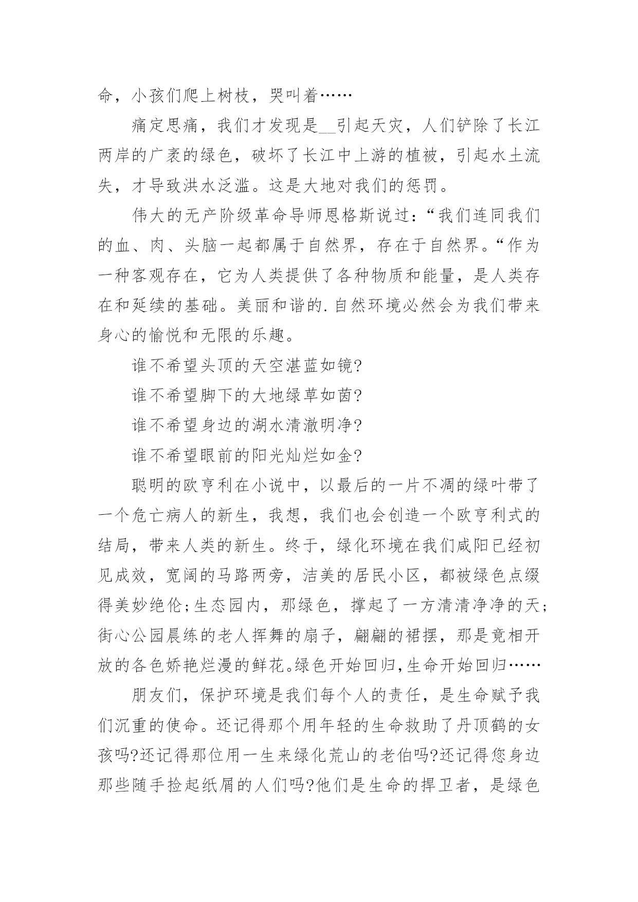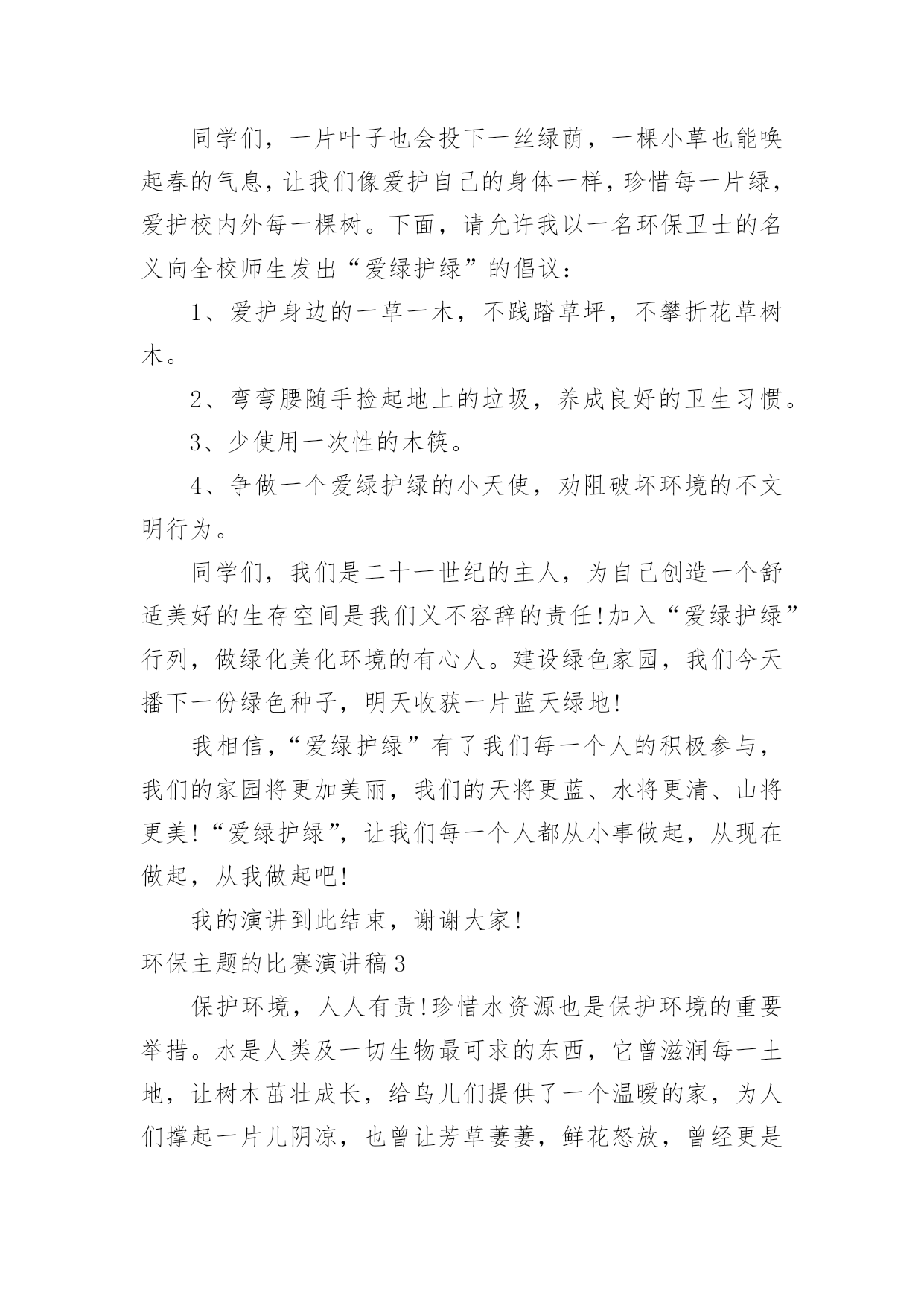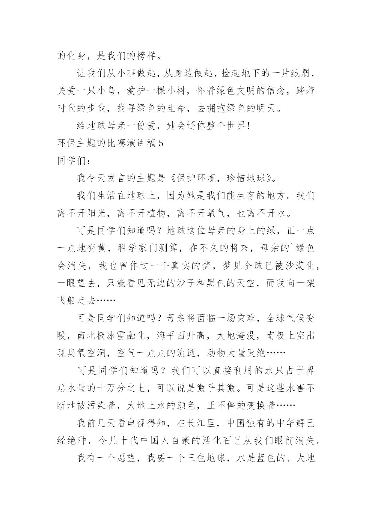 环保主题的比赛演讲稿环保主题的比赛演讲稿7篇好的演讲稿可以引导听众,使听众能更好地理解演讲的内容。在充满活力,日益开放的今天,越来越多地方需要用到演讲稿,写起演讲稿来就毫无头绪?以下是小编帮大家整理的环保主题的比赛演讲稿,仅供参考,大家一起来看看吧。环保主题的比赛演讲稿1尊敬的老师、亲爱的同学们:大家上午好!今天,我演讲的题目是:《保护环境,从我做起》。亲爱的同学们,当你踏着晨光走进我们花园般的校园时,当你坐在干净整洁的教室里学习时,你是否想到老师、同学们为此的辛勤付出?我们都渴望校园中能有郁郁葱葱的草地,都期盼在整洁干净的环境中学习、玩耍,都希望在舒适温馨的宿舍里进入梦乡。可是却有同学不懂得珍惜这些美好的事物。请同学们放眼校园仔细看看——那洁白的墙壁被打上了鞋印、球印;桌椅上留着乱涂乱画的痕迹;水龙头开着,让水肆意的流失;美丽的草坪、花圃上留着无情的脚印;塑料袋、包装盒、果皮纸屑扔得满地都是,在其他同学午晚休的时候,宿舍楼内外高声的喧哗,打破了这一片宁静。这些现象与我们美丽、文明、和谐的校园多么不协调!我们崇尚文明,我们都需要生活在干净、整洁、美丽的环境中,然而,为什么我们总把打扫、维护的希望寄托在别人身上?为什么总是毫不怜惜的践踏这片宁静与美丽?为什么总是逃脱作为板中一份子的责任?板桥中学就是我们的家,我们将在这里迈出人生的一步步。每位同学都是校园里的一员,都是这所学校的主人,都有维护校园环境的义务和责任。这是我们逃脱不了的,也是我们必须要做的。在享受这片宁静而安详的乐土时,我们必然要守卫它,让它永远保持这份特有的生机和魅力。同学们,立即行动起来吧!一片纸,我们捡起;一滴水,我们节约;一堆垃圾,我们打扫,爱一棵小树苗,保护一只小青蛙。为了我们的`校园,做我们能够做的一切。“勿以善小而不为,勿以恶小而为之”。为此我向板中全体同学呼吁:创建清洁、文明的校园,需要你,需要我,需要我们大家共同的努力。让我们积极行动起来!让我们从现在做起,从身边的小事做起,加强自我约束,相互监督,争做保护校园环境的小卫士。让我们承诺——爱我板中校园,让母校绿色永远蓬勃,让板桥中学成为我们学习的乐园,我们美丽的家。我的演讲完了,谢谢大家!环保主题的比赛演讲稿2尊敬的老师,亲爱的同学们:早上好!我国旗下讲话的题目是“爱绿护绿,从我做起”。同学们,你们知道3月12日是什么节日吗?同学们说的很对,是植树节。那么为什么植树节在春天的三月呢?这是因为三月是万物生长的最好的季节,这个时候春光明媚,水分充足,是种植花草树木最好的日子。所以,国家把每年的3月12日定为“植树节”,以号召全国人民积极参与到植树种草行动中来。喜欢看书的同学都知道,树木和绿地是一个天然的蓄水库,是一个天然的氧吧,能保持水土,让它不流失,能美化我们生存的环境。有了树,才会有和谐美丽的大自然;有了树,才有清爽、新鲜的空气。大家可以想象一下,如果大地没有了绿色,世界将会变成什么样?可能是一片沙漠,可能就没有了人类。98年的长江洪水,08年的南方雪灾,首都北京连年的沙尘暴天气和水资源的日益缺乏,都是因为环境问题。人类对大自然无休止破坏的最终结果就是遭受大自然的惩罚。可见,保护环境是多么的重要呀。下面,让我们将视线投向我们熟悉的校园吧!操场上茂盛的大树,花坛里可爱的小草让我们黄龙小学的校园时时处处都洋溢着青春的气息,传播着美丽的信息。在这如风景如画的校园中,作为主人的.我们该做些什么呢?那就是爱绿、护绿!学校给我们营造了一个优美舒适的学习和生活环境。校园里的一草一木,一花一叶都是我们的好朋友,它们每天默默的陪伴着我们。同学们,一片叶子也会投下一丝绿荫,一棵小草也能唤起春的气息,让我们像爱护自己的身体一样,珍惜每一片绿,爱护校内外每一棵树。下面,请允许我以一名环保卫士的名义向全校师生发出“爱绿护绿”的倡议:1、爱护身边的一草一木,不践踏草坪,不攀折花草树木。2、弯弯腰随手捡起地上的垃圾,养成良好的卫生习惯。3、少使用一次性的木筷。4、争做一个爱绿护绿的小天使,劝阻破坏环境的不文明行为。同学们,我们是二十一世纪的主人,为自己创造一个舒适美好的生存空间是我们义不容辞的责任!加入“爱绿护绿”行列,做绿化美化环境的有心人。建设绿色家园,我们今天播下一份绿色种子,明天收获一片蓝天绿地!我相信,“爱绿护绿”有了我们每一个人的积极参与,我们的家园将更加美丽,我们的天将更蓝、水将更清、山将更美!“爱绿护绿”,让我们每一个人都从小事做起,从现在做起,从我做起吧!我的演讲到此结束,谢谢大家!环保主题的比赛演讲稿3保护环境,人人有责!珍惜水资源也是保护环境的重要举措。水是人类及一切生物最可求的东西,它曾滋润每一土地,让树木茁壮成长,给鸟儿们提供了一个温暧的家,为人们撑起一片儿阴凉,也曾让芳草萋萋,鲜花怒放,曾经更是让庄