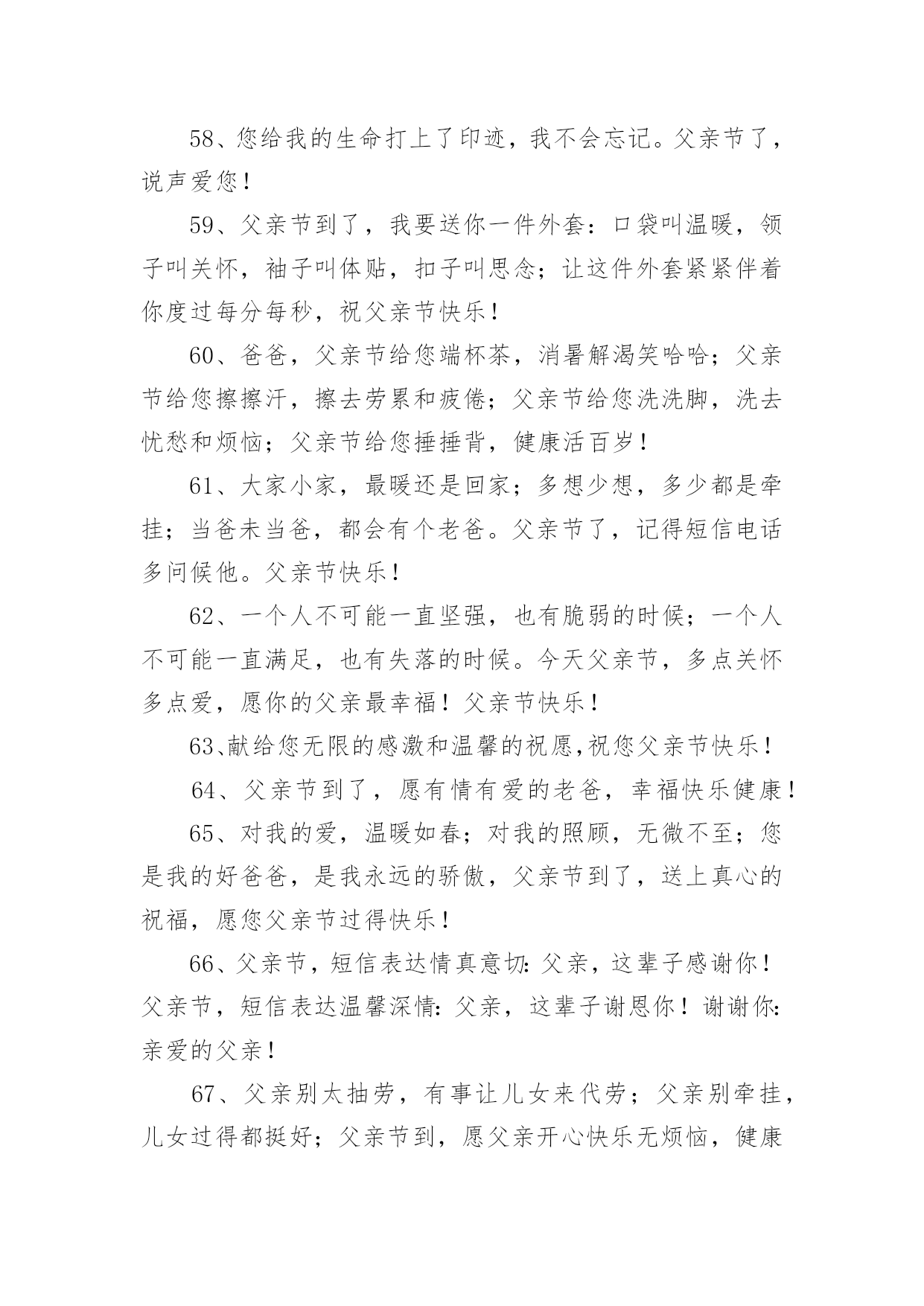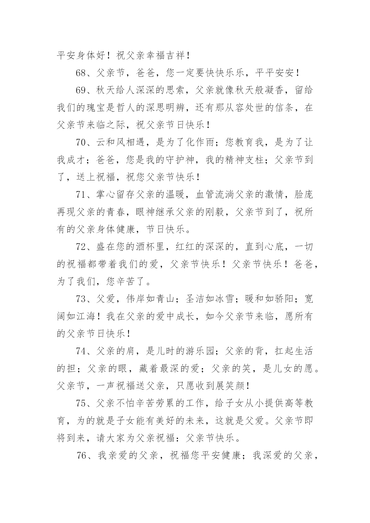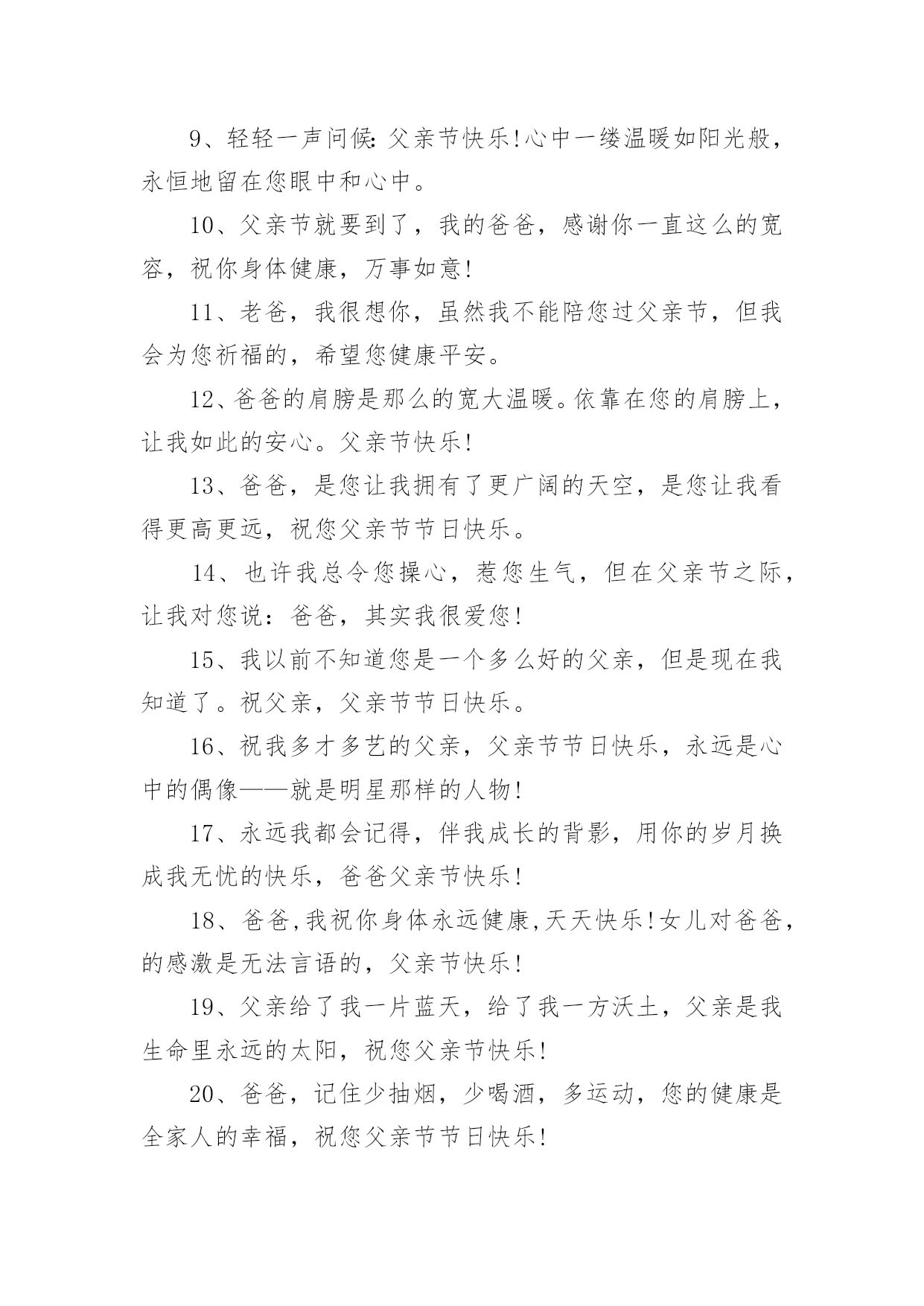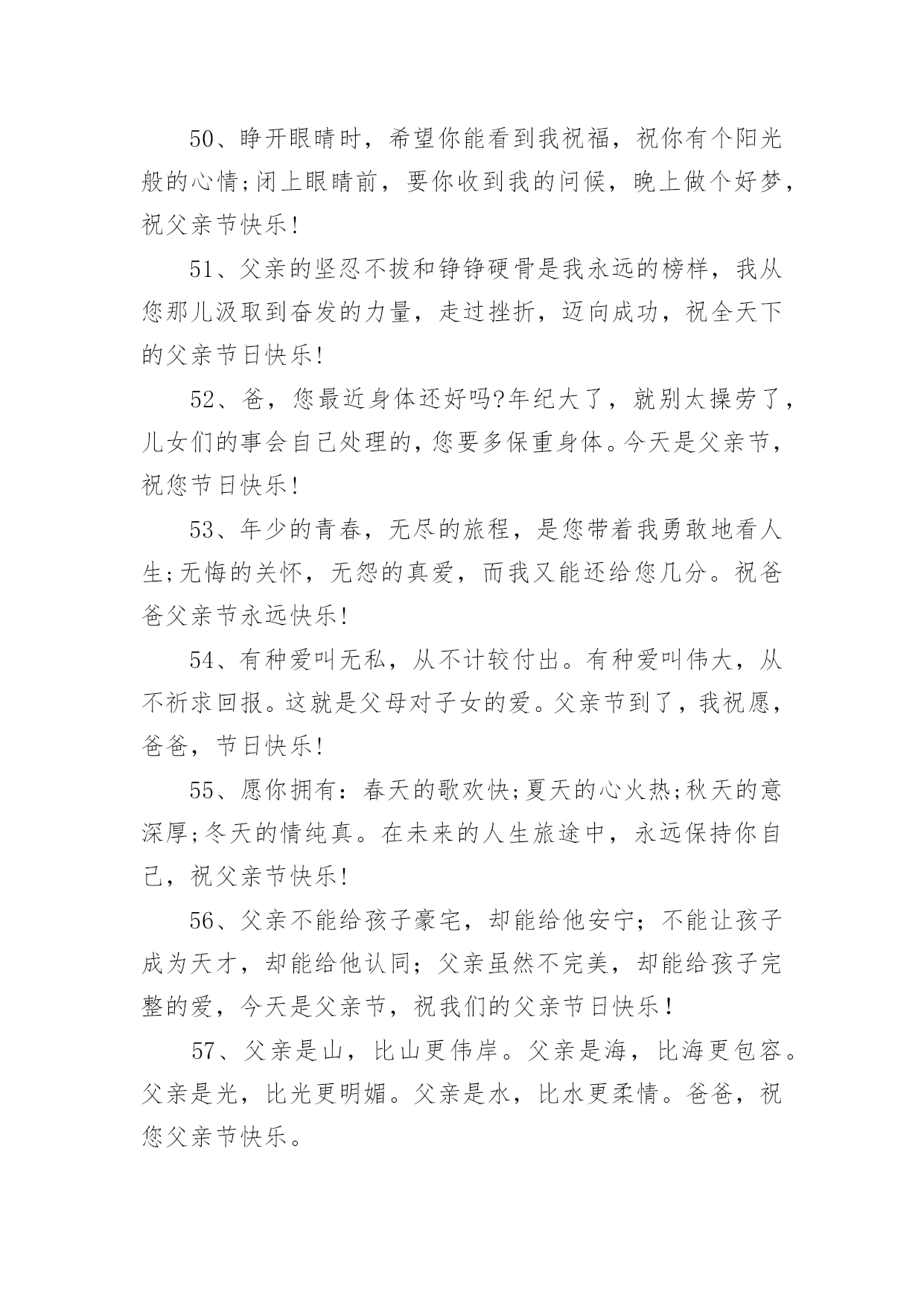 父亲节宣传海报加文案父亲节宣传海报加文案(精选280句)随着社交网络开始流行,越来越多人热衷于在社交平台上发布文案,文案用于分享自己的生活态度和人生感悟。那么你有真正了解过文案吗?以下是小编整理的父亲节宣传海报加文案(精选280句),供大家参考借鉴,希望可以帮助到有需要的朋友。1、爸爸,您辛苦了,今儿个是父亲节,你好好歇歇吧,女儿在远方为您祝福。2、爸爸,您是我心中的骄傲,我愿意生生世世做您的女儿,祝您父亲节快乐!3、您的付出您的祈盼,只为我们的成长。谢谢您,父亲,祝您父亲节节日快乐!4、父爱,伟岸如青山;圣洁如冰雪;温暖如骄阳;宽广如江海!老爸,父亲节快乐!5、父亲节就要到了,父亲不需要用多好的语言来赞美他,像一头任劳任怨的牛!6、父亲节将至,父爱是一泓清泉,让你的情感即使蒙上岁月的风尘依然纯洁明净。7、爸爸,献上我的谢意,为了这么多年来您对我付出的耐心和爱心。父亲节快乐!8、老爸,父亲节快到了,我特为你准备了一份礼物,但你先给我报销报销费用吧。9、轻轻一声问候:父亲节快乐!心中一缕温暖如阳光般,永恒地留在您眼中和心中。10、父亲节就要到了,我的爸爸,感谢你一直这么的宽容,祝你身体健康,万事如意!11、老爸,我很想你,虽然我不能陪您过父亲节,但我会为您祈福的,希望您健康平安。12、爸爸的肩膀是那么的宽大温暖。依靠在您的肩膀上,让我如此的安心。父亲节快乐!13、爸爸,是您让我拥有了更广阔的天空,是您让我看得更高更远,祝您父亲节节日快乐。14、也许我总令您操心,惹您生气,但在父亲节之际,让我对您说:爸爸,其实我很爱您!15、我以前不知道您是一个多么好的父亲,但是现在我知道了。祝父亲,父亲节节日快乐。16、祝我多才多艺的父亲,父亲节节日快乐,永远是心中的偶像——就是明星那样的人物!17、永远我都会记得,伴我成长的背影,用你的岁月换成我无忧的快乐,爸爸父亲节快乐!18、爸爸,我祝你身体永远健康,天天快乐!女儿对爸爸,的感激是无法言语的,父亲节快乐!19、父亲给了我一片蓝天,给了我一方沃土,父亲是我生命里永远的太阳,祝您父亲节快乐!20、爸爸,记住少抽烟,少喝酒,多运动,您的健康是全家人的幸福,祝您父亲节节日快乐!21、您时时都有许多方法逗我开心,您总是最关心我的一个,父亲,我爱您!祝父亲节节日快乐!22、我在你的爱中成长,如今我长大了要用更多的爱来回报你,我最最亲爱的老爸,父亲节快乐!23、也许我总令您操心,惹您生气,但在今天---在父亲节之际,让我对您说:爸爸,其实我很爱您!24、在盯着父亲的眼睛瞧,觉得他那双笑眯眯的小眼睛也和夜空一样深邃神秘。祝爸爸,父亲节快乐!25、爸爸,您总是用最平淡最朴素方式去表达您的爱,但您的爱却足够我享用一辈子。祝您父亲节快乐!26、父亲节是一年一度您的日子,没有我在身边的时候希望也能快快乐乐过每一分每一秒。老爸,辛苦了!27、一首从小就开始唱而且百听不厌的歌曲:草鞋是船,爸爸是帆,伴我去启航,祝爸爸父亲节节日快乐!28、爸爸,您总是关怀着我,鼓励着我,引导着我!我希望您长命百岁,快乐安康。爸爸,祝您父亲节快乐!29、在我们的生命中,有种宝贵的东西叫做"父爱"我会永远怀念过去,怀念父亲对我的爱。祝您父亲节快乐!30、爸爸装扮成超人模样,一辈子都忘记了卸妆。爸爸,祝您父亲节快乐!31、父亲的教诲像一盏灯,为我照亮前程;父亲的关怀像一把伞,为我遮蔽风雨。父亲节到了,祝父亲节日快乐!32、父亲节就要到了,每当想起你我就无比得自豪,是你时刻在激励我不断奋进。在这个特殊的节日里我祝福你!33、爸:为了儿的人生您辛苦了大半辈子!今天是您的节日,儿想对您说:谢谢您,我最亲最爱的爸!父亲节快乐!34、献给您无限感激和温馨的祝愿,还有那许多回忆和深情的思念。因为您慈祥无比,难以言表,祝您父亲节快乐!!35、爸爸,今天是父亲节,节日快乐哦。固然,你有时很凶,但是我知道你是爱我的,是吗?在这里祝你快乐,健康!36、每一片树叶,每一根小草,都写满了我对您的爱,父亲,您坚实的臂膀,是我最温暖的依靠,祝您父亲节节日快乐!!37、爸:为了儿的人生您辛苦了大半辈子!今天是您的节日,儿想对您说:谢谢您,我最亲最爱的爸,祝您父亲节节日快乐!38、他是一棵苍天大树,为我们遮风挡雨,呵护我们健康成长。谢谢您,我最亲最爱的爸爸,祝您父亲节节日快乐!39、父爱如山,挺拔的身姿顶起家父爱如海,宽广的胸怀包容家父爱如川,涓涓细流滋润着家父亲节到了,祝父亲节日快乐!40、爸爸,我献给您无限感激和温馨的祝愿,还有那许多回忆和深情的思念。因为您慈祥无比,难以言表,祝您父亲节快乐!41、树叶代表快乐,我送你一片森林;滴水代表一个祝福,我送你一个东海;流星代表一份幸福,我送你一条银河,父亲节快乐!42、使你的父亲感到荣耀的莫过于你以最大的热诚继续你的学业