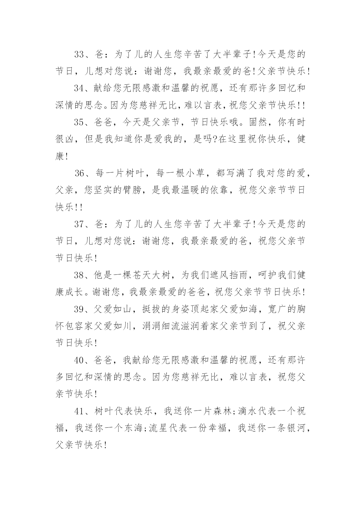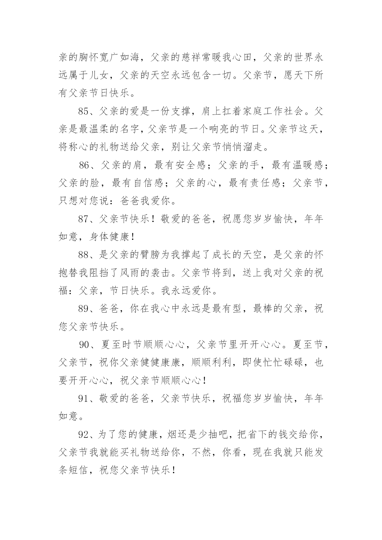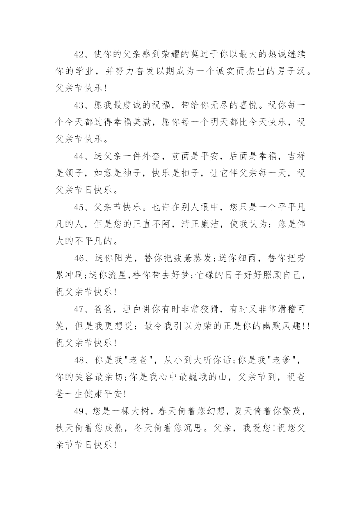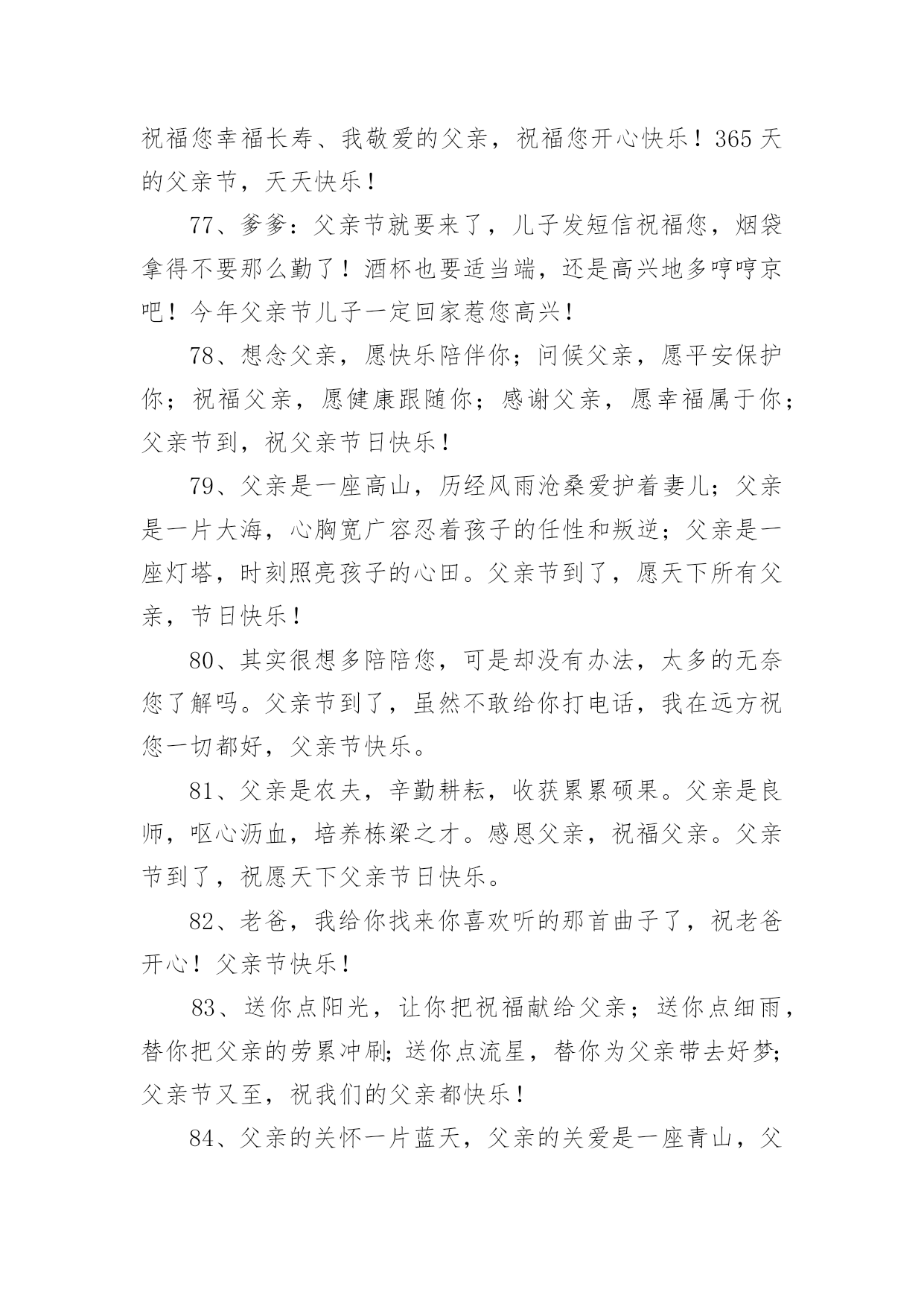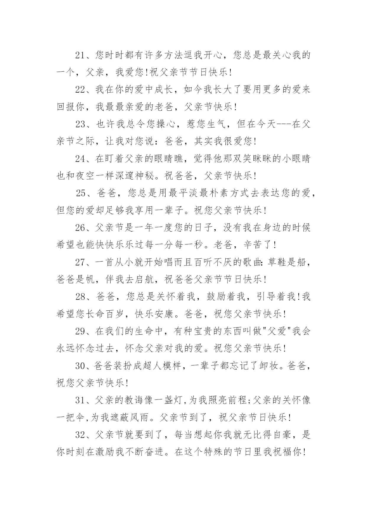 父亲节宣传海报加文案父亲节宣传海报加文案(精选280句)随着社交网络开始流行,越来越多人热衷于在社交平台上发布文案,文案用于分享自己的生活态度和人生感悟。那么你有真正了解过文案吗?以下是小编整理的父亲节宣传海报加文案(精选280句),供大家参考借鉴,希望可以帮助到有需要的朋友。1、爸爸,您辛苦了,今儿个是父亲节,你好好歇歇吧,女儿在远方为您祝福。2、爸爸,您是我心中的骄傲,我愿意生生世世做您的女儿,祝您父亲节快乐!3、您的付出您的祈盼,只为我们的成长。谢谢您,父亲,祝您父亲节节日快乐!4、父爱,伟岸如青山;圣洁如冰雪;温暖如骄阳;宽广如江海!老爸,父亲节快乐!5、父亲节就要到了,父亲不需要用多好的语言来赞美他,像一头任劳任怨的牛!6、父亲节将至,父爱是一泓清泉,让你的情感即使蒙上岁月的风尘依然纯洁明净。7、爸爸,献上我的谢意,为了这么多年来您对我付出的耐心和爱心。父亲节快乐!8、老爸,父亲节快到了,我特为你准备了一份礼物,但你先给我报销报销费用吧。9、轻轻一声问候:父亲节快乐!心中一缕温暖如阳光般,永恒地留在您眼中和心中。10、父亲节就要到了,我的爸爸,感谢你一直这么的宽容,祝你身体健康,万事如意!11、老爸,我很想你,虽然我不能陪您过父亲节,但我会为您祈福的,希望您健康平安。12、爸爸的肩膀是那么的宽大温暖。依靠在您的肩膀上,让我如此的安心。父亲节快乐!13、爸爸,是您让我拥有了更广阔的天空,是您让我看得更高更远,祝您父亲节节日快乐。14、也许我总令您操心,惹您生气,但在父亲节之际,让我对您说:爸爸,其实我很爱您!15、我以前不知道您是一个多么好的父亲,但是现在我知道了。祝父亲,父亲节节日快乐。16、祝我多才多艺的父亲,父亲节节日快乐,永远是心中的偶像——就是明星那样的人物!17、永远我都会记得,伴我成长的背影,用你的岁月换成我无忧的快乐,爸爸父亲节快乐!18、爸爸,我祝你身体永远健康,天天快乐!女儿对爸爸,的感激是无法言语的,父亲节快乐!19、父亲给了我一片蓝天,给了我一方沃土,父亲是我生命里永远的太阳,祝您父亲节快乐!20、爸爸,记住少抽烟,少喝酒,多运动,您的健康是全家人的幸福,祝您父亲节节日快乐!21、您时时都有许多方法逗我开心,您总是最关心我的一个,父亲,我爱您!祝父亲节节日快乐!22、我在你的爱中成长,如今我长大了要用更多的爱来回报你,我最最亲爱的老爸,父亲节快乐!23、也许我总令您操心,惹您生气,但在今天---在父亲节之际,让我对您说:爸爸,其实我很爱您!24、在盯着父亲的眼睛瞧,觉得他那双笑眯眯的小眼睛也和夜空一样深邃神秘。祝爸爸,父亲节快乐!25、爸爸,您总是用最平淡最朴素方式去表达您的爱,但您的爱却足够我享用一辈子。祝您父亲节快乐!26、父亲节是一年一度您的日子,没有我在身边的时候希望也能快快乐乐过每一分每一秒。老爸,辛苦了!27、一首从小就开始唱而且百听不厌的歌曲:草鞋是船,爸爸是帆,伴我去启航,祝爸爸父亲节节日快乐!28、爸爸,您总是关怀着我,鼓励着我,引导着我!我希望您长命百岁,快乐安康。爸爸,祝您父亲节快乐!29、在我们的生命中,有种宝贵的东西叫做"父爱"我会永远怀念过去,怀念父亲对我的爱。祝您父亲节快乐!30、爸爸装扮成超人模样,一辈子都忘记了卸妆。爸爸,祝您父亲节快乐!31、父亲的教诲像一盏灯,为我照亮前程;父亲的关怀像一把伞,为我遮蔽风雨。父亲节到了,祝父亲节日快乐!32、父亲节就要到了,每当想起你我就无比得自豪,是你时刻在激励我不断奋进。在这个特殊的节日里我祝福你!33、爸:为了儿的人生您辛苦了大半辈子!今天是您的节日,儿想对您说:谢谢您,我最亲最爱的爸!父亲节快乐!34、献给您无限感激和温馨的祝愿,还有那许多回忆和深情的思念。因为您慈祥无比,难以言表,祝您父亲节快乐!!35、爸爸,今天是父亲节,节日快乐哦。固然,你有时很凶,但是我知道你是爱我的,是吗?在这里祝你快乐,健康!36、每一片树叶,每一根小草,都写满了我对您的爱,父亲,您坚实的臂膀,是我最温暖的依靠,祝您父亲节节日快乐!!37、爸:为了儿的人生您辛苦了大半辈子!今天是您的节日,儿想对您说:谢谢您,我最亲最爱的爸,祝您父亲节节日快乐!38、他是一棵苍天大树,为我们遮风挡雨,呵护我们健康成长。谢谢您,我最亲最爱的爸爸,祝您父亲节节日快乐!39、父爱如山,挺拔的身姿顶起家父爱如海,宽广的胸怀包容家父爱如川,涓涓细流滋润着家父亲节到了,祝父亲节日快乐!40、爸爸,我献给您无限感激和温馨的祝愿,还有那许多回忆和深情的思念。因为您慈祥无比,难以言表,祝您父亲节快乐!41、树叶代表快乐,我送你一片森林;滴水代表一个祝福,我送你一个东海;流星代表一份幸福,我送你一条银河,父亲节快乐!42、使你的父亲感到荣耀的莫过于你以最大的热诚继续你的学业