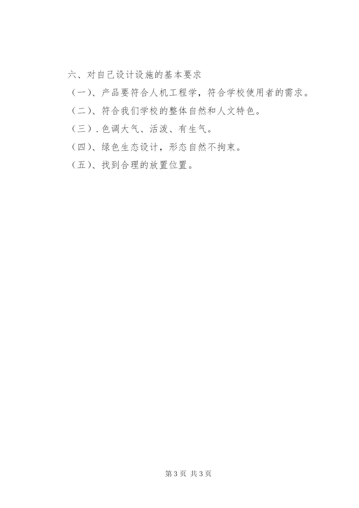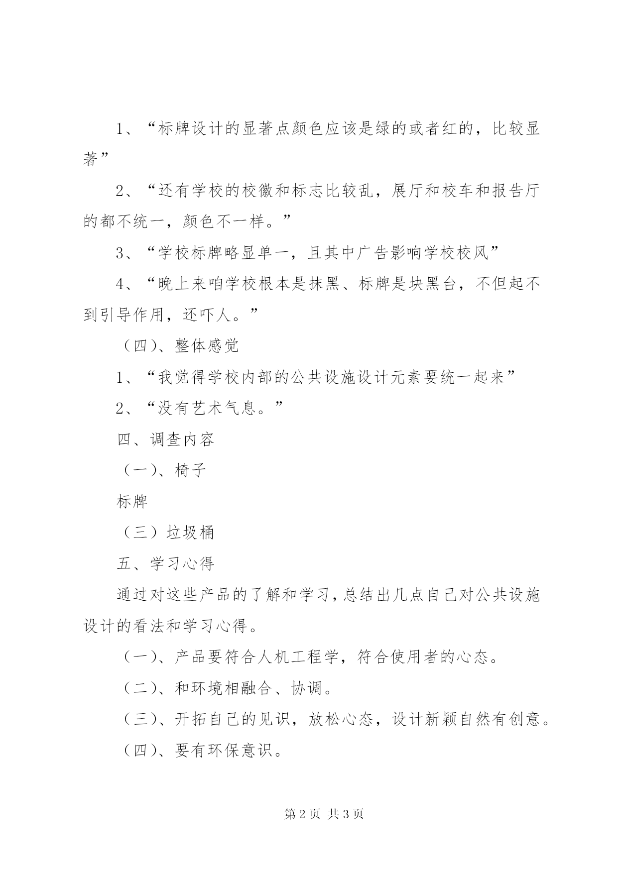第PAGE\*Arabic\*MERGEFORMAT3页共NUMPAGES\*MERGEFORMAT3页公共配套设施建设调研报告校园公共设施调研报告一、地点:兰州理工大学时间;2011.08.28二、调查对象:学校公共设施(椅子、标牌、垃圾筒、任何可以装饰校园的东西)三、答卷内容(一)、椅子1、“学校设施应该再多一点,至于颜色应该多是绿色的,至于材质,我想应该是一些环保的例如说是木头的”。2、“篮球场附近少椅子。”3、“椅子通常都很脏没法坐,”4、“长椅质量太差,被人随意摆放”5、“长椅数量太少一到晚上就被人占去几乎没人空位”(二)、垃圾桶1、“垃圾桶里的垃圾不能及时处理掉很难闻,应该设计成那种把垃圾丢进去之后就能处理掉的”2、“垃圾桶可以做出很多不同形状的、”3、“现在的垃圾桶都很普通跟其他的学校都一样突显不出我们艺术学校的风格”(三)、标牌1、“标牌设计的显著点颜色应该是绿的或者红的,比较显著”2、“还有学校的校徽和标志比较乱,展厅和校车和报告厅的都不统一,颜色不一样。”3、“学校标牌略显单一,且其中广告影响学校校风”4、“晚上来咱学校根本是抹黑、标牌是块黑台,不但起不到引导作用,还吓人。”(四)、整体感觉1、“我觉得学校内部的公共设施设计元素要统一起来”2、“没有艺术气息。”四、调查内容(一)、椅子标牌(三)垃圾桶五、学习心得通过对这些产品的了解和学习,总结出几点自己对公共设施设计的看法和学习心得。(一)、产品要符合人机工程学,符合使用者的心态。(二)、和环境相融合、协调。(三)、开拓自己的见识,放松心态,设计新颖自然有创意。(四)、要有环保意识。六、对自己设计设施的基本要求(一)、产品要符合人机工程学,符合学校使用者的需求。(二)、符合我们学校的整体自然和人文特色。(三).色调大气、活泼、有生气。(四)、绿色生态设计,形态自然不拘束。(五)、找到合理的放置位置。
