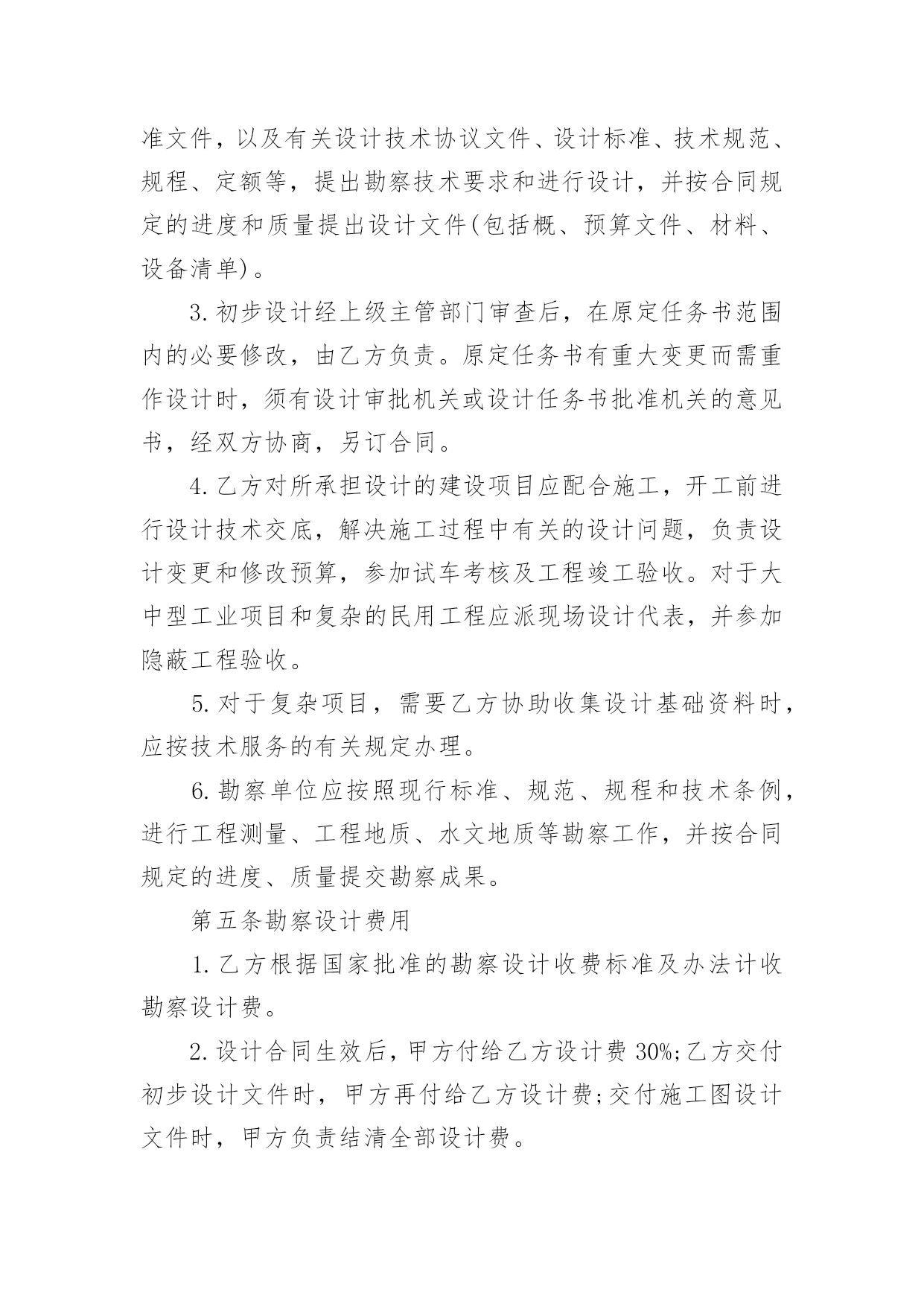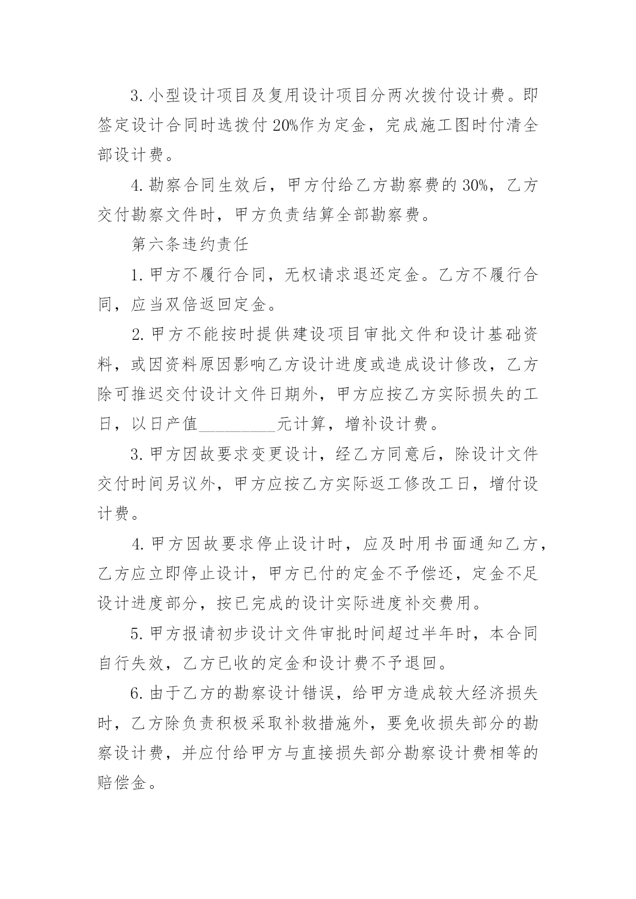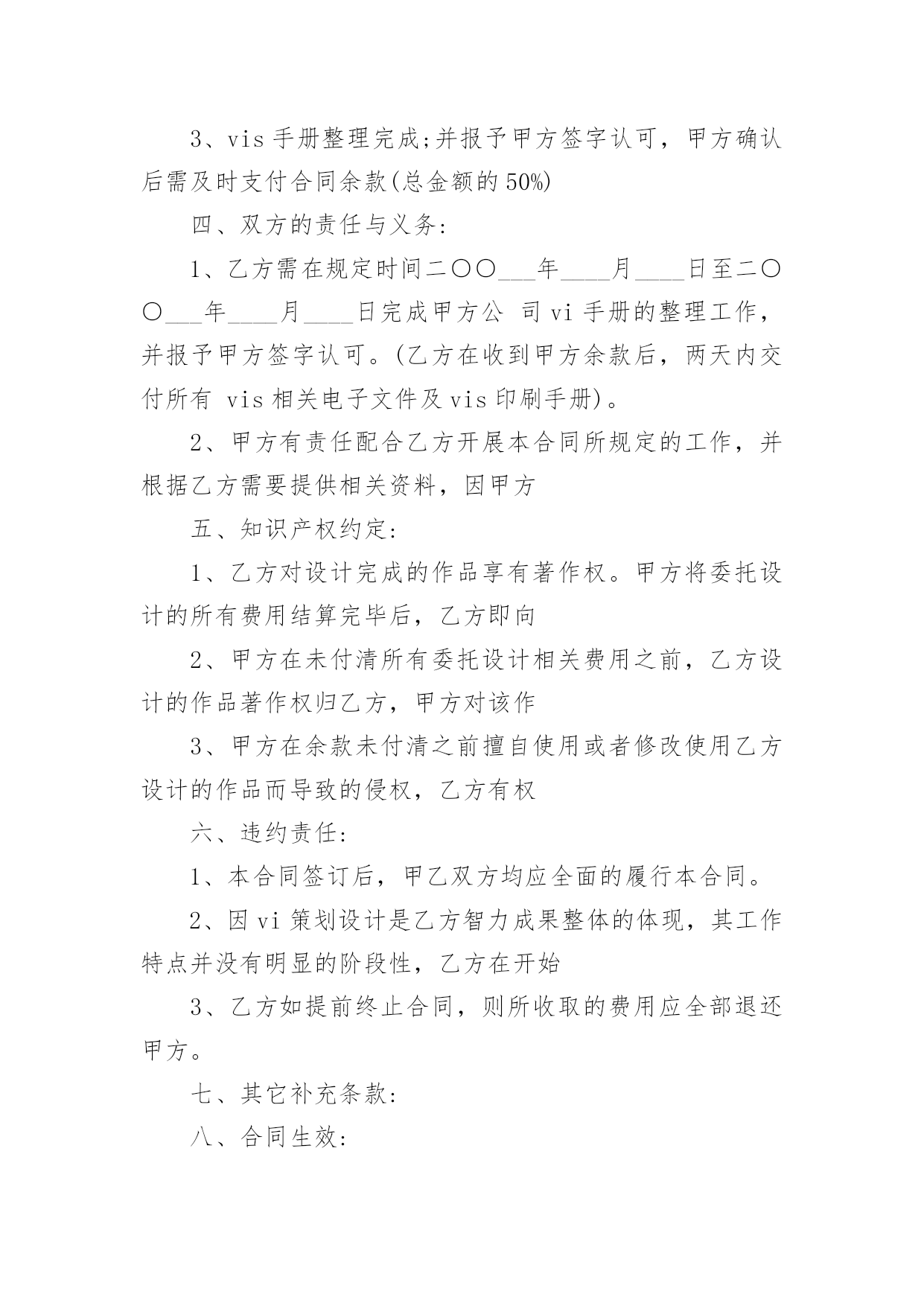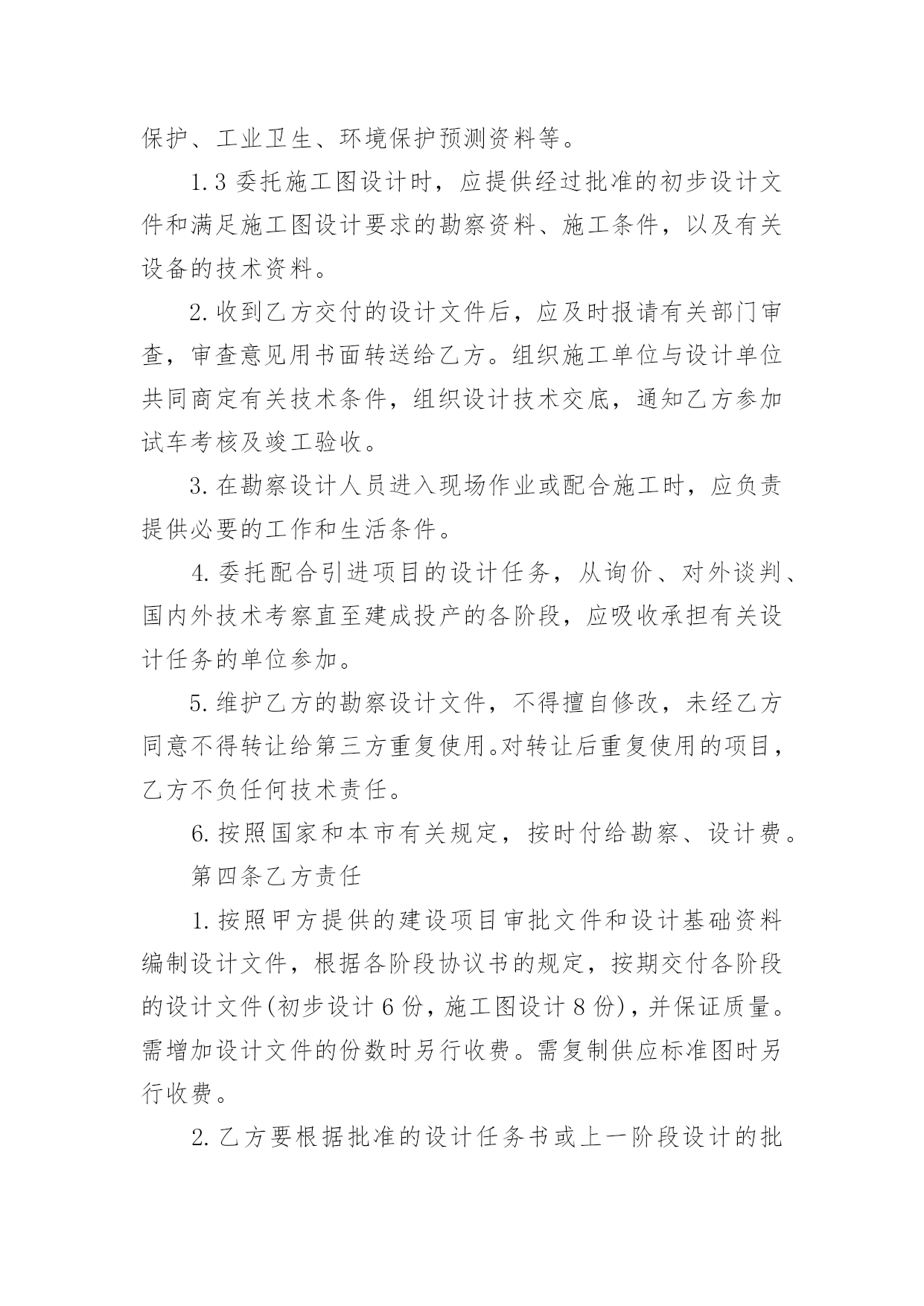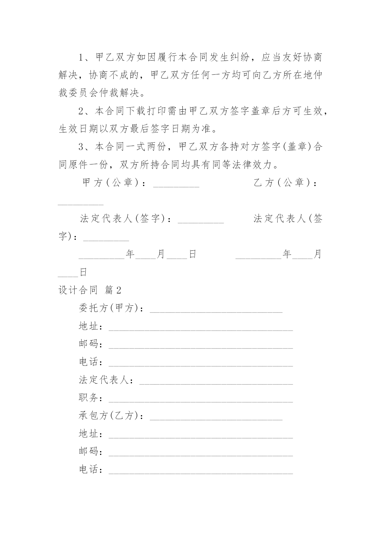 设计合同【推荐】设计合同范文锦集10篇在人们越来越相信法律的社会中,越来越多事情需要用到合同,它也是减少和防止发生争议的重要措施。那么合同书的格式,你掌握了吗?以下是小编为大家收集的设计合同10篇,仅供参考,希望能够帮助到大家。设计合同篇1甲方:乙方:一、合同内容和要求为对甲方企业的整体品牌视觉作长远的规划及有效的执行,经甲乙双方协商,一致通过达成1、甲方委托乙方全权为其公司导入企业品牌视觉识别系统(即vis系统),并确认乙方为甲2、vi设计项目见合同附件二、费用:视觉识别系统设计的费用为人民币:___________元(大写:___________________元整),三、付款方式:1、合同费用分________次付清2、本合同签订后,甲方即向乙方支付合同总金额的50%,3、vis手册整理完成;并报予甲方签字认可,甲方确认后需及时支付合同余款(总金额的50%)四、双方的责任与义务:1、乙方需在规定时间二○○___年____月____日至二○○___年____月____日完成甲方公司vi手册的整理工作,并报予甲方签字认可。(乙方在收到甲方余款后,两天内交付所有vis相关电子文件及vis印刷手册)。2、甲方有责任配合乙方开展本合同所规定的工作,并根据乙方需要提供相关资料,因甲方五、知识产权约定:1、乙方对设计完成的作品享有著作权。甲方将委托设计的所有费用结算完毕后,乙方即向2、甲方在未付清所有委托设计相关费用之前,乙方设计的作品著作权归乙方,甲方对该作3、甲方在余款未付清之前擅自使用或者修改使用乙方设计的作品而导致的侵权,乙方有权六、违约责任:1、本合同签订后,甲乙双方均应全面的履行本合同。2、因vi策划设计是乙方智力成果整体的体现,其工作特点并没有明显的阶段性,乙方在开始3、乙方如提前终止合同,则所收取的费用应全部退还甲方。七、其它补充条款:八、合同生效:1、甲乙双方如因履行本合同发生纠纷,应当友好协商解决,协商不成的,甲乙双方任何一方均可向乙方所在地仲裁委员会仲裁解决。2、本合同下载打印需由甲乙双方签字盖章后方可生效,生效日期以双方最后签字日期为准。3、本合同一式两份,甲乙双方各持对方签字(盖章)合同原件一份,双方所持合同均具有同等法律效力。甲方(公章):_________乙方(公章):_________法定代表人(签字):_________法定代表人(签字):__________________年____月____日_________年____月____日设计合同篇2委托方(甲方):__________________________地址:____________________________________邮码:____________________________________电话:____________________________________法定代表人:______________________________职务:____________________________________承包方(乙方):__________________________地址:____________________________________邮码:____________________________________电话:____________________________________法定代表人:______________________________职务:____________________________________依照《中华人民共和国合同法》的有关规定,经双方协商一致签订本合同。第一条甲方委托乙方承担的工程勘察设计项目名称、内容、规模与范围详见委托勘察设计项目表。第二条乙方根据委托的勘察设计项目和主管部门的规定,按初步设计(方案设计)和施工图设计,分阶段进行。在具备各个阶段设计条件时,双方签订阶段协议书,具体规定甲方应提交的勘察设计基础资料的名称和日期,乙方需交付的勘察设计文件资料的名称和日期,做为本合同的附件。第三条甲方责任1.按照各设计阶段协议书的规定,向乙方提供有关建设项目审批文件和勘察设计基础资料,并对提供的时间、进度与资料可靠性负责。1.1委托勘察测绘工作的,在勘测工作开展前,应提出勘察测绘技术要求及标有拟建工程准确位置的地形图,圈定测量范围的平面图,土地使用证的复制件,并安排好现场工作条件。1.2委托初步设计应提出以下资料:①经过批准的设计任务书;②选址报告;③规划要求;④原料(或经过批准的资源报告)、燃料、水、电、运输等方面的协议文件;⑤经批准的工艺设计资料,民用项目的使用要求;⑥能满足初步设计要求的勘测资料,需要经过科研取得的技术资料、人防、消防、劳动保护、工业