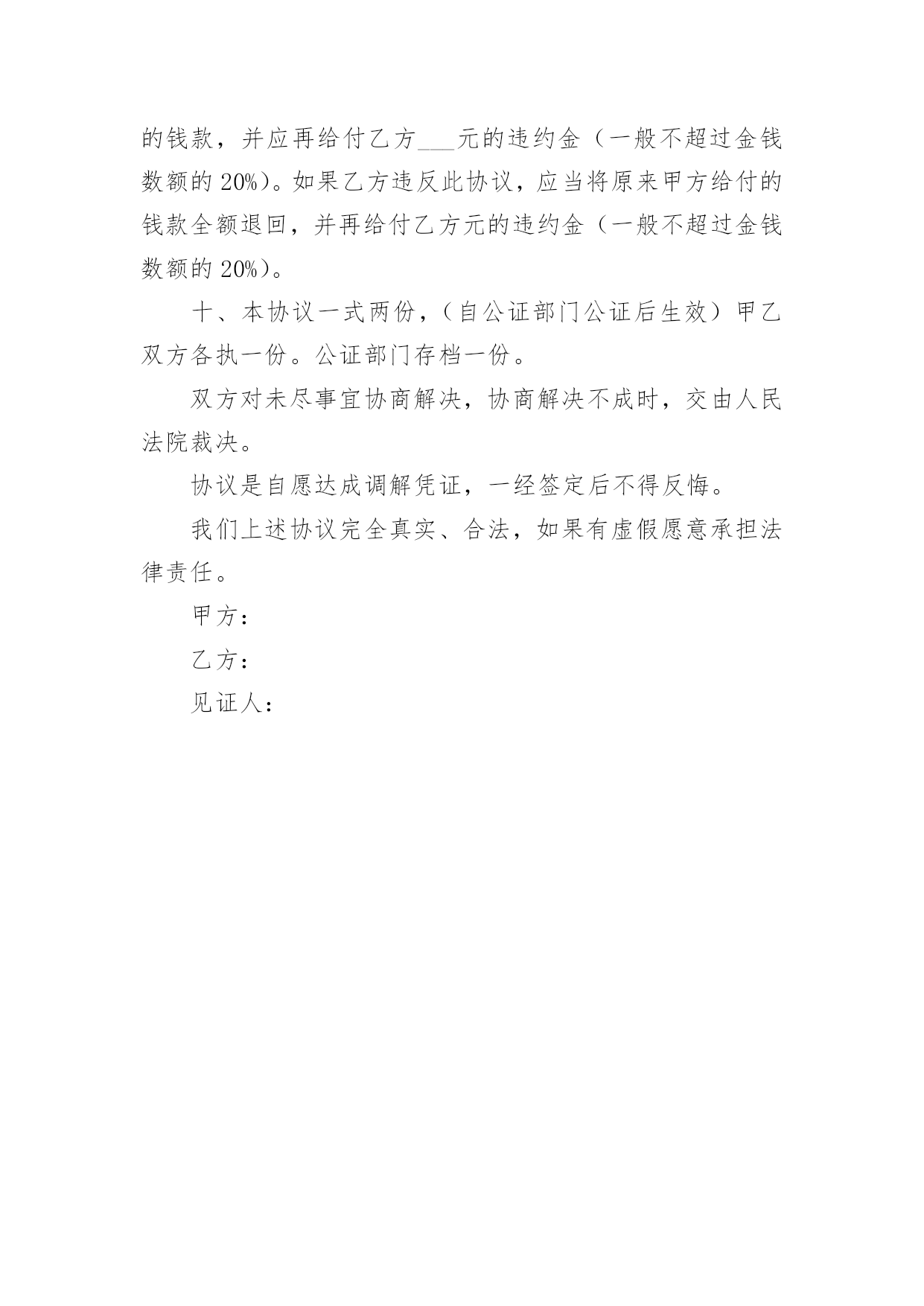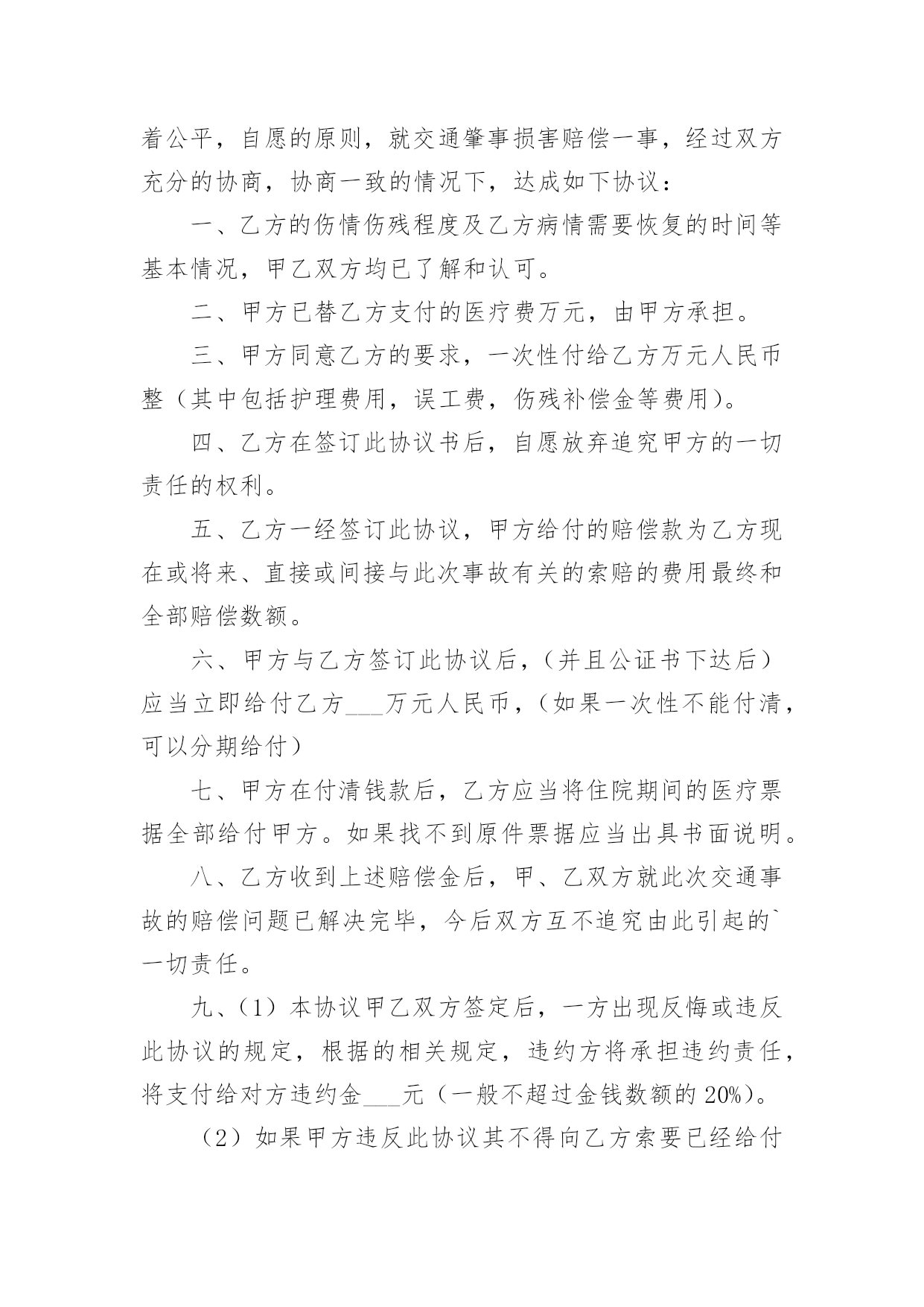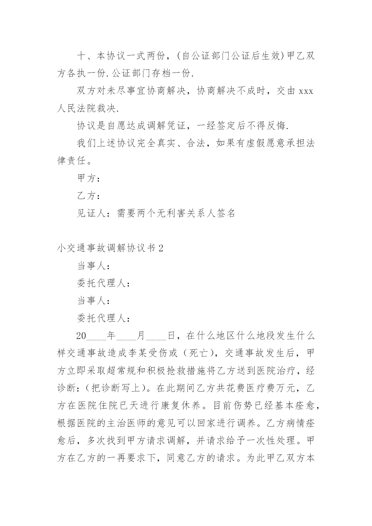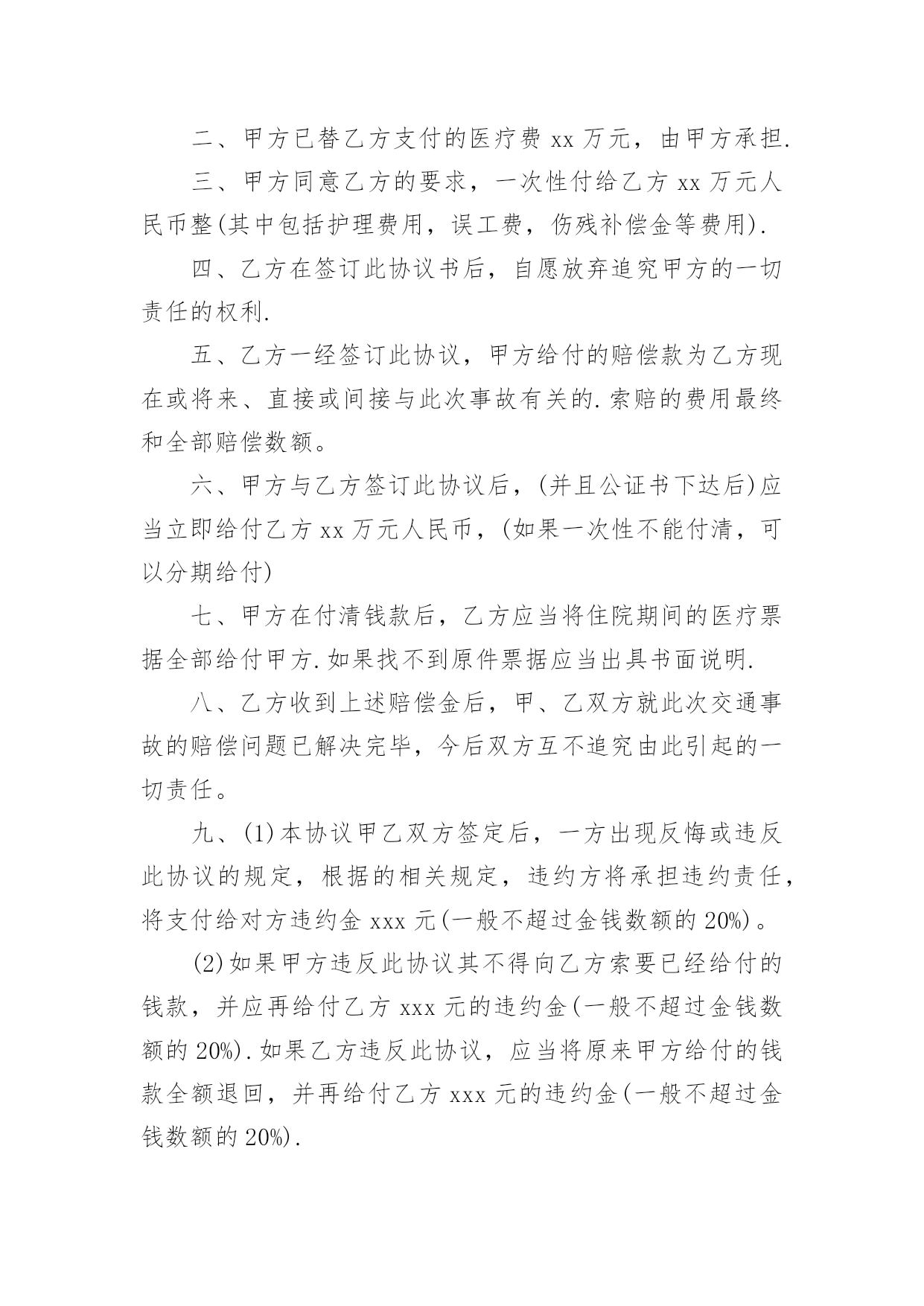 小交通事故调解协议书在社会发展不断提速的今天,协议与我们的生活息息相关,签订协议是提高经济效益的手段。那么写协议真的很难吗?以下是小编帮大家整理的小交通事故调解协议书,欢迎大家分享。小交通事故调解协议书1当事人:委托代理人:(有委托代理人就写,没有就不用)当事人:委托代理人:20xx年xx月xx日,在什么地区什么地段发生什么样交通事故造成李某受伤或(死亡),交通事故发生后,甲方立即采取超常规和积极抢救措施将乙方送到xx医院治疗,经诊断:(把诊断写上).在此期间乙方共花费医疗费xx万元,乙方在xx医院住院已xxx天进行康复休养.目前伤势已经基本痊愈,根据xx医院的主治医师的意见可以回家进行调养.乙方病情痊愈后,多次找到甲方请求调解,并请求给予一次性处理.甲方在乙方的一再要求下,同意乙方的请求.为此甲乙双方本着公平,自愿的原则,就交通肇事损害赔偿一事,经过双方充分的协商,协商一致的情况下,达成如下协议:一、乙方的伤情伤残程度及乙方病情需要恢复的时间等基本情况,甲乙双方均已了解和认可.二、甲方已替乙方支付的医疗费xx万元,由甲方承担.三、甲方同意乙方的要求,一次性付给乙方xx万元人民币整(其中包括护理费用,误工费,伤残补偿金等费用).四、乙方在签订此协议书后,自愿放弃追究甲方的一切责任的权利.五、乙方一经签订此协议,甲方给付的赔偿款为乙方现在或将来、直接或间接与此次事故有关的.索赔的费用最终和全部赔偿数额。六、甲方与乙方签订此协议后,(并且公证书下达后)应当立即给付乙方xx万元人民币,(如果一次性不能付清,可以分期给付)七、甲方在付清钱款后,乙方应当将住院期间的医疗票据全部给付甲方.如果找不到原件票据应当出具书面说明.八、乙方收到上述赔偿金后,甲、乙双方就此次交通事故的赔偿问题已解决完毕,今后双方互不追究由此引起的一切责任。九、(1)本协议甲乙双方签定后,一方出现反悔或违反此协议的规定,根据的相关规定,违约方将承担违约责任,将支付给对方违约金xxx元(一般不超过金钱数额的20%)。(2)如果甲方违反此协议其不得向乙方索要已经给付的钱款,并应再给付乙方xxx元的违约金(一般不超过金钱数额的20%).如果乙方违反此协议,应当将原来甲方给付的钱款全额退回,并再给付乙方xxx元的违约金(一般不超过金钱数额的20%).十、本协议一式两份,(自公证部门公证后生效)甲乙双方各执一份.公证部门存档一份.双方对未尽事宜协商解决,协商解决不成时,交由xxx人民法院裁决.协议是自愿达成调解凭证,一经签定后不得反悔.我们上述协议完全真实、合法,如果有虚假愿意承担法律责任。甲方:乙方:见证人:需要两个无利害关系人签名小交通事故调解协议书2当事人:委托代理人:当事人:委托代理人:20____年____月____日,在什么地区什么地段发生什么样交通事故造成李某受伤或(死亡),交通事故发生后,甲方立即采取超常规和积极抢救措施将乙方送到医院治疗,经诊断:(把诊断写上)。在此期间乙方共花费医疗费万元,乙方在医院住院已天进行康复休养。目前伤势已经基本痊愈,根据医院的主治医师的意见可以回家进行调养。乙方病情痊愈后,多次找到甲方请求调解,并请求给予一次性处理。甲方在乙方的一再要求下,同意乙方的请求。为此甲乙双方本着公平,自愿的原则,就交通肇事损害赔偿一事,经过双方充分的协商,协商一致的情况下,达成如下协议:一、乙方的伤情伤残程度及乙方病情需要恢复的时间等基本情况,甲乙双方均已了解和认可。二、甲方已替乙方支付的医疗费万元,由甲方承担。三、甲方同意乙方的要求,一次性付给乙方万元人民币整(其中包括护理费用,误工费,伤残补偿金等费用)。四、乙方在签订此协议书后,自愿放弃追究甲方的一切责任的权利。五、乙方一经签订此协议,甲方给付的赔偿款为乙方现在或将来、直接或间接与此次事故有关的索赔的费用最终和全部赔偿数额。六、甲方与乙方签订此协议后,(并且公证书下达后)应当立即给付乙方___万元人民币,(如果一次性不能付清,可以分期给付)七、甲方在付清钱款后,乙方应当将住院期间的医疗票据全部给付甲方。如果找不到原件票据应当出具书面说明。八、乙方收到上述赔偿金后,甲、乙双方就此次交通事故的赔偿问题已解决完毕,今后双方互不追究由此引起的`一切责任。九、(1)本协议甲乙双方签定后,一方出现反悔或违反此协议的规定,根据的相关规定,违约方将承担违约责任,将支付给对方违约金___元(一般不超过金钱数额的20%)。(2)如果甲方违反此协议其不得向乙方索要已经给付的钱款,并应再给付乙方___元的违约金(一般不超过金钱数额的20%)。如果乙方违反此协议,应当将原来甲方给付的钱款全额退回,并再给付乙方元的违约金(一般不超过金钱数额的20%)。十、本协议一式两份,(自公证部门公证后生效)甲乙双方各执一份。公证部门存