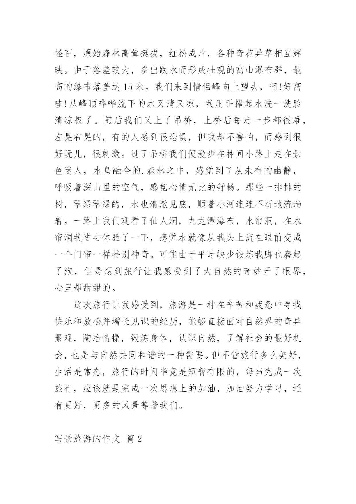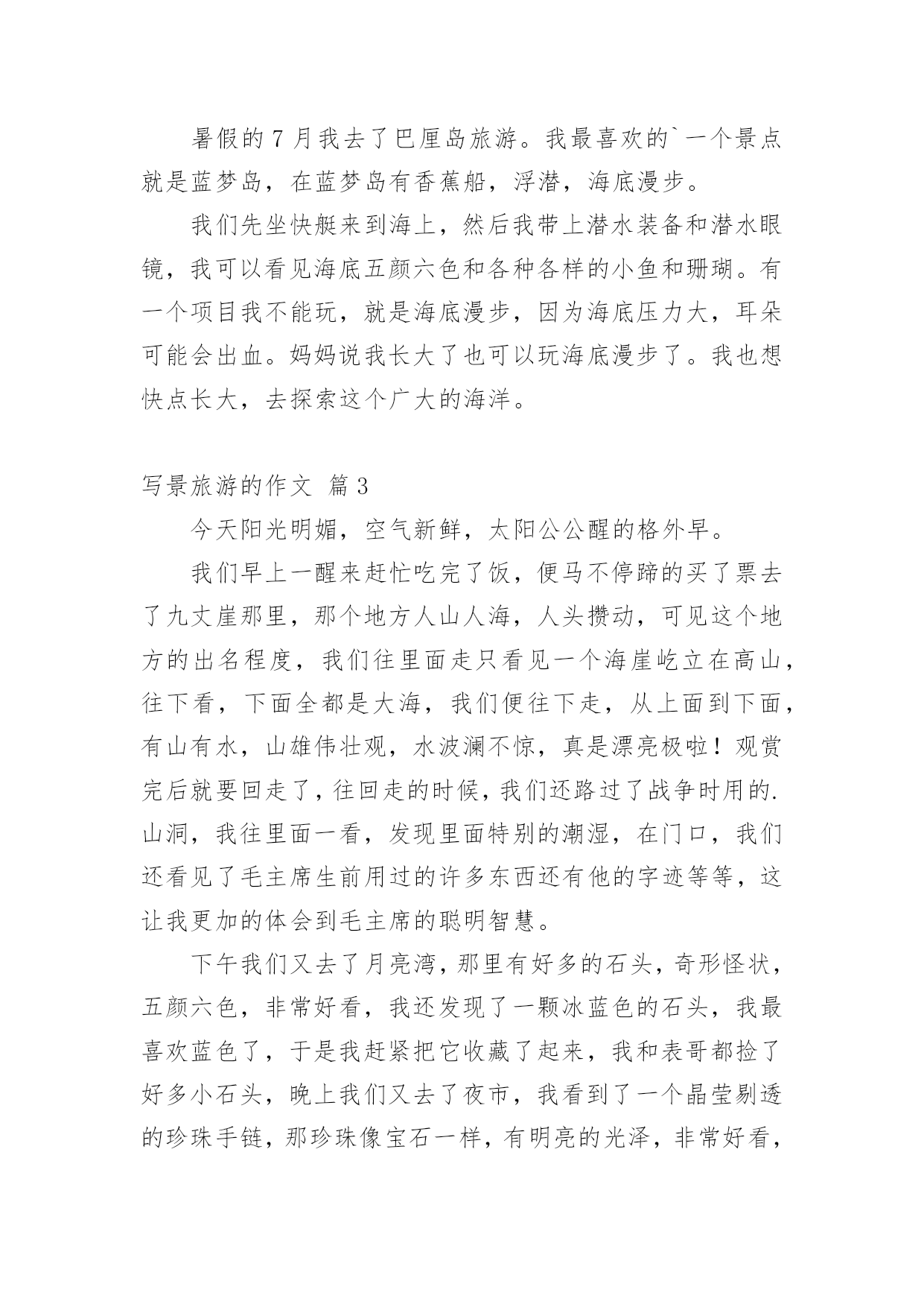 写景旅游的作文【精品】写景旅游的作文3篇在学习、工作、生活中,大家都不可避免地会接触到作文吧,作文是人们把记忆中所存储的有关知识、经验和思想用书面形式表达出来的记叙方式。那要怎么写好作文呢?以下是小编收集整理的写景旅游的作文3篇,欢迎阅读,希望大家能够喜欢。写景旅游的作文篇1今年暑假时,我和姥姥去了牡丹江旅游景区小九寨。北方小九寨位于柴河林场,距牡丹江市95公里,坐落于全国最大的国家级森林公园—威虎山国家森林公园内,公园总面积34.5万公顷。因此我很盼望去哪里游玩。早上6点钟我们就从牡丹江坐上去小九寨的客车一路上我的心情无比激动,眼睛一直望着窗外,幻想着那里的景色。大概有一个多小时吧,车便进入了景区,一进景区大门,五个大字非常醒目“北国小九寨”,仿佛在欢迎我们的到来。我们随着人群排着长长的队伍又坐上景区里面的车,走进了青山,碧水的景区,我一下子就被那里迷人的景色所吸引,投入了森林的怀抱,我们还看到了一块牌子上面写着《林海雪原》听导游讲述了长篇小说中的英雄杨子荣追歼残匪的故事,就发生在这块土地上。景区内有多座秀丽的石峰,奇松怪石,原始森林高耸挺拔,红松成片,各种奇花异草相互辉映。由于落差较大,多出跌水而形成壮观的高山瀑布群,最高的瀑布落差达15米。我们来到情侣峰向上望去,啊!好高哇!从峰顶哗哗流下的水又清又凉,我用手捧起水洗一洗脸清凉极了。随后我们又上了吊桥,上桥后每走一步都很难,左晃右晃的,有的人感到很恐惧,但我却不害怕,而感到很好玩儿,很刺激。过了吊桥我们便漫步在林间小路上走在景色迷人,水鸟融合的.森林之中,感觉到了从未有的幽静,呼吸着深山里的空气,感觉心情无比的舒畅。那些一排排的树,翠绿翠绿的,水也清澈见底,顺着小河连连不断地流淌着。一路上我们观看了仙人洞,九龙潭瀑布,水帘洞,在水帘洞我进去体验了一下,感觉水就像从我头上流在眼前变成一个门帘一样特别神奇。可能由于平时缺少锻炼我脚也磨起了泡,但是想到旅行让我感受到了大自然的奇妙开了眼界,心里却甜甜的。这次旅行让我感受到,旅游是一种在辛苦和疲惫中寻找快乐和放松并增长见识的经历,能够直接面对自然界的奇异景观,陶冶情操,锻炼身体,认识自然,了解社会的最好机会,也是与自然共同和谐的一种需要。但不管旅行多么美好,生活是常态,旅行的时间毕竟是短暂有限的,每当完成一次旅行,应该就是完成一次思想上的加油,加油努力学习,还有更好,更多的风景等着我们。写景旅游的作文篇2暑假的7月我去了巴厘岛旅游。我最喜欢的`一个景点就是蓝梦岛,在蓝梦岛有香蕉船,浮潜,海底漫步。我们先坐快艇来到海上,然后我带上潜水装备和潜水眼镜,我可以看见海底五颜六色和各种各样的小鱼和珊瑚。有一个项目我不能玩,就是海底漫步,因为海底压力大,耳朵可能会出血。妈妈说我长大了也可以玩海底漫步了。我也想快点长大,去探索这个广大的海洋。写景旅游的作文篇3今天阳光明媚,空气新鲜,太阳公公醒的格外早。我们早上一醒来赶忙吃完了饭,便马不停蹄的买了票去了九丈崖那里,那个地方人山人海,人头攒动,可见这个地方的出名程度,我们往里面走只看见一个海崖屹立在高山,往下看,下面全都是大海,我们便往下走,从上面到下面,有山有水,山雄伟壮观,水波澜不惊,真是漂亮极啦!观赏完后就要回走了,往回走的时候,我们还路过了战争时用的.山洞,我往里面一看,发现里面特别的潮湿,在门口,我们还看见了毛主席生前用过的许多东西还有他的字迹等等,这让我更加的体会到毛主席的聪明智慧。下午我们又去了月亮湾,那里有好多的石头,奇形怪状,五颜六色,非常好看,我还发现了一颗冰蓝色的石头,我最喜欢蓝色了,于是我赶紧把它收藏了起来,我和表哥都捡了好多小石头,晚上我们又去了夜市,我看到了一个晶莹剔透的珍珠手链,那珍珠像宝石一样,有明亮的光泽,非常好看,于是我用自己的零花钱买了下来,打算送给妈妈,我还买了几个小项链,毕竟女孩子都是爱美的嘛!这一天很快过去了,但是他留给我的乐趣却是永久的,今天真是开心呐!