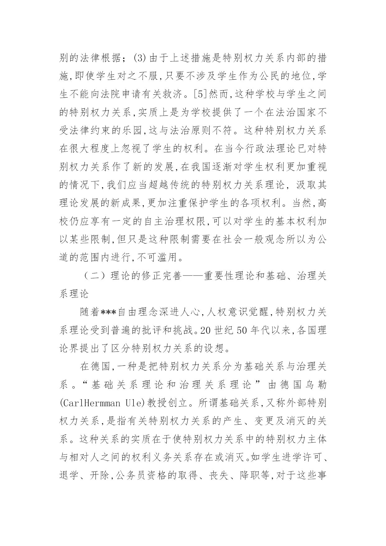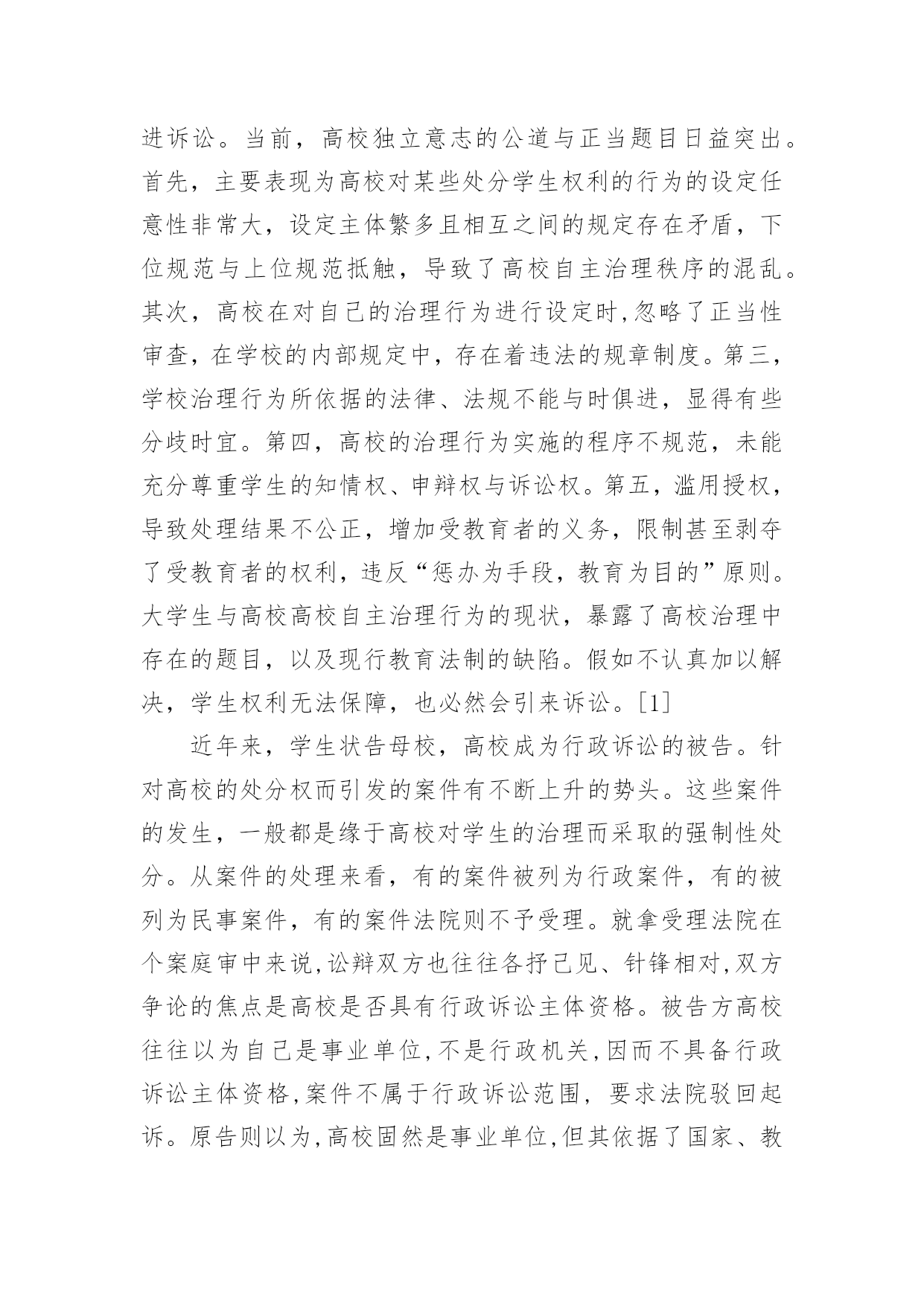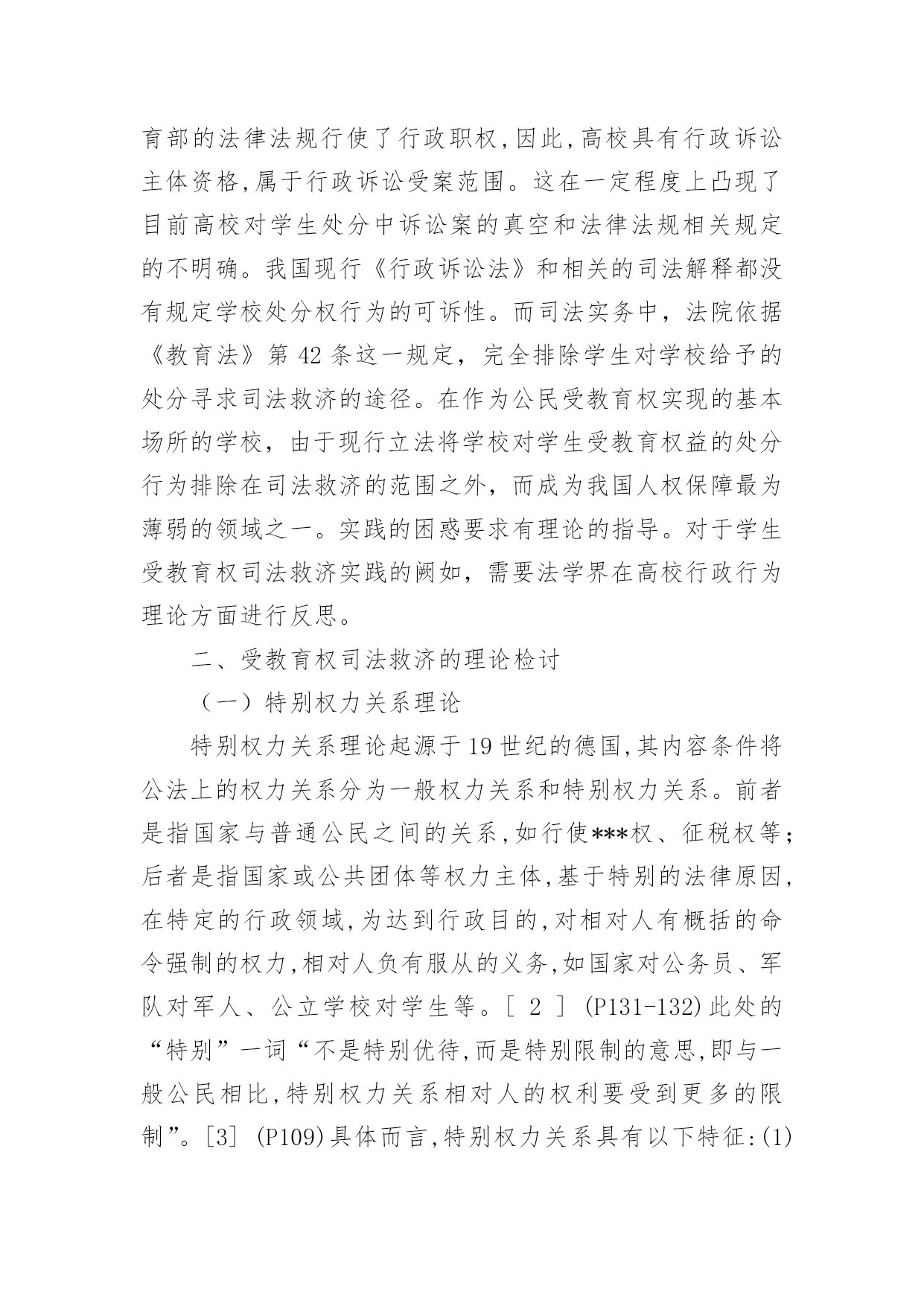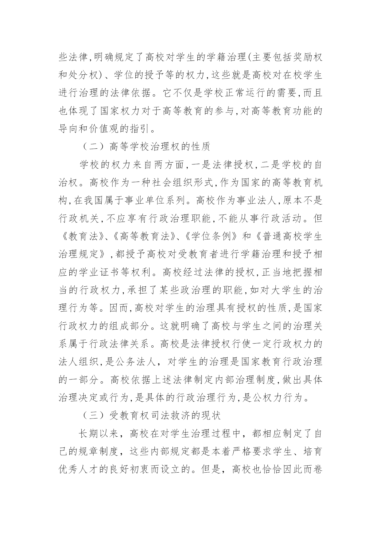 论高校学生受教育权的司法救济[摘要]受教育权是公民的一项宪法权利,如受到侵犯应得到司法救济。现今,高校学生的受教育权不时受到侵害,但理论的禁锢和实体法律的不完善使得难以寻求司法救济。在人权保障日益受到重视的今天,加强对学生受教育权的保障就显得尤为重要。[关键词]高校学生;受教育权;可诉性;司法救济在我国,受教育权利是一项宪法性质的权利。宪法第46条明确规定:“中华人民共和国公民享有受教育的权利和义务。”这一规定意味着受教育权利作为一项基本权利同人的生存权一样,应优先于其他的一般权利,国家、社会、学校等应优先保证公民享受充分的受教育权利,当公民的受教育权利受到侵害时也应得到及时的法律救济。受教育权利作为一项宪法性质的权利,也被我国的教育法所内化。《教育法》第9条规定:“中华人民共和国公民有受教育的权利和义务。公民不分民族、种族、性别、职业、财产状况、宗教信仰等,依法享有同等的受教育机会。”教育法的其他相关条款也分别对公民受教育的内容和保障作了一些规定。在现代社会,人们日益觉悟到了受教育权利的重大意义。人的受教育程度,在某种程度上决定了其利用有限的社会资源的能力,因而决定了其谋求财富、追求幸福和实现抱负的层次。而我国有关保障受教育权的法律相对滞后,有关学生受教育权的救济保障制度极为单薄。一、高校治理权及受教育权司法救济的现状(一)高等学校治理权的法律依据我国法律(包括行政法规、行政规章)的规定,是高校对在校大学生进行治理的法律依据。《教育法》第28条规定,学校有组织实施教学活动;招收学生或者其他受教育者;对受教育者进行学籍治理、实施奖励或者处分;对受教育者颁发相应的学业证书等权利。《高等教育法》第20条规定:“接受高等学历教育的学生,由所在高校或者经批准承担研究生教育任务的科研机构根据其修业年限、学业成绩等,按照国家有关规定,发给相应的学历证书或者经批准承担研究生教育任务的科研机构根据其修业年限、学业成绩等,按照国家有关规定,发给相应的学历证书或者其他学业证书。”第41条规定:高校的校长有“对学生进行学籍治理并实施奖励或者处分”的权利;《学位条例》第8条规定:“学士学位,由国家授权的高校授予,硕士学位、博士学位,由国务院授权的高校或者科研机构授予。”《学位条例暂行实施办法》第25条规定:“学位授予单位可根据本暂行实施办法,制定本单位授予学位的工作细则。”2005年3月29日颁布的《普通高校学生治理规定》第五章规定了学校的奖励与处分权,如第50条规定:“学校、省(自治区、直辖市)和国家有关部分应当对在德、智、体、美等方面全面发展或者在思想品德、学业成绩、科技创造、锻炼身体及社会服务等方面表现突出的学生,给予表彰和奖励。”第52条规定:“对有违法、违规、违游记为的学生,学校应当给予批评教育或者纪律处分。”这些法律,明确规定了高校对学生的学籍治理(主要包括奖励权和处分权)、学位的授予等的权力,这些就是高校对在校学生进行治理的法律依据。它不仅是学校正常运行的需要,而且也体现了国家权力对于高等教育的参与,对高等教育功能的导向和价值观的指引。(二)高等学校治理权的性质学校的权力来自两方面,一是法律授权,二是学校的自治权。高校作为一种社会组织形式,作为国家的高等教育机构,在我国属于事业单位系列。高校作为事业法人,原本不是行政机关,不应享有行政治理职能,不能从事行政活动。但《教育法》、《高等教育法》、《学位条例》和《普通高校学生治理规定》,都授予高校对受教育者进行学籍治理和授予相应的学业证书等权利。高校经过法律的授权,正当地把握相当的行政权力,承担了某些政治理的职能,如对大学生的治理行为等。因而,高校对学生的治理具有授权的性质,是国家行政权力的组成部分。这就明确了高校与学生之间的治理关系属于行政法律关系。高校是法律授权行使一定行政权力的法人组织,是公务法人,对学生的治理是国家教育行政治理的一部分。高校依据上述法律制定内部治理制度,做出具体治理决定或行为,是具体的行政治理行为,是公权力行为。(三)受教育权司法救济的现状长期以来,高校在对学生治理过程中,都相应制定了自己的规章制度,这些内部规定都是本着严格要求学生、培育优秀人才的良好初衷而设立的。但是,高校也恰恰因此而卷进诉讼。当前,高校独立意志的公道与正当题目日益突出。首先,主要表现为高校对某些处分学生权利的行为的设定任意性非常大,设定主体繁多且相互之间的规定存在矛盾,下位规范与上位规范抵触,导致了高校自主治理秩序的混乱。其次,高校在对自己的治理行为进行设定时,忽略了正当性审查,在学校的内部规定中,存在着违法的规章制度。第三,学校治理行为所依据的法律、法规不能与时俱进,显得有些分歧时宜。第四,高校的治理行为实施的程序不规范,未能充分尊重学生的知情权、申辩权与诉讼权。第五,滥用授权,导致处理结果不