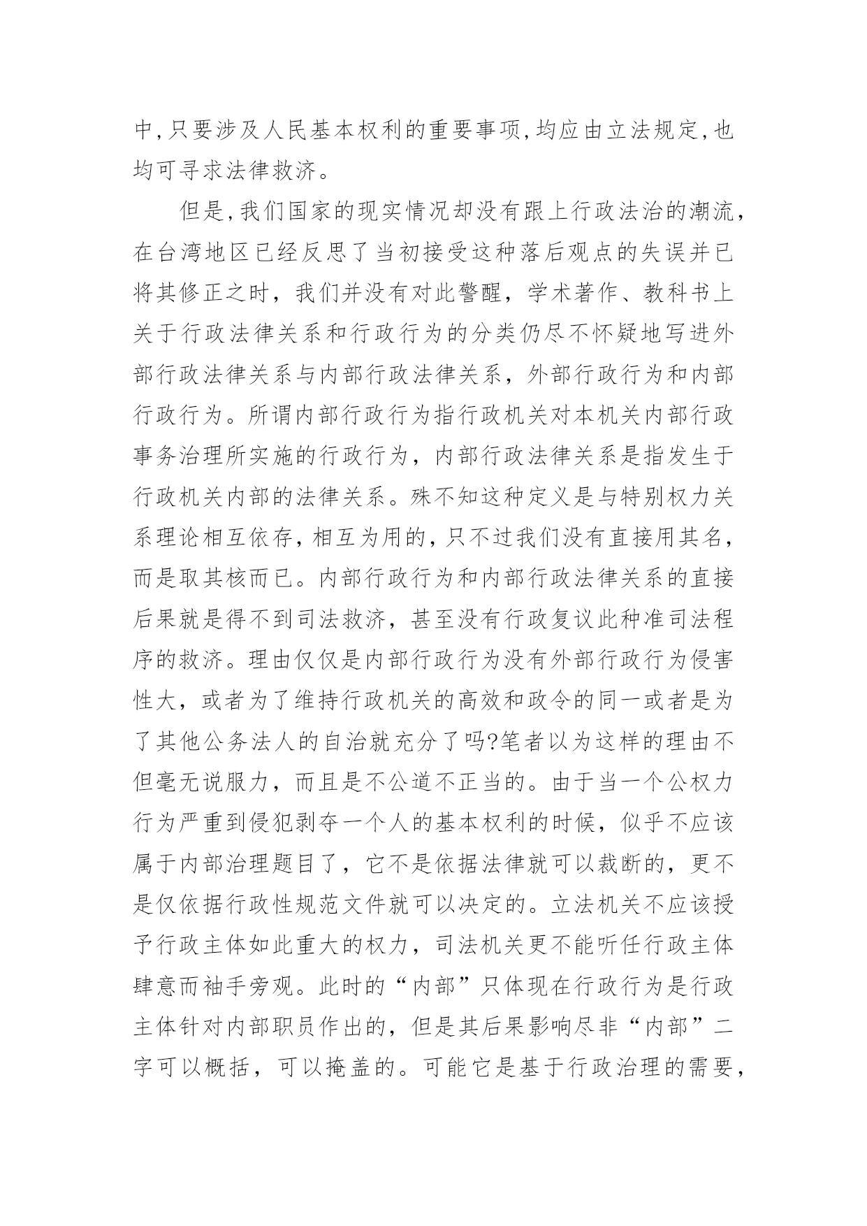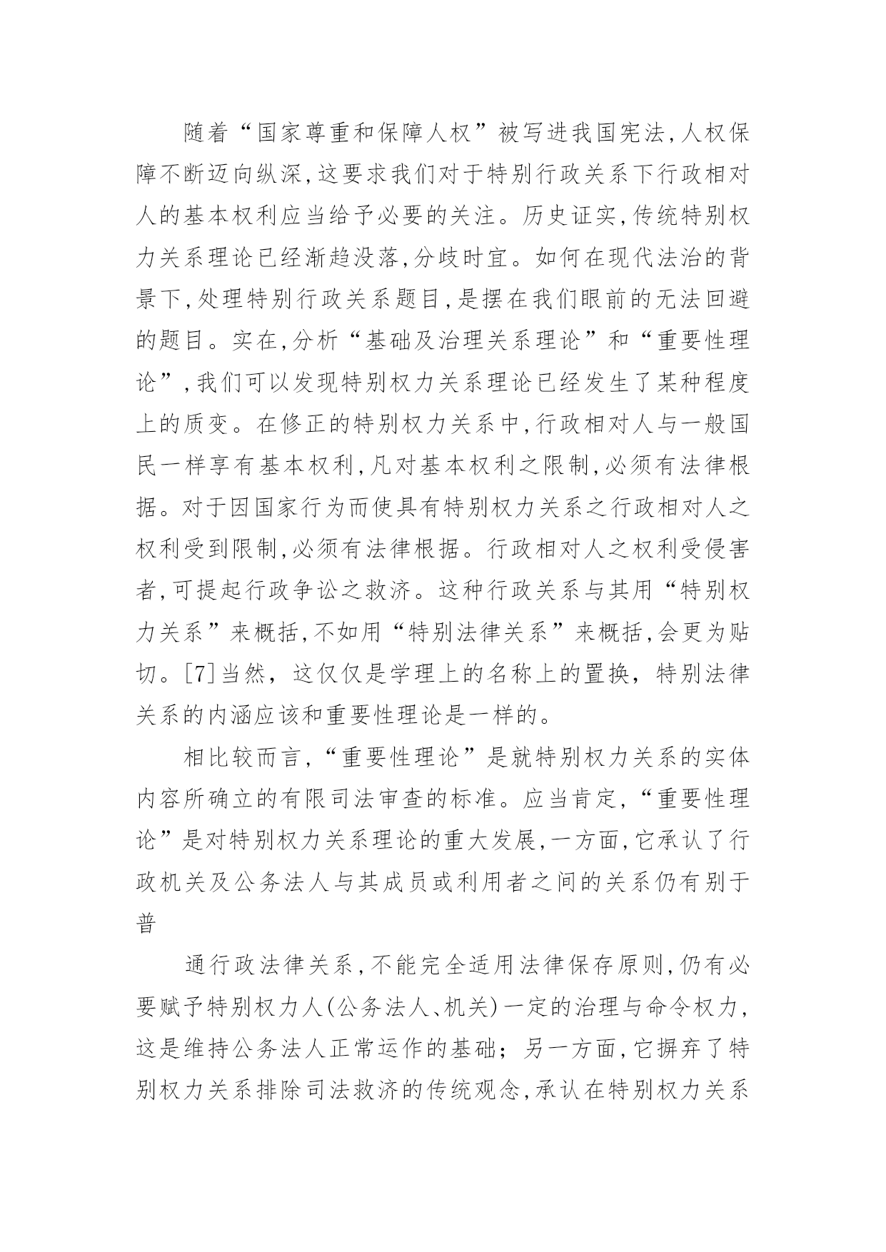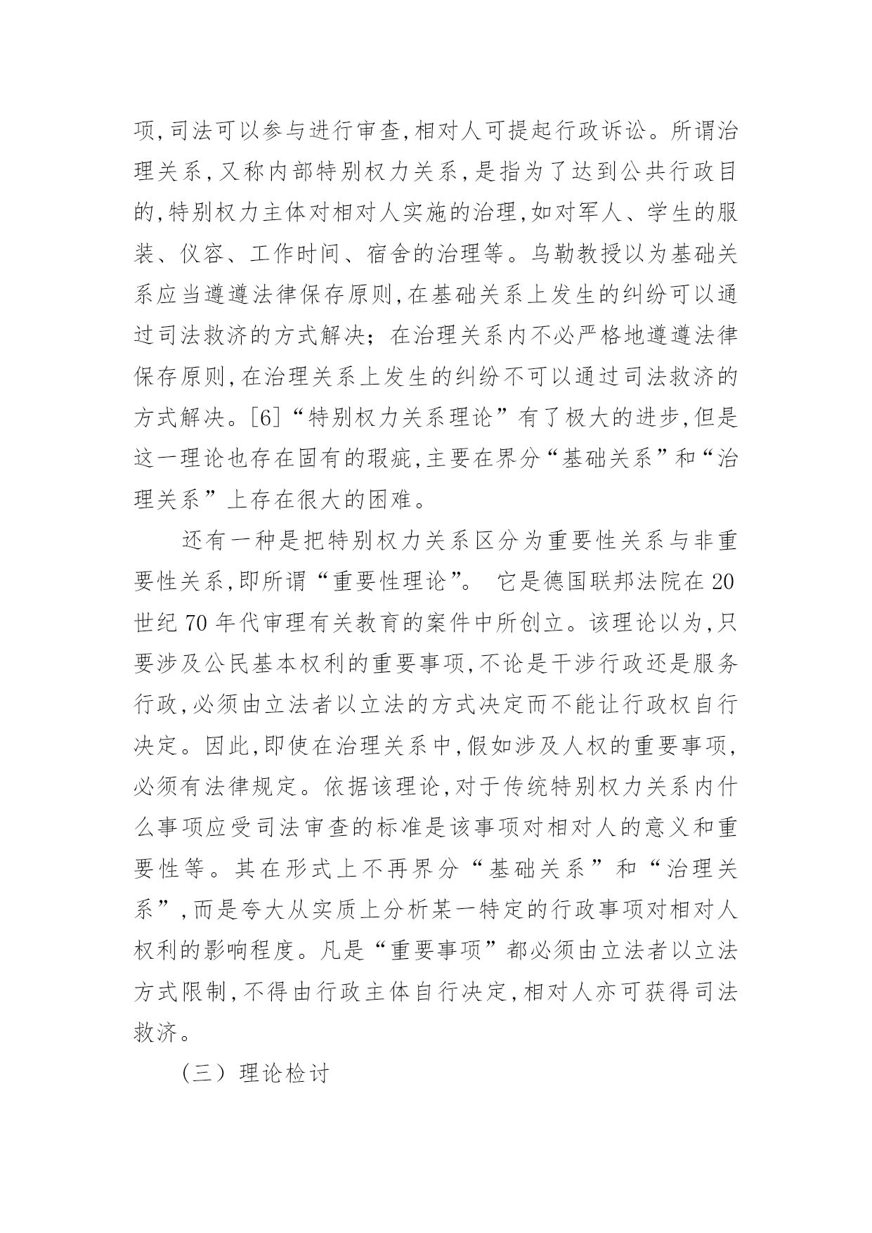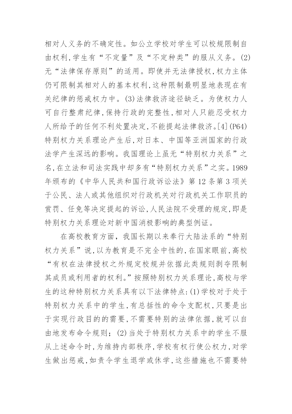 论高校学生受教育权的司法救济[摘要]受教育权是公民的一项宪法权利,如受到侵犯应得到司法救济。现今,高校学生的受教育权不时受到侵害,但理论的禁锢和实体法律的不完善使得难以寻求司法救济。在人权保障日益受到重视的今天,加强对学生受教育权的保障就显得尤为重要。[关键词]高校学生;受教育权;可诉性;司法救济在我国,受教育权利是一项宪法性质的权利。宪法第46条明确规定:“中华人民共和国公民享有受教育的权利和义务。”这一规定意味着受教育权利作为一项基本权利同人的生存权一样,应优先于其他的一般权利,国家、社会、学校等应优先保证公民享受充分的受教育权利,当公民的受教育权利受到侵害时也应得到及时的法律救济。受教育权利作为一项宪法性质的权利,也被我国的教育法所内化。《教育法》第9条规定:“中华人民共和国公民有受教育的权利和义务。公民不分民族、种族、性别、职业、财产状况、宗教信仰等,依法享有同等的受教育机会。”教育法的其他相关条款也分别对公民受教育的内容和保障作了一些规定。在现代社会,人们日益觉悟到了受教育权利的重大意义。人的受教育程度,在某种程度上决定了其利用有限的社会资源的能力,因而决定了其谋求财富、追求幸福和实现抱负的层次。而我国有关保障受教育权的法律相对滞后,有关学生受教育权的救济保障制度极为单薄。一、高校治理权及受教育权司法救济的现状(一)高等学校治理权的法律依据我国法律(包括行政法规、行政规章)的规定,是高校对在校大学生进行治理的法律依据。《教育法》第28条规定,学校有组织实施教学活动;招收学生或者其他受教育者;对受教育者进行学籍治理、实施奖励或者处分;对受教育者颁发相应的学业证书等权利。《高等教育法》第20条规定:“接受高等学历教育的学生,由所在高校或者经批准承担研究生教育任务的科研机构根据其修业年限、学业成绩等,按照国家有关规定,发给相应的学历证书或者经批准承担研究生教育任务的科研机构根据其修业年限、学业成绩等,按照国家有关规定,发给相应的学历证书或者其他学业证书。”第41条规定:高校的校长有“对学生进行学籍治理并实施奖励或者处分”的权利;《学位条例》第8条规定:“学士学位,由国家授权的高校授予,硕士学位、博士学位,由国务院授权的高校或者科研机构授予。”《学位条例暂行实施办法》第25条规定:“学位授予单位可根据本暂行实施办法,制定本单位授予学位的工作细则。”2005年3月29日颁布的《普通高校学生治理规定》第五章规定了学校的奖励与处分权,如第50条规定:“学校、省(自治区、直辖市)和国家有关部分应当对在德、智、体、美等方面全面发展或者在思想品德、学业成绩、科技创造、锻炼身体及社会服务等方面表现突出的学生,给予表彰和奖励。”第52条规定:“对有违法、违规、违游记为的学生,学校应当给予批评教育或者纪律处分。”这些法律,明确规定了高校对学生的学籍治理(主要包括奖励权和处分权)、学位的授予等的权力,这些就是高校对在校学生进行治理的法律依据。它不仅是学校正常运行的需要,而且也体现了国家权力对于高等教育的参与,对高等教育功能的导向和价值观的指引。(二)高等学校治理权的性质学校的权力来自两方面,一是法律授权,二是学校的自治权。高校作为一种社会组织形式,作为国家的高等教育机构,在我国属于事业单位系列。高校作为事业法人,原本不是行政机关,不应享有行政治理职能,不能从事行政活动。但《教育法》、《高等教育法》、《学位条例》和《普通高校学生治理规定》,都授予高校对受教育者进行学籍治理和授予相应的学业证书等权利。高校经过法律的授权,正当地把握相当的行政权力,承担了某些政治理的职能,如对大学生的治理行为等。因而,高校对学生的治理具有授权的性质,是国家行政权力的组成部分。这就明确了高校与学生之间的治理关系属于行政法律关系。高校是法律授权行使一定行政权力的法人组织,是公务法人,对学生的治理是国家教育行政治理的一部分。高校依据上述法律制定内部治理制度,做出具体治理决定或行为,是具体的行政治理行为,是公权力行为。(三)受教育权司法救济的现状长期以来,高校在对学生治理过程中,都相应制定了自己的规章制度,这些内部规定都是本着严格要求学生、培育优秀人才的良好初衷而设立的。但是,高校也恰恰因此而卷进诉讼。当前,高校独立意志的公道与正当题目日益突出。首先,主要表现为高校对某些处分学生权利的行为的设定任意性非常大,设定主体繁多且相互之间的规定存在矛盾,下位规范与上位规范抵触,导致了高校自主治理秩序的混乱。其次,高校在对自己的治理行为进行设定时,忽略了正当性审查,在学校的内部规定中,存在着违法的规章制度。第三,学校治理行为所依据的法律、法规不能与时俱进,显得有些分歧时宜。第四,高校的治理行为实施的程序不规范,未能充分尊重学生的知情权、申辩权与诉讼权。第五,滥用授权,导致处理结果不