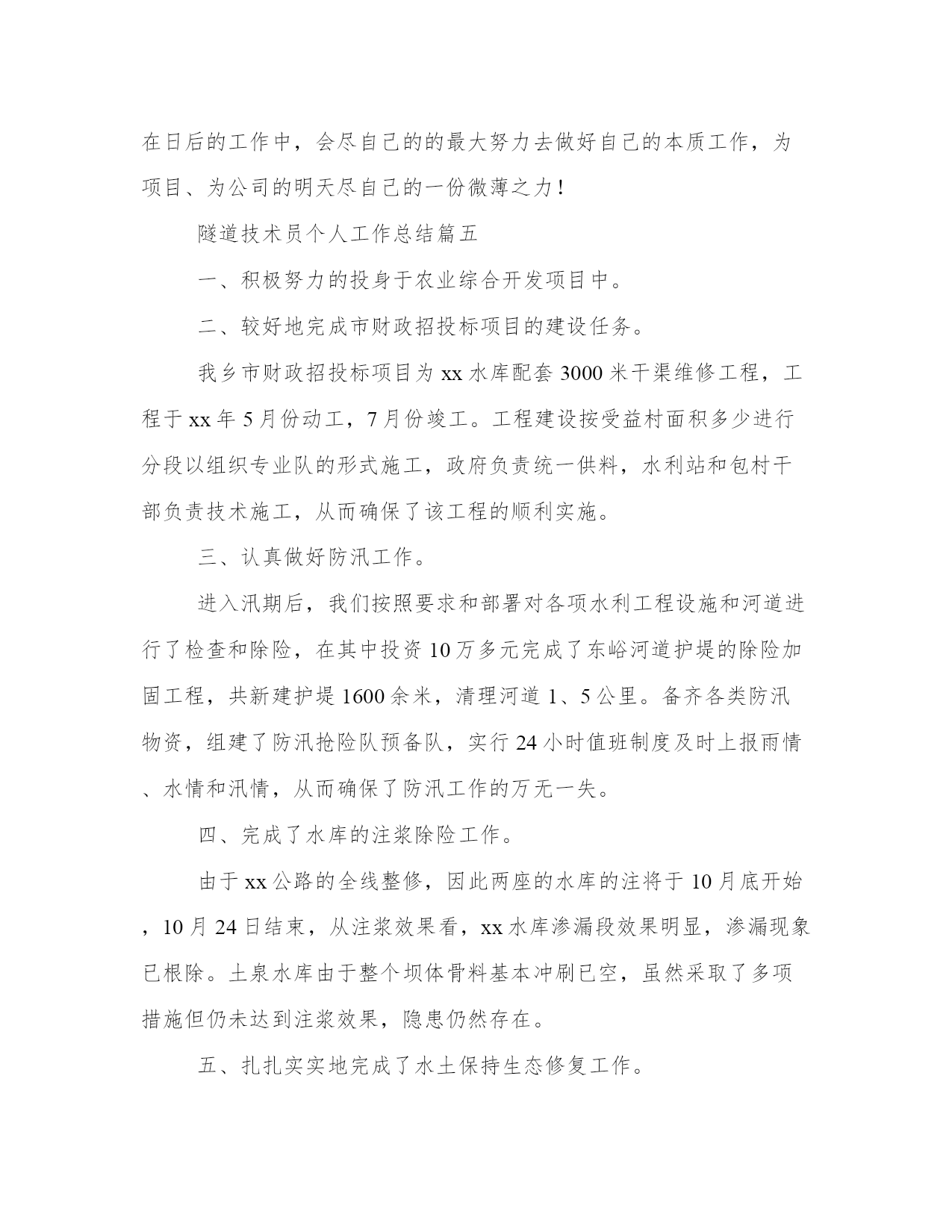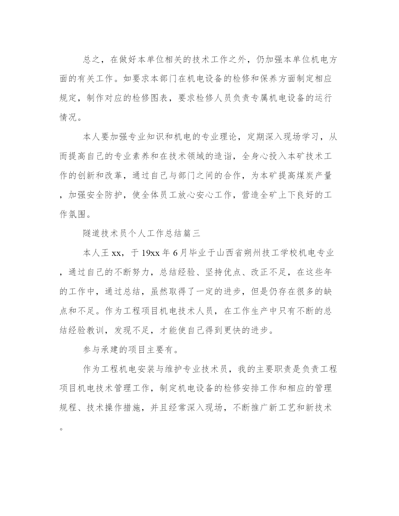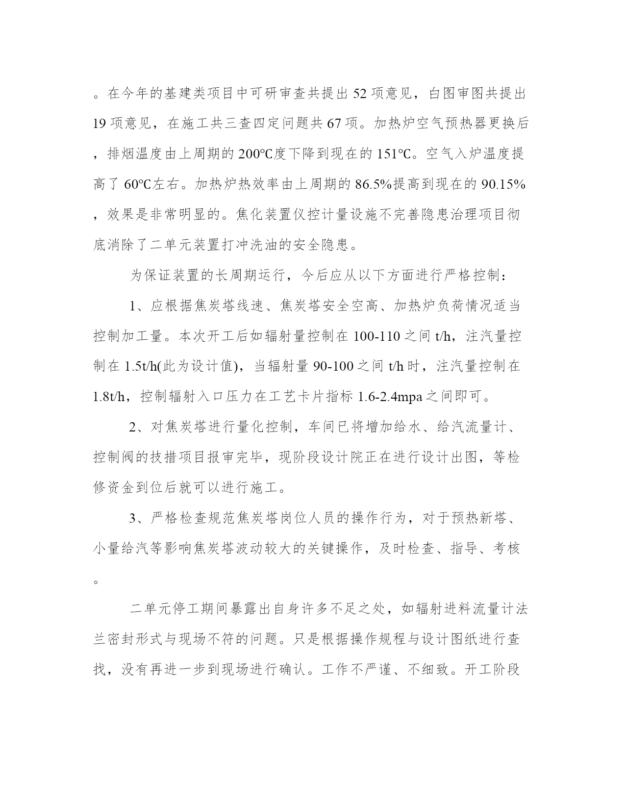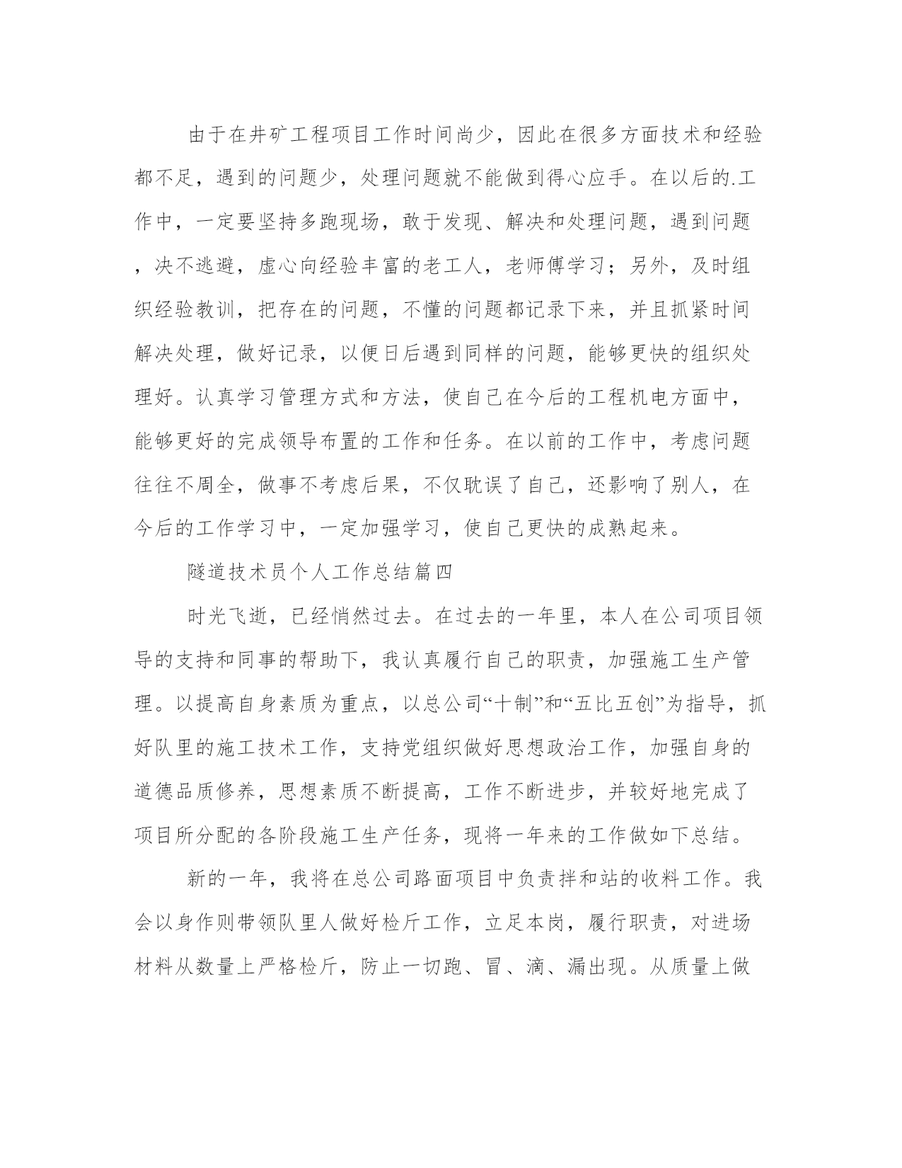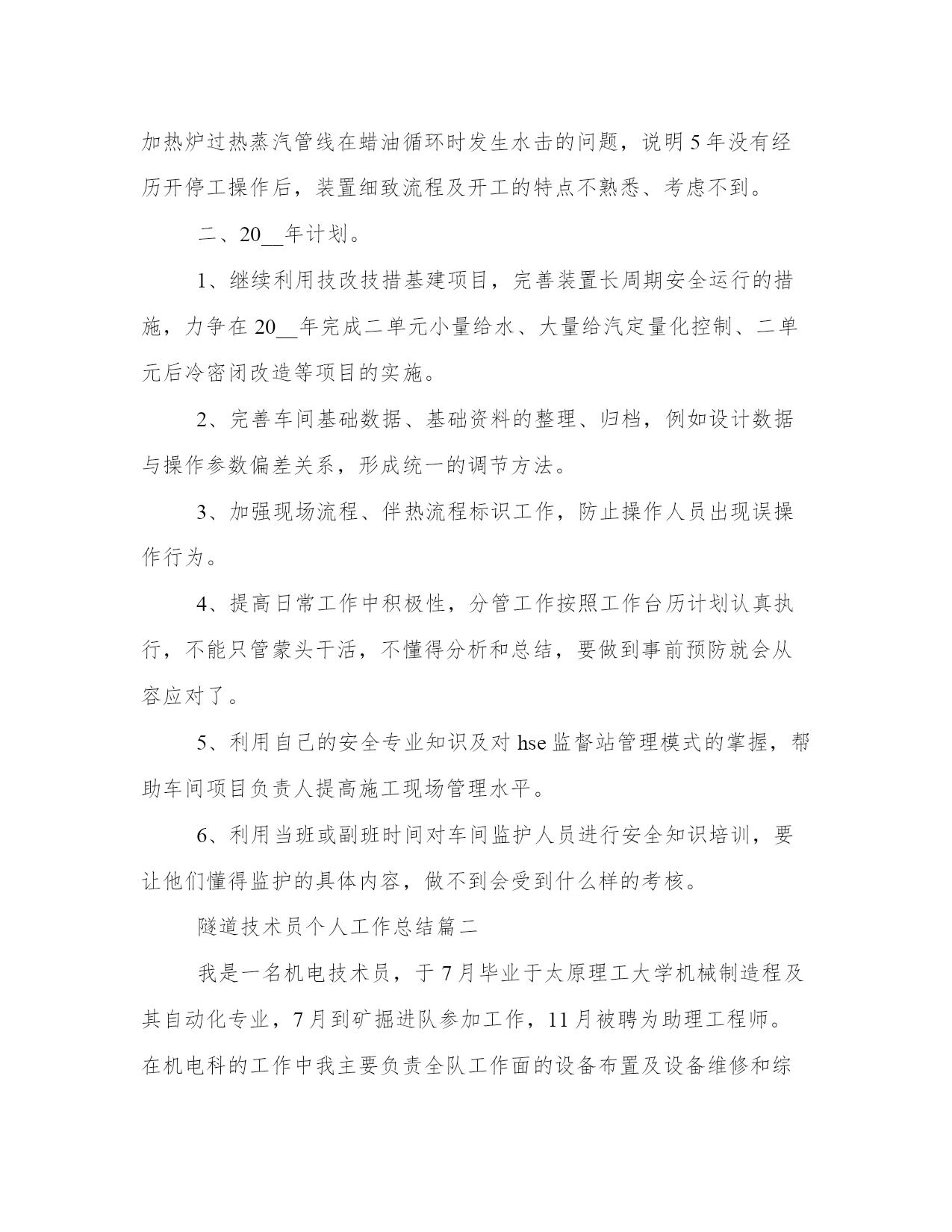 隧道技术员个人工作总结(实用8篇)总结的选材不能求全贪多、主次不分,要根据实际情况和总结的目的,把那些既能显示本单位、本地区特点,又有一定普遍性的材料作为重点选用,写得详细、具体。什么样的总结才是有效的呢?以下我给大家整理了一些优质的总结范文,希望对大家能够有所帮助。隧道技术员个人工作总结篇一20__年还有最后半个月即将过完,回顾20__年的工作,前两个月还在科室过着轻松愉快的生活,虽然工作任务也很多,但是心情是愉悦的,肩上的压力是轻松的。2月27日接受组织安排重新回到装置工作,只能用与装置的缘分未尽来解释吧,真的是万万没想到的事情。“既来之、则安之”,认认真真做好今明两年的工作,不辜负领导、同事的信任。对得起自己的薪水。现就对20__年工作进行总结,并对20__年工作计划进行说明。20__年3月至今担任工艺技术员,期间主要负责基建项目的协调。20__年共涉及的基建项目共完成了“装置焦炭池围墙加高检修项目”“密闭取样器改造项目”“西北局预处理搬迁项目”?3个项目的可研审查及白图审查。并在20__年9月的窗口检修期完成二单元加热炉空气预热器的安装、顶循空冷器的安装、加剂设施的安装,目前还在施工的基建项目有焦碳池的封闭施工及120万焦化装置柴油过滤器的施工。在今年的基建类项目中可研审查共提出52项意见,白图审图共提出19项意见,在施工共三查四定问题共67项。加热炉空气预热器更换后,排烟温度由上周期的200℃度下降到现在的151℃。空气入炉温度提高了60℃左右。加热炉热效率由上周期的86.5%提高到现在的90.15%,效果是非常明显的。焦化装置仪控计量设施不完善隐患治理项目彻底消除了二单元装置打冲洗油的安全隐患。为保证装置的长周期运行,今后应从以下方面进行严格控制:1、应根据焦炭塔线速、焦炭塔安全空高、加热炉负荷情况适当控制加工量。本次开工后如辐射量控制在100-110之间t/h,注汽量控制在1.5t/h(此为设计值),当辐射量90-100之间t/h时,注汽量控制在1.8t/h,控制辐射入口压力在工艺卡片指标1.6-2.4mpa之间即可。2、对焦炭塔进行量化控制,车间已将增加给水、给汽流量计、控制阀的技措项目报审完毕,现阶段设计院正在进行设计出图,等检修资金到位后就可以进行施工。3、严格检查规范焦炭塔岗位人员的操作行为,对于预热新塔、小量给汽等影响焦炭塔波动较大的关键操作,及时检查、指导、考核。二单元停工期间暴露出自身许多不足之处,如辐射进料流量计法兰密封形式与现场不符的问题。只是根据操作规程与设计图纸进行查找,没有再进一步到现场进行确认。工作不严谨、不细致。开工阶段加热炉过热蒸汽管线在蜡油循环时发生水击的问题,说明5年没有经历开停工操作后,装置细致流程及开工的特点不熟悉、考虑不到。二、20__年计划。1、继续利用技改技措基建项目,完善装置长周期安全运行的措施,力争在20__年完成二单元小量给水、大量给汽定量化控制、二单元后冷密闭改造等项目的实施。2、完善车间基础数据、基础资料的整理、归档,例如设计数据与操作参数偏差关系,形成统一的调节方法。3、加强现场流程、伴热流程标识工作,防止操作人员出现误操作行为。4、提高日常工作中积极性,分管工作按照工作台历计划认真执行,不能只管蒙头干活,不懂得分析和总结,要做到事前预防就会从容应对了。5、利用自己的安全专业知识及对hse监督站管理模式的掌握,帮助车间项目负责人提高施工现场管理水平。6、利用当班或副班时间对车间监护人员进行安全知识培训,要让他们懂得监护的具体内容,做不到会受到什么样的考核。隧道技术员个人工作总结篇二我是一名机电技术员,于7月毕业于太原理工大学机械制造程及其自动化专业,7月到矿掘进队参加工作,11月被聘为助理工程师。在机电科的工作中我主要负责全队工作面的设备布置及设备维修和综采设备的维修。在此期间本人尽职尽责、严格按照要求顺利完成了在生产过程中的各项工作任务。现将我任职期间的具体工作总结如下。创新是民族进步的灵魂,是我矿安全生产的不竭动力。对于煤矿企业来说,更是需要不断进行技术改革,积极探索煤矿新技术,源源不断的为煤矿生产注入新的动力。因此本人多次参与了本单位的技术创新工作,在本矿要求少投入、多产出的原则下取得了一定的成效,并多项技术创新获奖。掘进和回采是煤矿生产的重要环节,采掘并重、掘进先行。煤矿的`快速掘进是煤矿高效稳定的关键技术措施,采掘设备水平直接关系道煤矿的生产能力和安全。高效机械化掘进技术与支护技术是保证矿井实现高产高效的必要条件,随着综采工作面的年产越高,巷道掘进是煤矿高效集约化生产的关键技术。我根据地质条件、巷道断面、采区布置办式以及采区运输系统等进行掘进设备的布置。本人每天都会询问机掘队组、工程队组和外委队组每日的