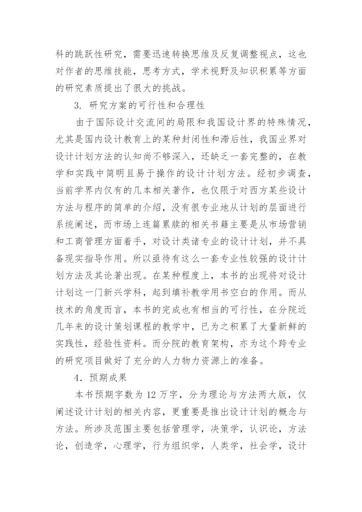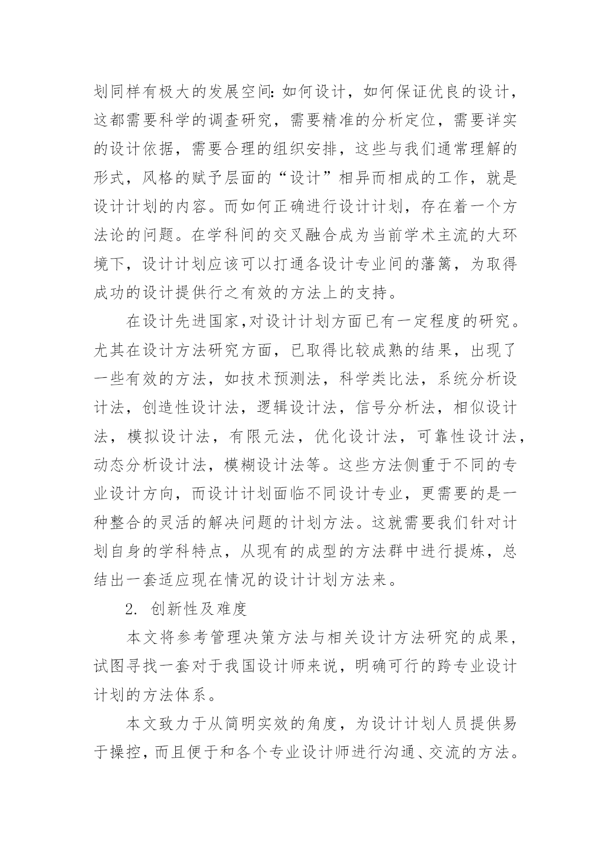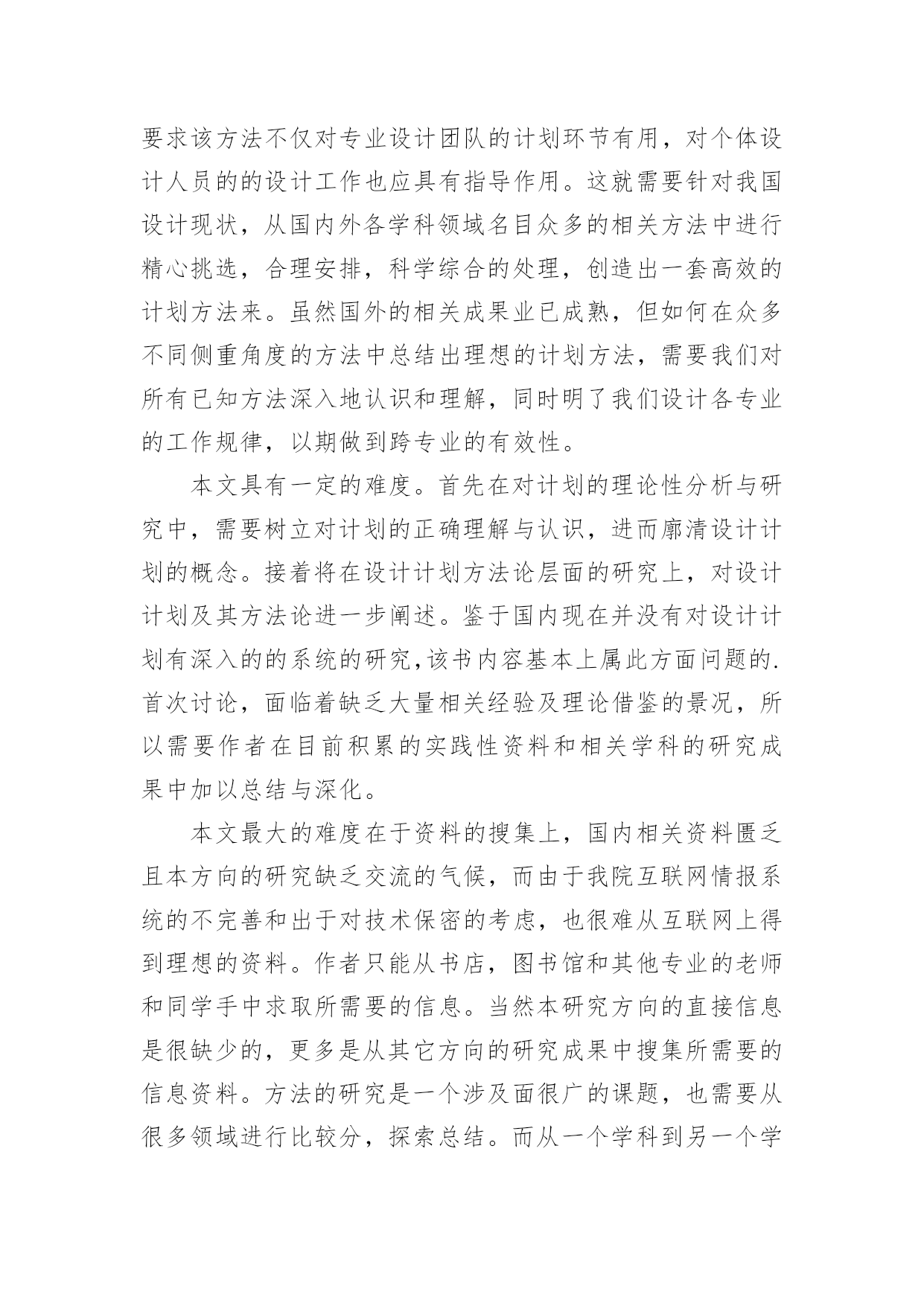 设计策划硕士毕业论文开题报告在社会的各个领域,大家都经常看到论文的身影吧,论文是探讨问题进行学术研究的一种手段。那么问题来了,到底应如何写一篇优秀的论文呢?下面是小编帮大家整理的设计策划硕士毕业论文开题报告,仅供参考,希望能够帮助到大家。一.简述设计计划学是一门新兴的综合性边缘学科,它研究的是如何保证设计的优良度和高效性,以及如何指导设计的展开。在设计需要科学计划这一概念已成为现代设计界共识的情况下,我国业界内部对设计计划学的认识与研究,还没有跟上设计发展需要的步伐。针对我国设计教育现状,本书将就该学科的教学方面,提出一套科学的行之有效的设计计划方法。以期为设计类学生深入理解设计,更好地掌握设计的方法提供必要的指导。二.学术价值分析1.选题依据计划在今天已逐渐成为一门显学,大至国家事务,小至个人日常生活,社会各个领域都离不开计划,各类大大小小的成功项目,很大程度上都自觉或不自觉地导入,实施了相应的计划活动。计划学的兴起是知识经济时代资源整合化的大势所趋。而反映到艺术设计学的领域,我们可以发现,计划同样有极大的发展空间:如何设计,如何保证优良的设计,这都需要科学的调查研究,需要精准的分析定位,需要详实的设计依据,需要合理的组织安排,这些与我们通常理解的形式,风格的赋予层面的“设计”相异而相成的工作,就是设计计划的内容。而如何正确进行设计计划,存在着一个方法论的问题。在学科间的交叉融合成为当前学术主流的大环境下,设计计划应该可以打通各设计专业间的藩篱,为取得成功的设计提供行之有效的方法上的支持。在设计先进国家,对设计计划方面已有一定程度的研究。尤其在设计方法研究方面,已取得比较成熟的结果,出现了一些有效的方法,如技术预测法,科学类比法,系统分析设计法,创造性设计法,逻辑设计法,信号分析法,相似设计法,模拟设计法,有限元法,优化设计法,可靠性设计法,动态分析设计法,模糊设计法等。这些方法侧重于不同的专业设计方向,而设计计划面临不同设计专业,更需要的是一种整合的灵活的解决问题的计划方法。这就需要我们针对计划自身的学科特点,从现有的成型的方法群中进行提炼,总结出一套适应现在情况的设计计划方法来。2.创新性及难度本文将参考管理决策方法与相关设计方法研究的成果,试图寻找一套对于我国设计师来说,明确可行的跨专业设计计划的方法体系。本文致力于从简明实效的角度,为设计计划人员提供易于操控,而且便于和各个专业设计师进行沟通、交流的方法。要求该方法不仅对专业设计团队的计划环节有用,对个体设计人员的的设计工作也应具有指导作用。这就需要针对我国设计现状,从国内外各学科领域名目众多的相关方法中进行精心挑选,合理安排,科学综合的处理,创造出一套高效的计划方法来。虽然国外的相关成果业已成熟,但如何在众多不同侧重角度的方法中总结出理想的计划方法,需要我们对所有已知方法深入地认识和理解,同时明了我们设计各专业的工作规律,以期做到跨专业的有效性。本文具有一定的难度。首先在对计划的理论性分析与研究中,需要树立对计划的正确理解与认识,进而廓清设计计划的概念。接着将在设计计划方法论层面的研究上,对设计计划及其方法论进一步阐述。鉴于国内现在并没有对设计计划有深入的的系统的研究,该书内容基本上属此方面问题的.首次讨论,面临着缺乏大量相关经验及理论借鉴的景况,所以需要作者在目前积累的实践性资料和相关学科的研究成果中加以总结与深化。本文最大的难度在于资料的搜集上,国内相关资料匮乏且本方向的研究缺乏交流的气候,而由于我院互联网情报系统的不完善和出于对技术保密的考虑,也很难从互联网上得到理想的资料。作者只能从书店,图书馆和其他专业的老师和同学手中求取所需要的信息。当然本研究方向的直接信息是很缺少的,更多是从其它方向的研究成果中搜集所需要的信息资料。方法的研究是一个涉及面很广的课题,也需要从很多领域进行比较分,探索总结。而从一个学科到另一个学科的跳跃性研究,需要迅速转换思维及反复调整视点,这也对作者的思维技能,思考方式,学术视野及知识积累等方面的研究素质提出了很大的挑战。3.研究方案的可行性和合理性由于国际设计交流间的局限和我国设计界的特殊情况,尤其是国内设计教育上的某种封闭性和滞后性,我国业界对设计计划方法的认知尚不够深入,还缺乏一套完整的,在教学和实践中简明且易于操作的设计计划方法。经初步调查,当前学界内仅有的几本相关著作,也仅限于对西方某些设计方法与程序的简单的介绍,没有很专业地从计划的层面进行系统阐述,而市场上连篇累牍的相关书籍主要是从市场营销和工商管理方面着手,对设计类诸专业的设计计划,并不具备现实指导作用。所以亟待有这么一套专业性较强的设计计划方法及其论著出现。在某种程度上,本书的出现将对设计计划这一门新兴学科,起到填补教学用书空白的作用。而从技术的角度而言,本书的完成