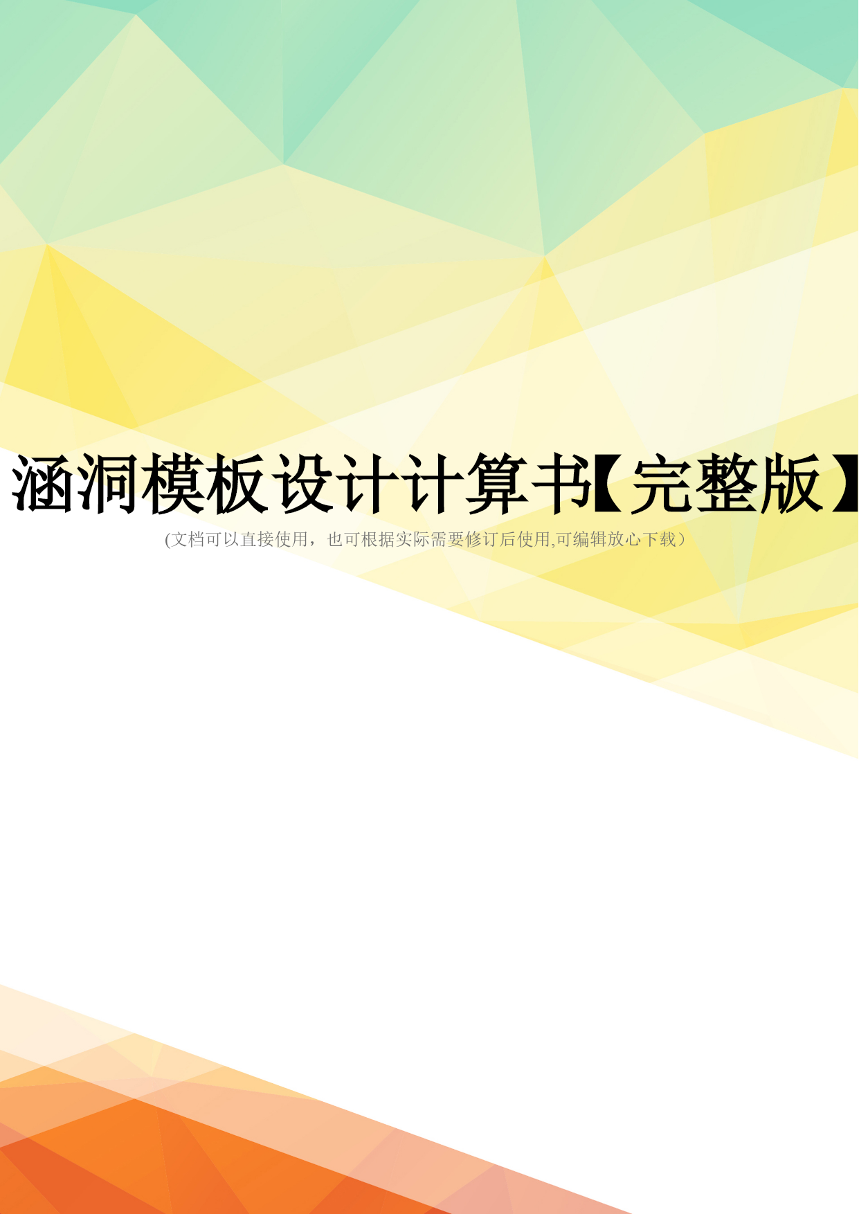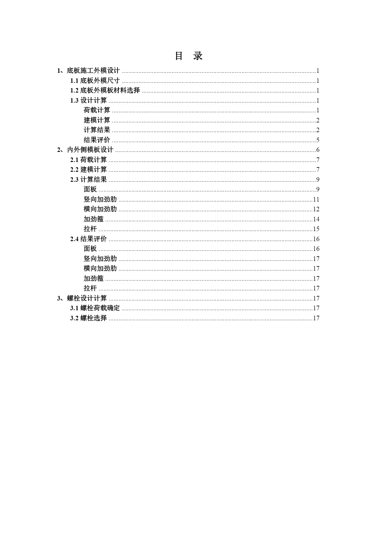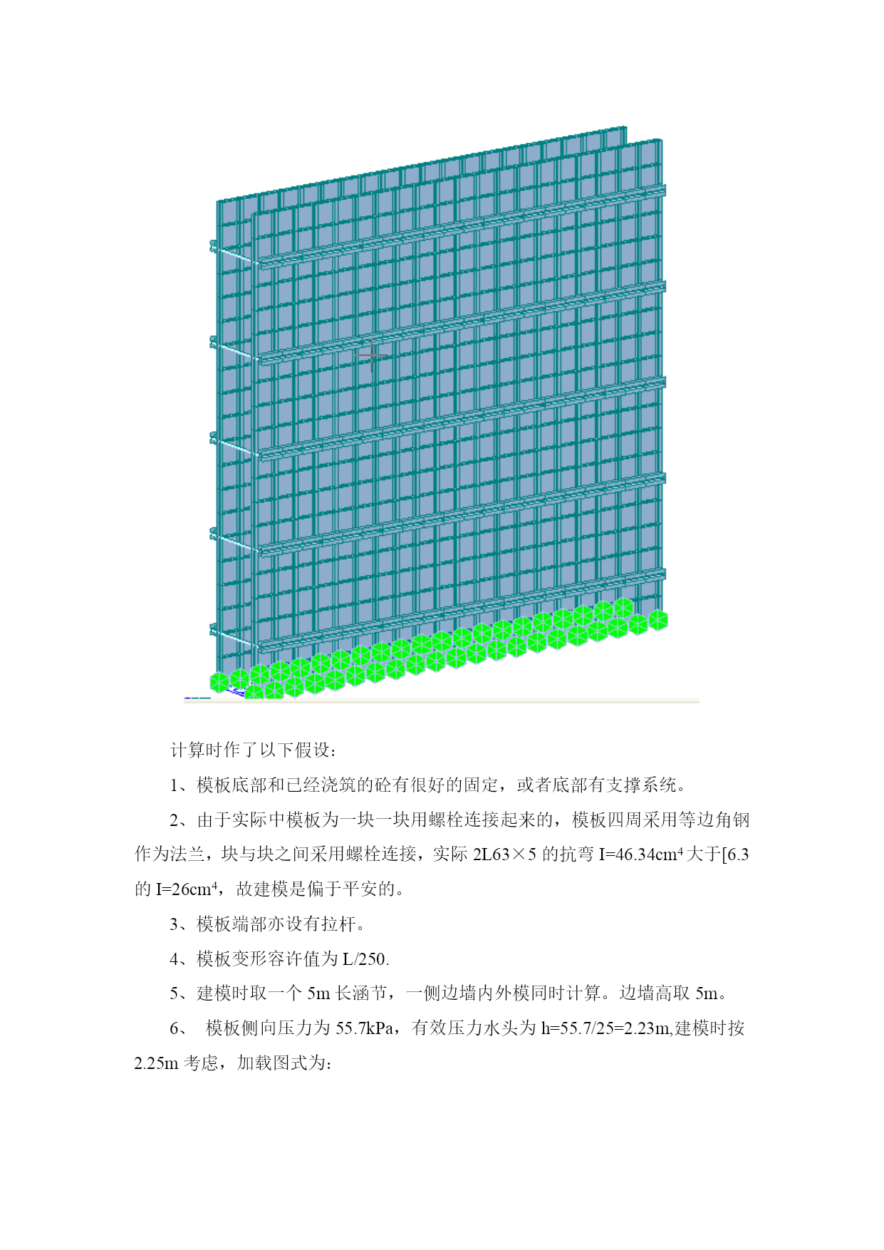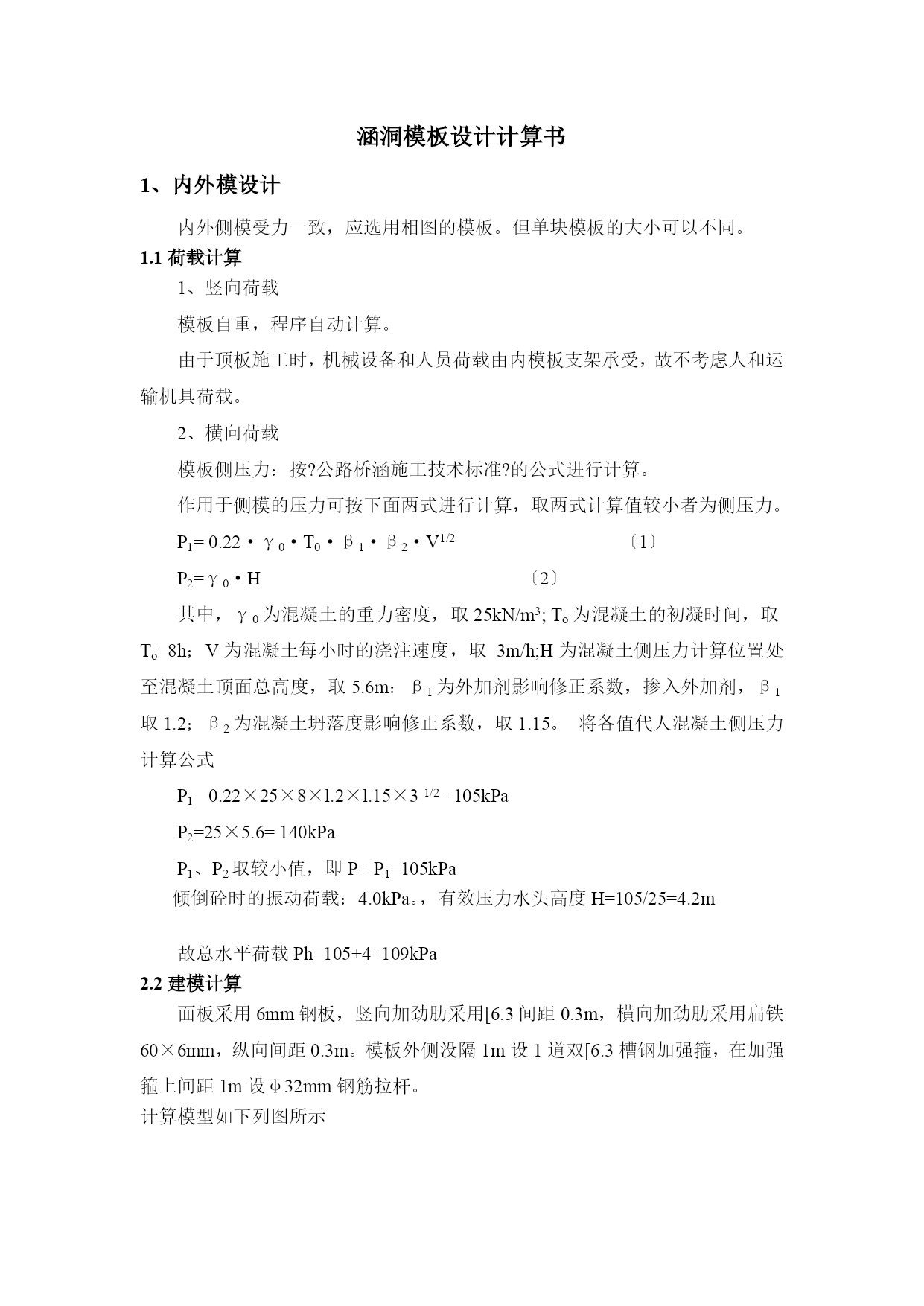 涵洞模板设计计算书【完整版】(文档可以直接使用,也可根据实际需要修订后使用,可编辑放心下载)××铁路云南段站前三标涵洞模板设计计算书复核:编制日期:2021.4.21目录TOC\o"1-3"\h\z\uHYPERLINK\l"_Toc291187480"1、底板施工外模设计PAGEREF_Toc291187480\h1HYPERLINK\l"_Toc291187481"1.1底板外模尺寸PAGEREF_Toc291187481\h1HYPERLINK\l"_Toc291187482"1.2底板外模板材料选择PAGEREF_Toc291187482\h1HYPERLINK\l"_Toc291187483"1.3设计计算PAGEREF_Toc291187483\h1HYPERLINK\l"_Toc291187484"荷载计算PAGEREF_Toc291187484\h1HYPERLINK\l"_Toc291187485"建模计算PAGEREF_Toc291187485\h2HYPERLINK\l"_Toc291187486"计算结果PAGEREF_Toc291187486\h2HYPERLINK\l"_Toc291187487"结果评价PAGEREF_Toc291187487\h5HYPERLINK\l"_Toc291187488"2、内外侧模板设计PAGEREF_Toc291187488\h6HYPERLINK\l"_Toc291187489"2.1荷载计算PAGEREF_Toc291187489\h7HYPERLINK\l"_Toc291187490"2.2建模计算PAGEREF_Toc291187490\h7HYPERLINK\l"_Toc291187491"2.3计算结果PAGEREF_Toc291187491\h9HYPERLINK\l"_Toc291187492"面板PAGEREF_Toc291187492\h9HYPERLINK\l"_Toc291187493"竖向加劲肋PAGEREF_Toc291187493\h11HYPERLINK\l"_Toc291187494"横向加劲肋PAGEREF_Toc291187494\h12HYPERLINK\l"_Toc291187495"加劲箍PAGEREF_Toc291187495\h14HYPERLINK\l"_Toc291187496"拉杆PAGEREF_Toc291187496\h15HYPERLINK\l"_Toc291187497"2.4结果评价PAGEREF_Toc291187497\h16HYPERLINK\l"_Toc291187498"面板PAGEREF_Toc291187498\h16HYPERLINK\l"_Toc291187499"竖向加劲肋PAGEREF_Toc291187499\h17HYPERLINK\l"_Toc291187500"横向加劲肋PAGEREF_Toc291187500\h17HYPERLINK\l"_Toc291187501"加劲箍PAGEREF_Toc291187501\h17HYPERLINK\l"_Toc291187502"拉杆PAGEREF_Toc291187502\h17HYPERLINK\l"_Toc291187503"3、螺栓设计计算PAGEREF_Toc291187503\h17HYPERLINK\l"_Toc291187504"3.1螺栓荷载确定PAGEREF_Toc291187504\h17HYPERLINK\l"_Toc291187505"3.2螺栓选择PAGEREF_Toc291187505\h17涵洞模板设计计算书1、内外模设计内外侧模受力一致,应选用相图的模板。但单块模板的大小可以不同。1.1荷载计算1、竖向荷载模板自重,程序自动计算。由于顶板施工时,机械设备和人员荷载由内模板支架承受,故不考虑人和运输机具荷载。2、横向荷载模板侧压力:按?公路桥涵施工技术标准?的公式进行计算。作用于侧模的压力可按下面两式进行计算,取两式计算值较小者为侧压力。P1=0.22·γ0·T0·β1·β2·V1/2〔1