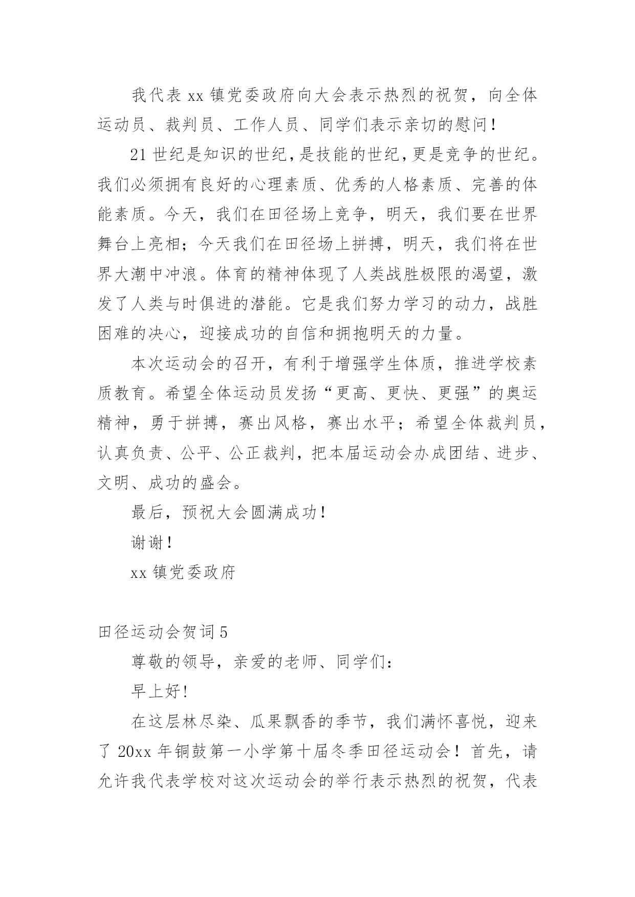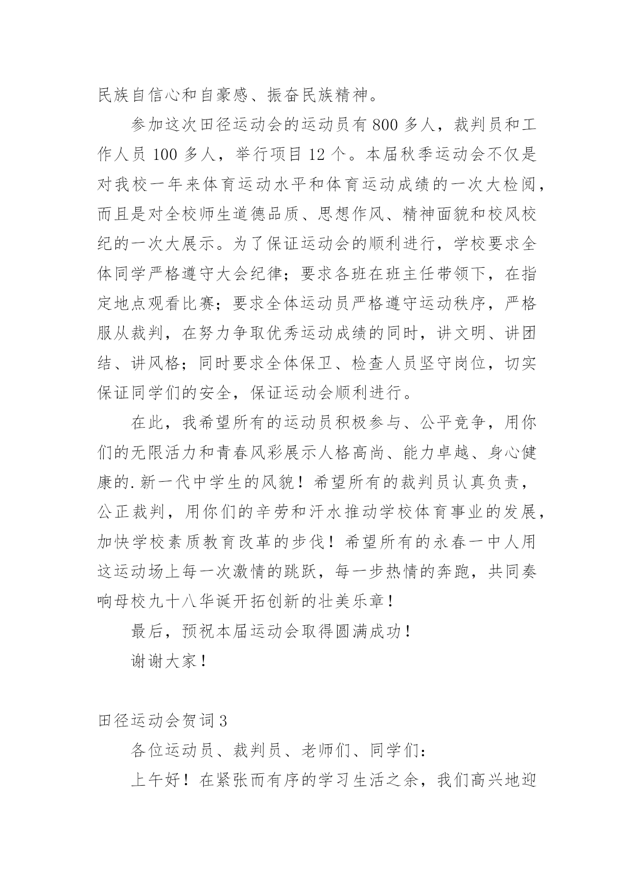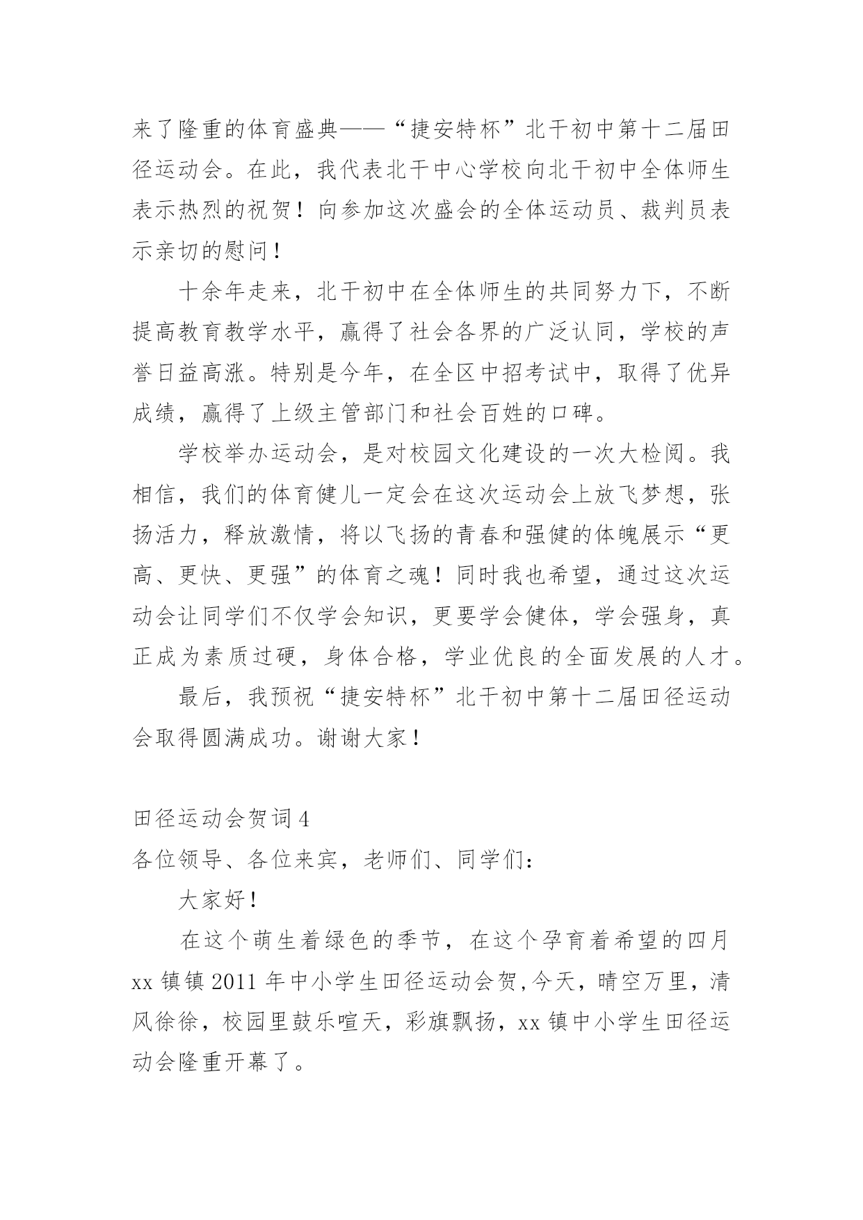 田径运动会贺词在生活、工作和学习中,要用到贺词的地方还是很多的,贺词要求感情真挚,切合身份,用语准确可靠。那么问题来了,到底什么样的贺词才是走心的呢?以下是小编为大家收集的田径运动会贺词,欢迎大家分享。田径运动会贺词1各位运动员、裁判员、老师们、同学们:在紧张而有序的学习生活之余,我们高兴地迎来了襄城一高初中部隆重的体育盛典——秋季田径运动会。在此,我代表县教体局向一高初中部全体师生表示热烈的祝贺!向参加这次盛会的全体运动员、裁判员表示亲切的慰问!两年来,襄城一高初中部在县教体局的领导下,不断提高教育教学水平,赢得了社会各界的广泛认同,学校的声誉日益高涨。特别是今年,在全县中招考试中,初中部荣获三项全县第一,迅速跻身于我县基层教育强校的前列。如今的襄城一高初中部,勤教乐学蔚然成风,校园校貌焕然一新,办学条件又上了一个新台阶。学校举办运动会,是对校园文化建设的一次大检阅。我相信,我们的运动员们一定会在这次运动会上大显身手,充分展示自我,赛出水平,赛出风格。同时我也希望,通过这次运动会进一步推动我县基层体育事业的发展,让同学们不仅学会知识,更要学会健体,学会强身,真正成为素质过硬,身体合格,学业优良的全面发展的人才。最后,我预祝襄城一高初中部秋季田径运动会取得圆满成功。田径运动会贺词2老师、同学们:大家好!今年的10月17日是永春一中98周年华诞。近一个世纪来,永春一中人在这块美丽的土地上挥洒心血和智慧,四万余名学子从这里起步,走向人生的辉煌。永春一中成为响誉泉州市乃至福建省的一级达标中学。目前学校全体师生员工正积极努力,进一步明确办学方向,全面贯彻党的教育方针,深化教育改革,全面提高质量,逐步实现教育思想、教学内容、学校管理、教育技术和教学设施的现代化。在上级部门和当地政府的领导、支持下,在社会各界和海内外校友的关心、帮助下,同心同德、奋勇拼搏,为建设全国示范性普通高级中学而努力奋斗!时代在进步,社会在发展。现代的人才观,不仅要求建设者要有较高水平的专业知识、实践能力和创新精神,还要求有健全的人格、健壮的身体、健康的心理。体育运动,是学校培养德、智、体、美全面发展一代新人不可缺少的重要内容。现代体育运动,它的意义已超出了强身健体的范畴。它不但可以增强人民体质,而且可以培养强烈的爱国主义情感、集体主义精神和自强不息、坚韧不拔的意志,可以增强民族自信心和自豪感、振奋民族精神。参加这次田径运动会的运动员有800多人,裁判员和工作人员100多人,举行项目12个。本届秋季运动会不仅是对我校一年来体育运动水平和体育运动成绩的一次大检阅,而且是对全校师生道德品质、思想作风、精神面貌和校风校纪的一次大展示。为了保证运动会的顺利进行,学校要求全体同学严格遵守大会纪律;要求各班在班主任带领下,在指定地点观看比赛;要求全体运动员严格遵守运动秩序,严格服从裁判,在努力争取优秀运动成绩的同时,讲文明、讲团结、讲风格;同时要求全体保卫、检查人员坚守岗位,切实保证同学们的安全,保证运动会顺利进行。在此,我希望所有的运动员积极参与、公平竞争,用你们的无限活力和青春风彩展示人格高尚、能力卓越、身心健康的.新一代中学生的风貌!希望所有的裁判员认真负责,公正裁判,用你们的辛劳和汗水推动学校体育事业的发展,加快学校素质教育改革的步伐!希望所有的永春一中人用这运动场上每一次激情的跳跃,每一步热情的奔跑,共同奏响母校九十八华诞开拓创新的壮美乐章!最后,预祝本届运动会取得圆满成功!谢谢大家!田径运动会贺词3各位运动员、裁判员、老师们、同学们:上午好!在紧张而有序的学习生活之余,我们高兴地迎来了隆重的体育盛典——“捷安特杯”北干初中第十二届田径运动会。在此,我代表北干中心学校向北干初中全体师生表示热烈的祝贺!向参加这次盛会的全体运动员、裁判员表示亲切的慰问!十余年走来,北干初中在全体师生的共同努力下,不断提高教育教学水平,赢得了社会各界的广泛认同,学校的声誉日益高涨。特别是今年,在全区中招考试中,取得了优异成绩,赢得了上级主管部门和社会百姓的口碑。学校举办运动会,是对校园文化建设的一次大检阅。我相信,我们的体育健儿一定会在这次运动会上放飞梦想,张扬活力,释放激情,将以飞扬的青春和强健的体魄展示“更高、更快、更强”的体育之魂!同时我也希望,通过这次运动会让同学们不仅学会知识,更要学会健体,学会强身,真正成为素质过硬,身体合格,学业优良的全面发展的人才。最后,我预祝“捷安特杯”北干初中第十二届田径运动会取得圆满成功。谢谢大家!田径运动会贺词4各位领导、各位来宾,老师们、同学们:大家好!在这个萌生着绿色的季节,在这个孕育着希望的四月xx镇镇2011年中小学生田径运动会贺,今天,晴空万里,清风徐徐,校园里鼓乐喧天,彩旗飘扬,xx镇中小学生田径运动会隆重开幕了。我代表xx镇党委政府