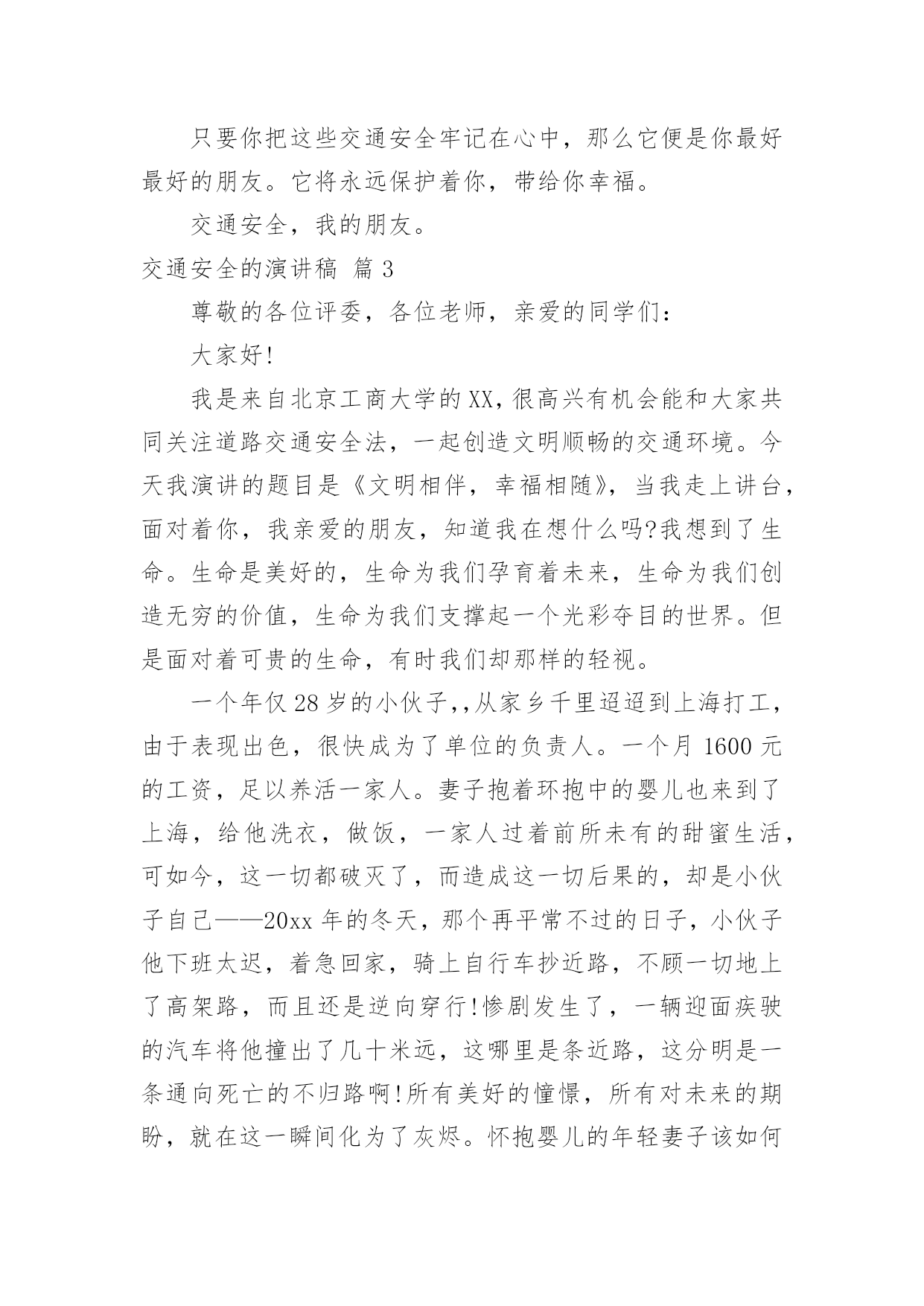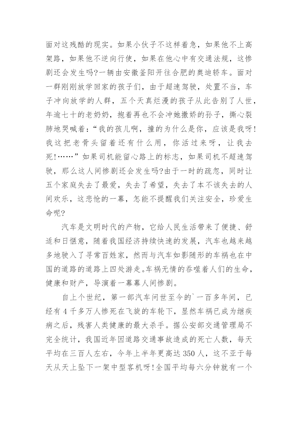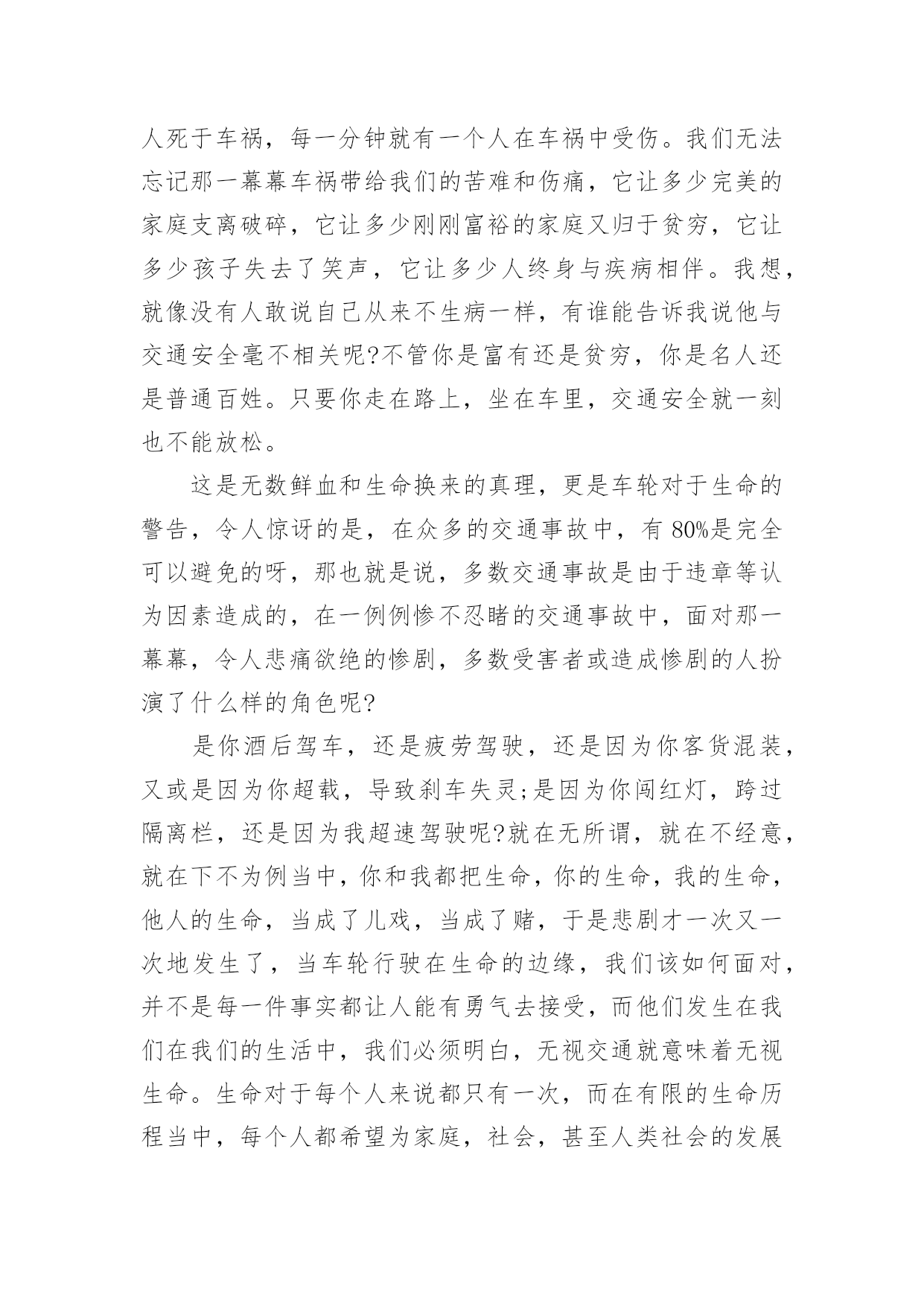 交通安全的演讲稿交通安全的演讲稿模板汇编三篇演讲稿可以起到整理演讲者的思路、提示演讲的内容、限定演讲的速度的作用。在日常生活和工作中,演讲稿使用的情况越来越多,还是对演讲稿一筹莫展吗?下面是小编精心整理的交通安全的演讲稿6篇,欢迎阅读与收藏。交通安全的演讲稿篇1亲爱的老师、同学们:大家好!从小,幼儿园的阿姨就教我们遵守交通规则,“红灯停,绿灯行”的儿歌深深印在我的脑海里,现实中我早已养成了这样的习惯。然而,我发现就在我们身边的许多成年人,却把交通安全不当回事。尤其是我上学的那条路,要经过两个十字路口,都有交通信号指示灯,可是来来往往的人流车流之中,总有大多数不按照红绿灯的规则通行,反而给一小部分遵守交通规则的.人,带来了极不安全的威胁,常常会发生惨不忍睹的悲剧。每当我看到那些不分红绿灯的行人车辆横行霸道时,心中除了恐惧还有无比的愤恨。因为三年前,我亲身经历的一场车祸,给我幼小的心灵留下了永不磨灭的创伤。那是一个星期六的上午,我和妈妈在超市买了一些生活用品后,妈妈用自行车带着我在回家的路上,我们按照绿灯指示刚穿过十字路口,右侧一两摩托车闯过红灯,一边用手机发短信,一边快速向我们驶来,他似乎根本没有在乎我们的存在,妈妈躲闪不及,一刹那就撞上我们的自行车。顿时,我和妈妈被这突如其来的冲击力,甩出三米以外的路边,失控的自行车调转方向,横在路中央,后轮胎已经扭曲成麻花状。由于妈妈是面部着地,眼镜摔碎了,左脸、下巴、左侧肩部、手掌、膝盖部的皮肤擦在水泥地上,衣服撕乱了,血肉模糊,她强忍着痛苦坚强的爬起来,四处寻找我。我从迅速围观的人缝中爬起来,也在寻找妈妈,虽然腿和手臂都擦破了皮流着血,但是我没有哭,只是被这样恐怖的场面吓呆了,傻呼呼的看着妈妈的样子,一句话也说不出来。可是那个罪恶的摩托车驾驶人,却在一边袖手旁观。在围观人的帮助下,给110打了报警电话。我们被110送往医院治疗,经检查妈妈大面积皮肤损伤,左手掌骨折,治疗两个多月才基本恢复。幸好我只是部分皮外伤,一个多星期就恢复了健康。这件事虽然过去很久很久了,可是我一直想不明白,肇事人闯红灯、打手机违章撞人,制造了交通事故,却在交警赶到现场以后“溜之大吉”,至今没有下落,他可以不负任何责任逃之夭夭,他的良心何在?警察的办案能力又在何处?他们都可以不了了之,可是给我们造成的经济损失,带来的痛苦,尤其是精神上的伤害是无法弥补的。我们每天上学、放学,都是路上最拥挤的时候,一不小心,就可能发生意外。我每次路过十字路口时都会提心吊胆,看到那么多的人流和车流,都不管红灯怎样的警告,总是勇往直前。而我们小学生面对红灯不能行,等到绿灯也行不通,这样的交通状况和社会环境哪有安全可言。请给我们学生一点交通安全感。交通安全的演讲稿篇2亲爱的同学们:大家好!交通安全与我们的关系是非常密切的,它就像我们的朋友。日日夜夜都守在我们的身边,教育我们,劝戒我们。生命是宝贵的,人的一生就只有一次生命,我们应该爱惜生命。注意交通安全也是爱惜生命的一部分。现在因为交通事故而死于非命的人太多了,难道他们不是死的太冤枉了吗?交通安全,我们应当牢记在心。更主要的,是要知道交通安全常识:首先,行人须在人行通道内行走,没有人行道靠右边行走;穿越马路须走人行横道(斑马线);通过有交通信号控制的`人行横道,须遵守信号的规定;通过没有交通信号控制的人行道,要左顾右盼,注意车辆来往,不准追逐,奔跑;有人行过街天桥或地道时,须走人行街天桥或地道;不准爬马路边和路中的护栏、隔离栏,不准在道路上扒车、追车、强行拦车或抛物击车。那么,有红绿灯的情况下,该怎么办呢?不用着急,请看:绿灯亮时,准许行人通过斑马线;绿灯闪烁时,不准行人进入人行横道,但已经进入人行横道的可以继续通行;红灯亮时,不准行人进入人行横道。只要你把这些交通安全牢记在心中,那么它便是你最好最好的朋友。它将永远保护着你,带给你幸福。交通安全,我的朋友。交通安全的演讲稿篇3尊敬的各位评委,各位老师,亲爱的同学们:大家好!我是来自北京工商大学的XX,很高兴有机会能和大家共同关注道路交通安全法,一起创造文明顺畅的交通环境。今天我演讲的题目是《文明相伴,幸福相随》,当我走上讲台,面对着你,我亲爱的朋友,知道我在想什么吗?我想到了生命。生命是美好的,生命为我们孕育着未来,生命为我们创造无穷的价值,生命为我们支撑起一个光彩夺目的世界。但是面对着可贵的生命,有时我们却那样的轻视。一个年仅28岁的小伙子,,从家乡千里迢迢到上海打工,由于表现出色,很快成为了单位的负责人。一个月1600元的工资,足以养活一家人。妻子抱着环抱中的婴儿也来到了上海,给他洗衣,做饭,一家人过着前所未有的甜蜜生活,可如今,这一切都破灭了,而造成这一切后果的,却是小伙子自己——20xx年的冬天,那个再平常不过的日子,小伙子他下班