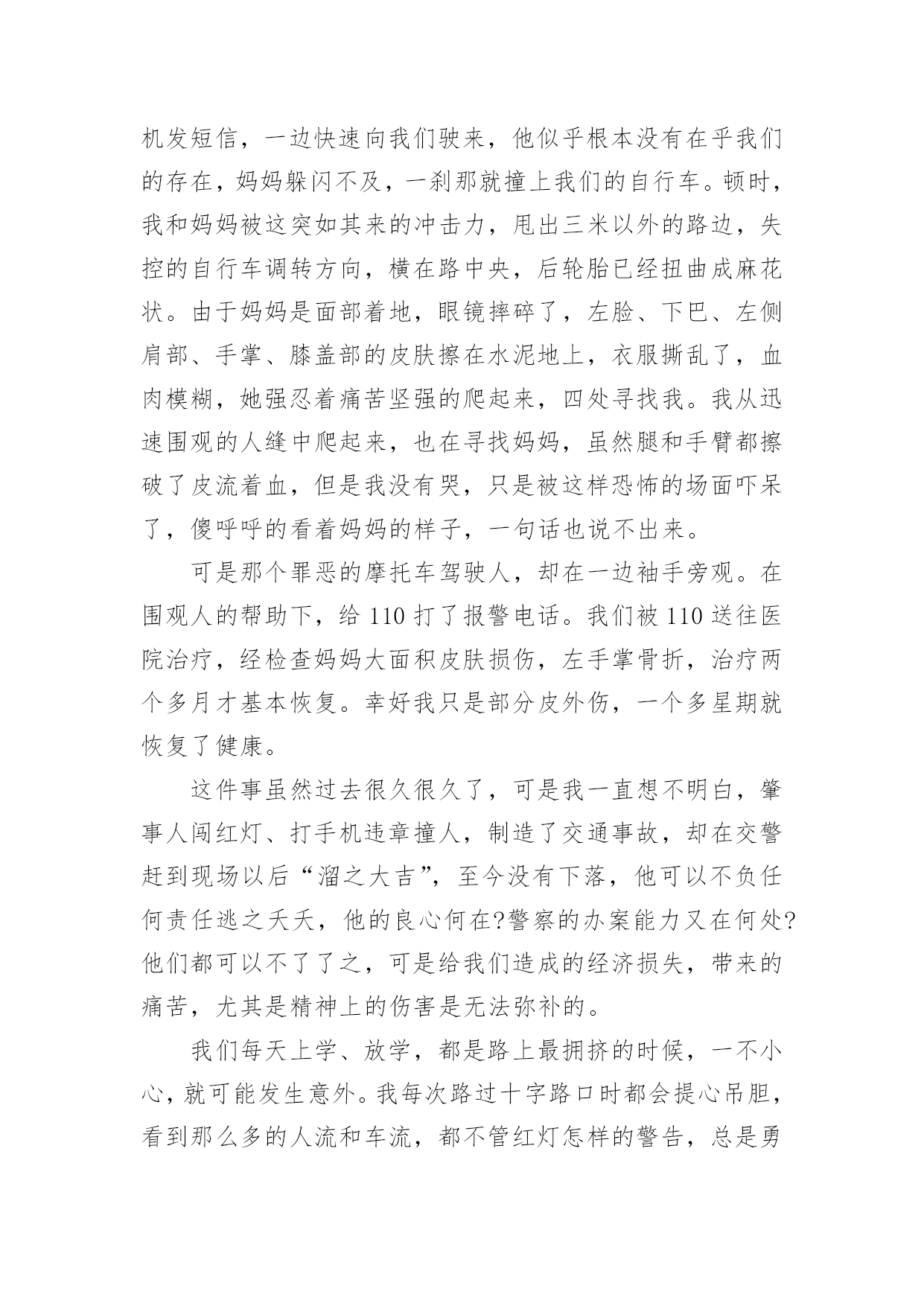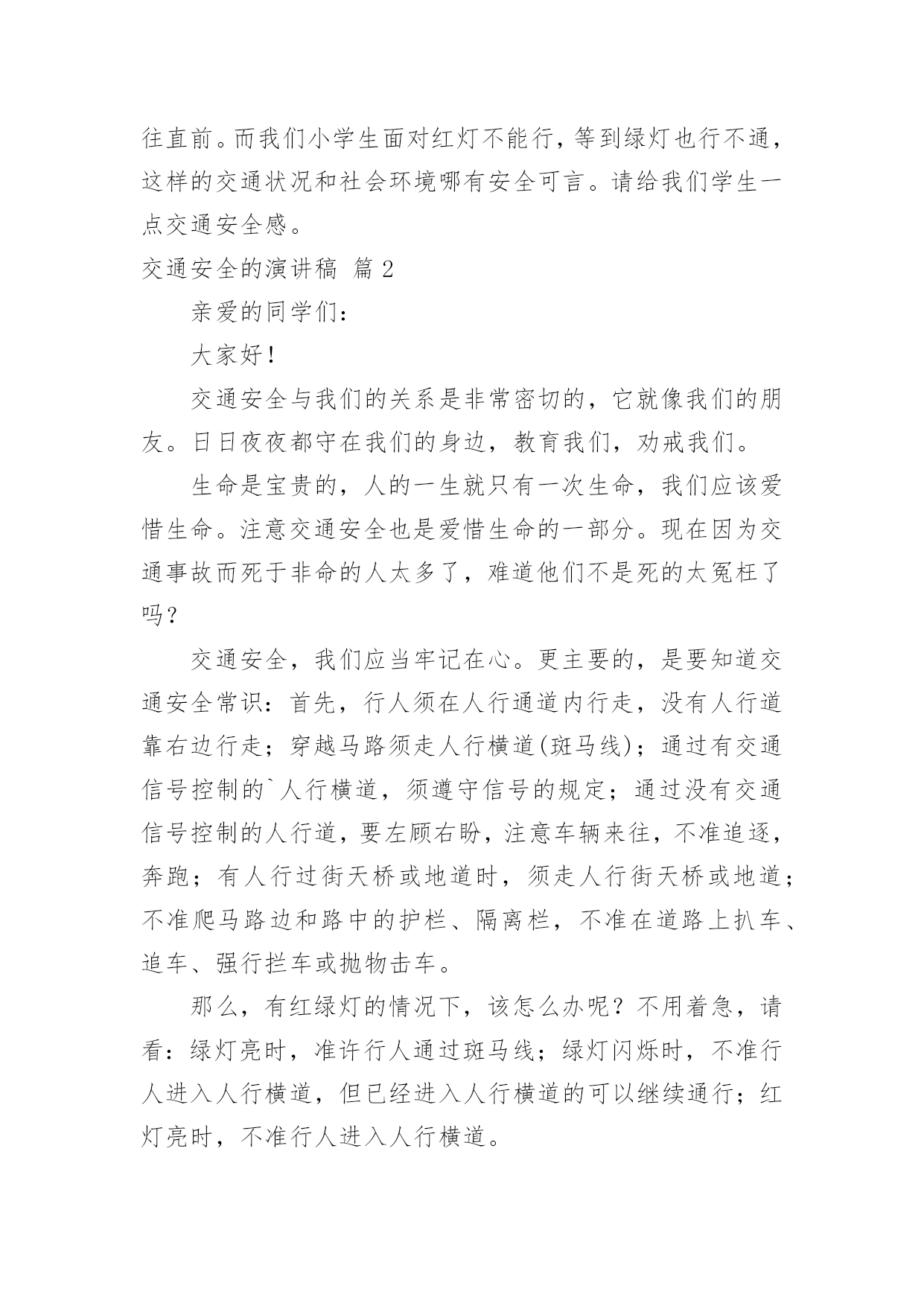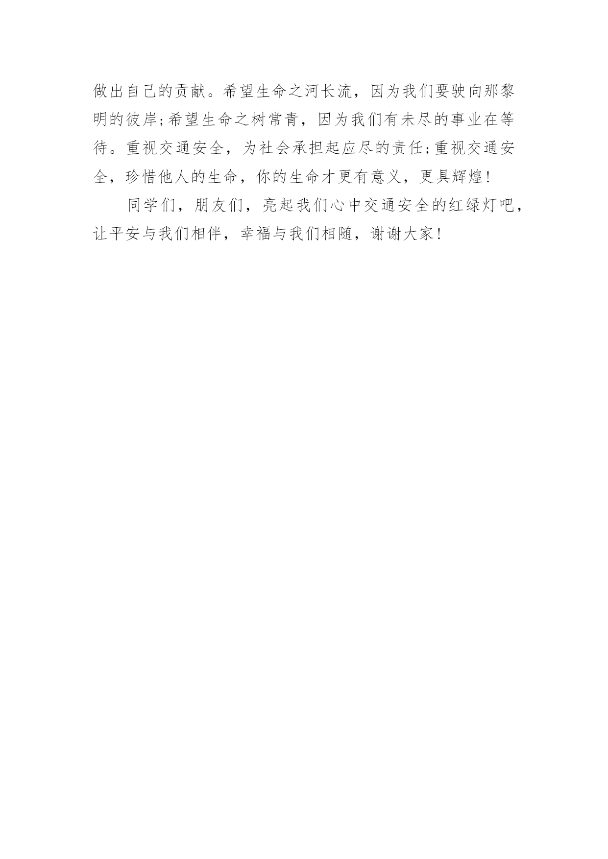 交通安全的演讲稿交通安全的演讲稿模板汇编三篇演讲稿可以起到整理演讲者的思路、提示演讲的内容、限定演讲的速度的作用。在日常生活和工作中,演讲稿使用的情况越来越多,还是对演讲稿一筹莫展吗?下面是小编精心整理的交通安全的演讲稿6篇,欢迎阅读与收藏。交通安全的演讲稿篇1亲爱的老师、同学们:大家好!从小,幼儿园的阿姨就教我们遵守交通规则,“红灯停,绿灯行”的儿歌深深印在我的脑海里,现实中我早已养成了这样的习惯。然而,我发现就在我们身边的许多成年人,却把交通安全不当回事。尤其是我上学的那条路,要经过两个十字路口,都有交通信号指示灯,可是来来往往的人流车流之中,总有大多数不按照红绿灯的规则通行,反而给一小部分遵守交通规则的.人,带来了极不安全的威胁,常常会发生惨不忍睹的悲剧。每当我看到那些不分红绿灯的行人车辆横行霸道时,心中除了恐惧还有无比的愤恨。因为三年前,我亲身经历的一场车祸,给我幼小的心灵留下了永不磨灭的创伤。那是一个星期六的上午,我和妈妈在超市买了一些生活用品后,妈妈用自行车带着我在回家的路上,我们按照绿灯指示刚穿过十字路口,右侧一两摩托车闯过红灯,一边用手机发短信,一边快速向我们驶来,他似乎根本没有在乎我们的存在,妈妈躲闪不及,一刹那就撞上我们的自行车。顿时,我和妈妈被这突如其来的冲击力,甩出三米以外的路边,失控的自行车调转方向,横在路中央,后轮胎已经扭曲成麻花状。由于妈妈是面部着地,眼镜摔碎了,左脸、下巴、左侧肩部、手掌、膝盖部的皮肤擦在水泥地上,衣服撕乱了,血肉模糊,她强忍着痛苦坚强的爬起来,四处寻找我。我从迅速围观的人缝中爬起来,也在寻找妈妈,虽然腿和手臂都擦破了皮流着血,但是我没有哭,只是被这样恐怖的场面吓呆了,傻呼呼的看着妈妈的样子,一句话也说不出来。可是那个罪恶的摩托车驾驶人,却在一边袖手旁观。在围观人的帮助下,给110打了报警电话。我们被110送往医院治疗,经检查妈妈大面积皮肤损伤,左手掌骨折,治疗两个多月才基本恢复。幸好我只是部分皮外伤,一个多星期就恢复了健康。这件事虽然过去很久很久了,可是我一直想不明白,肇事人闯红灯、打手机违章撞人,制造了交通事故,却在交警赶到现场以后“溜之大吉”,至今没有下落,他可以不负任何责任逃之夭夭,他的良心何在?警察的办案能力又在何处?他们都可以不了了之,可是给我们造成的经济损失,带来的痛苦,尤其是精神上的伤害是无法弥补的。我们每天上学、放学,都是路上最拥挤的时候,一不小心,就可能发生意外。我每次路过十字路口时都会提心吊胆,看到那么多的人流和车流,都不管红灯怎样的警告,总是勇往直前。而我们小学生面对红灯不能行,等到绿灯也行不通,这样的交通状况和社会环境哪有安全可言。请给我们学生一点交通安全感。交通安全的演讲稿篇2亲爱的同学们:大家好!交通安全与我们的关系是非常密切的,它就像我们的朋友。日日夜夜都守在我们的身边,教育我们,劝戒我们。生命是宝贵的,人的一生就只有一次生命,我们应该爱惜生命。注意交通安全也是爱惜生命的一部分。现在因为交通事故而死于非命的人太多了,难道他们不是死的太冤枉了吗?交通安全,我们应当牢记在心。更主要的,是要知道交通安全常识:首先,行人须在人行通道内行走,没有人行道靠右边行走;穿越马路须走人行横道(斑马线);通过有交通信号控制的`人行横道,须遵守信号的规定;通过没有交通信号控制的人行道,要左顾右盼,注意车辆来往,不准追逐,奔跑;有人行过街天桥或地道时,须走人行街天桥或地道;不准爬马路边和路中的护栏、隔离栏,不准在道路上扒车、追车、强行拦车或抛物击车。那么,有红绿灯的情况下,该怎么办呢?不用着急,请看:绿灯亮时,准许行人通过斑马线;绿灯闪烁时,不准行人进入人行横道,但已经进入人行横道的可以继续通行;红灯亮时,不准行人进入人行横道。只要你把这些交通安全牢记在心中,那么它便是你最好最好的朋友。它将永远保护着你,带给你幸福。交通安全,我的朋友。交通安全的演讲稿篇3尊敬的各位评委,各位老师,亲爱的同学们:大家好!我是来自北京工商大学的XX,很高兴有机会能和大家共同关注道路交通安全法,一起创造文明顺畅的交通环境。今天我演讲的题目是《文明相伴,幸福相随》,当我走上讲台,面对着你,我亲爱的朋友,知道我在想什么吗?我想到了生命。生命是美好的,生命为我们孕育着未来,生命为我们创造无穷的价值,生命为我们支撑起一个光彩夺目的世界。但是面对着可贵的生命,有时我们却那样的轻视。一个年仅28岁的小伙子,,从家乡千里迢迢到上海打工,由于表现出色,很快成为了单位的负责人。一个月1600元的工资,足以养活一家人。妻子抱着环抱中的婴儿也来到了上海,给他洗衣,做饭,一家人过着前所未有的甜蜜生活,可如今,这一切都破灭了,而造成这一切后果的,却是小伙子自己——20xx年的冬天,那个再平常不过的日子,小伙子他下班
