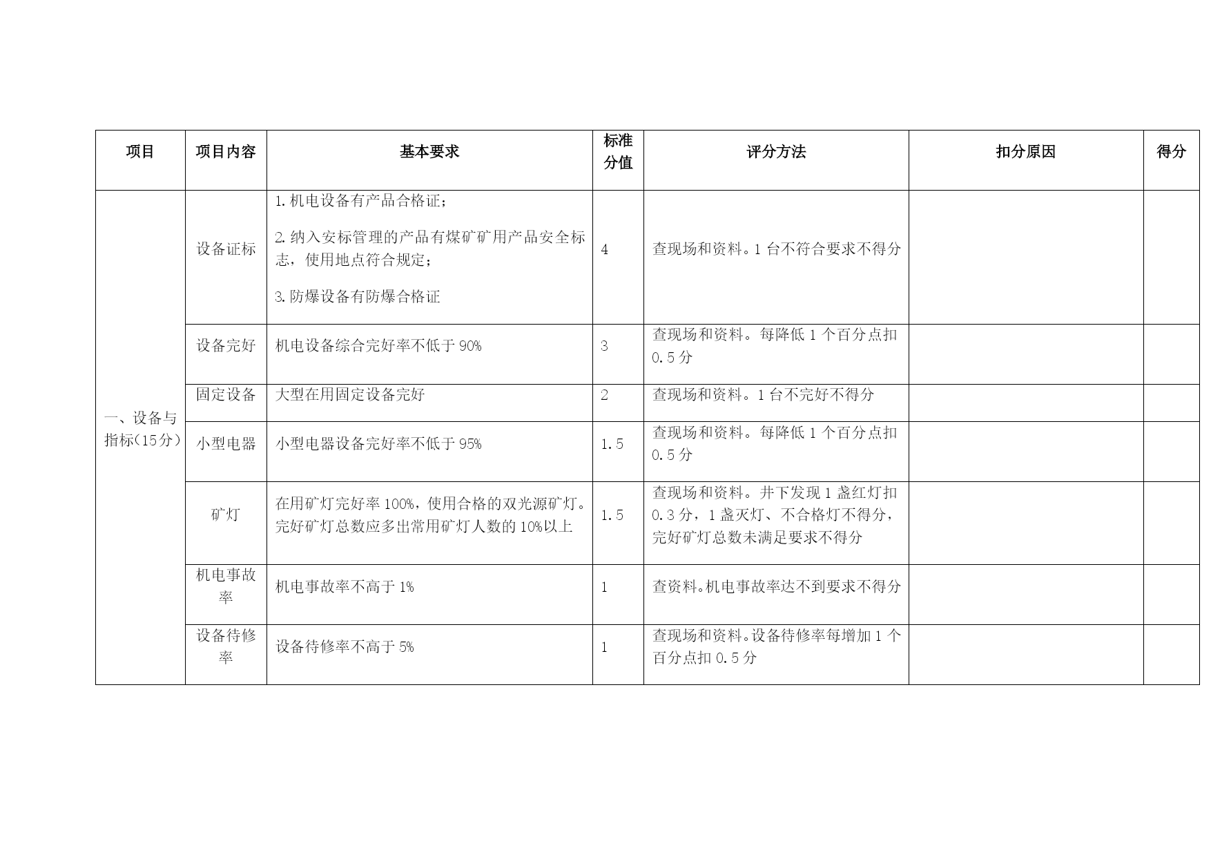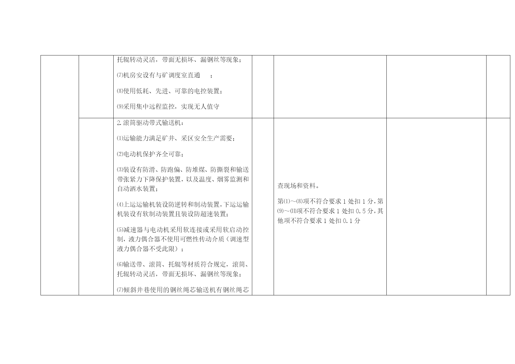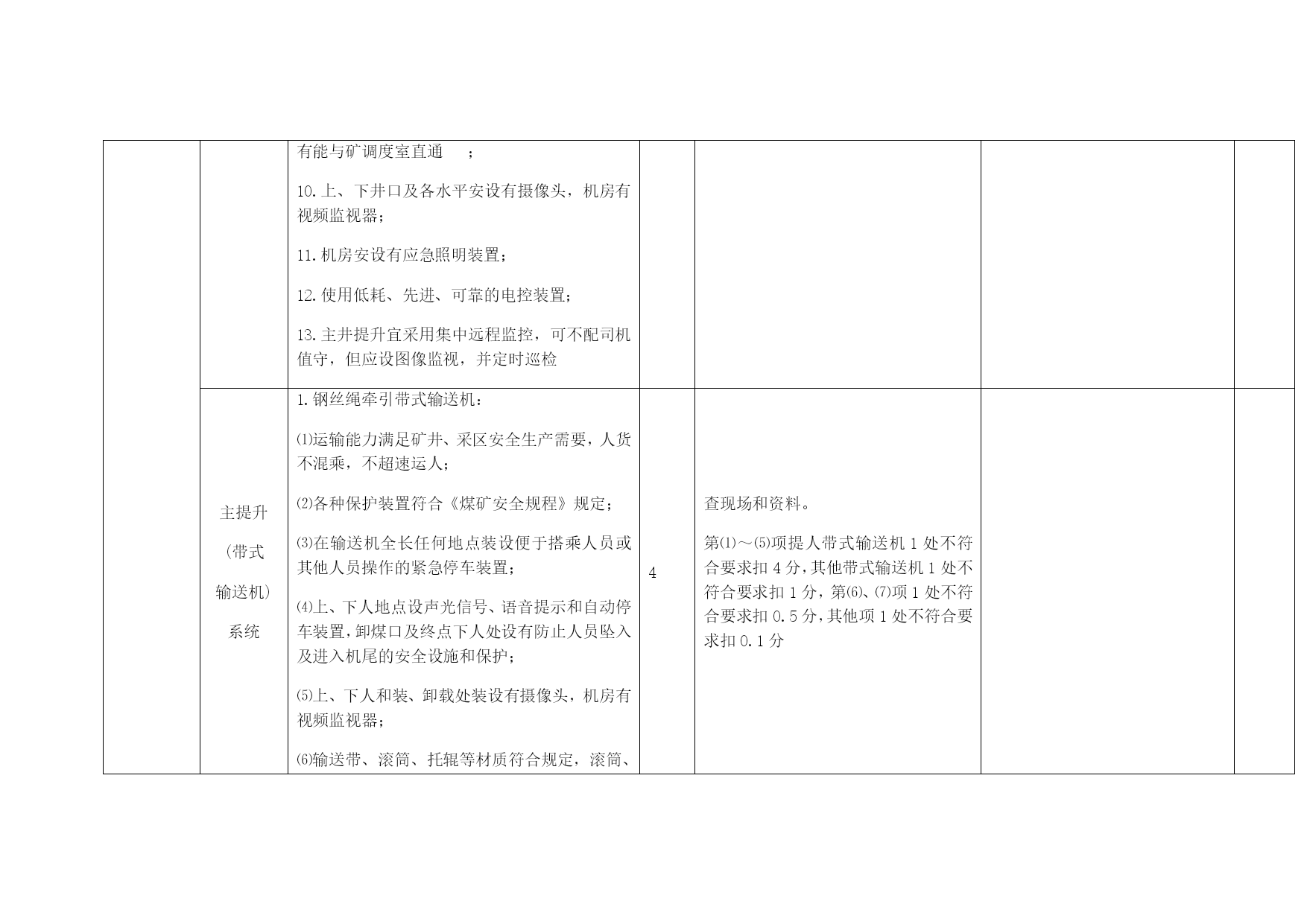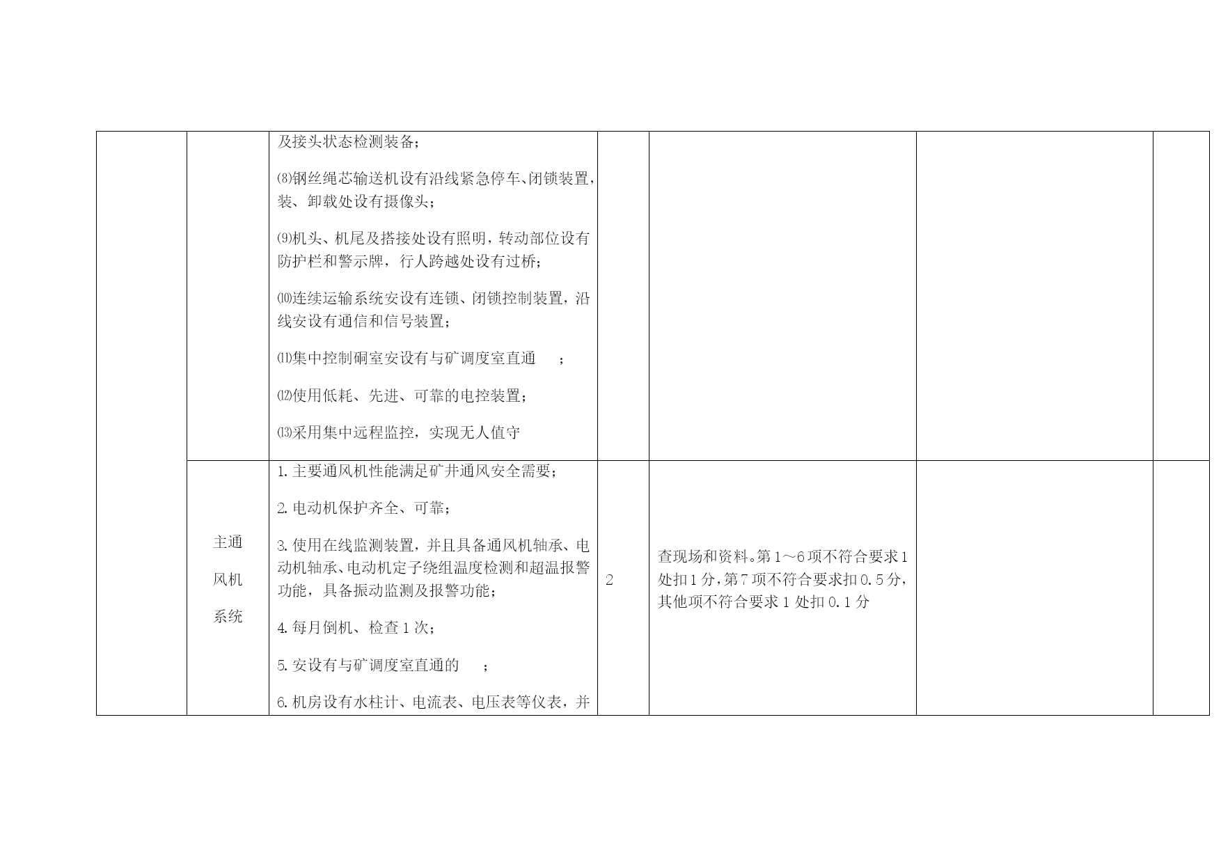 机电运输安全生产标准化验收评分表最新文档(可以直接使用,可编辑最新文档,欢迎下载)煤矿机电安全生产标准化评分表检查单位:专业得分:评定等级:检查时间:检查人:项目项目内容基本要求标准分值评分方法扣分原因得分一、设备与指标(15分)设备证标1.机电设备有产品合格证;2.纳入安标管理的产品有煤矿矿用产品安全标志,使用地点符合规定;3.防爆设备有防爆合格证4查现场和资料。1台不符合要求不得分设备完好机电设备综合完好率不低于90%3查现场和资料。每降低1个百分点扣0.5分固定设备大型在用固定设备完好2查现场和资料。1台不完好不得分小型电器小型电器设备完好率不低于95%1.5查现场和资料。每降低1个百分点扣0.5分矿灯在用矿灯完好率100%,使用合格的双光源矿灯。完好矿灯总数应多出常用矿灯人数的10%以上1.5查现场和资料。井下发现1盏红灯扣0.3分,1盏灭灯、不合格灯不得分,完好矿灯总数未满足要求不得分机电事故率机电事故率不高于1%1查资料。机电事故率达不到要求不得分设备待修率设备待修率不高于5%1查现场和资料。设备待修率每增加1个百分点扣0.5分设备大修改造设备更新改造按计划执行,设备大修计划应完成90%以上1查资料。无更新改造年度计划或未完成不得分;无大修计划或计划完成率全年低于90%,上半年低于30%不得分二、煤矿机械(20分)主提升(立斜井绞车)系统1.提升系统能力满足矿井安全生产需要;2.各种安全保护装置符合《煤矿安全规程》规定;3.立井提升装置的过卷过放、提升容器和载荷等符合《煤矿安全规程》规定;4.提升装置、连接装置及提升钢丝绳符合《煤矿安全规程》规定;5.制动装置可靠,副井及负力提升的系统使用可靠的电气制动;6.立井井口及各水平阻车器、安全门、摇台等与提升信号闭锁;7.提升速度大于3m/s的立井提升系统内,安设有防撞梁和缓冲托罐装置;单绳缠绕式双滚筒绞车安设有地锁和离合器闭锁;8.斜井提升制动减速度达不到要求时应设二级制动装置;9.提升系统通信、信号装置完善,主副井绞车房有能与矿调度室直通;10.上、下井口及各水平安设有摄像头,机房有视频监视器;11.机房安设有应急照明装置;12.使用低耗、先进、可靠的电控装置;13.主井提升宜采用集中远程监控,可不配司机值守,但应设图像监视,并定时巡检5查现场和资料。第1~9项提人绞车1处不符合要求“煤矿机械”大项不得分,其他绞车不符合要求1处扣1分,第10、11项不符合要求1处扣0.5分,其他项不符合要求1处扣0.1分主提升(带式输送机)系统1.钢丝绳牵引带式输送机:⑴运输能力满足矿井、采区安全生产需要,人货不混乘,不超速运人;⑵各种保护装置符合《煤矿安全规程》规定;⑶在输送机全长任何地点装设便于搭乘人员或其他人员操作的紧急停车装置;⑷上、下人地点设声光信号、语音提示和自动停车装置,卸煤口及终点下人处设有防止人员坠入及进入机尾的安全设施和保护;⑸上、下人和装、卸载处装设有摄像头,机房有视频监视器;⑹输送带、滚筒、托辊等材质符合规定,滚筒、托辊转动灵活,带面无损坏、漏钢丝等现象;⑺机房安设有与矿调度室直通;⑻使用低耗、先进、可靠的电控装置;⑼采用集中远程监控,实现无人值守4查现场和资料。第⑴~⑸项提人带式输送机1处不符合要求扣4分,其他带式输送机1处不符合要求扣1分,第⑹、⑺项1处不符合要求扣0.5分,其他项1处不符合要求扣0.1分2.滚筒驱动带式输送机:⑴运输能力满足矿井、采区安全生产需要;⑵电动机保护齐全可靠;⑶装设有防滑、防跑偏、防堆煤、防撕裂和输送带张紧力下降保护装置,以及温度、烟雾监测和自动洒水装置;⑷上运运输机装设防逆转和制动装置,下运运输机装设有软制动装置且装设防超速装置;⑸减速器与电动机采用软连接或采用软启动控制,液力偶合器不使用可燃性传动介质(调速型液力偶合器不受此限);⑹输送带、滚筒、托辊等材质符合规定,滚筒、托辊转动灵活,带面无损坏、漏钢丝等现象;⑺倾斜井巷使用的钢丝绳芯输送机有钢丝绳芯及接头状态检测装备;⑻钢丝绳芯输送机设有沿线紧急停车、闭锁装置,装、卸载处设有摄像头;⑼机头、机尾及搭接处设有照明,转动部位设有防护栏和警示牌,行人跨越处设有过桥;⑽连续运输系统安设有连锁、闭锁控制装置,沿线安设有通信和信号装置;⑾集中控制硐室安设有与矿调度室直通;⑿使用低耗、先进、可靠的电控装置;⒀采用集中远程监控,实现无人值守查现场和资料。第⑴~⑻项不符合要求1处扣1分,第⑼~⑾项不符合要求1处扣0.5分,其他项不符合要求1处扣0.1分主通风机系统1.主要通风机性能满足矿井通风安全需要;2.电动机保护齐全、可靠;3.使用在线监测装置,并且具备通风机轴承、电动机轴承、电动机定