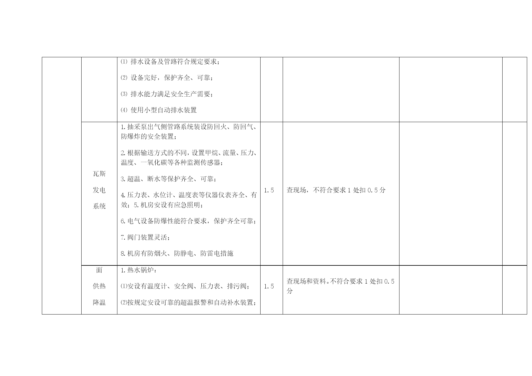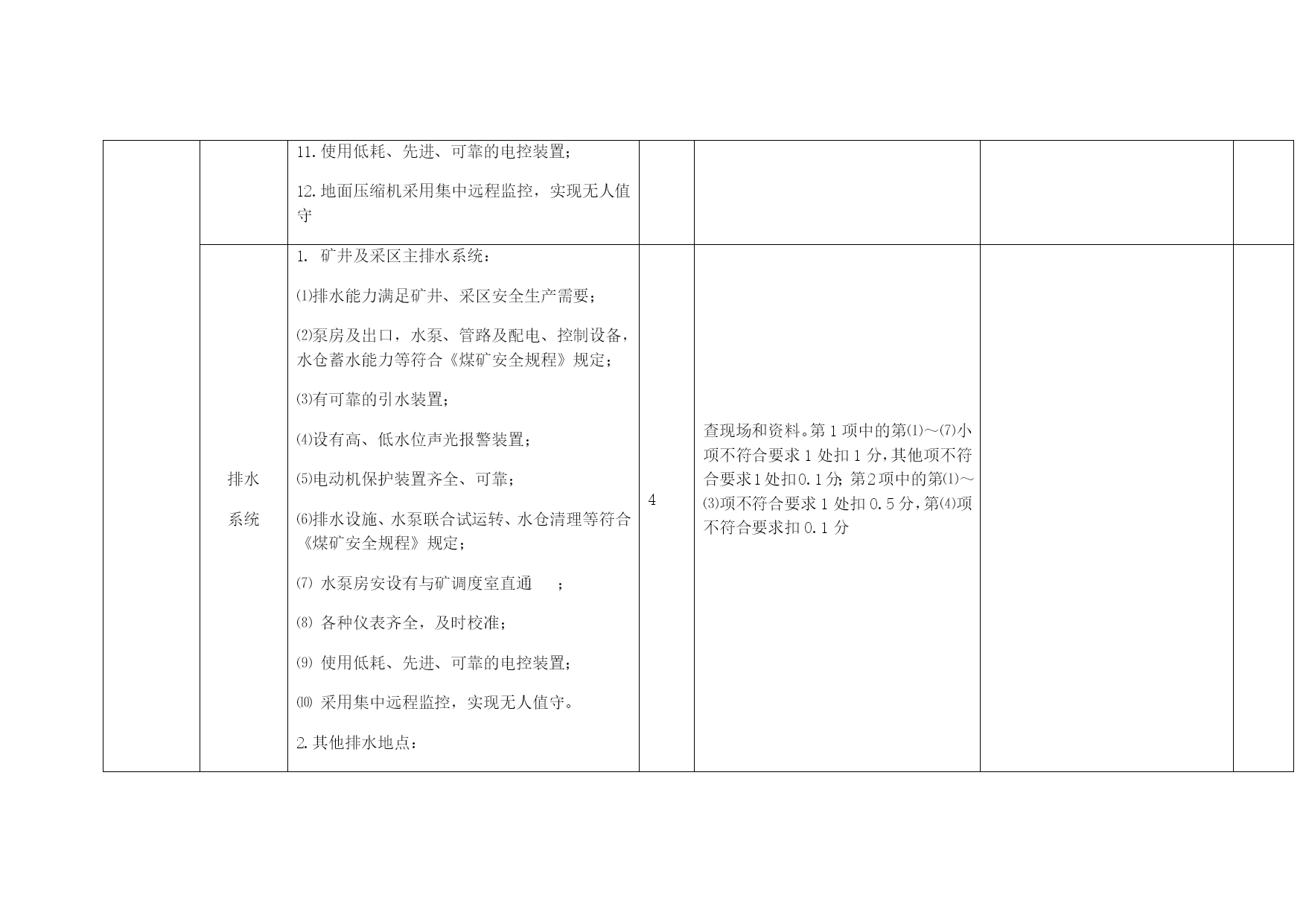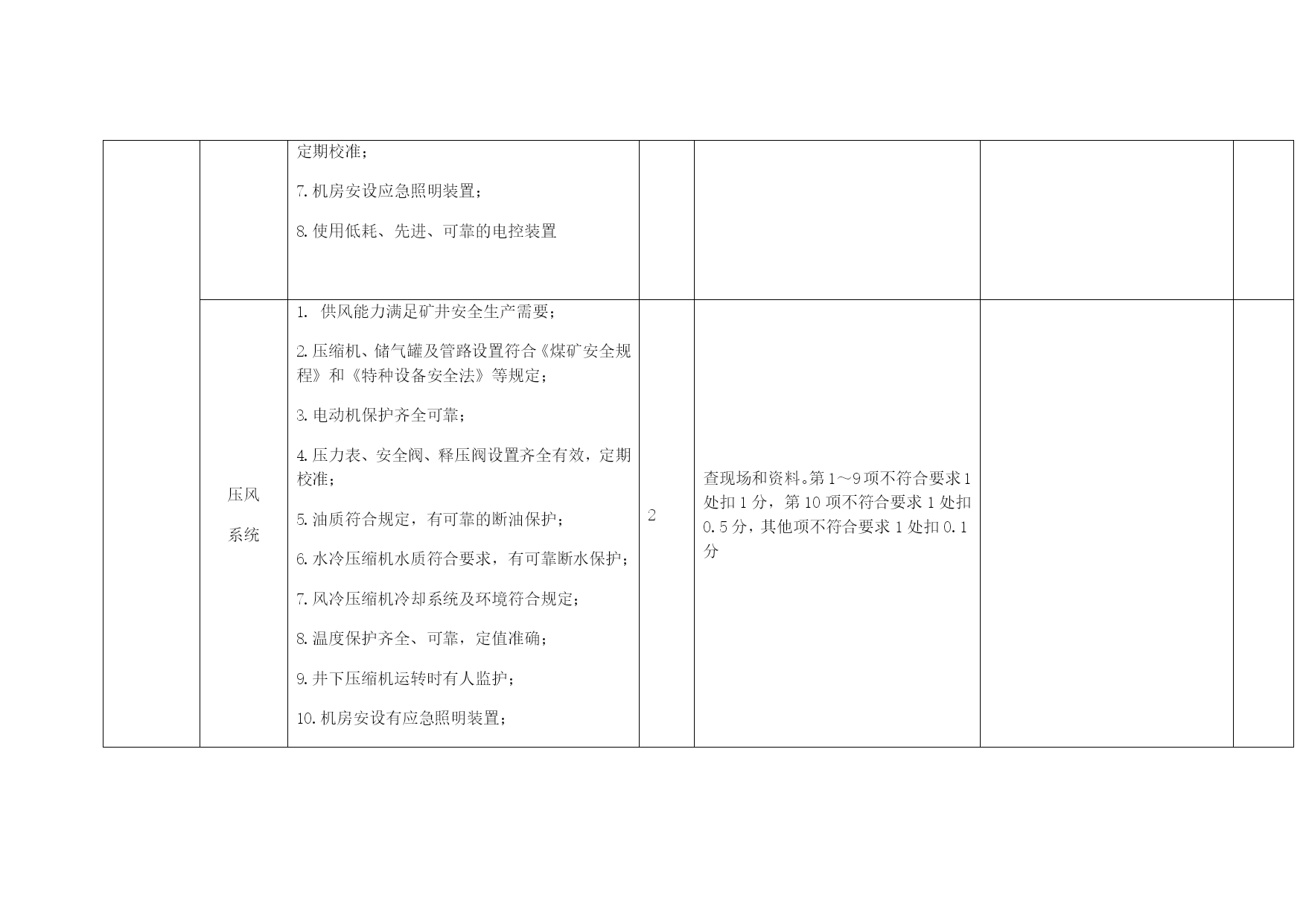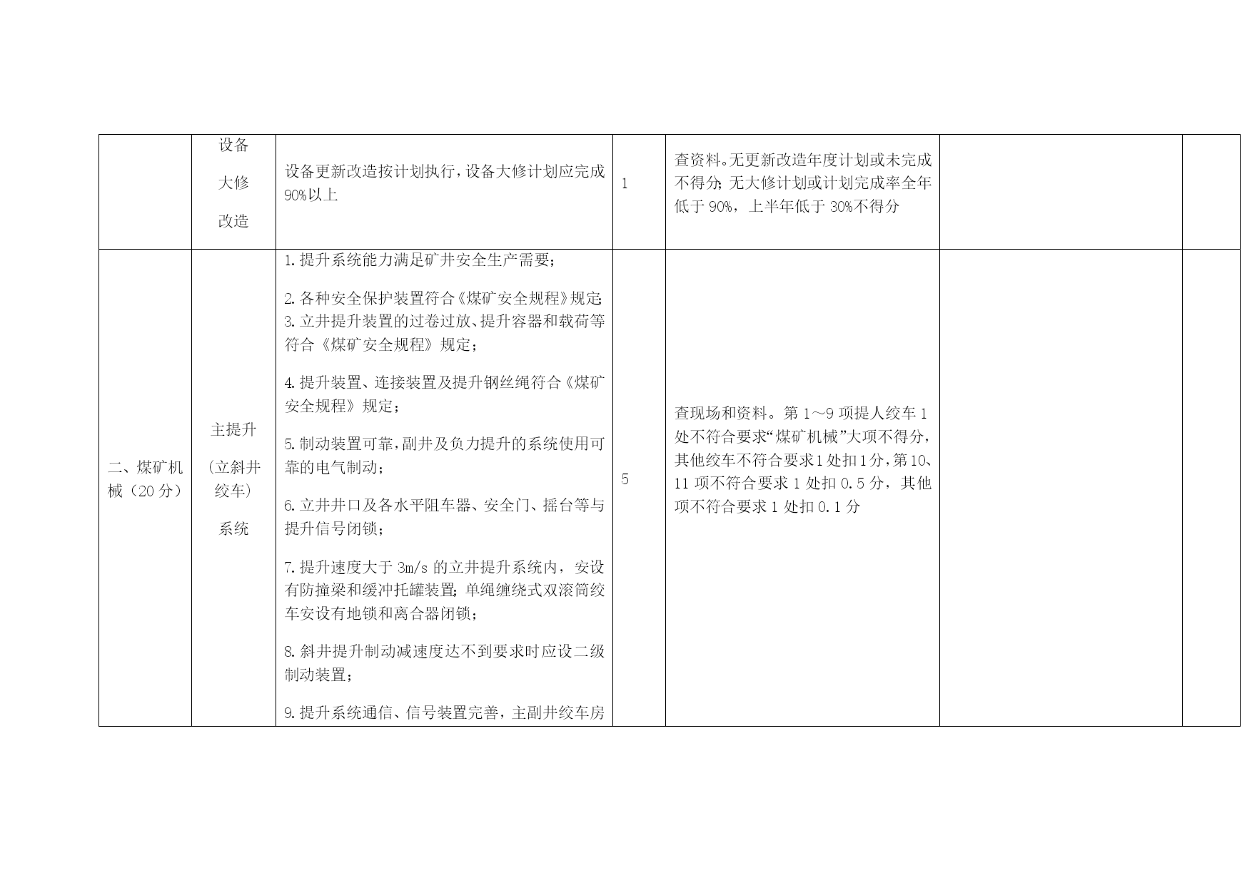 机电运输安全生产标准化验收评分表最新文档(可以直接使用,可编辑最新文档,欢迎下载)煤矿机电安全生产标准化评分表检查单位:专业得分:评定等级:检查时间:检查人:项目项目内容基本要求标准分值评分方法扣分原因得分一、设备与指标(15分)设备证标1.机电设备有产品合格证;2.纳入安标管理的产品有煤矿矿用产品安全标志,使用地点符合规定;3.防爆设备有防爆合格证4查现场和资料。1台不符合要求不得分设备完好机电设备综合完好率不低于90%3查现场和资料。每降低1个百分点扣0.5分固定设备大型在用固定设备完好2查现场和资料。1台不完好不得分小型电器小型电器设备完好率不低于95%1.5查现场和资料。每降低1个百分点扣0.5分矿灯在用矿灯完好率100%,使用合格的双光源矿灯。完好矿灯总数应多出常用矿灯人数的10%以上1.5查现场和资料。井下发现1盏红灯扣0.3分,1盏灭灯、不合格灯不得分,完好矿灯总数未满足要求不得分机电事故率机电事故率不高于1%1查资料。机电事故率达不到要求不得分设备待修率设备待修率不高于5%1查现场和资料。设备待修率每增加1个百分点扣0.5分设备大修改造设备更新改造按计划执行,设备大修计划应完成90%以上1查资料。无更新改造年度计划或未完成不得分;无大修计划或计划完成率全年低于90%,上半年低于30%不得分二、煤矿机械(20分)主提升(立斜井绞车)系统1.提升系统能力满足矿井安全生产需要;2.各种安全保护装置符合《煤矿安全规程》规定;3.立井提升装置的过卷过放、提升容器和载荷等符合《煤矿安全规程》规定;4.提升装置、连接装置及提升钢丝绳符合《煤矿安全规程》规定;5.制动装置可靠,副井及负力提升的系统使用可靠的电气制动;6.立井井口及各水平阻车器、安全门、摇台等与提升信号闭锁;7.提升速度大于3m/s的立井提升系统内,安设有防撞梁和缓冲托罐装置;单绳缠绕式双滚筒绞车安设有地锁和离合器闭锁;8.斜井提升制动减速度达不到要求时应设二级制动装置;9.提升系统通信、信号装置完善,主副井绞车房有能与矿调度室直通;10.上、下井口及各水平安设有摄像头,机房有视频监视器;11.机房安设有应急照明装置;12.使用低耗、先进、可靠的电控装置;13.主井提升宜采用集中远程监控,可不配司机值守,但应设图像监视,并定时巡检5查现场和资料。第1~9项提人绞车1处不符合要求“煤矿机械”大项不得分,其他绞车不符合要求1处扣1分,第10、11项不符合要求1处扣0.5分,其他项不符合要求1处扣0.1分主提升(带式输送机)系统1.钢丝绳牵引带式输送机:⑴运输能力满足矿井、采区安全生产需要,人货不混乘,不超速运人;⑵各种保护装置符合《煤矿安全规程》规定;⑶在输送机全长任何地点装设便于搭乘人员或其他人员操作的紧急停车装置;⑷上、下人地点设声光信号、语音提示和自动停车装置,卸煤口及终点下人处设有防止人员坠入及进入机尾的安全设施和保护;⑸上、下人和装、卸载处装设有摄像头,机房有视频监视器;⑹输送带、滚筒、托辊等材质符合规定,滚筒、托辊转动灵活,带面无损坏、漏钢丝等现象;⑺机房安设有与矿调度室直通;⑻使用低耗、先进、可靠的电控装置;⑼采用集中远程监控,实现无人值守4查现场和资料。第⑴~⑸项提人带式输送机1处不符合要求扣4分,其他带式输送机1处不符合要求扣1分,第⑹、⑺项1处不符合要求扣0.5分,其他项1处不符合要求扣0.1分2.滚筒驱动带式输送机:⑴运输能力满足矿井、采区安全生产需要;⑵电动机保护齐全可靠;⑶装设有防滑、防跑偏、防堆煤、防撕裂和输送带张紧力下降保护装置,以及温度、烟雾监测和自动洒水装置;⑷上运运输机装设防逆转和制动装置,下运运输机装设有软制动装置且装设防超速装置;⑸减速器与电动机采用软连接或采用软启动控制,液力偶合器不使用可燃性传动介质(调速型液力偶合器不受此限);⑹输送带、滚筒、托辊等材质符合规定,滚筒、托辊转动灵活,带面无损坏、漏钢丝等现象;⑺倾斜井巷使用的钢丝绳芯输送机有钢丝绳芯及接头状态检测装备;⑻钢丝绳芯输送机设有沿线紧急停车、闭锁装置,装、卸载处设有摄像头;⑼机头、机尾及搭接处设有照明,转动部位设有防护栏和警示牌,行人跨越处设有过桥;⑽连续运输系统安设有连锁、闭锁控制装置,沿线安设有通信和信号装置;⑾集中控制硐室安设有与矿调度室直通;⑿使用低耗、先进、可靠的电控装置;⒀采用集中远程监控,实现无人值守查现场和资料。第⑴~⑻项不符合要求1处扣1分,第⑼~⑾项不符合要求1处扣0.5分,其他项不符合要求1处扣0.1分主通风机系统1.主要通风机性能满足矿井通风安全需要;2.电动机保护齐全、可靠;3.使用在线监测装置,并且具备通风机轴承、电动机轴承、电动机定