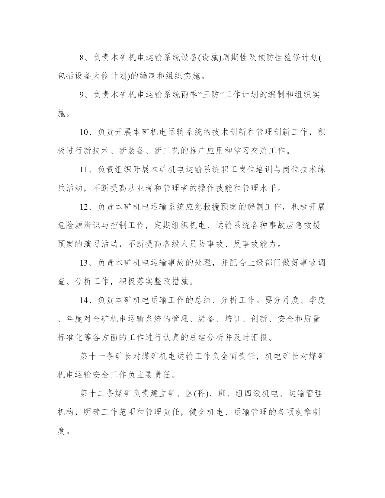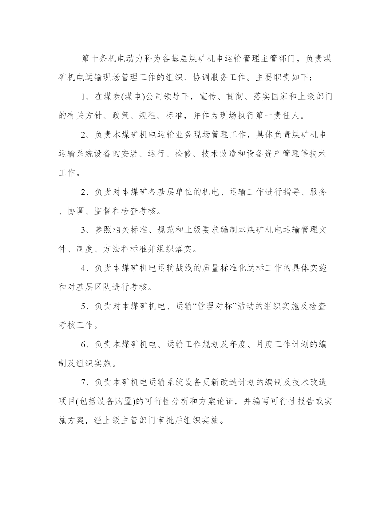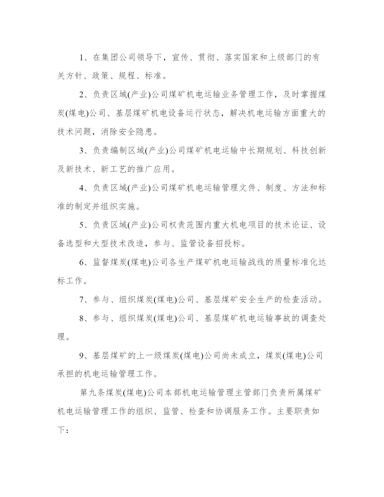 xxx公司煤矿机电运输管理制度xxx公司煤矿机电运输管理制度第一章总则第一条煤矿机电运输管理是煤炭企业安全生产管理中的基础工作,是落实“安全第一、预防为主、综合治理”的安全方针,把安全关口前移、安全重心下移的重要所在。为了促进XXXXXX集团公司(以下简称“集团公司”)煤炭产业科学发展,提升集团公司辖下各煤矿机电运输工作管理水平,认真落实煤矿安全生产主体责任,全面加强煤矿安全技术管理,结合集团公司体制和各煤矿生产管理实际情况,特制定本制度。第二条本制度制定的依据为:安全生产法、矿山安全法、煤矿安全规程、煤矿安全质量标准化基本要求及评分方法(试行)、煤矿机电设备完好标准、煤矿煤矿机电设备检修标准等有关煤矿安全生产的法律、法规、规范、制度、规定的相关条文。第三条本制度适用于集团公司及辖下承担煤炭产业管理、生产职能的区域(产业)公司、煤炭(煤电)公司、基层煤矿的机电运输管理工作。第四条本制度包括煤矿机电运输管理工作中的基础管理、技术管理、设备管理、现场管理、事故管理、能耗及环境保护管理等内容。第二章组织与职责第五条集团公司及辖下承担煤炭产业管理、生产职能的区域(产业)公司、煤炭(煤电)企业、基层煤矿必须建立健全煤矿机电运输管理机构,配备专业、专职管理人员负责机电运输管理工作。第六条集团公司对煤矿机电运输管理工作遵循“统一领导、分级管理”的原则。第七条集团公司本部煤矿机电运输管理职能部门按照“宏观、指导、引导、服务”的原则对集团公司辖下各煤矿机电运输管理工作进行组织、监督、检查和协调服务。主要职责如下:1、宣传、贯彻、落实国家、行业的有关方针、政策、规程、标准,并监督执行。2、协同集团公司其它职能部门对公司煤炭产业进行中长期规划工作;3、负责集团公司煤矿机电运输管理文件、制度、方法和标准的制定并组织实施。4、负责集团公司煤炭产业重大机电运输设备大修、更新改造计划的审批工作。5、参与、组织集团公司煤炭产业安全生产的检查活动。6、参与、组织集团公司煤炭产业机电运输事故的调查处理。第八条区域(产业)公司本部机电运输管理职能部门负责所属煤炭(煤电)公司煤矿机电运输管理工作的组织、监管、检查和协调服务工作。主要职责如下:1、在集团公司领导下,宣传、贯彻、落实国家和上级部门的有关方针、政策、规程、标准。2、负责区域(产业)公司煤矿机电运输业务管理工作,及时掌握煤炭(煤电)公司、基层煤矿机电设备运行状态,解决机电运输方面重大的技术问题,消除安全隐患。3、负责编制区域(产业)公司煤矿机电运输中长期规划、科技创新及新技术、新工艺的推广应用。4、负责区域(产业)公司煤矿机电运输管理文件、制度、方法和标准的制定并组织实施。5、负责区域(产业)公司权责范围内重大机电项目的技术论证、设备选型和大型技术改造,参与、监管设备招投标。6、监督煤炭(煤电)公司各生产煤矿机电运输战线的质量标准化达标工作。7、参与、组织煤炭(煤电)公司、基层煤矿安全生产的检查活动。8、参与、组织煤炭(煤电)公司、基层煤矿机电运输事故的调查处理。9、基层煤矿的上一级煤炭(煤电)公司尚未成立,煤炭(煤电)公司承担的机电运输管理工作。第九条煤炭(煤电)公司本部机电运输管理主管部门负责所属煤矿机电运输管理工作的组织、监管、检查和协调服务工作。主要职责如下:1、在区域(产业)公司领导下,宣传、贯彻、落实国家和上级部门的有关方针、政策、规程、标准。2、负责煤炭(煤电)公司机电运输业务管理工作,及时掌握生产煤矿机电设备运行状态,解决机电方面存在的问题,消除安全隐患。3、负责编制煤炭(煤电)公司机电运输中长期规划、科技创新及新技术、新工艺的推广应用。4、负责煤炭(煤电)公司机电运输管理文件、制度、方法和标准的制定。5、负责煤炭(煤电)公司权责范围内大型机电项目的技术论证、设备选型,参与设备招标,组织大型固定设备的安装和验收。6、负责煤炭(煤电)公司所属各煤矿停产检修计划的审批,组织煤矿停产检修。7、负责协调煤炭(煤电)公司权责范围内大型机电设备技术测定、探伤、电气试验和大型技术改造项目,保障大型机电设备安全经济运行,做好机电设备的更新、报废、检修工作。8、负责煤炭(煤电)公司各生产煤矿机电运输战线的质量标准化达标工作。9、参与、组织煤炭(煤电)公司安全生产检查活动。10、参与、组织煤炭(煤电)公司机电运输事故的调查处理。第十条机电动力科为各基层煤矿机电运输管理主管部门,负责煤矿机电运输现场管理工作的组织、协调服务工作。主要职责如下:1、在煤炭(煤电)公司领导下,宣传、贯彻、落实国家和上级部门的有关方针、政策、规程、标准,并作为现场执行第一责任人。2、负责本煤矿机电运输业务现场管理工作,具体负责煤矿机电运输系统设备的安装、