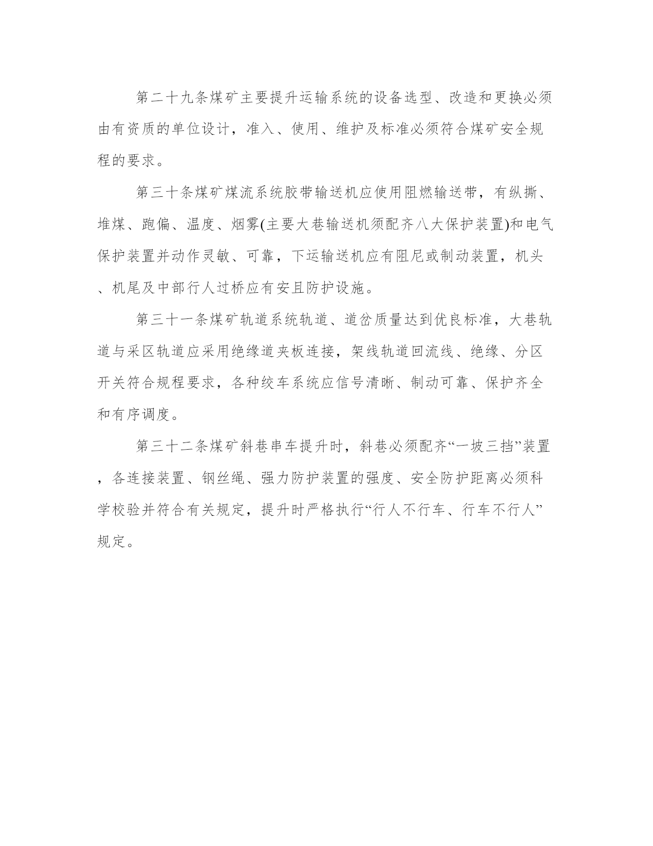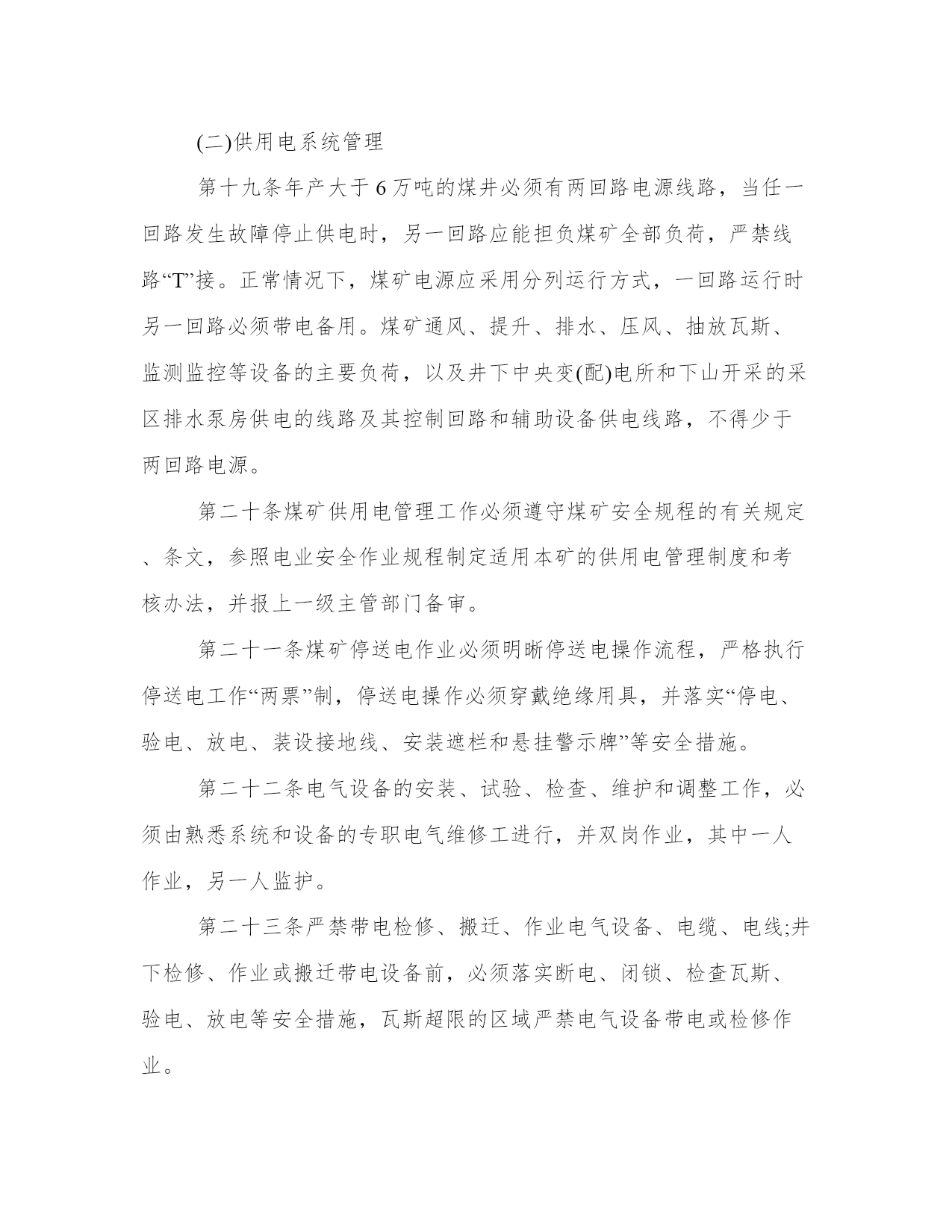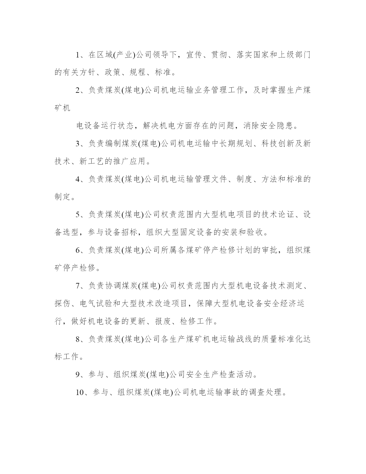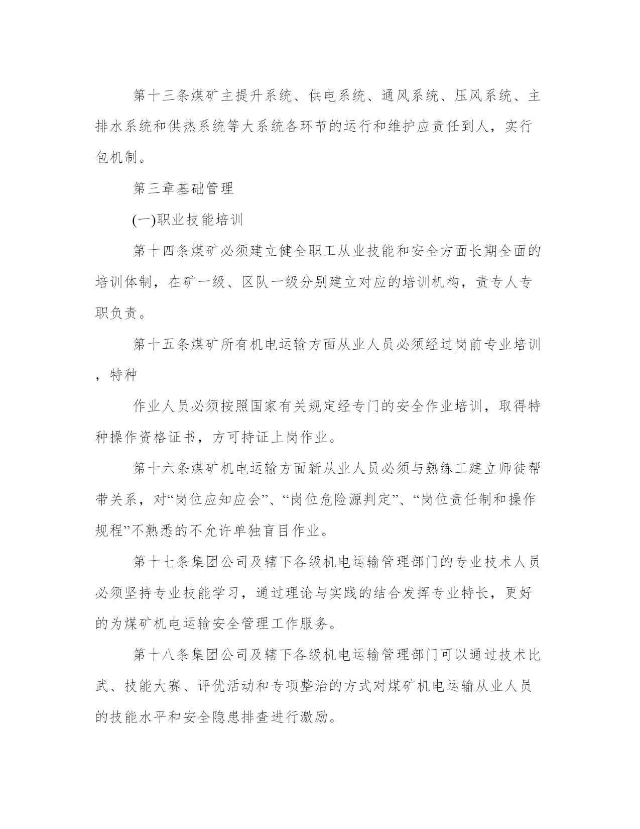 xxx公司煤矿机电运输管理制度xxx公司煤矿机电运输管理制度第一章总则第一条煤矿机电运输管理是煤炭企业安全生产管理中的基础工作,是落实“安全第一、预防为主、综合治理”的安全方针,把安全关口前移、安全重心下移的重要所在。为了促进XXXXXX集团公司(以下简称“集团公司”)煤炭产业科学发展,提升集团公司辖下各煤矿机电运输工作管理水平,认真落实煤矿安全生产主体责任,全面加强煤矿安全技术管理,结合集团公司体制和各煤矿生产管理实际情况,特制定本制度。第二条本制度制定的依据为:安全生产法、矿山安全法、煤矿安全规程、煤矿安全质量标准化基本要求及评分方法(试行)、煤矿机电设备完好标准、煤矿煤矿机电设备检修标准等有关煤矿安全生产的法律、法规、规范、制度、规定的相关条文。第三条本制度适用于集团公司及辖下承担煤炭产业管理、生产职能的区域(产业)公司、煤炭(煤电)公司、基层煤矿的机电运输管理工作。第四条本制度包括煤矿机电运输管理工作中的基础管理、技术管理、设备管理、现场管理、事故管理、能耗及环境保护管理等内容。第二章组织与职责第五条集团公司及辖下承担煤炭产业管理、生产职能的区域(产业)公司、煤炭(煤电)企业、基层煤矿必须建立健全煤矿机电运输管理机构,配备专业、专职管理人员负责机电运输管理工作。第六条集团公司对煤矿机电运输管理工作遵循“统一领导、分级管理”的原则。第七条集团公司本部煤矿机电运输管理职能部门按照“宏观、指导、引导、服务”的原则对集团公司辖下各煤矿机电运输管理工作进行组织、监督、检查和协调服务。主要职责如下:1、宣传、贯彻、落实国家、行业的有关方针、政策、规程、标准,并监督执行。2、协同集团公司其它职能部门对公司煤炭产业进行中长期规划工作;3、负责集团公司煤矿机电运输管理文件、制度、方法和标准的制定并组织实施。4、负责集团公司煤炭产业重大机电运输设备大修、更新改造计划的审批工作。5、参与、组织集团公司煤炭产业安全生产的检查活动。6、参与、组织集团公司煤炭产业机电运输事故的调查处理。第八条区域(产业)公司本部机电运输管理职能部门负责所属煤炭(煤电)公司煤矿机电运输管理工作的组织、监管、检查和协调服务工作。主要职责如下:1、在集团公司领导下,宣传、贯彻、落实国家和上级部门的有关方针、政策、规程、标准。2、负责区域(产业)公司煤矿机电运输业务管理工作,及时掌握煤炭(煤电)公司、基层煤矿机电设备运行状态,解决机电运输方面重大的技术问题,消除安全隐患。3、负责编制区域(产业)公司煤矿机电运输中长期规划、科技创新及新技术、新工艺的推广应用。4、负责区域(产业)公司煤矿机电运输管理文件、制度、方法和标准的制定并组织实施。5、负责区域(产业)公司权责范围内重大机电项目的技术论证、设备选型和大型技术改造,参与、监管设备招投标。6、监督煤炭(煤电)公司各生产煤矿机电运输战线的质量标准化达标工作。7、参与、组织煤炭(煤电)公司、基层煤矿安全生产的检查活动。8、参与、组织煤炭(煤电)公司、基层煤矿机电运输事故的调查处理。9、基层煤矿的上一级煤炭(煤电)公司尚未成立,煤炭(煤电)公司承担的机电运输管理工作。第九条煤炭(煤电)公司本部机电运输管理主管部门负责所属煤矿机电运输管理工作的组织、监管、检查和协调服务工作。主要职责如下:1、在区域(产业)公司领导下,宣传、贯彻、落实国家和上级部门的有关方针、政策、规程、标准。2、负责煤炭(煤电)公司机电运输业务管理工作,及时掌握生产煤矿机电设备运行状态,解决机电方面存在的问题,消除安全隐患。3、负责编制煤炭(煤电)公司机电运输中长期规划、科技创新及新技术、新工艺的推广应用。4、负责煤炭(煤电)公司机电运输管理文件、制度、方法和标准的制定。5、负责煤炭(煤电)公司权责范围内大型机电项目的技术论证、设备选型,参与设备招标,组织大型固定设备的安装和验收。6、负责煤炭(煤电)公司所属各煤矿停产检修计划的审批,组织煤矿停产检修。7、负责协调煤炭(煤电)公司权责范围内大型机电设备技术测定、探伤、电气试验和大型技术改造项目,保障大型机电设备安全经济运行,做好机电设备的更新、报废、检修工作。8、负责煤炭(煤电)公司各生产煤矿机电运输战线的质量标准化达标工作。9、参与、组织煤炭(煤电)公司安全生产检查活动。10、参与、组织煤炭(煤电)公司机电运输事故的调查处理。第十条机电动力科为各基层煤矿机电运输管理主管部门,负责煤矿机电运输现场管理工作的组织、协调服务工作。主要职责如下:1、在煤炭(煤电)公司领导下,宣传、贯彻、落实国家和上级部门的有关方针、政策、规程、标准,并作为现场执行第一责任人。2、负责本煤矿机电运输业务现场管理工作,具体负责煤矿机电运输系统设备的安装、