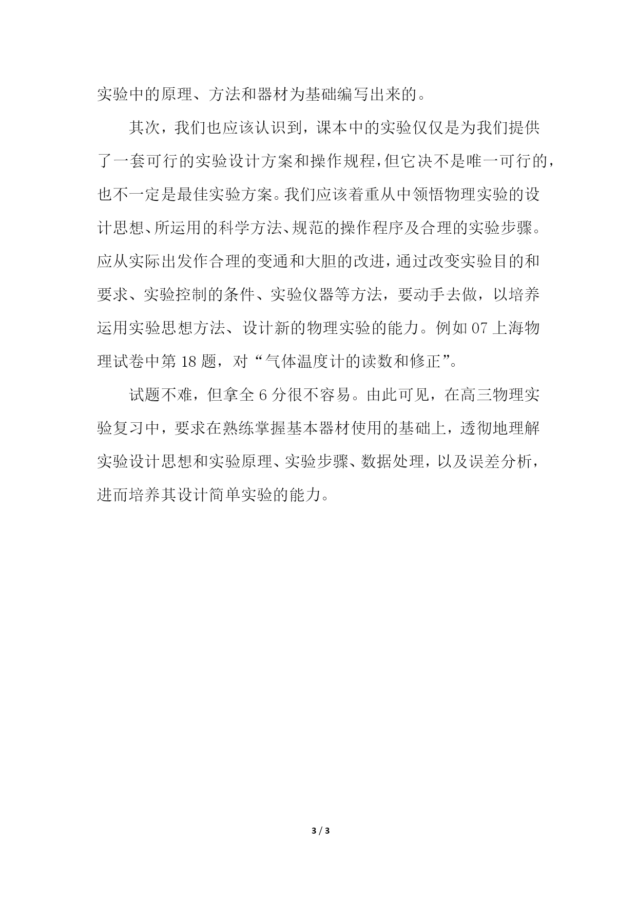 PAGE3/NUMPAGES3物理高考的总复习攻略1.夯实基础知识、注意主干知识尽管近几年来教材在变,大纲在变,高考也在变,但基本概念、基本规律和基本思路不会变,它们是高考物理考查的主要内容和重点内容,而主干知识又是物理知识体系中的最重要的知识,学好主干知识是学好物理的关键,是提高能力的基础。在备考复习中,不仅要求记住这些知识的内容,而且还要加强理解,熟练运用,既要“知其然”,又要“知其所以然”。要立足于本学科知识,把握好要求掌握的知识点的内涵和外延,明确知识点之间的内在联系,形成系统的知识网络。新课程知识应用性较强,与素质教育的教改目标更加接近,容易成为命题点。2.注重学科思想方法的掌握学习物理的目的,就是要在掌握知识的同时,领悟其中的科学方法,培养独立思考和仔细审题的习惯和能力。为什么感到物理课听起来容易,做起来难。问题就在于没有掌握物理学科科学的研究方法,而是死套公式。为此,在物理复习过程中要适时地、有机地将科学方法如:理想化、模型法、整体法、隔离法、图象法、逆向思维法、演绎法、归纳法、假设法、排除法、对称法、极端思维法、等效法、类比和迁移法等进行归纳、总结,使之有利于消化吸收,领悟其精髓,从而提高解题能力和解题技巧。3.研究题型,分类归档,注意解题方法和技巧的训练和归纳高考把能力考查放在首位,就必须对知识点考查的能力要求上不断翻新变化。很多试题对同一知识点的考查,有时是考查理解能力,有时却考查推理能力或分析综合能力,或以新颖的情景或新的设问角度考查同一知识点的,这就要求我们应站在科学的、有效的角度上,研究考试,分析题型,精选例题,组合习题注重一题多解,一题多变的训练,提高以不变应万变的能力。用翻新题进行训练,以求真懂,克服思维定势。学会解传统的基本题,以基础题训练或提炼方法,培养正确的解题习惯(一般程序:文字→情景→模型→过程特征→规律→方程→数学解→物理判断)。要养成主动参与,积极思考的良好学习习惯。提高从原始题目中采集信息、处理信息,建立起与题目相对立的物理模型的能力。充分利用好高中物理课本中不少联系实际的好题,例如流体的阻力与物体速度的关系、示波器中的电偏转、磁悬浮列车等。(07上海物理卷最后一题最后一问磁场运动问题就是从磁悬浮列车中演化来的)这些都是联系实际的典范,加强理解、巩固知识、培养能力。4.切实加强实验复习,提高实验变通能力随着高考的改革,命题已由知识立意逐步转向能力立意,联系实际、实验的`题目越来越多。同时近几年高考物理有力地冲击了照本宣科式的教学模式,它给我们的启发是:首先,要更加重视课本中的实验,高考的实验题都是以规定实验中的原理、方法和器材为基础编写出来的。其次,我们也应该认识到,课本中的实验仅仅是为我们提供了一套可行的实验设计方案和操作规程,但它决不是唯一可行的,也不一定是最佳实验方案。我们应该着重从中领悟物理实验的设计思想、所运用的科学方法、规范的操作程序及合理的实验步骤。应从实际出发作合理的变通和大胆的改进,通过改变实验目的和要求、实验控制的条件、实验仪器等方法,要动手去做,以培养运用实验思想方法、设计新的物理实验的能力。例如07上海物理试卷中第18题,对“气体温度计的读数和修正”。试题不难,但拿全6分很不容易。由此可见,在高三物理实验复习中,要求在熟练掌握基本器材使用的基础上,透彻地理解实验设计思想和实验原理、实验步骤、数据处理,以及误差分析,进而培养其设计简单实验的能力。