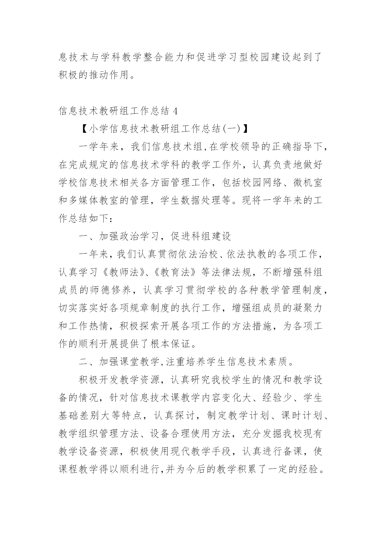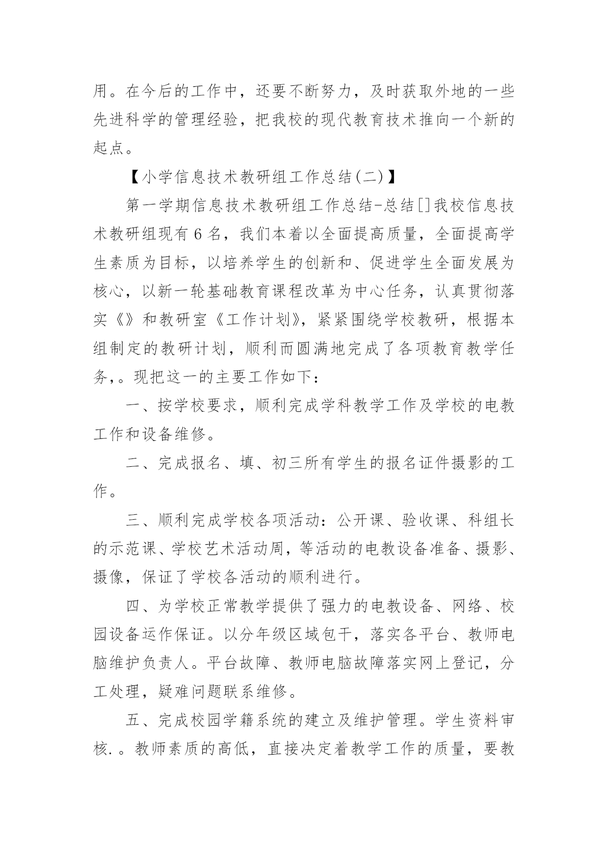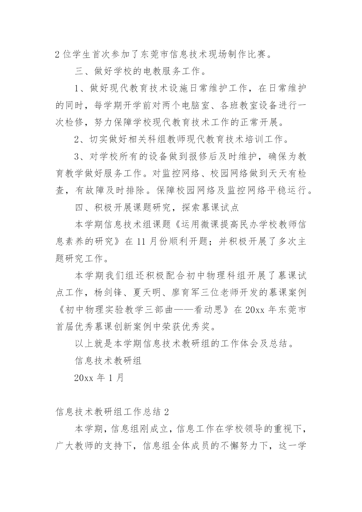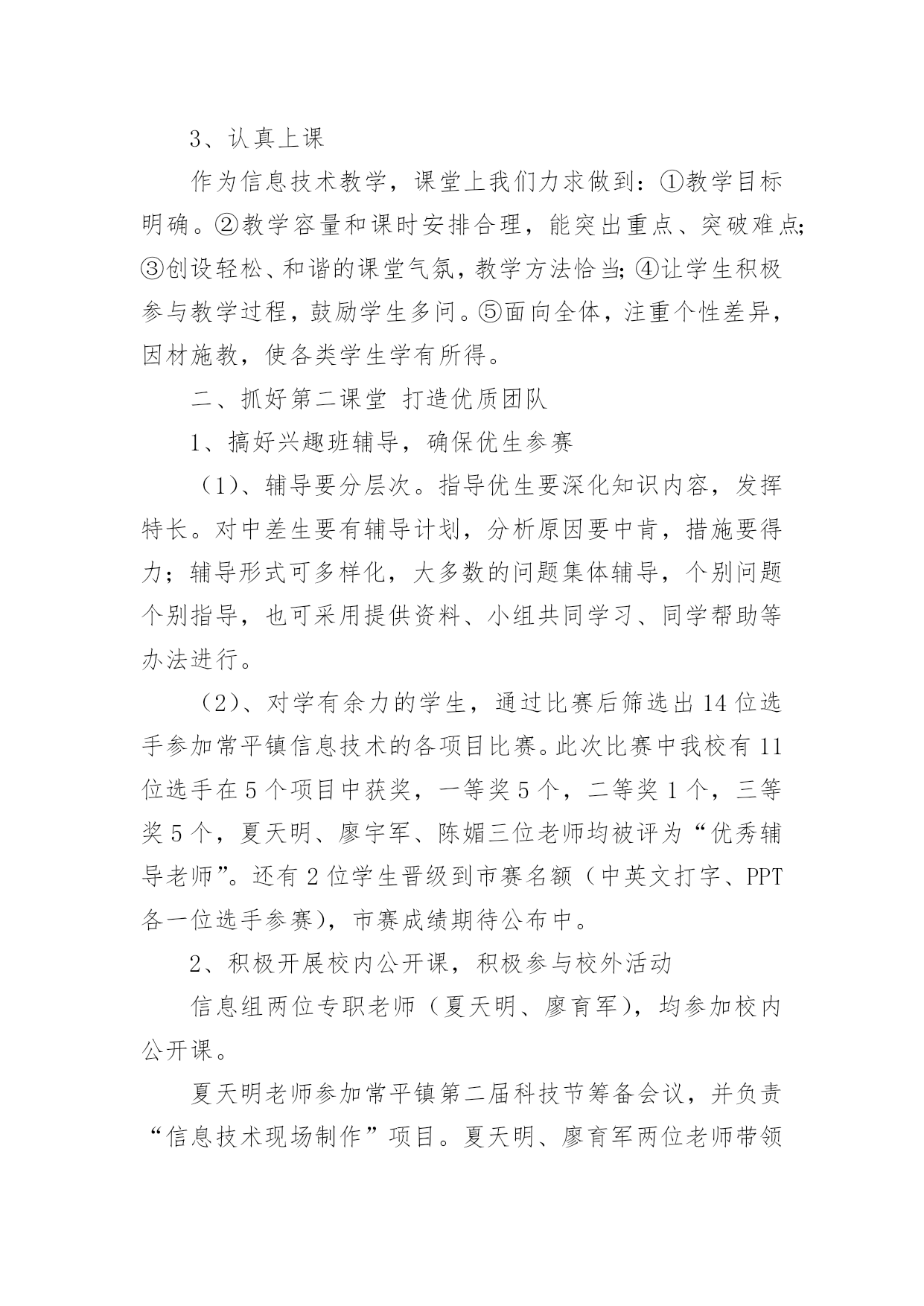 信息技术教研组工作总结【热】信息技术教研组工作总结总结是事后对某一阶段的学习或工作情况作加以回顾检查并分析评价的书面材料,它能使我们及时找出错误并改正,不妨让我们认真地完成总结吧。总结怎么写才能发挥它的作用呢?以下是小编精心整理的信息技术教研组工作总结,仅供参考,欢迎大家阅读。信息技术教研组工作总结1回顾本学期信息技术教研组的工作,在信息技术教师们密切配合下各项工作开展的比较顺利,并取得了可观的成绩。现将本学期工作总结如下:一、优化教学常规1、制订教学计划,强调管理规定开学初就集中信息组7位老师开专题会议,收集各位老师的课程表,制定两个电脑室的.课程表;认真学习了《电脑室管理规定》。要求每位老师制定自己详细教学计划。2、精心备课(1)探索在个人备课基础上的集体备课。利用信息技术科组QQ群系统共享各位老师的课件及课堂素材资源。(2)授课前认真编写教案。(3)做好课后小结和分析,及时总结经验,反思失误及其原因,寻找对应策略。3、认真上课作为信息技术教学,课堂上我们力求做到:①教学目标明确。②教学容量和课时安排合理,能突出重点、突破难点;③创设轻松、和谐的课堂气氛,教学方法恰当;④让学生积极参与教学过程,鼓励学生多问。⑤面向全体,注重个性差异,因材施教,使各类学生学有所得。二、抓好第二课堂打造优质团队1、搞好兴趣班辅导,确保优生参赛(1)、辅导要分层次。指导优生要深化知识内容,发挥特长。对中差生要有辅导计划,分析原因要中肯,措施要得力;辅导形式可多样化,大多数的问题集体辅导,个别问题个别指导,也可采用提供资料、小组共同学习、同学帮助等办法进行。(2)、对学有余力的学生,通过比赛后筛选出14位选手参加常平镇信息技术的各项目比赛。此次比赛中我校有11位选手在5个项目中获奖,一等奖5个,二等奖1个,三等奖5个,夏天明、廖宇军、陈媚三位老师均被评为“优秀辅导老师”。还有2位学生晋级到市赛名额(中英文打字、PPT各一位选手参赛),市赛成绩期待公布中。2、积极开展校内公开课,积极参与校外活动信息组两位专职老师(夏天明、廖育军),均参加校内公开课。夏天明老师参加常平镇第二届科技节筹备会议,并负责“信息技术现场制作”项目。夏天明、廖育军两位老师带领2位学生首次参加了东莞市信息技术现场制作比赛。三、做好学校的电教服务工作。1、做好现代教育技术设施日常维护工作,在日常维护的同时,每学期开学前对两个电脑室、各班教室设备进行一次检修,努力保障学校现代教育技术工作的正常开展。2、切实做好相关科组教师现代教育技术培训工作。3、对学校所有的设备做到报修后及时维护,确保为教育教学做好服务工作。对监控网络、校园网络做到天天有检查,有故障及时排除。保障校园网络及监控网络平稳运行。四、积极开展课题研究,探索慕课试点本学期信息技术组课题《运用微课提高民办学校教师信息素养的研究》在11月份顺利开题;并积极开展了多次主题研究工作。本学期我们组还积极配合初中物理科组开展了慕课试点工作,杨剑锋、夏天明、廖育军三位老师开发的慕课案例《初中物理实验教学三部曲——看动思》在20xx年东莞市首届优秀慕课创新案例中荣获优秀奖。以上就是本学期信息技术教研组的工作体会及总结。信息技术教研组20xx年1月信息技术教研组工作总结2本学期,信息组刚成立,信息工作在学校领导的重视下,广大教师的支持下,信息组全体成员的不懈努力下,这一学期的各项工作已基本顺利完成。现将主要工作总结如下:一、制定工作计划根据学校工作计划,结合信息实际情况制定20xx~2016学年度上学期信息工作计划。本学期严格按照计划来完成各项工作任务。二、加强学习,提升理论水平本学期,信息组扎实开展电化教育理论学习活动,组织学习《中小学信息技术教育》以及信息技术网络资源等具有可借鉴的相关的一系列文章。要求每一位组员自学一种适用的的软件,并在组内教研活动时进行交流,使学校的信息化应用不断提升。三、抓好信息技术常规教学工作1、制定切实可行的教学计划和进度,按教学进度计划认真组织开展教学,按质按量完成了预定的教学任务。2、利用课余时间和教研活动时间认真学习钻研《江苏省中小学信息技术指导纲要》,进行信息技术教学研究讨论,其中组员徐玉婷老师在吴江区松陵片小学信息技术连片教研活动中获得一致好评。四、认真做好学校信息化管理工作学校配置有百兆校园网,广播系统、监控系统,目前每间教室装备有交互式电子白板,每位教师配有台式电脑。信息组成员分工负责,建立了设备维修和管理制度,损坏及时处理,使信息设备能正常工作。加强校园网安全管理、教师计算机使用管理、教师上网监控管理,学生机房用机管理;认真检查和维护教室电子白板设施,加强班级多媒体管理和培训,使教学正常进行。五、认真做好其它常规工作1、认真做好各级各类检查、督查、访问以及学校组织的各种活动等方面的照像、摄