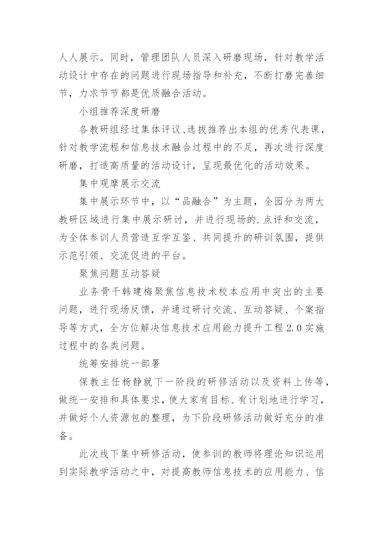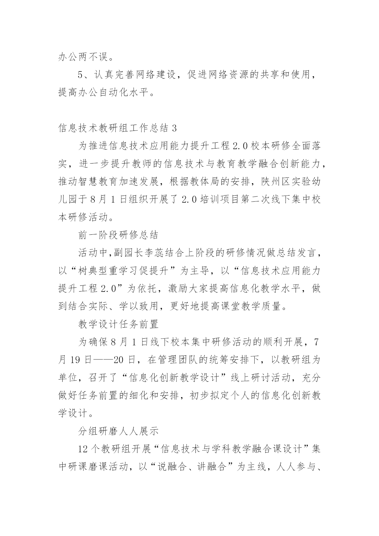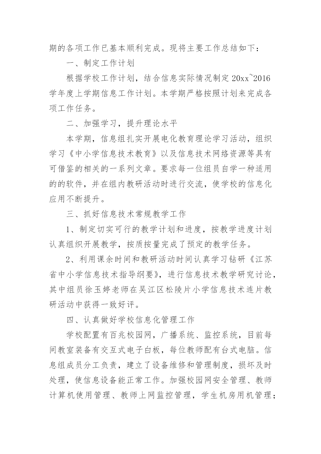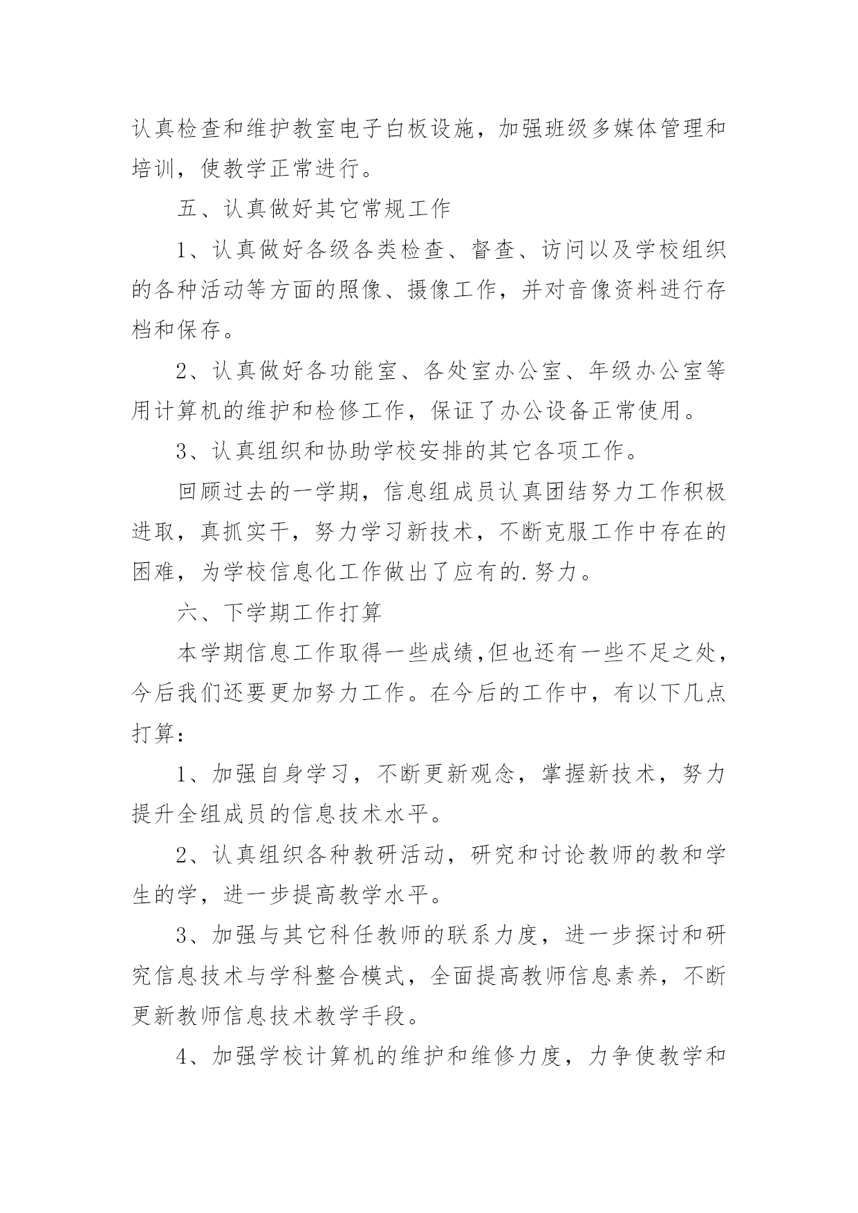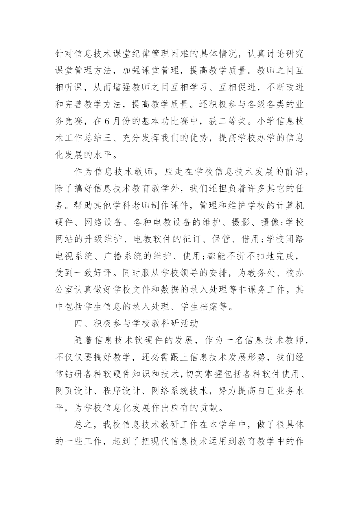 信息技术教研组工作总结【热】信息技术教研组工作总结总结是事后对某一阶段的学习或工作情况作加以回顾检查并分析评价的书面材料,它能使我们及时找出错误并改正,不妨让我们认真地完成总结吧。总结怎么写才能发挥它的作用呢?以下是小编精心整理的信息技术教研组工作总结,仅供参考,欢迎大家阅读。信息技术教研组工作总结1回顾本学期信息技术教研组的工作,在信息技术教师们密切配合下各项工作开展的比较顺利,并取得了可观的成绩。现将本学期工作总结如下:一、优化教学常规1、制订教学计划,强调管理规定开学初就集中信息组7位老师开专题会议,收集各位老师的课程表,制定两个电脑室的.课程表;认真学习了《电脑室管理规定》。要求每位老师制定自己详细教学计划。2、精心备课(1)探索在个人备课基础上的集体备课。利用信息技术科组QQ群系统共享各位老师的课件及课堂素材资源。(2)授课前认真编写教案。(3)做好课后小结和分析,及时总结经验,反思失误及其原因,寻找对应策略。3、认真上课作为信息技术教学,课堂上我们力求做到:①教学目标明确。②教学容量和课时安排合理,能突出重点、突破难点;③创设轻松、和谐的课堂气氛,教学方法恰当;④让学生积极参与教学过程,鼓励学生多问。⑤面向全体,注重个性差异,因材施教,使各类学生学有所得。二、抓好第二课堂打造优质团队1、搞好兴趣班辅导,确保优生参赛(1)、辅导要分层次。指导优生要深化知识内容,发挥特长。对中差生要有辅导计划,分析原因要中肯,措施要得力;辅导形式可多样化,大多数的问题集体辅导,个别问题个别指导,也可采用提供资料、小组共同学习、同学帮助等办法进行。(2)、对学有余力的学生,通过比赛后筛选出14位选手参加常平镇信息技术的各项目比赛。此次比赛中我校有11位选手在5个项目中获奖,一等奖5个,二等奖1个,三等奖5个,夏天明、廖宇军、陈媚三位老师均被评为“优秀辅导老师”。还有2位学生晋级到市赛名额(中英文打字、PPT各一位选手参赛),市赛成绩期待公布中。2、积极开展校内公开课,积极参与校外活动信息组两位专职老师(夏天明、廖育军),均参加校内公开课。夏天明老师参加常平镇第二届科技节筹备会议,并负责“信息技术现场制作”项目。夏天明、廖育军两位老师带领2位学生首次参加了东莞市信息技术现场制作比赛。三、做好学校的电教服务工作。1、做好现代教育技术设施日常维护工作,在日常维护的同时,每学期开学前对两个电脑室、各班教室设备进行一次检修,努力保障学校现代教育技术工作的正常开展。2、切实做好相关科组教师现代教育技术培训工作。3、对学校所有的设备做到报修后及时维护,确保为教育教学做好服务工作。对监控网络、校园网络做到天天有检查,有故障及时排除。保障校园网络及监控网络平稳运行。四、积极开展课题研究,探索慕课试点本学期信息技术组课题《运用微课提高民办学校教师信息素养的研究》在11月份顺利开题;并积极开展了多次主题研究工作。本学期我们组还积极配合初中物理科组开展了慕课试点工作,杨剑锋、夏天明、廖育军三位老师开发的慕课案例《初中物理实验教学三部曲——看动思》在20xx年东莞市首届优秀慕课创新案例中荣获优秀奖。以上就是本学期信息技术教研组的工作体会及总结。信息技术教研组20xx年1月信息技术教研组工作总结2本学期,信息组刚成立,信息工作在学校领导的重视下,广大教师的支持下,信息组全体成员的不懈努力下,这一学期的各项工作已基本顺利完成。现将主要工作总结如下:一、制定工作计划根据学校工作计划,结合信息实际情况制定20xx~2016学年度上学期信息工作计划。本学期严格按照计划来完成各项工作任务。二、加强学习,提升理论水平本学期,信息组扎实开展电化教育理论学习活动,组织学习《中小学信息技术教育》以及信息技术网络资源等具有可借鉴的相关的一系列文章。要求每一位组员自学一种适用的的软件,并在组内教研活动时进行交流,使学校的信息化应用不断提升。三、抓好信息技术常规教学工作1、制定切实可行的教学计划和进度,按教学进度计划认真组织开展教学,按质按量完成了预定的教学任务。2、利用课余时间和教研活动时间认真学习钻研《江苏省中小学信息技术指导纲要》,进行信息技术教学研究讨论,其中组员徐玉婷老师在吴江区松陵片小学信息技术连片教研活动中获得一致好评。四、认真做好学校信息化管理工作学校配置有百兆校园网,广播系统、监控系统,目前每间教室装备有交互式电子白板,每位教师配有台式电脑。信息组成员分工负责,建立了设备维修和管理制度,损坏及时处理,使信息设备能正常工作。加强校园网安全管理、教师计算机使用管理、教师上网监控管理,学生机房用机管理;认真检查和维护教室电子白板设施,加强班级多媒体管理和培训,使教学正常进行。五、认真做好其它常规工作1、认真做好各级各类检查、督查、访问以及学校组织的各种活动等方面的照像、摄