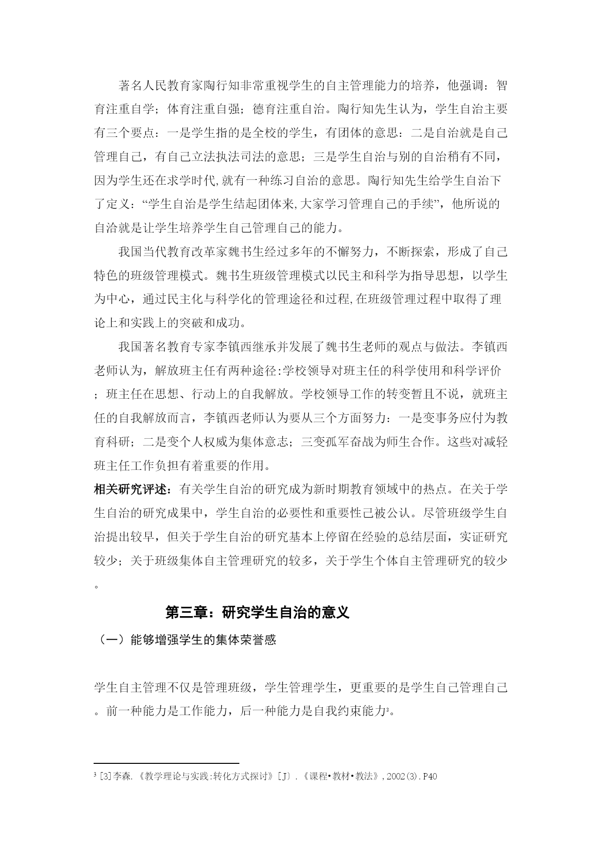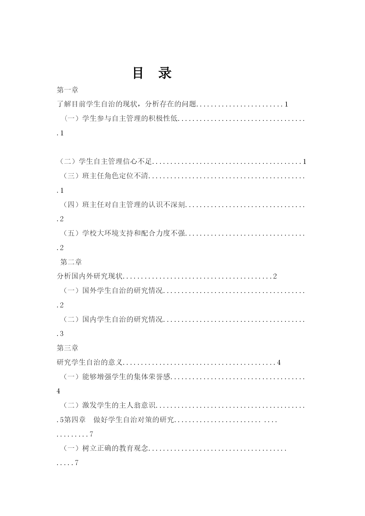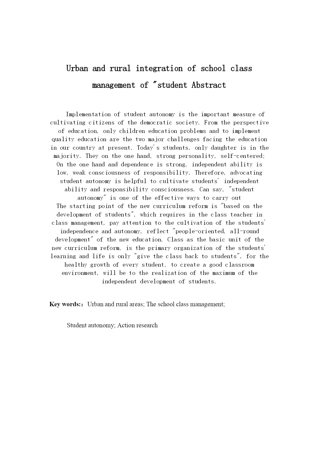 城乡结合部学校班级管理“学生自治”的行动研究摘要施行学生自治是培养民主社会的公民的重要举措。从教育的角度看,独生子女教育问题和推行素质教育是我国目前教育面临的两大难题。现在的学生中,独生子女居多。他们一方面个性强,以自我为中心;一方面依赖性又强,自立能力低,责任意识淡薄。因此,倡导学生自治有利于培养学生的自立能力和责任意识。可以说,“学生自治”是实施素质教育的有效途径之一。新课程改革的出发点是“以学生的发展为本”,班级作为推行新课程改革的基本单位,是学生学习与生活的基层组织,这要求班主任在班级管理中体现“以人为本,全面发展”的新教育观,注重学生独立性和自主性的培养,为每一个学生的健康成长创造良好的班级环境,才会使学生的自主发展得到最大程度的实现。关键词:城乡结合;学校班级管理;学生自治;行动研究Urbanandruralintegrationofschoolclassmanagementof"studentAbstractImplementationofstudentautonomyistheimportantmeasureofcultivatingcitizensofthedemocraticsociety.Fromtheperspectiveofeducation,onlychildreneducationproblemsandtoimplementqualityeducationarethetwomajorchallengesfacingtheeducationinourcountryatpresent.Today'sstudents,onlydaughterisinthemajority.Theyontheonehand,strongpersonality,self-centered;Ontheonehandanddependenceisstrong,independentabilityislow,weakconsciousnessofresponsibility.Therefore,advocatingstudentautonomyishelpfultocultivatestudents'independentabilityandresponsibilityconsciousness.Cansay,"studentautonomy"isoneoftheeffectivewaystocarryoutThestartingpointofthenewcurriculumreformis"basedonthedevelopmentofstudents",whichrequiresintheclassteacherinclassmanagement,payattentiontothecultivationofthestudents'independenceandautonomy,reflect"people-oriented,all-rounddevelopment"oftheneweducation.Classasthebasicunitofthenewcurriculumreform,istheprimaryorganizationofthestudents'learningandlifeisonly"givetheclassbacktostudents",forthehealthygrowthofeverystudent,tocreateagoodclassroomenvironment,willbetotherealizationofthemaximumoftheindependentdevelopmentofstudents.Keywords::Urbanandruralareas;Theschoolclassmanagement;Studentautonomy;Actionresearch目录第一章了解目前学生自治的现状,分析存在的问题........................1(一)学生参与自主管理的积极性低....................................1(二)学生自主管理信心不足.........................................1(三)班主任角色定位不清............................................1(四)班主任对自主管理的认识不深刻..................................2(五)学校大环境支持和配合力度不强..................................2第二章分析国内外研究现状.......