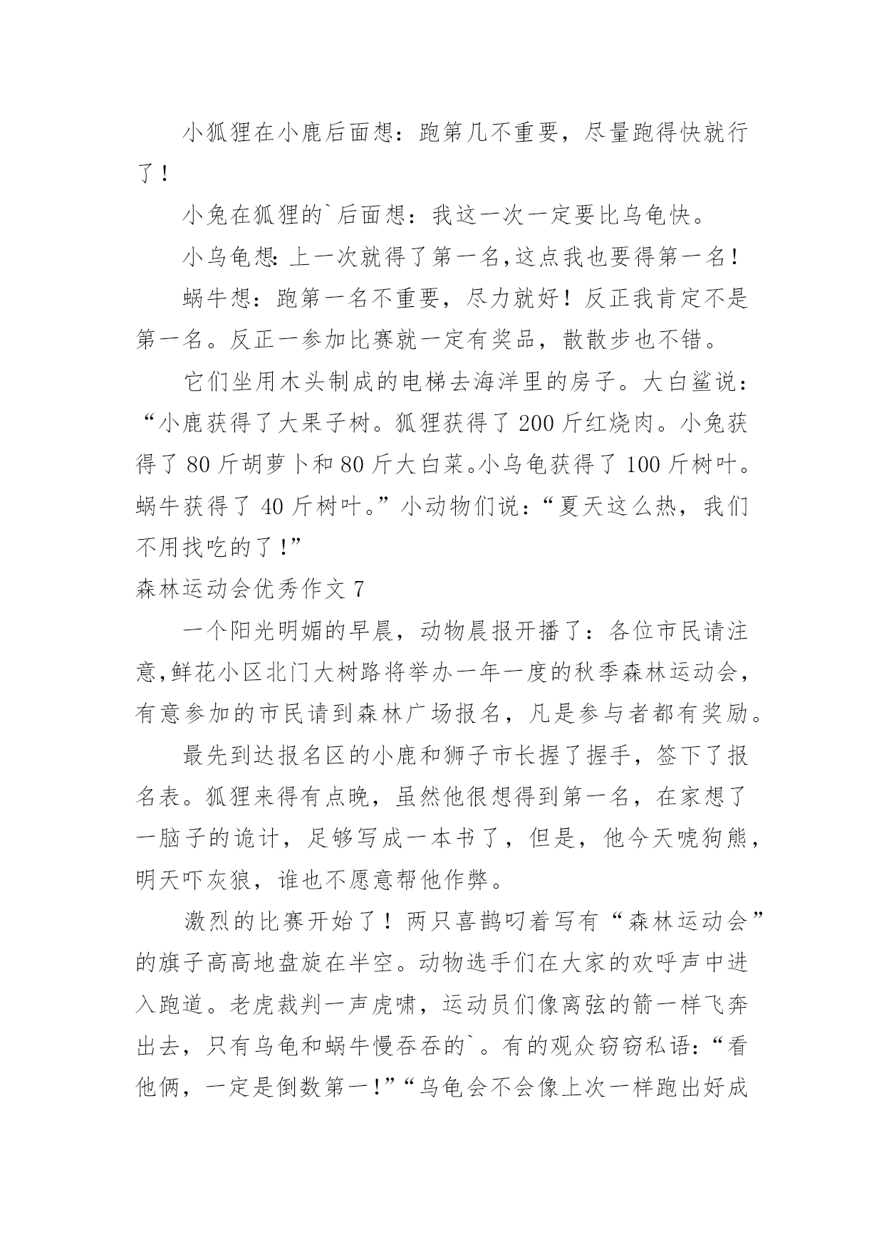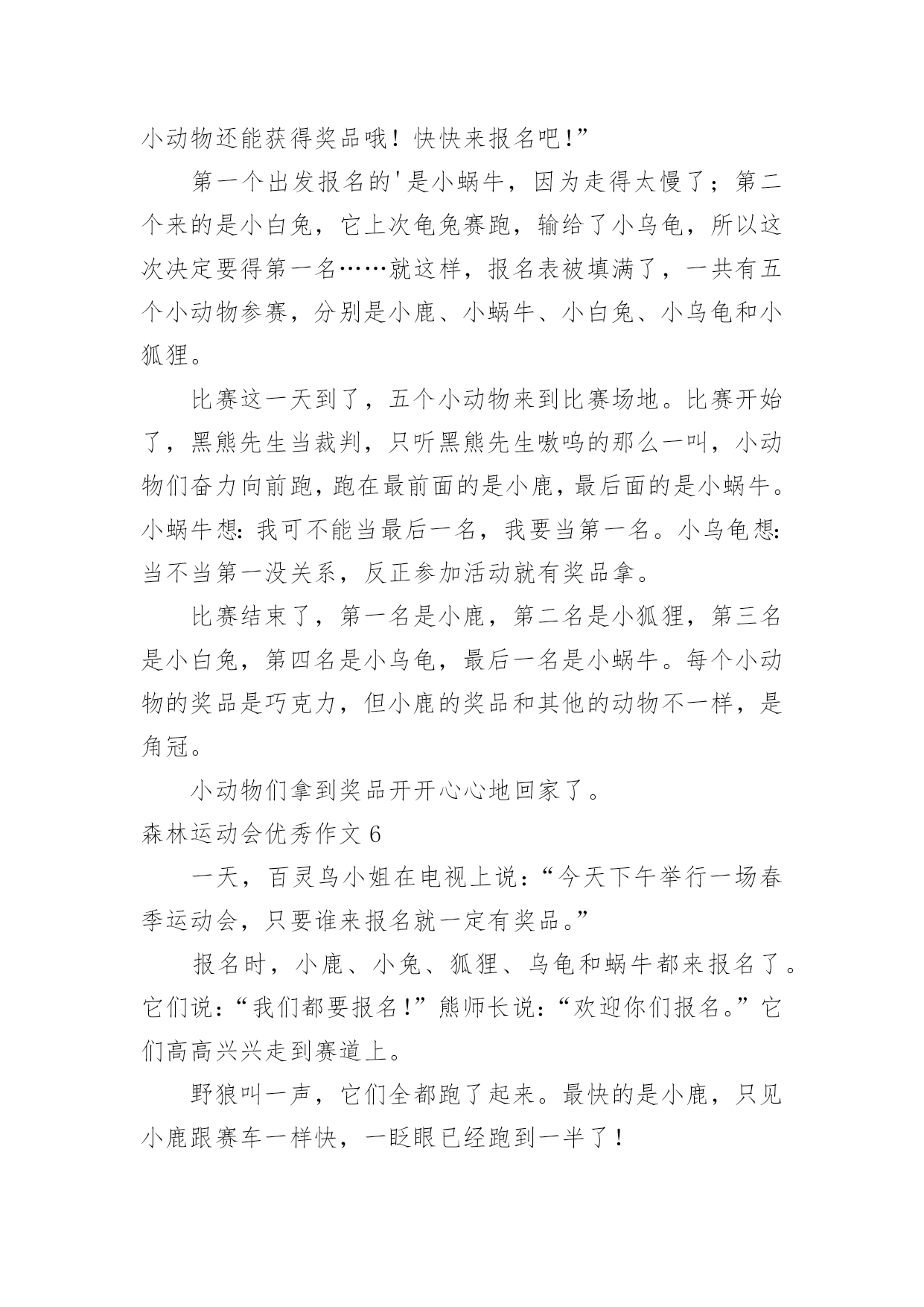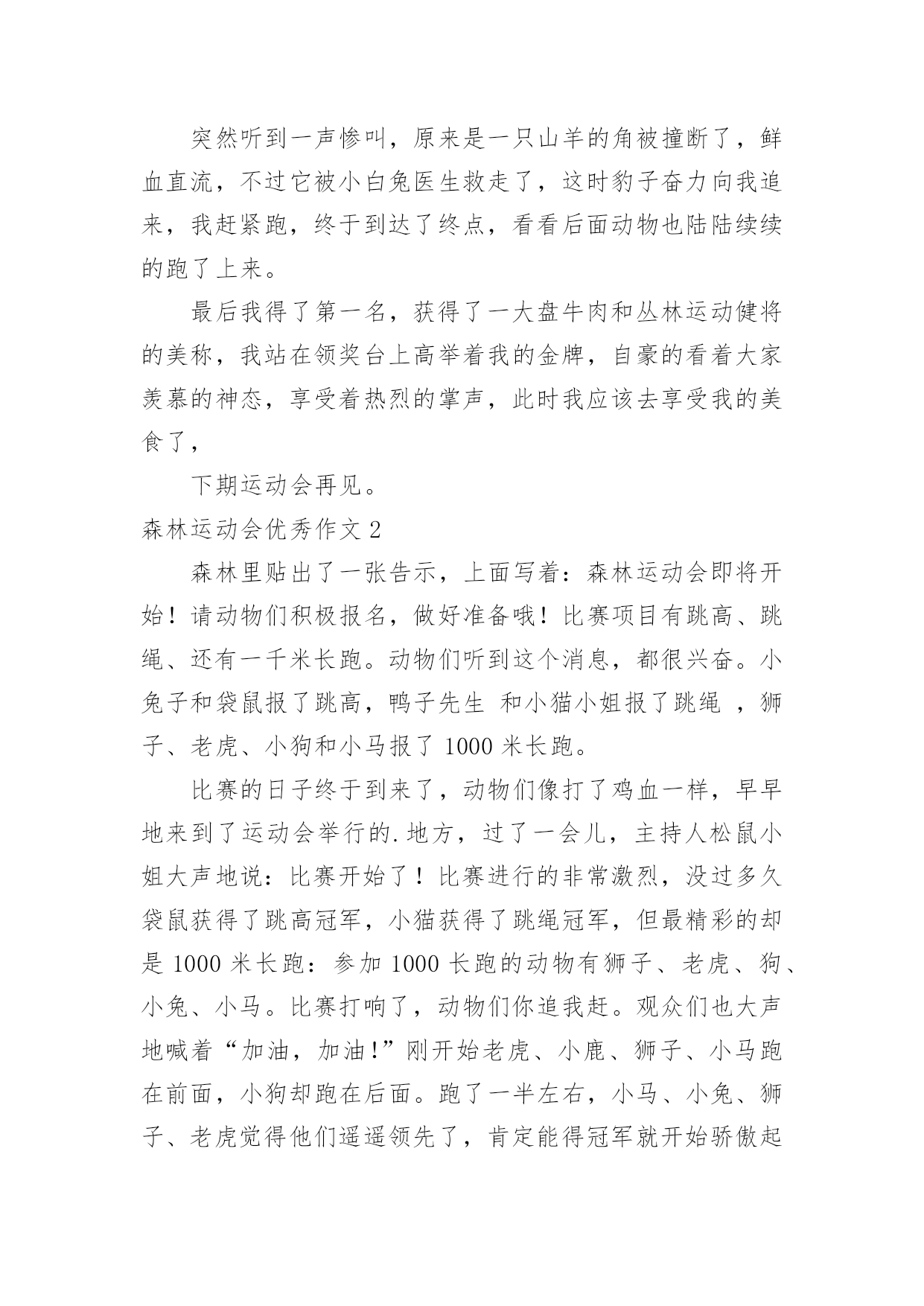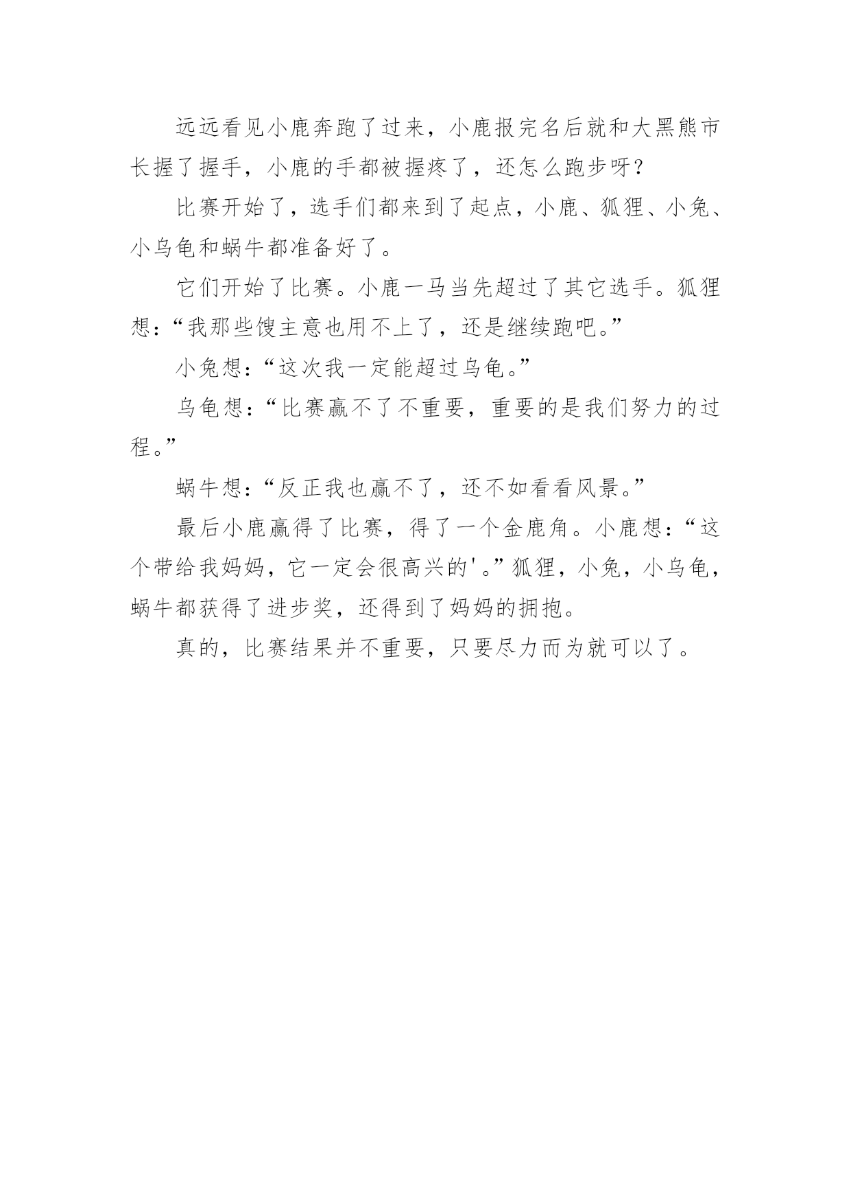 森林运动会优秀作文森林运动会优秀作文在平平淡淡的日常中,许多人都写过作文吧,作文是人们以书面形式表情达意的言语活动。为了让您在写作文时更加简单方便,下面是小编精心整理的森林运动会优秀作文,欢迎阅读与收藏。森林运动会优秀作文1早上,太阳冉冉升起,灿烂的阳光笼罩了整个森林,小鸟们叽叽喳喳的歌声叫醒了可爱的小动物们,猴子市长的通信员扯开嗓门大喊:“今天要召开运动会,请大家踊跃报名!”啊哈,我这只大老虎一听连忙揉揉眼睛清醒下脑袋,心想第一名一定要属于我,我像风一样从草丛里刮到了运动场,只见那里己经挤满了运动健将们,老鹰从头顶飞过,还有挺着大肚子的袋鼠也慢悠悠的走来,大家争先恐后报名,一会猴子市长拍拍他的大巴掌说森林运动会正式开幕,所有的动物都屏住了呼吸,大家各就各位,“砰”发令枪一响,我像风一样蹿了出去。我的眼神非常凶恶,现在和狮子并列,我越战越猛,怒吼一声,猛的.向前冲去,终于超过了狮子,边跑边扬起我自豪的大脑袋,向前奔去。越跑越饿,心里想得了第一一定要美美的吃一顿大餐,有了大餐的动力继续向前奔去。突然听到一声惨叫,原来是一只山羊的角被撞断了,鲜血直流,不过它被小白兔医生救走了,这时豹子奋力向我追来,我赶紧跑,终于到达了终点,看看后面动物也陆陆续续的跑了上来。最后我得了第一名,获得了一大盘牛肉和丛林运动健将的美称,我站在领奖台上高举着我的金牌,自豪的看着大家羡慕的神态,享受着热烈的掌声,此时我应该去享受我的美食了,下期运动会再见。森林运动会优秀作文2森林里贴出了一张告示,上面写着:森林运动会即将开始!请动物们积极报名,做好准备哦!比赛项目有跳高、跳绳、还有一千米长跑。动物们听到这个消息,都很兴奋。小兔子和袋鼠报了跳高,鸭子先生和小猫小姐报了跳绳,狮子、老虎、小狗和小马报了1000米长跑。比赛的日子终于到来了,动物们像打了鸡血一样,早早地来到了运动会举行的.地方,过了一会儿,主持人松鼠小姐大声地说:比赛开始了!比赛进行的非常激烈,没过多久袋鼠获得了跳高冠军,小猫获得了跳绳冠军,但最精彩的却是1000米长跑:参加1000长跑的动物有狮子、老虎、狗、小兔、小马。比赛打响了,动物们你追我赶。观众们也大声地喊着“加油,加油!”刚开始老虎、小鹿、狮子、小马跑在前面,小狗却跑在后面。跑了一半左右,小马、小兔、狮子、老虎觉得他们遥遥领先了,肯定能得冠军就开始骄傲起来,相互间玩耍和聊起天来。这不,快到终点的时候,小狗突然卯足了劲追了上来,一下子冲到了终点。其它小动物没有防备,都傻了眼。最后小狗得到了冠军。真是一场激烈的运动会啊!森林运动会优秀作文3今天,森林的运动场挤满了人。因为,今天是一年一度的大型森林运动会。因此,招引来了五湖四海的游客们前来观看。小猫和小兔参加了的是长跑障碍赛。因为他们是一对欢喜冤家。一遇到什么比赛,就总爱一决高下,非要比出个第一名来。所以,他们都参加了长跑障碍赛。热身时,小猫对小兔说:“小兔仔,我的父亲可是大名鼎鼎的长跑冠军――凯特猫。你就认输吧!”小兔说:“哼!走着瞧。”比赛开始了,小猫和小兔首当其冲,向终点直奔而去。第一轮的障碍名叫“冒险天堂”。最考验的就是动物们的反应能力。其中有摆动的沙袋。只要被打中,前面的`努力就半途而废了。还有弹力板。只要中了这个陷阱,你马上就会比小鸟飞得还高。有的动物看到这些,立马怂了!吵着要退出比赛。小猫和小兔不怕困难,勇往直前。一路上,他们借助训练时的经验,终于闯过了一道道难关。就在快要冲过终点的时候,意外发生了。小猫的脚突然受伤了。小兔没有一点犹豫,背上小猫就向前冲。最后,他们两个一起冲过了终点。比赛结束时,小猫对小兔说:“对不起,我不应该那样嘲笑你。希望你能原谅我。”小兔说:“说什么呢!我们两个可是好哥们,我从来就没有生你的气。”他们俩拥抱在一起,开心地笑了!森林运动会优秀作文4森林里的秋季运动会就要开始了。运动会的主要项目是长跑。参赛的种子选手有:小鹿、小猫和一头外号叫“黑旋风”的小猪。为了做冠军,小猫、小鹿都在抓紧时间练习。这天,它们经过“黑旋风”家,见小猪还在呼噜呼噜睡大觉,就大声喊到:“小猪!快要比赛了,快点儿下来练习!”“黑旋风”在里面懒洋洋地回答到:“不用练习,我跑得很快,比赛时我准能拿第一!”过了几天,比赛的.时间到了,现场围满了小动物,大家都想一睹今年长跑冠军的风采。只听猴子裁判一声令下:“预备,开始!”小鹿和小猫就像离弦的箭一样飞了出去,可小猪却因为吃了睡,睡了吃,哼哼唧唧地根本跑不动,被其他选手远远地抛在了后面。不一会儿,前面传来了欢呼声,原来,比赛结果已经出来了,小鹿得了第一,小猫第二,被称为“黑旋风”的小猪,就不用说了,得了个倒数第一。看着拿着冠军奖杯的小鹿蹦蹦跳跳地离开,“黑旋风”伤心地哭着说:“看来,做任何事情都不会不劳而获呀!”森林运动会优秀作文5一天,森
