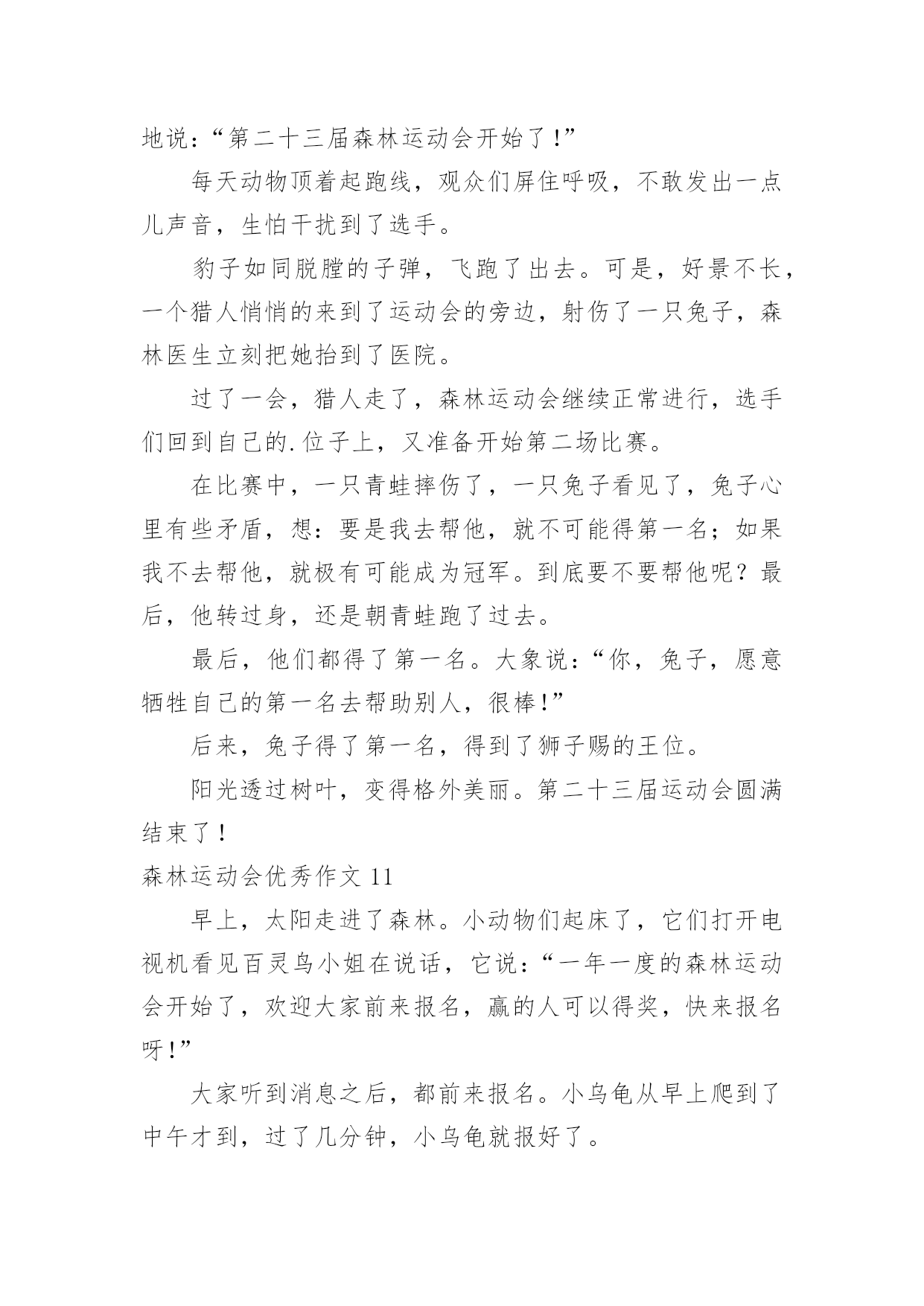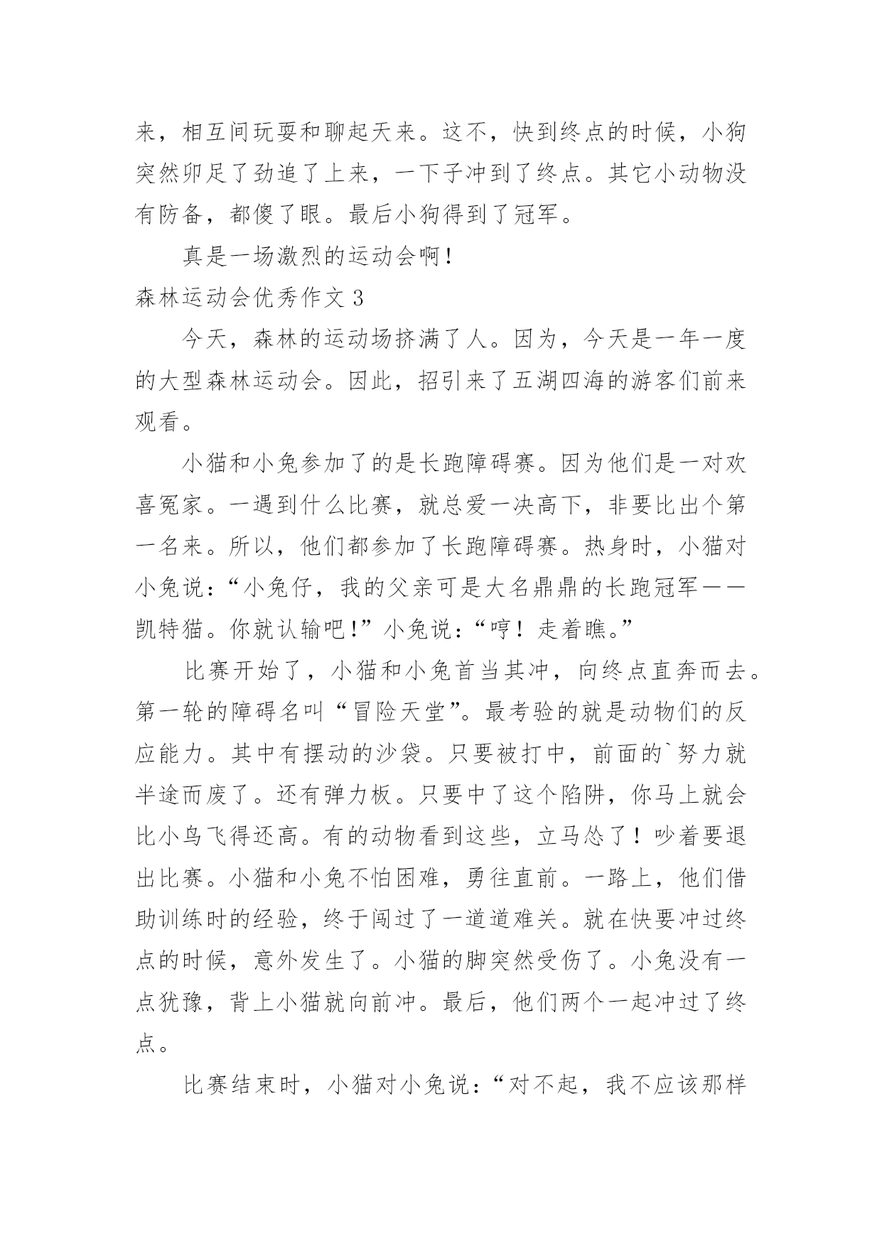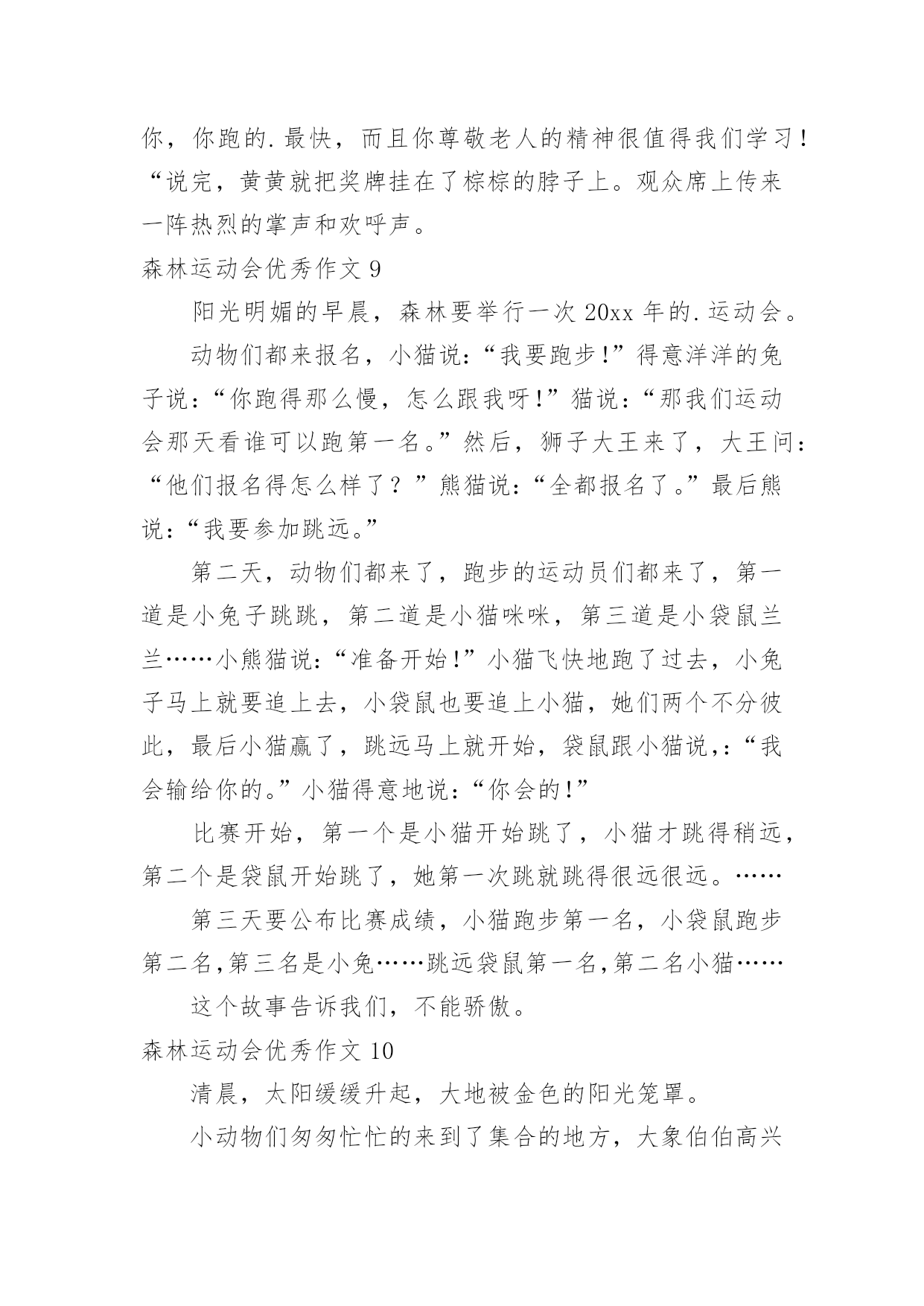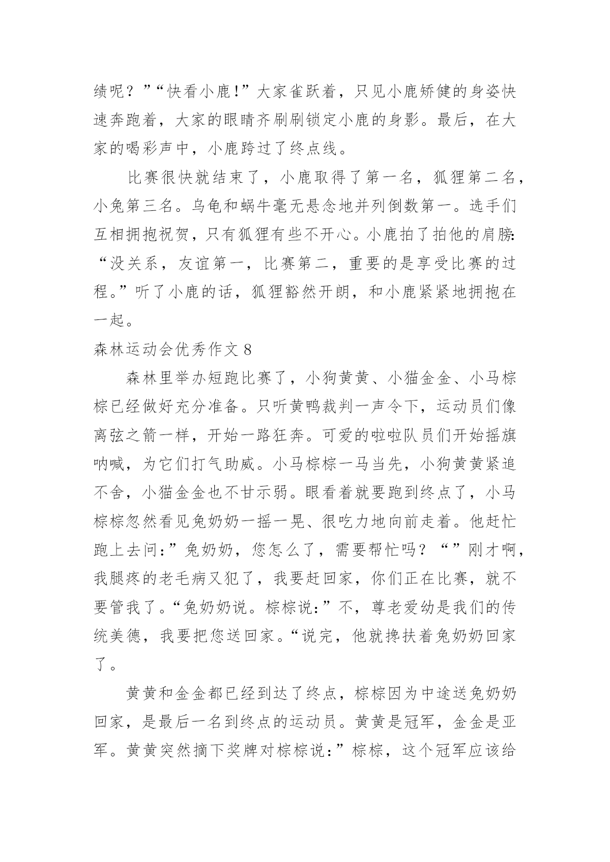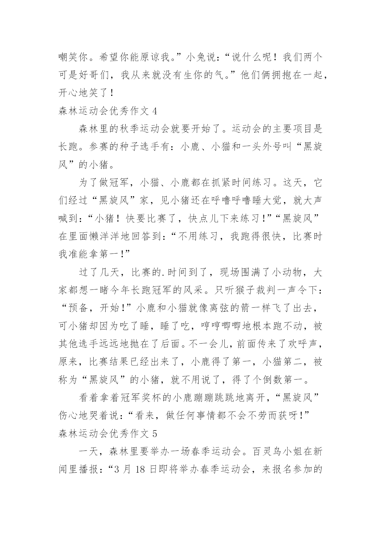 森林运动会优秀作文森林运动会优秀作文在平平淡淡的日常中,许多人都写过作文吧,作文是人们以书面形式表情达意的言语活动。为了让您在写作文时更加简单方便,下面是小编精心整理的森林运动会优秀作文,欢迎阅读与收藏。森林运动会优秀作文1早上,太阳冉冉升起,灿烂的阳光笼罩了整个森林,小鸟们叽叽喳喳的歌声叫醒了可爱的小动物们,猴子市长的通信员扯开嗓门大喊:“今天要召开运动会,请大家踊跃报名!”啊哈,我这只大老虎一听连忙揉揉眼睛清醒下脑袋,心想第一名一定要属于我,我像风一样从草丛里刮到了运动场,只见那里己经挤满了运动健将们,老鹰从头顶飞过,还有挺着大肚子的袋鼠也慢悠悠的走来,大家争先恐后报名,一会猴子市长拍拍他的大巴掌说森林运动会正式开幕,所有的动物都屏住了呼吸,大家各就各位,“砰”发令枪一响,我像风一样蹿了出去。我的眼神非常凶恶,现在和狮子并列,我越战越猛,怒吼一声,猛的.向前冲去,终于超过了狮子,边跑边扬起我自豪的大脑袋,向前奔去。越跑越饿,心里想得了第一一定要美美的吃一顿大餐,有了大餐的动力继续向前奔去。突然听到一声惨叫,原来是一只山羊的角被撞断了,鲜血直流,不过它被小白兔医生救走了,这时豹子奋力向我追来,我赶紧跑,终于到达了终点,看看后面动物也陆陆续续的跑了上来。最后我得了第一名,获得了一大盘牛肉和丛林运动健将的美称,我站在领奖台上高举着我的金牌,自豪的看着大家羡慕的神态,享受着热烈的掌声,此时我应该去享受我的美食了,下期运动会再见。森林运动会优秀作文2森林里贴出了一张告示,上面写着:森林运动会即将开始!请动物们积极报名,做好准备哦!比赛项目有跳高、跳绳、还有一千米长跑。动物们听到这个消息,都很兴奋。小兔子和袋鼠报了跳高,鸭子先生和小猫小姐报了跳绳,狮子、老虎、小狗和小马报了1000米长跑。比赛的日子终于到来了,动物们像打了鸡血一样,早早地来到了运动会举行的.地方,过了一会儿,主持人松鼠小姐大声地说:比赛开始了!比赛进行的非常激烈,没过多久袋鼠获得了跳高冠军,小猫获得了跳绳冠军,但最精彩的却是1000米长跑:参加1000长跑的动物有狮子、老虎、狗、小兔、小马。比赛打响了,动物们你追我赶。观众们也大声地喊着“加油,加油!”刚开始老虎、小鹿、狮子、小马跑在前面,小狗却跑在后面。跑了一半左右,小马、小兔、狮子、老虎觉得他们遥遥领先了,肯定能得冠军就开始骄傲起来,相互间玩耍和聊起天来。这不,快到终点的时候,小狗突然卯足了劲追了上来,一下子冲到了终点。其它小动物没有防备,都傻了眼。最后小狗得到了冠军。真是一场激烈的运动会啊!森林运动会优秀作文3今天,森林的运动场挤满了人。因为,今天是一年一度的大型森林运动会。因此,招引来了五湖四海的游客们前来观看。小猫和小兔参加了的是长跑障碍赛。因为他们是一对欢喜冤家。一遇到什么比赛,就总爱一决高下,非要比出个第一名来。所以,他们都参加了长跑障碍赛。热身时,小猫对小兔说:“小兔仔,我的父亲可是大名鼎鼎的长跑冠军――凯特猫。你就认输吧!”小兔说:“哼!走着瞧。”比赛开始了,小猫和小兔首当其冲,向终点直奔而去。第一轮的障碍名叫“冒险天堂”。最考验的就是动物们的反应能力。其中有摆动的沙袋。只要被打中,前面的`努力就半途而废了。还有弹力板。只要中了这个陷阱,你马上就会比小鸟飞得还高。有的动物看到这些,立马怂了!吵着要退出比赛。小猫和小兔不怕困难,勇往直前。一路上,他们借助训练时的经验,终于闯过了一道道难关。就在快要冲过终点的时候,意外发生了。小猫的脚突然受伤了。小兔没有一点犹豫,背上小猫就向前冲。最后,他们两个一起冲过了终点。比赛结束时,小猫对小兔说:“对不起,我不应该那样嘲笑你。希望你能原谅我。”小兔说:“说什么呢!我们两个可是好哥们,我从来就没有生你的气。”他们俩拥抱在一起,开心地笑了!森林运动会优秀作文4森林里的秋季运动会就要开始了。运动会的主要项目是长跑。参赛的种子选手有:小鹿、小猫和一头外号叫“黑旋风”的小猪。为了做冠军,小猫、小鹿都在抓紧时间练习。这天,它们经过“黑旋风”家,见小猪还在呼噜呼噜睡大觉,就大声喊到:“小猪!快要比赛了,快点儿下来练习!”“黑旋风”在里面懒洋洋地回答到:“不用练习,我跑得很快,比赛时我准能拿第一!”过了几天,比赛的.时间到了,现场围满了小动物,大家都想一睹今年长跑冠军的风采。只听猴子裁判一声令下:“预备,开始!”小鹿和小猫就像离弦的箭一样飞了出去,可小猪却因为吃了睡,睡了吃,哼哼唧唧地根本跑不动,被其他选手远远地抛在了后面。不一会儿,前面传来了欢呼声,原来,比赛结果已经出来了,小鹿得了第一,小猫第二,被称为“黑旋风”的小猪,就不用说了,得了个倒数第一。看着拿着冠军奖杯的小鹿蹦蹦跳跳地离开,“黑旋风”伤心地哭着说:“看来,做任何事情都不会不劳而获呀!”森林运动会优秀作文5一天,森