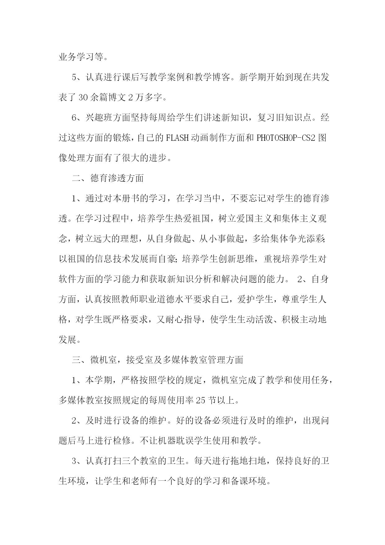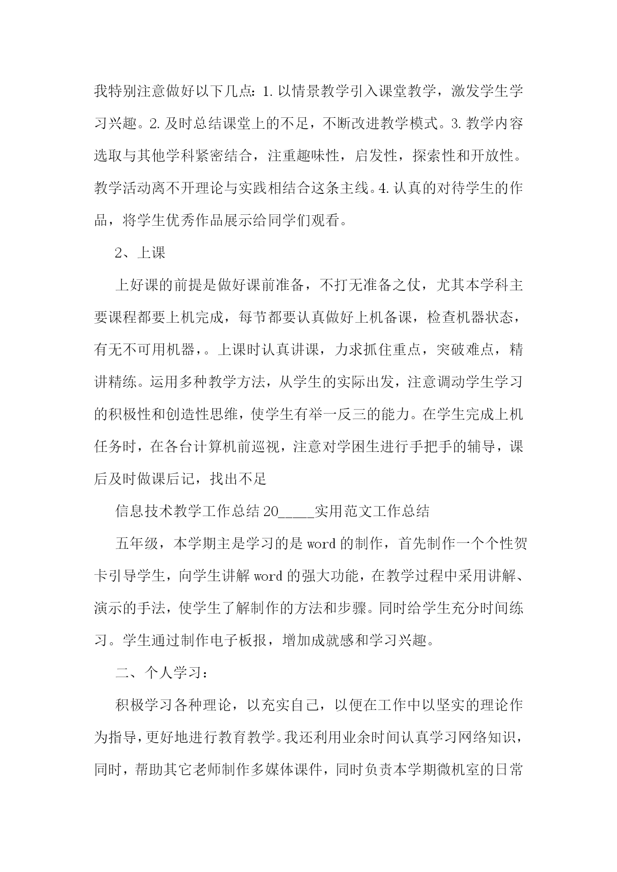 最新信息技术教学工作总结最新信息技术教学工作总结120____D20____学年第一学期即将结束,回顾这一学期,本人能够努力工作,认真学习,从多方面进行计算机教学和管理工作。有辛勤的耕耘,有收获的喜悦,也有不足与遗憾,,本学年按照教学计划和教学纲要的要求,已经如期地完成了教学任务.现总结如下:一、思想认识在这一个学年里,思想上严于律己,热爱党的教育事业。一年来,努力提高自己的政治水平和教学水平。服从学校的工作安排,做好各项工作。二、教学方面1、备课开学初,根据学校要求,认真写好教学计划,提前备好课,写好教案。平时做到周前备课。备课时认真钻研教材,,虚心向老教师学习、请教。力求吃透教材,找准重点、难点信息技术教学工作总结20_____实用范文信息技术教学工作总结20_____实用范文。为了上好每一节课,我上网查资料,集中别人的优点确定自己的教学思路。为了学生能更直观地感受所学的知识内容,我积极制作课件,准备各种直观教学软件,搜集制作各知识点优秀案例展示给学生。,在备课组长的组织带领下:我们经常交流学习,寻找适合学生的教学方法。我特别注意做好以下几点:1.以情景教学引入课堂教学,激发学生学习兴趣。2.及时总结课堂上的不足,不断改进教学模式。3.教学内容选取与其他学科紧密结合,注重趣味性,启发性,探索性和开放性。教学活动离不开理论与实践相结合这条主线。4.认真的对待学生的作品,将学生优秀作品展示给同学们观看。2、上课上好课的前提是做好课前准备,不打无准备之仗,尤其本学科主要课程都要上机完成,每节都要认真做好上机备课,检查机器状态,有无不可用机器,。上课时认真讲课,力求抓住重点,突破难点,精讲精练。运用多种教学方法,从学生的实际出发,注意调动学生学习的积极性和创造性思维,使学生有举一反三的能力。在学生完成上机任务时,在各台计算机前巡视,注意对学困生进行手把手的辅导,课后及时做课后记,找出不足信息技术教学工作总结20_____实用范文工作总结五年级,本学期主是学习的是word的制作,首先制作一个个性贺卡引导学生,向学生讲解word的强大功能,在教学过程中采用讲解、演示的手法,使学生了解制作的方法和步骤。同时给学生充分时间练习。学生通过制作电子板报,增加成就感和学习兴趣。二、个人学习:积极学习各种理论,以充实自己,以便在工作中以坚实的理论作为指导,更好地进行教育教学。我还利用业余时间认真学习网络知识,同时,帮助其它老师制作多媒体课件,同时负责本学期微机室的日常管理工作。三、考勤方面最新信息技术教学工作总结2一、教学方面1、做到期初有计划,有教学进度,使教学工作能有条不紊地顺利进行下去;由于教学计划安排的比较好,所以并没有给工作带来影响,反而在一定程度上有利于教学工作的进行,使得大量电脑理论知识得于传授给学生。2、按照学校工作管理规定,认真备好课,写好教案,努力上好每一节课。电脑科学校安排的课时比较少(一周每班二节)这对于学生来讲的很重要的二节课;对老师来讲是比较难上的二节课。所以才能上好每节课对老师对学生都是很关键的。除了备好课、写好教案外,我还要查阅各种资料,能上因特网时还上网寻找好的教学材料,教学课件,把它们和我所从事的工作结合起来,为我所用。3、学生方面:在转差促优上,注意在教学中或教学之余以各种形式对学生进行思想教育,转化差生,促进他们的发展。4、个人提高方面:在教学之余,我也注重自身发展进步。除了听课,评课,参加教研组教研活动外,我还注意到要自学。从思想上,利用业余时间端正自己;从行动上学知识,学电脑技术,学教学技能等;在生活上注意形象,为人师表。作为教师教学工作是主要的,但除了教学工作外,我也积极参加学校组织其它活动如:政治理论学习、业务学习等。5、认真进行课后写教学案例和教学博客。新学期开始到现在共发表了30余篇博文2万多字。6、兴趣班方面坚持每周给学生们讲述新知识,复习旧知识点。经过这些方面的锻炼,自己的FLASH动画制作方面和PHOTOSHOP-CS2图像处理方面有了很大的进步。二、德育渗透方面1、通过对本册书的学习,在学习当中,不要忘记对学生的德育渗透。在学习过程中,培养学生热爱祖国,树立爱国主义和集体主义观念,树立远大的理想,从自身做起、从小事做起,多给集体争光添彩;以祖国的信息技术发展而自豪;培养学生创新思维,重视培养学生对软件方面的学习能力和获取新知识分析和解决问题的能力。2、自身方面,认真按照教师职业道德水平要求自己,爱护学生,尊重学生人格,对学生既严格要求,又耐心指导,使学生生动活泼、积极主动地发展。三、微机室,接受室及多媒体教室管理方面1、本学期,严格按照学校的规定,微机室完成了教学和使用任务,多媒体教室按照规定的每周使用率25节以上。2、及时进行